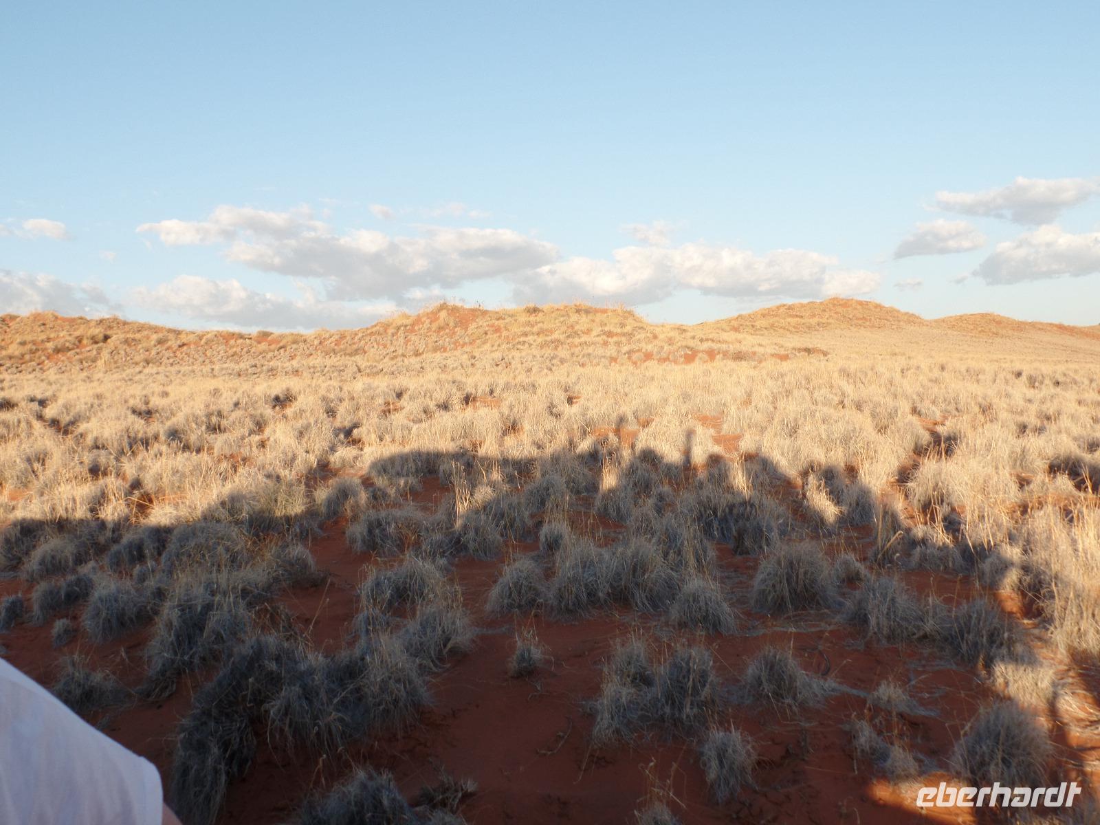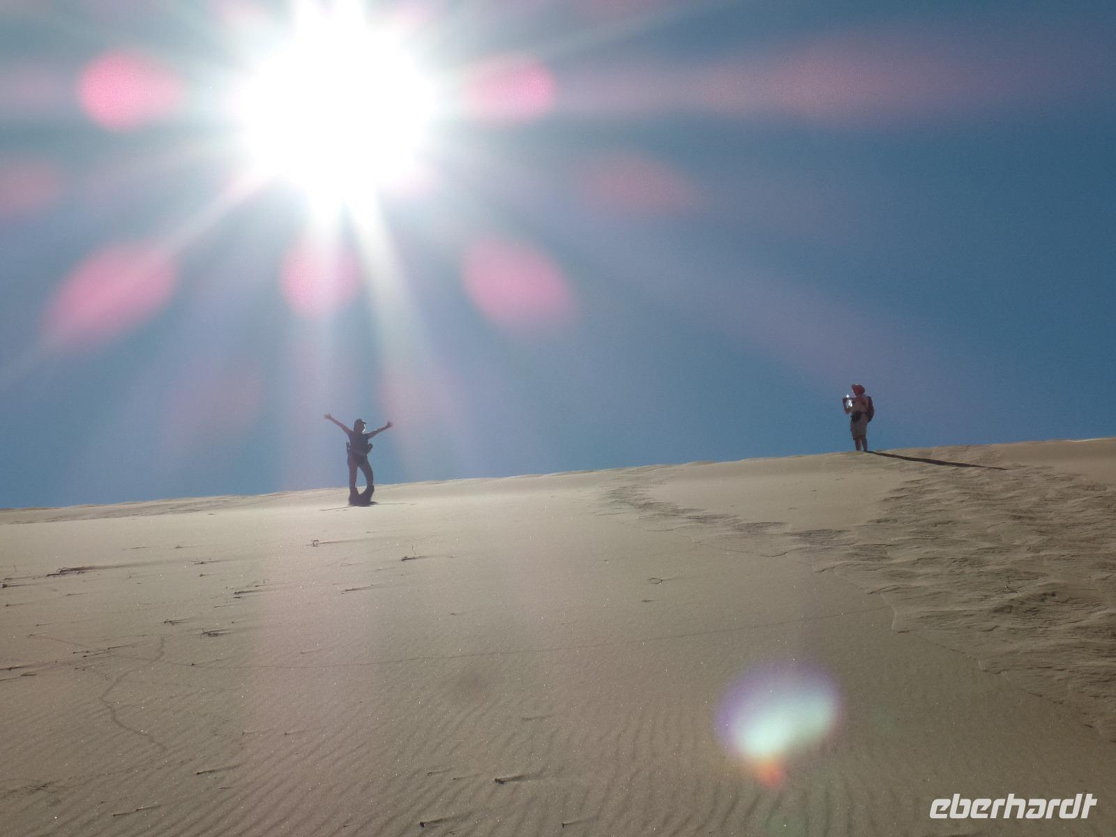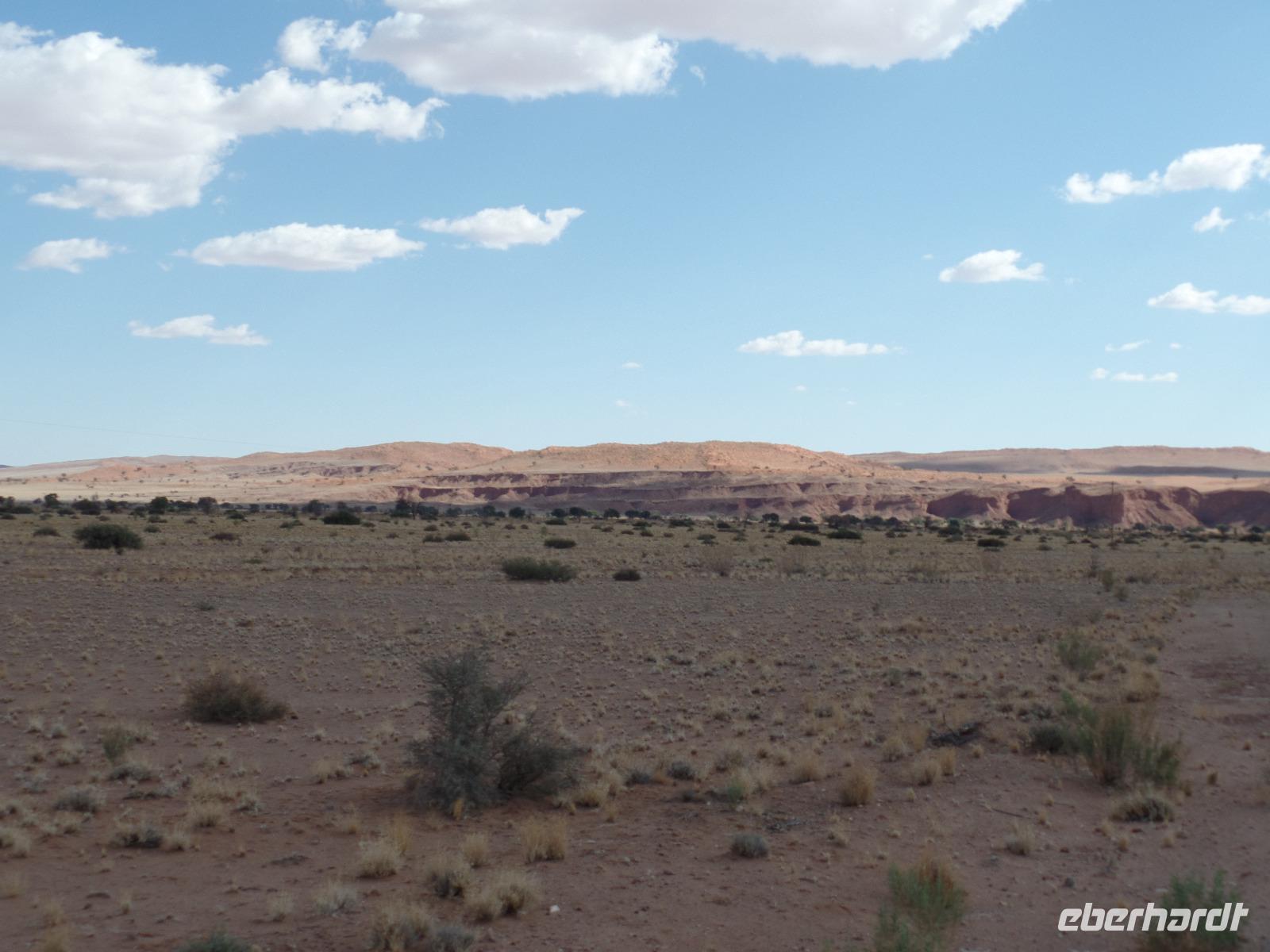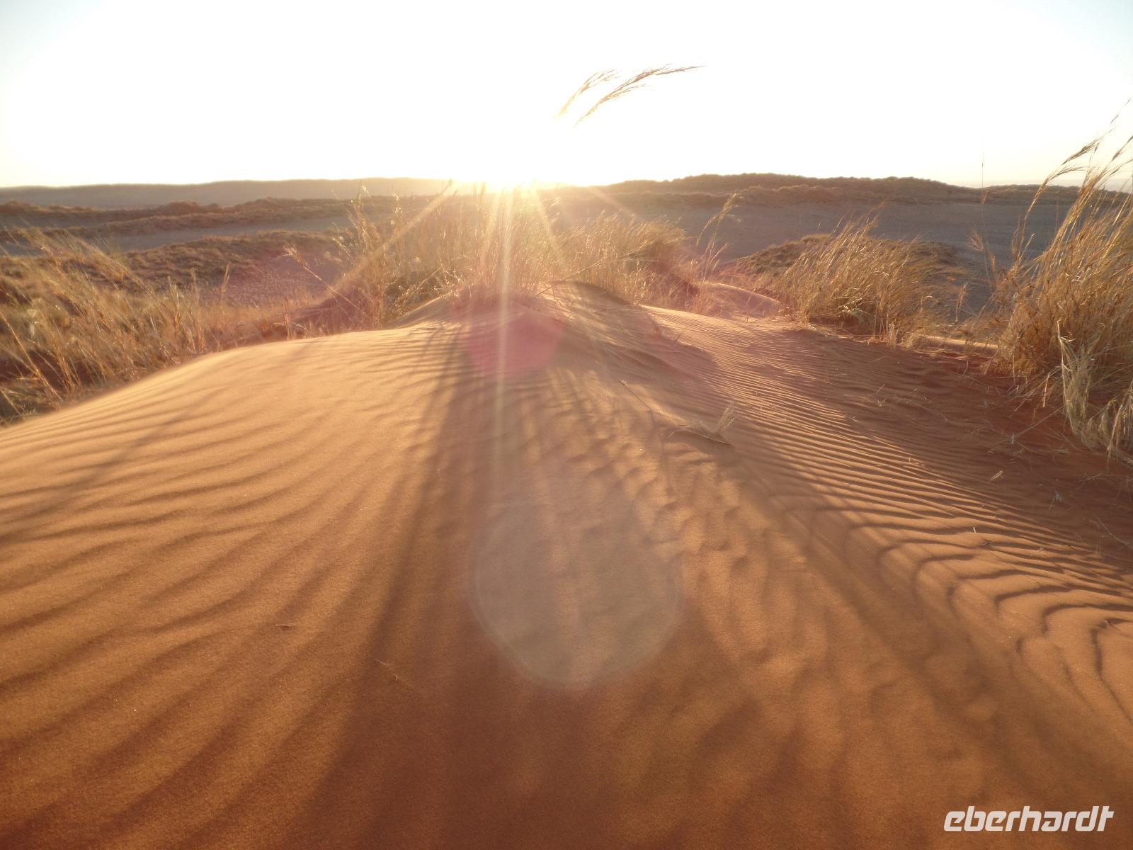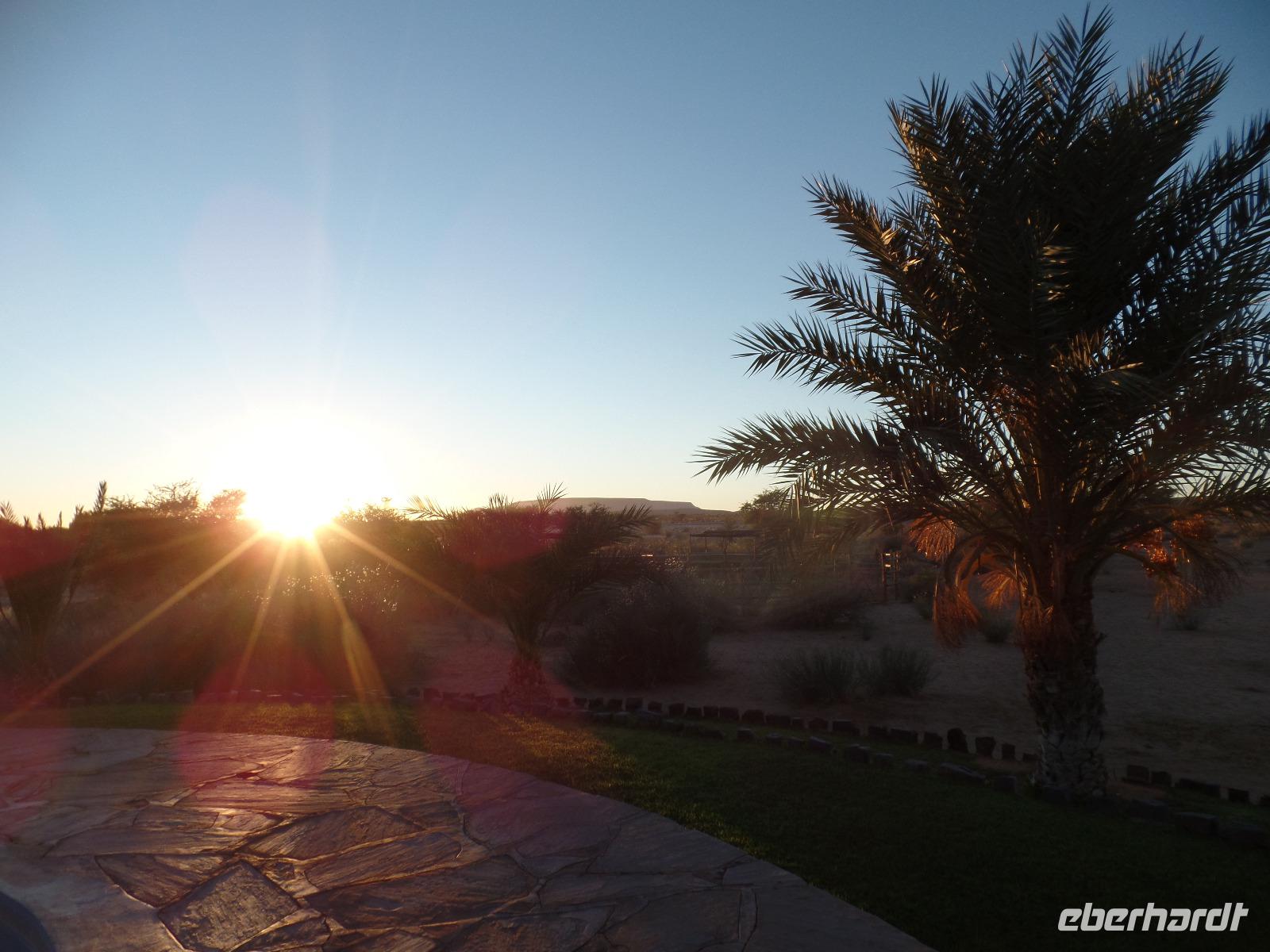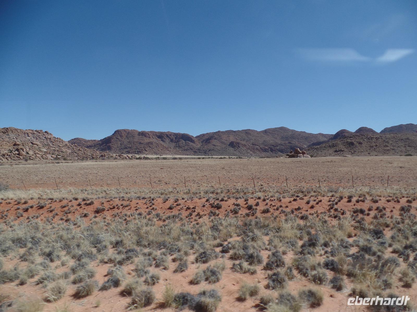 Die ersten Sonnenstrahlen stiegen über die umliegenden Berge der Farm und schon wuselte es um das Farmhaus. Die Hühner wollten gefüttert werden, kleine Rotkopfpapageien wirbelten auf den Blechdächern der Bungalows, die drei Kinder der Familie Dabis waren munter und der Duft frischen Kaffees wehte um die Nase. Nach einem guten Frühstück zeigt uns Jörg seinen Gemüsegarten, was man doch eher als Gemüsefelder bezeichnen konnte. Auch die eigene Solaranlage mit Werkstatt versetzte uns in Staunen. Wir schrieben gerne ein paar Zeilen in das Gästebuch und verabschiedeten uns von der herzlichen Familie. Erster Stopp des Tages war der Ort Maltahöhe. Ein kleiner Laden schien seit einigen Jahrzehnten alles zu sammeln, was interessant schien. Alte Dosen hingen von der Decke, die Wände waren mit Sprachen aus der gesamten Welt beschrieben, alte Nähmaschinen und Kinderwagen konnte man entdecken ... ein richtiger kleiner Krämerladen war das. Gespannt, was uns noch am heutigen Tag erwartet, fuhren wir durch die wunderschöne namibische Wüstenlandschaft weiter zur Grenze der Namib. Unsere Lodge für die nächsten zwei Nächte war wie eine kleine Oase. Der Pool wurde gleich von einigen auf seine „Frische" getestet. Was für eine angenehme Abkühlung! Am späten Nachmittag brachen wir noch auf, eine einzigartige Jeeptour in der rötlich schimmernden Wüstenlandschaft zu unternehmen. Die langsam untergehende Sonne lies die angrenzende Namib in jeder Minute anders aussehen. Auf einer Anhöhe beobachteten wir bei Gin Tonic und guter Laune den fantastischen Sonnenuntergang. In der Ferne konnte man einige Oryxe laufen sehen, sogar ein Hochzeitspaar nutzte die wundervolle Stimmung um zu heiraten. Wir stimmten einige Lieder an und fuhren vergnügt in die Lodge zurück, wo wir gemeinsam aßen.