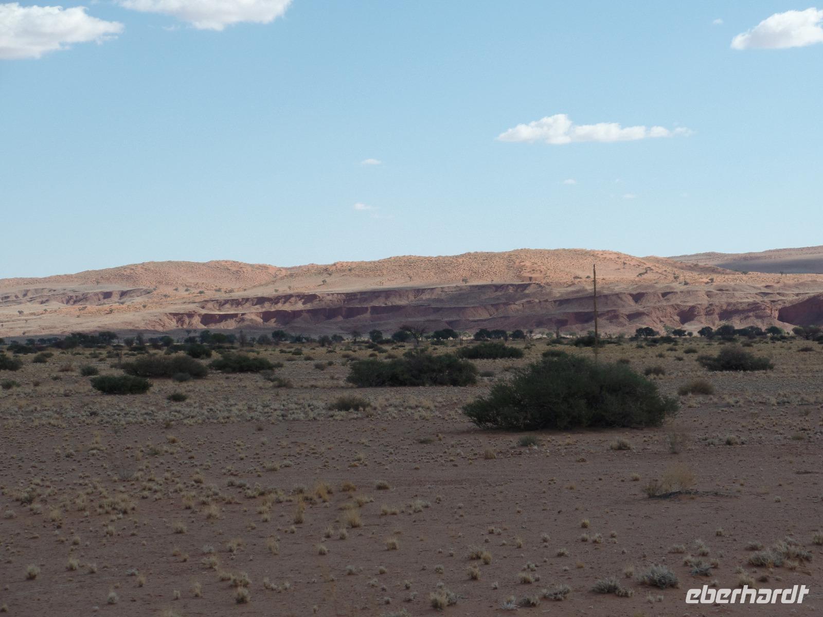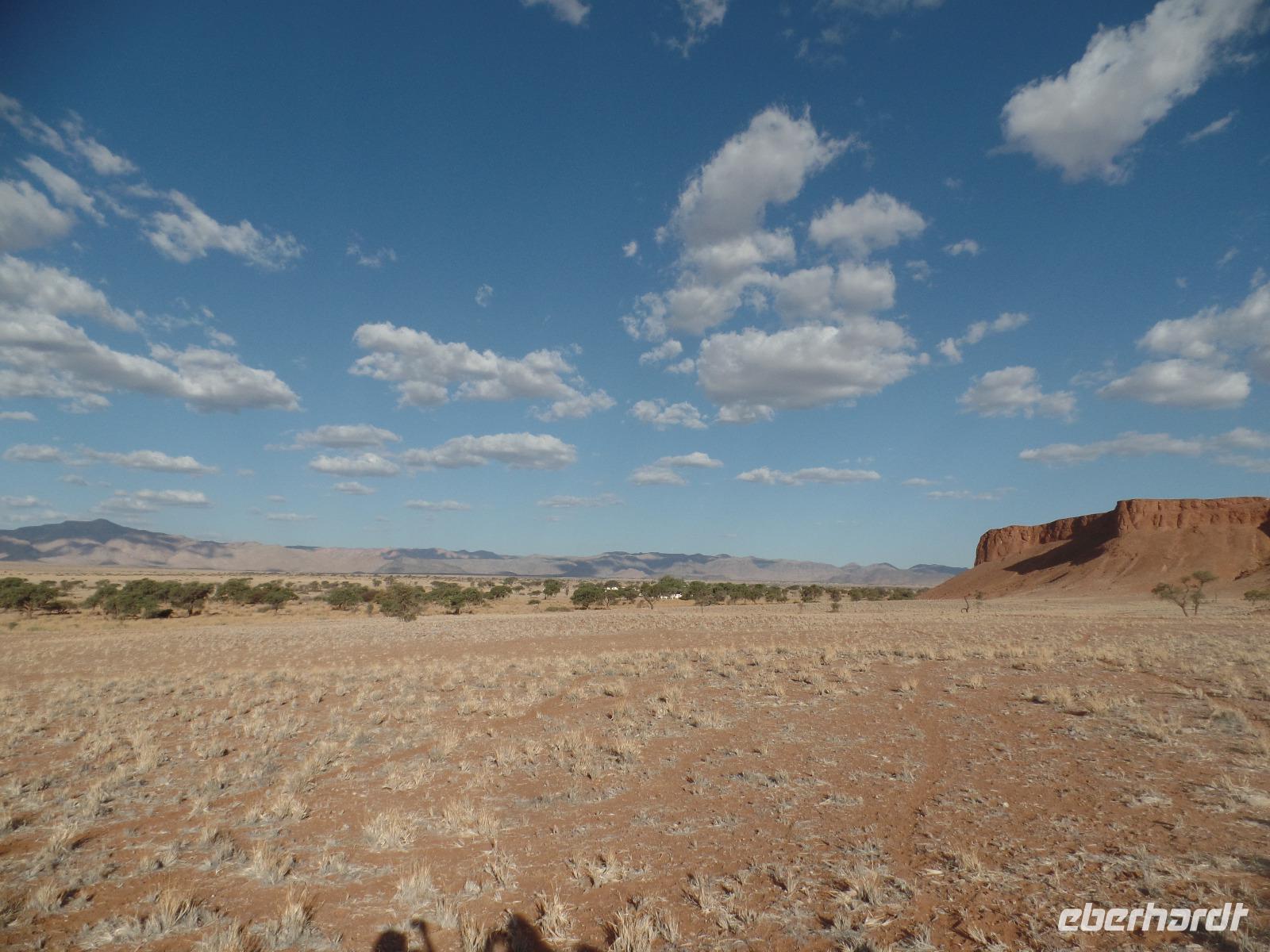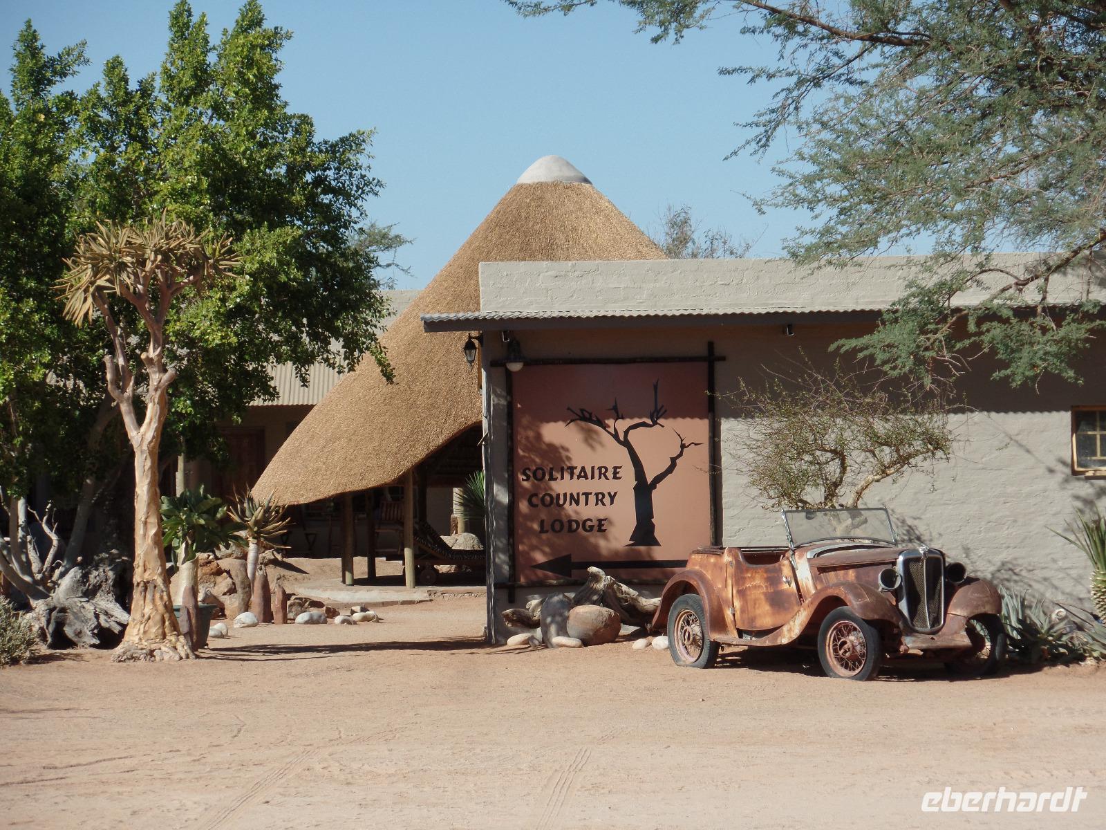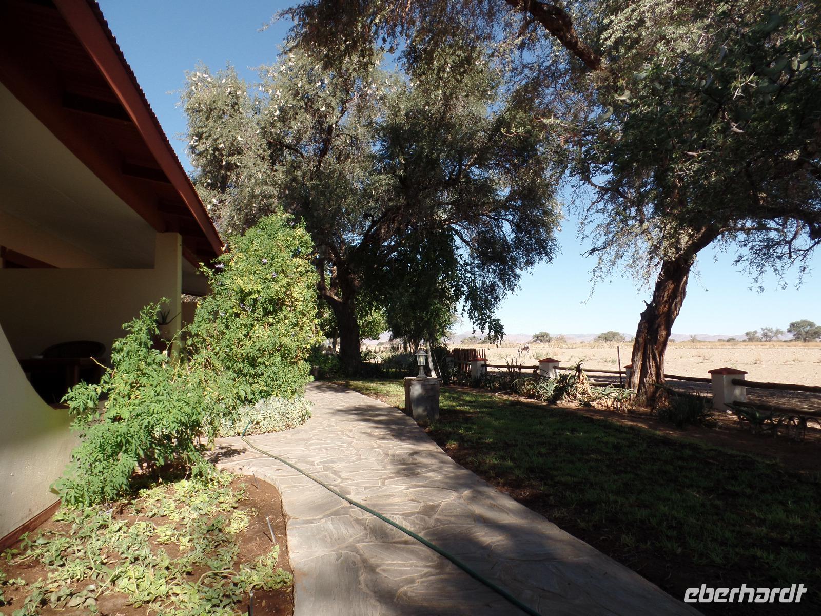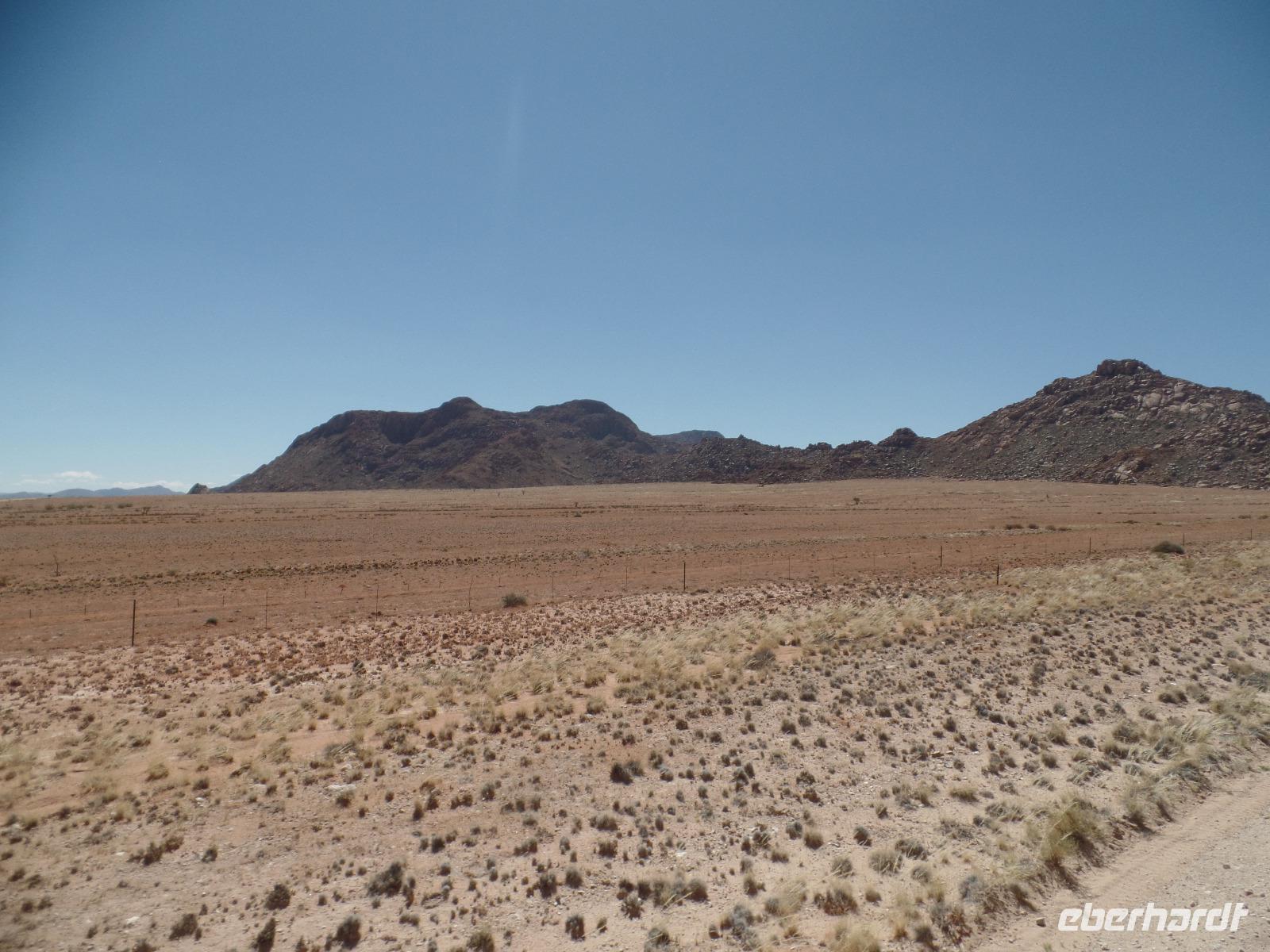 Die ersten Sonnenstrahlen stiegen über die umliegenden Berge der Farm und schon wuselte es um das Farmhaus. Die Hühner wollten gefüttert werden, kleine Rotkopfpapageien wirbelten auf den Blechdächern der Bungalows, die drei Kinder der Familie Dabis waren munter und der Duft frischen Kaffees wehte um die Nase. Nach einem guten Frühstück zeigt uns Jörg seinen Gemüsegarten, was man doch eher als Gemüsefelder bezeichnen konnte. Auch die eigene Solaranlage mit Werkstatt versetzte uns in Staunen. Wir schrieben gerne ein paar Zeilen in das Gästebuch und verabschiedeten uns von der herzlichen Familie. Erster Stopp des Tages war der Ort Maltahöhe. Ein kleiner Laden schien seit einigen Jahrzehnten alles zu sammeln, was interessant schien. Alte Dosen hingen von der Decke, die Wände waren mit Sprachen aus der gesamten Welt beschrieben, alte Nähmaschinen und Kinderwagen konnte man entdecken ... ein richtiger kleiner Krämerladen war das. Gespannt, was uns noch am heutigen Tag erwartet, fuhren wir durch die wunderschöne namibische Wüstenlandschaft weiter zur Grenze der Namib. Unsere Lodge für die nächsten zwei Nächte war wie eine kleine Oase. Der Pool wurde gleich von einigen auf seine „Frische" getestet. Was für eine angenehme Abkühlung! Am späten Nachmittag brachen wir noch auf, eine einzigartige Jeeptour in der rötlich schimmernden Wüstenlandschaft zu unternehmen. Die langsam untergehende Sonne lies die angrenzende Namib in jeder Minute anders aussehen. Auf einer Anhöhe beobachteten wir bei Gin Tonic und guter Laune den fantastischen Sonnenuntergang. In der Ferne konnte man einige Oryxe laufen sehen, sogar ein Hochzeitspaar nutzte die wundervolle Stimmung um zu heiraten. Wir stimmten einige Lieder an und fuhren vergnügt in die Lodge zurück, wo wir gemeinsam aßen.
