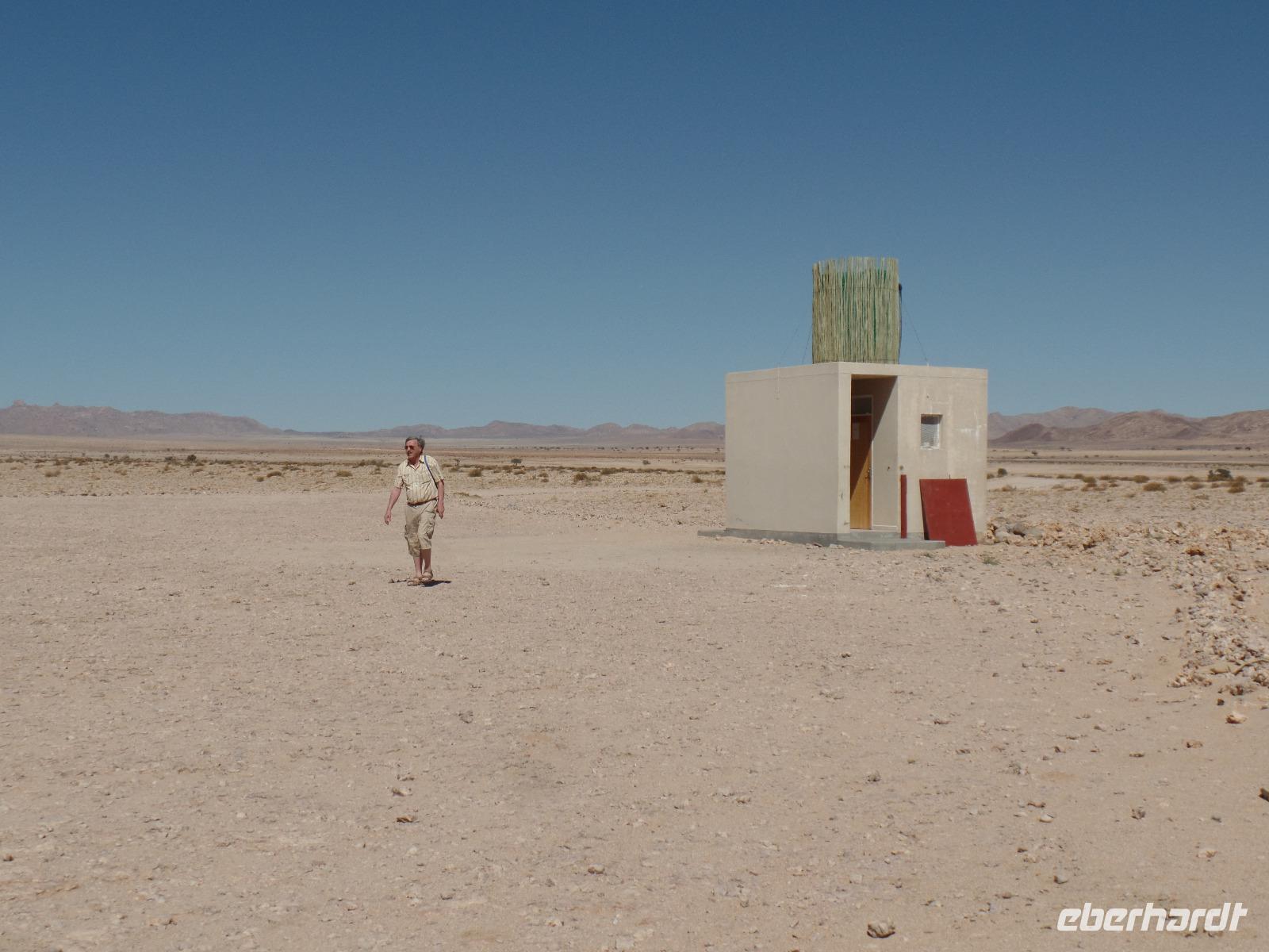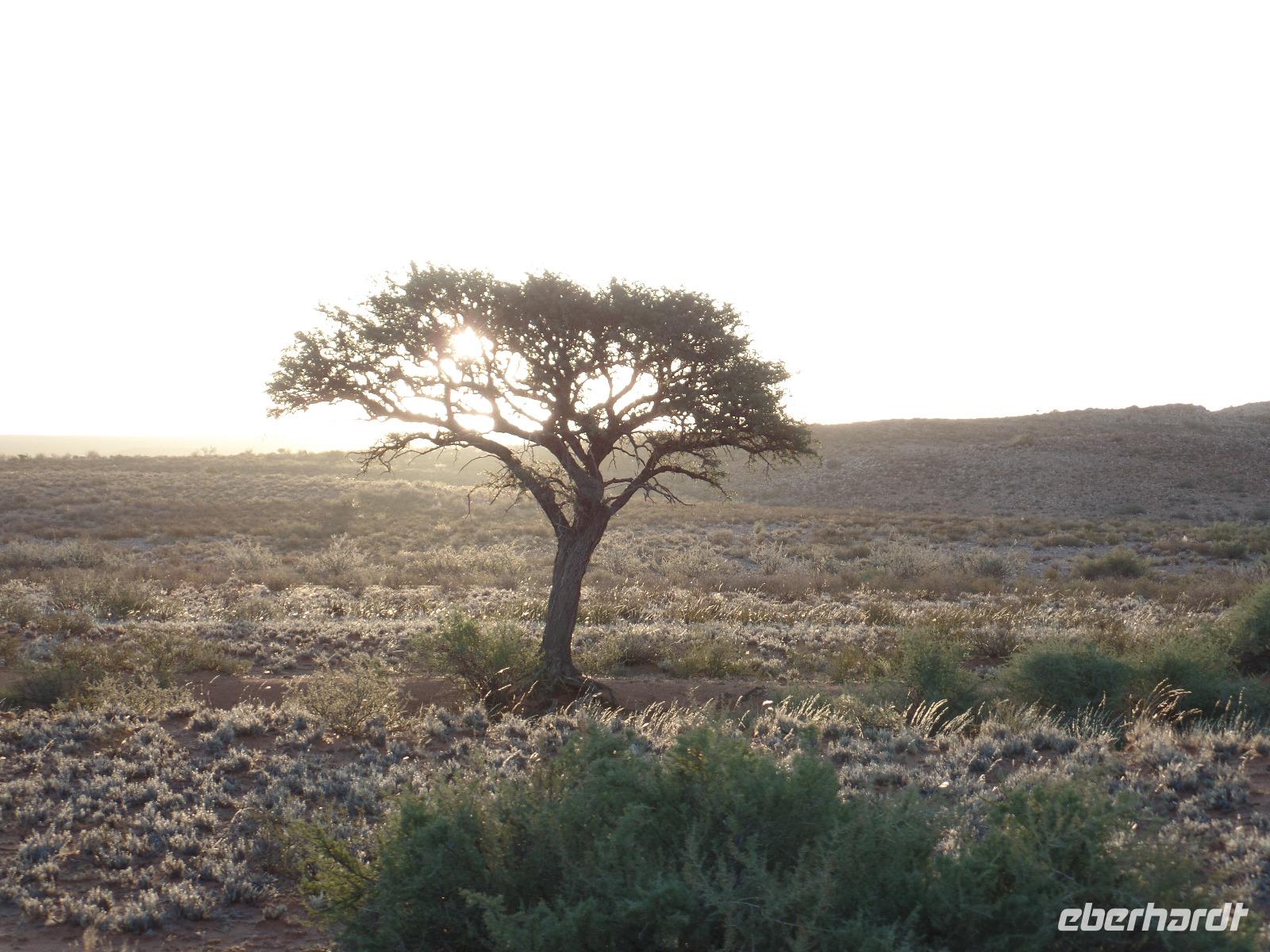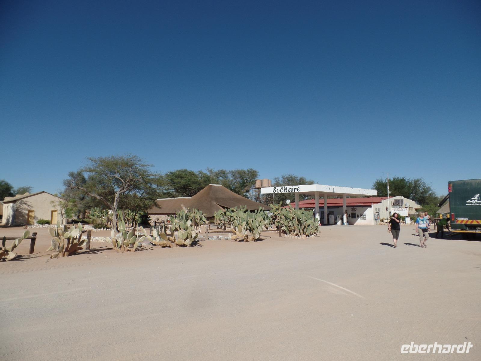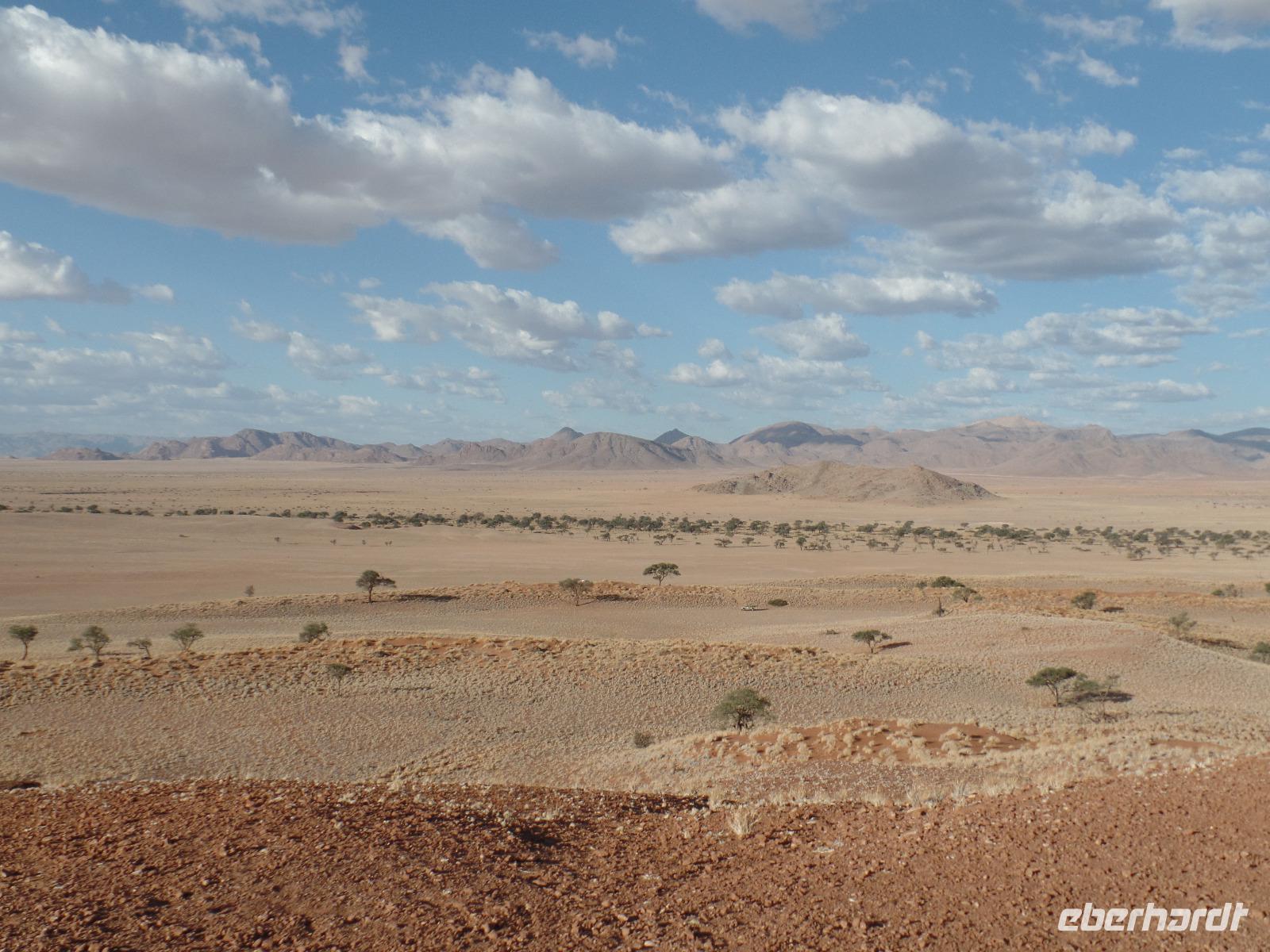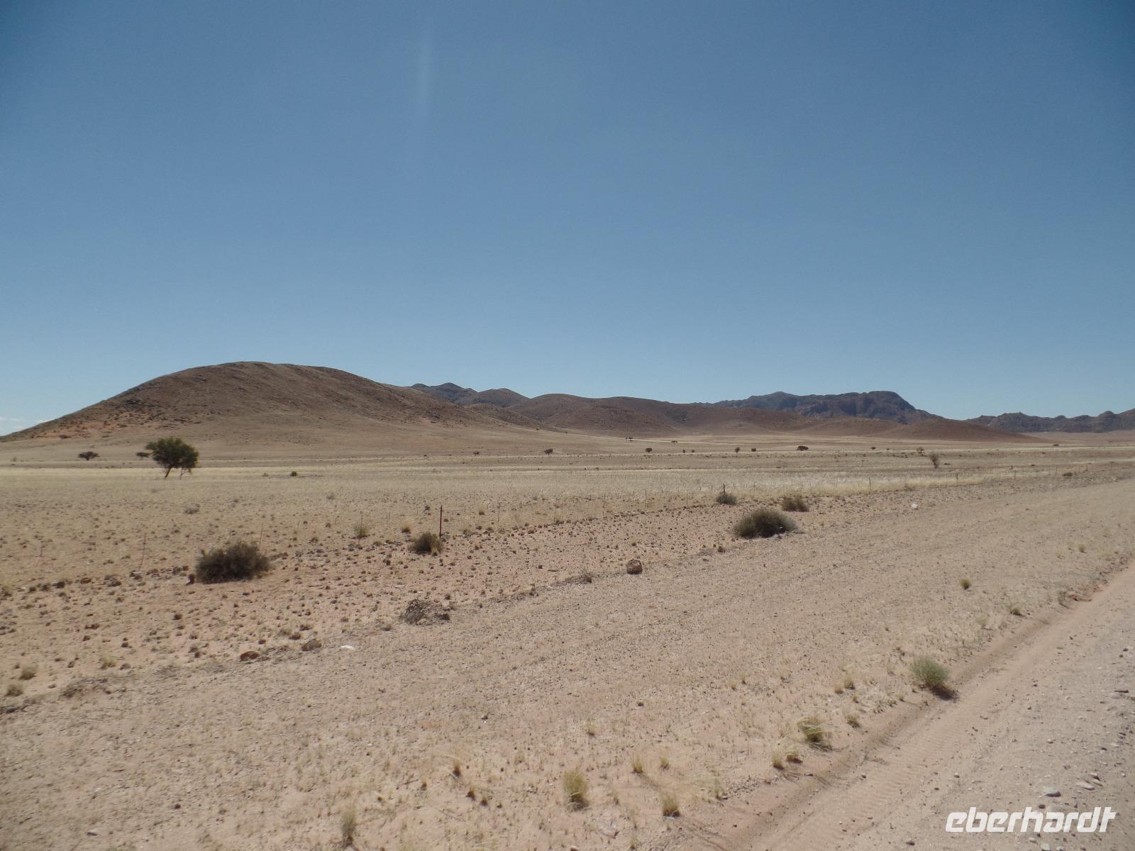 Die ersten Sonnenstrahlen stiegen über die umliegenden Berge der Farm und schon wuselte es um das Farmhaus. Die Hühner wollten gefüttert werden, kleine Rotkopfpapageien wirbelten auf den Blechdächern der Bungalows, die drei Kinder der Familie Dabis waren munter und der Duft frischen Kaffees wehte um die Nase. Nach einem guten Frühstück zeigt uns Jörg seinen Gemüsegarten, was man doch eher als Gemüsefelder bezeichnen konnte. Auch die eigene Solaranlage mit Werkstatt versetzte uns in Staunen. Wir schrieben gerne ein paar Zeilen in das Gästebuch und verabschiedeten uns von der herzlichen Familie. Erster Stopp des Tages war der Ort Maltahöhe. Ein kleiner Laden schien seit einigen Jahrzehnten alles zu sammeln, was interessant schien. Alte Dosen hingen von der Decke, die Wände waren mit Sprachen aus der gesamten Welt beschrieben, alte Nähmaschinen und Kinderwagen konnte man entdecken ... ein richtiger kleiner Krämerladen war das. Gespannt, was uns noch am heutigen Tag erwartet, fuhren wir durch die wunderschöne namibische Wüstenlandschaft weiter zur Grenze der Namib. Unsere Lodge für die nächsten zwei Nächte war wie eine kleine Oase. Der Pool wurde gleich von einigen auf seine „Frische" getestet. Was für eine angenehme Abkühlung! Am späten Nachmittag brachen wir noch auf, eine einzigartige Jeeptour in der rötlich schimmernden Wüstenlandschaft zu unternehmen. Die langsam untergehende Sonne lies die angrenzende Namib in jeder Minute anders aussehen. Auf einer Anhöhe beobachteten wir bei Gin Tonic und guter Laune den fantastischen Sonnenuntergang. In der Ferne konnte man einige Oryxe laufen sehen, sogar ein Hochzeitspaar nutzte die wundervolle Stimmung um zu heiraten. Wir stimmten einige Lieder an und fuhren vergnügt in die Lodge zurück, wo wir gemeinsam aßen.
