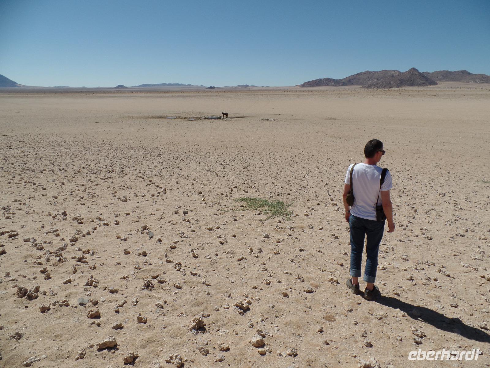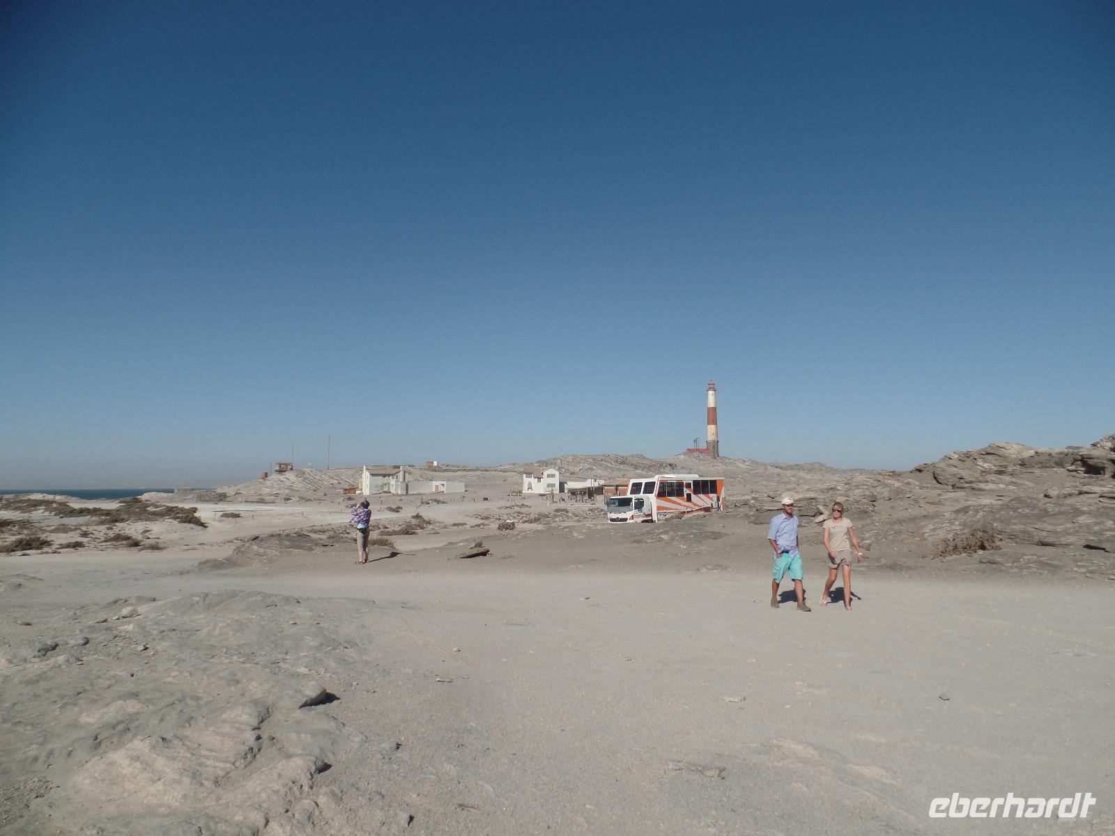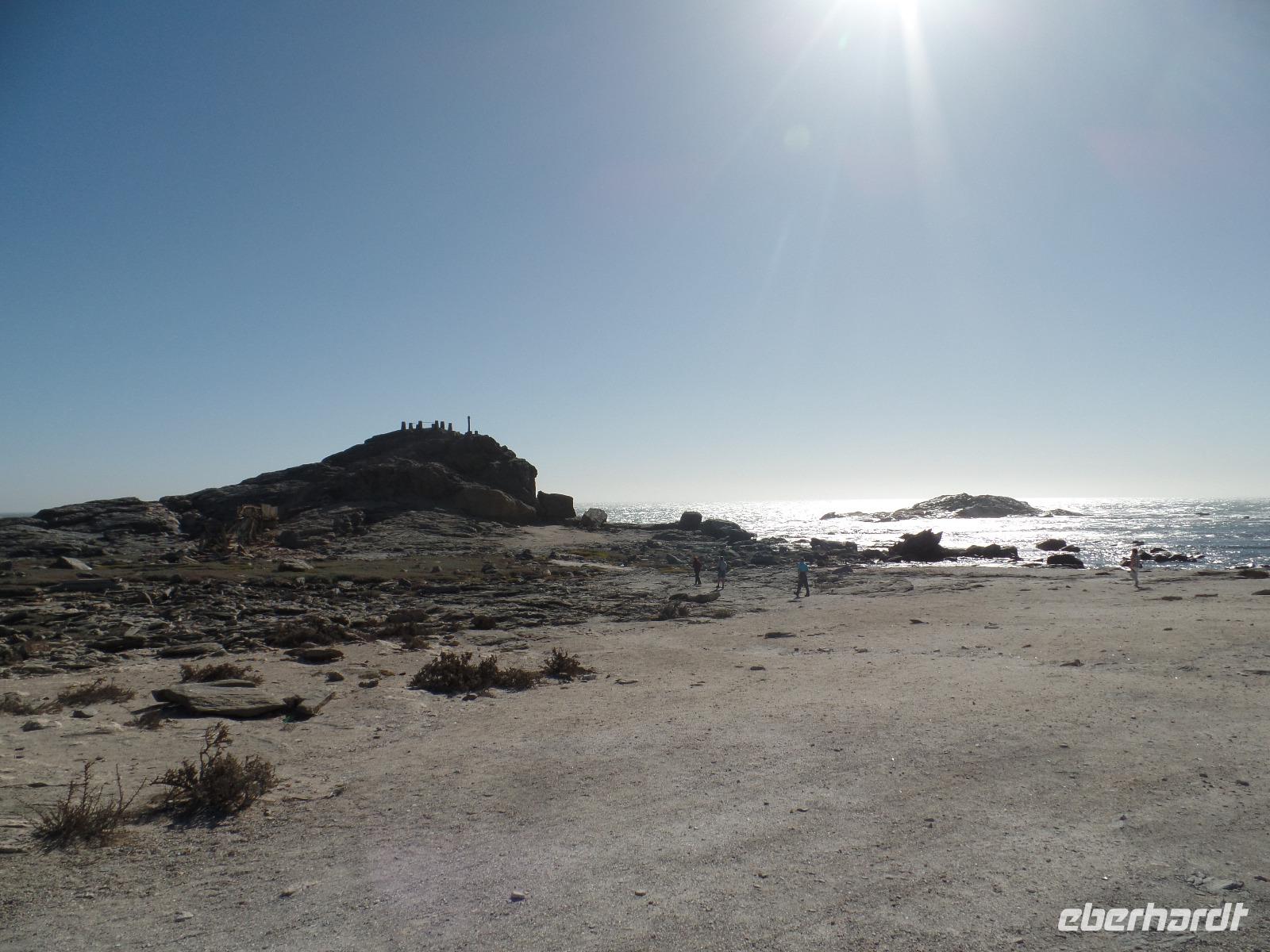 Nach einem leckeren Frühstück packten wir wieder unsere Sachen und verließen das Canyon Roadhouse. Unser erster Stopp an einer Eisenbahnbrücke mit deutschen Gräbern war zwar geplant, jedoch der platte Reifen unseres Zebra-Jeeps nicht. Geschwind und mit geübten Handgriffen legten Bianca und Murray los, das platte Ding auszutauschen. Die Männer der Reisegruppe ließen sich nicht lumpen und halfen mit. Schnell war das Rad gewechselt und unsere Tour konnte fortgesetzt werden. Kleiner Zwischenstopp am Fish River, am Geländer der Brücke ein bißchen die Übungsstunden im Ballett in Erinnerung gerufen und weiter gings. Ein weiterer Zwischenstopp erwartete uns in der Kuibis-Farm. Der dortige Shop bot Trockenfleisch, auch Biltong genannt, von Oryx, Springbock, Kudu und Beef an, welches wir alle probierten. Wieder durchfuhren wir karge Landschaften, umringt von kleinen Tafelbergen, dennoch sahen wir riesige Viehherden und auch wieder die bekannten Oryxantilopen. Trotz dieser tristen Einöde begannen wir die Schönheit des Gesehenen zu erkennen und erfreuten uns daran. Die Freude wuchs, als wir Wildpferde in weiter Ferne entdeckten. Der nächste Programmpunkt des Tages, das Garub-Wasserloch, schien nicht mehr weit zu sein. Wir genossen die Weite und bestaunten einige herannahende Wildpferde. Unsere Reise führte uns entlang der Eisenbahnlinie weiter nach Lüderitz. Dort gaben wir erst einmal unseren kaputten Reifen in die Obhut einer ansässigen Werkstatt. Die Rundfahrt entlang der Buchten brachte uns nun zum Diaz-Kreuz, an der der Seefahrer Diaz 1488 auf seinem Seeweg landete. Einige spazierten an der steinigen Küste und sammelten einzigartige Muscheln, andere stiegen zum Diaz-Kreuz hinauf und mussten bei dem stürmischen Wind aufpassen, nicht ins Meer zu fliegen Geschafft von der langen Fahrt waren wir froh, im Hotel anzukommen. Bis zum Abendessen war noch ein wenig Zeit, so genoss jeder die Ruhe des direkt am Wasser liegenden Hotels auf eigene Art. Den Abend ließen wir alle bei einem sehr guten Buffet und anschließenden Zusammensein ausklingen.