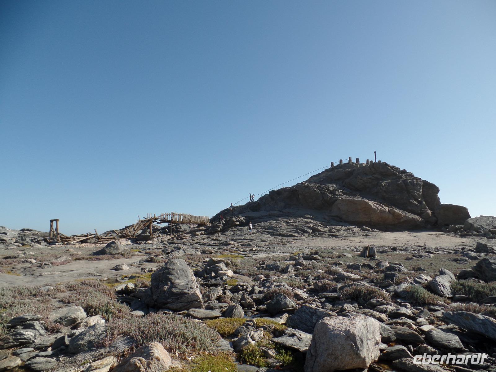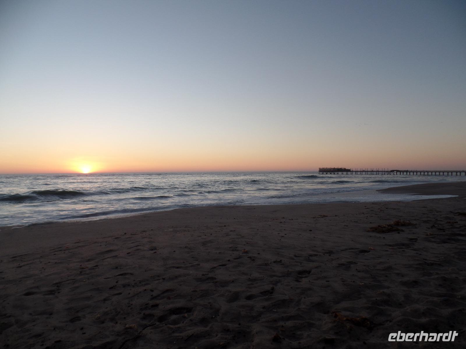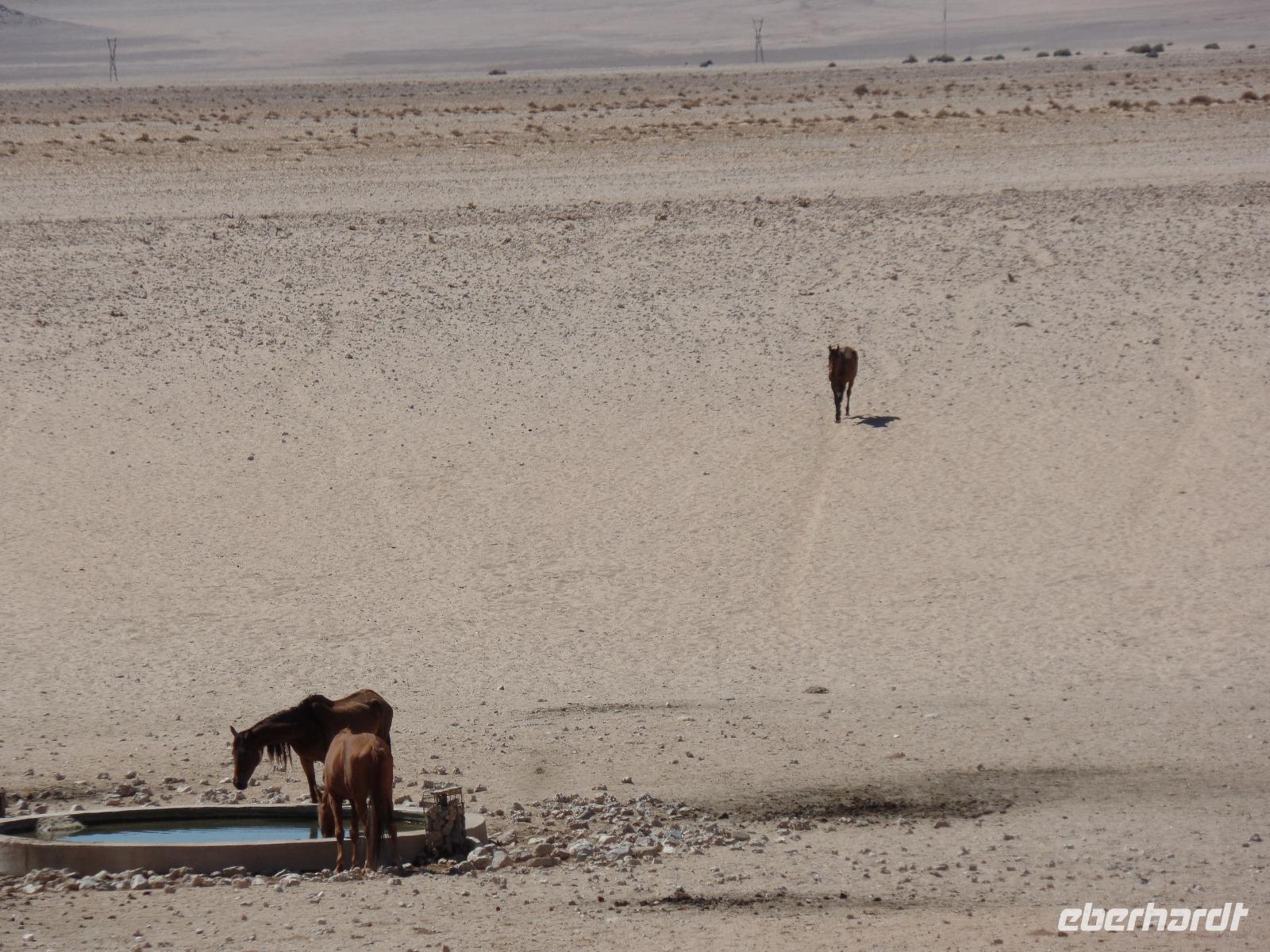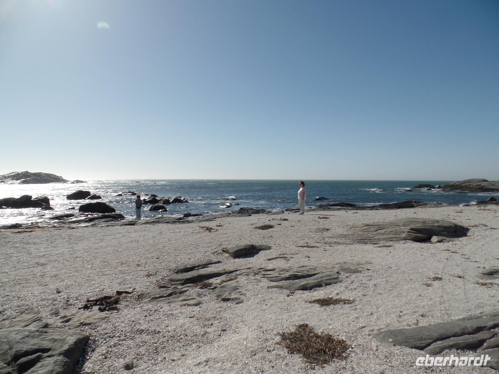 Nach einem leckeren Frühstück packten wir wieder unsere Sachen und verließen das Canyon Roadhouse. Unser erster Stopp an einer Eisenbahnbrücke mit deutschen Gräbern war zwar geplant, jedoch der platte Reifen unseres Zebra-Jeeps nicht. Geschwind und mit geübten Handgriffen legten Bianca und Murray los, das platte Ding auszutauschen. Die Männer der Reisegruppe ließen sich nicht lumpen und halfen mit. Schnell war das Rad gewechselt und unsere Tour konnte fortgesetzt werden. Kleiner Zwischenstopp am Fish River, am Geländer der Brücke ein bißchen die Übungsstunden im Ballett in Erinnerung gerufen und weiter gings. Ein weiterer Zwischenstopp erwartete uns in der Kuibis-Farm. Der dortige Shop bot Trockenfleisch, auch Biltong genannt, von Oryx, Springbock, Kudu und Beef an, welches wir alle probierten. Wieder durchfuhren wir karge Landschaften, umringt von kleinen Tafelbergen, dennoch sahen wir riesige Viehherden und auch wieder die bekannten Oryxantilopen. Trotz dieser tristen Einöde begannen wir die Schönheit des Gesehenen zu erkennen und erfreuten uns daran. Die Freude wuchs, als wir Wildpferde in weiter Ferne entdeckten. Der nächste Programmpunkt des Tages, das Garub-Wasserloch, schien nicht mehr weit zu sein. Wir genossen die Weite und bestaunten einige herannahende Wildpferde. Unsere Reise führte uns entlang der Eisenbahnlinie weiter nach Lüderitz. Dort gaben wir erst einmal unseren kaputten Reifen in die Obhut einer ansässigen Werkstatt. Die Rundfahrt entlang der Buchten brachte uns nun zum Diaz-Kreuz, an der der Seefahrer Diaz 1488 auf seinem Seeweg landete. Einige spazierten an der steinigen Küste und sammelten einzigartige Muscheln, andere stiegen zum Diaz-Kreuz hinauf und mussten bei dem stürmischen Wind aufpassen, nicht ins Meer zu fliegen Geschafft von der langen Fahrt waren wir froh, im Hotel anzukommen. Bis zum Abendessen war noch ein wenig Zeit, so genoss jeder die Ruhe des direkt am Wasser liegenden Hotels auf eigene Art. Den Abend ließen wir alle bei einem sehr guten Buffet und anschließenden Zusammensein ausklingen.