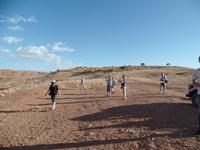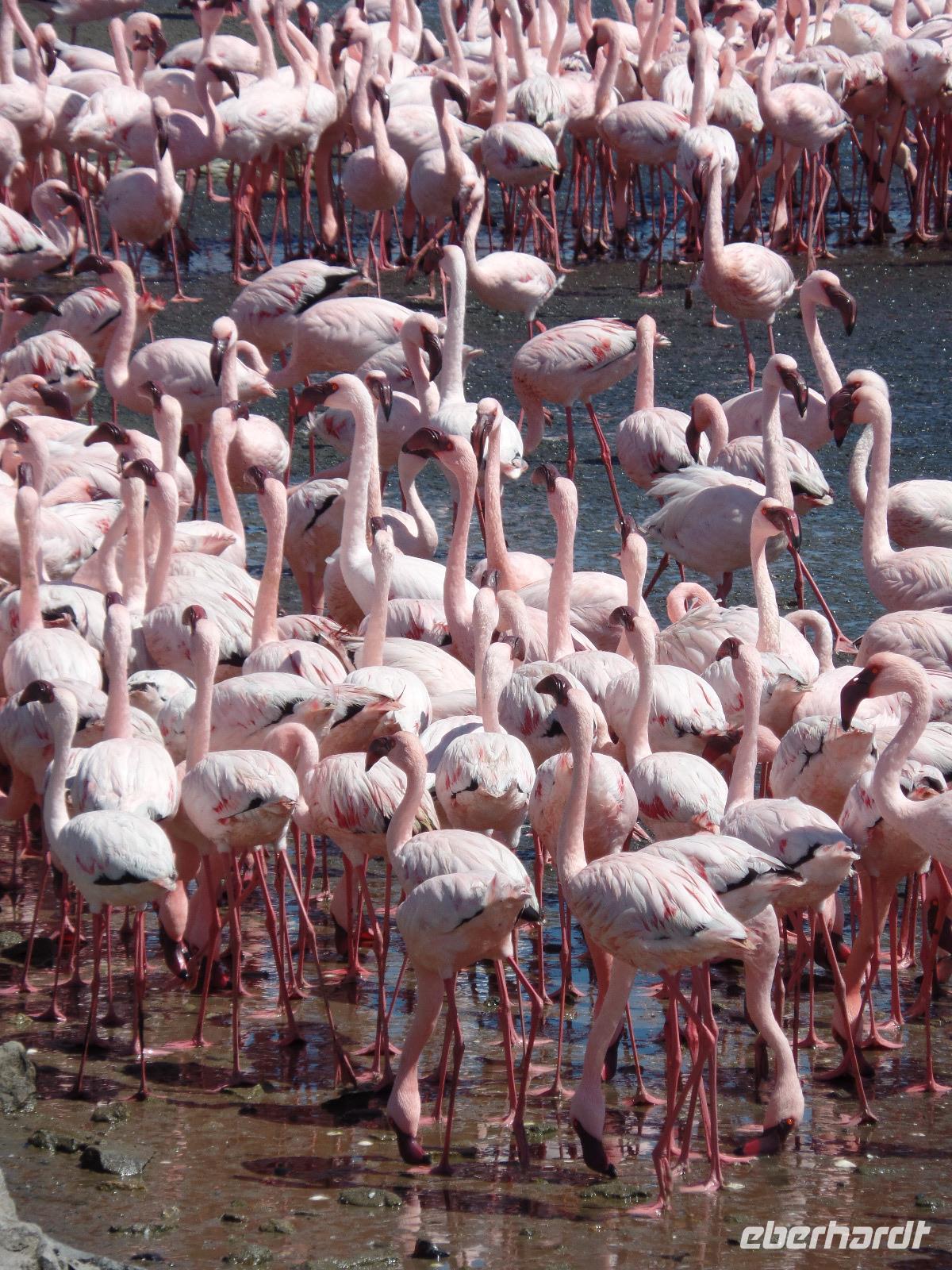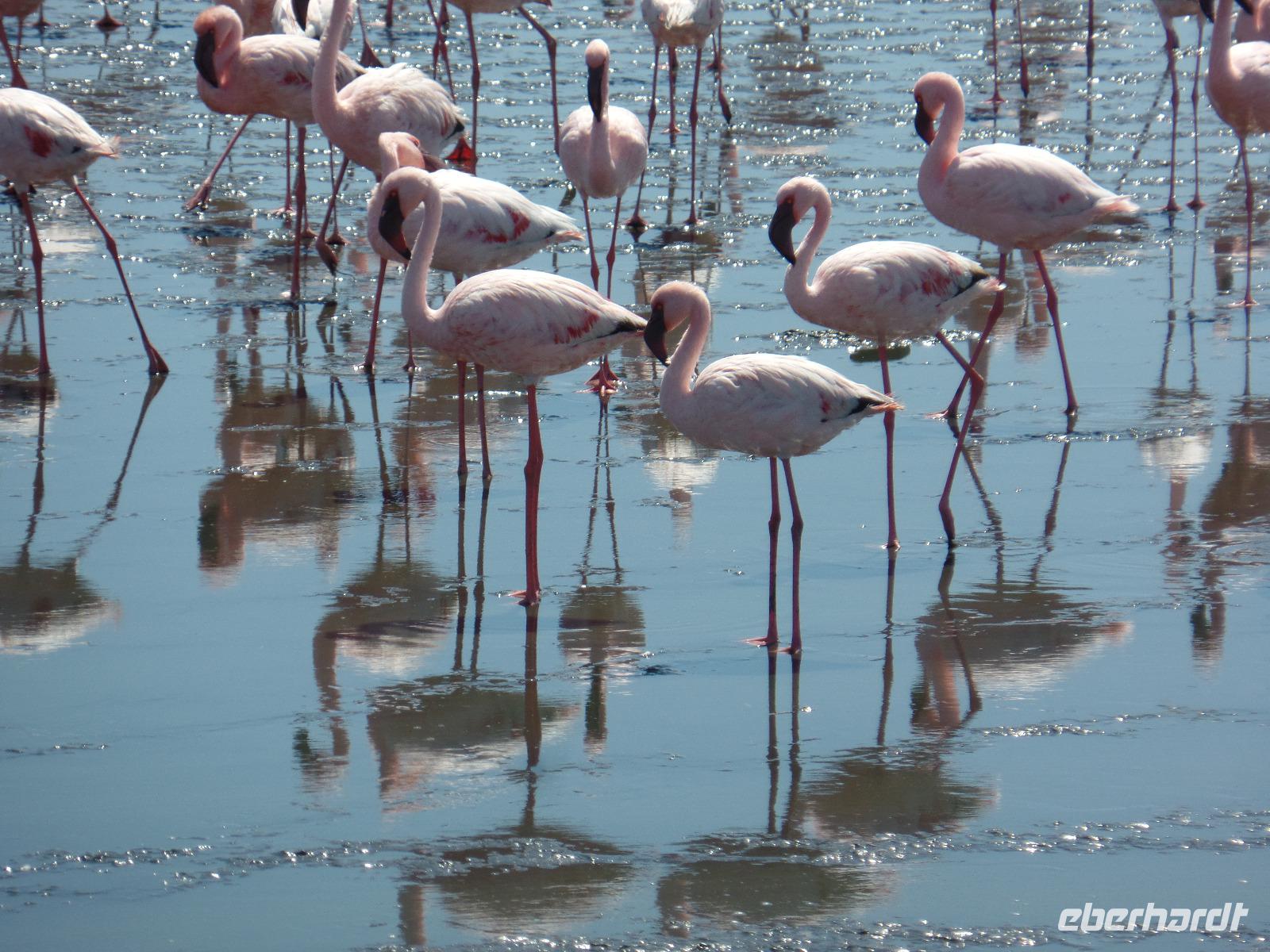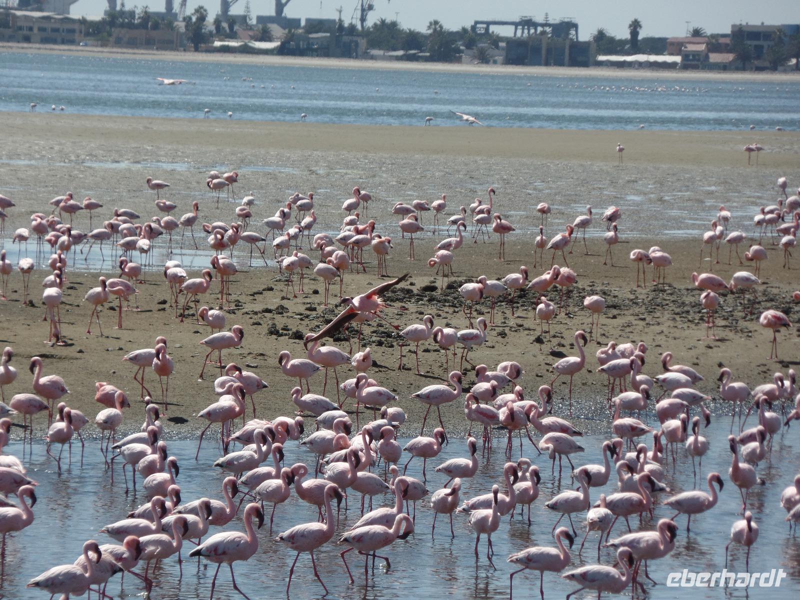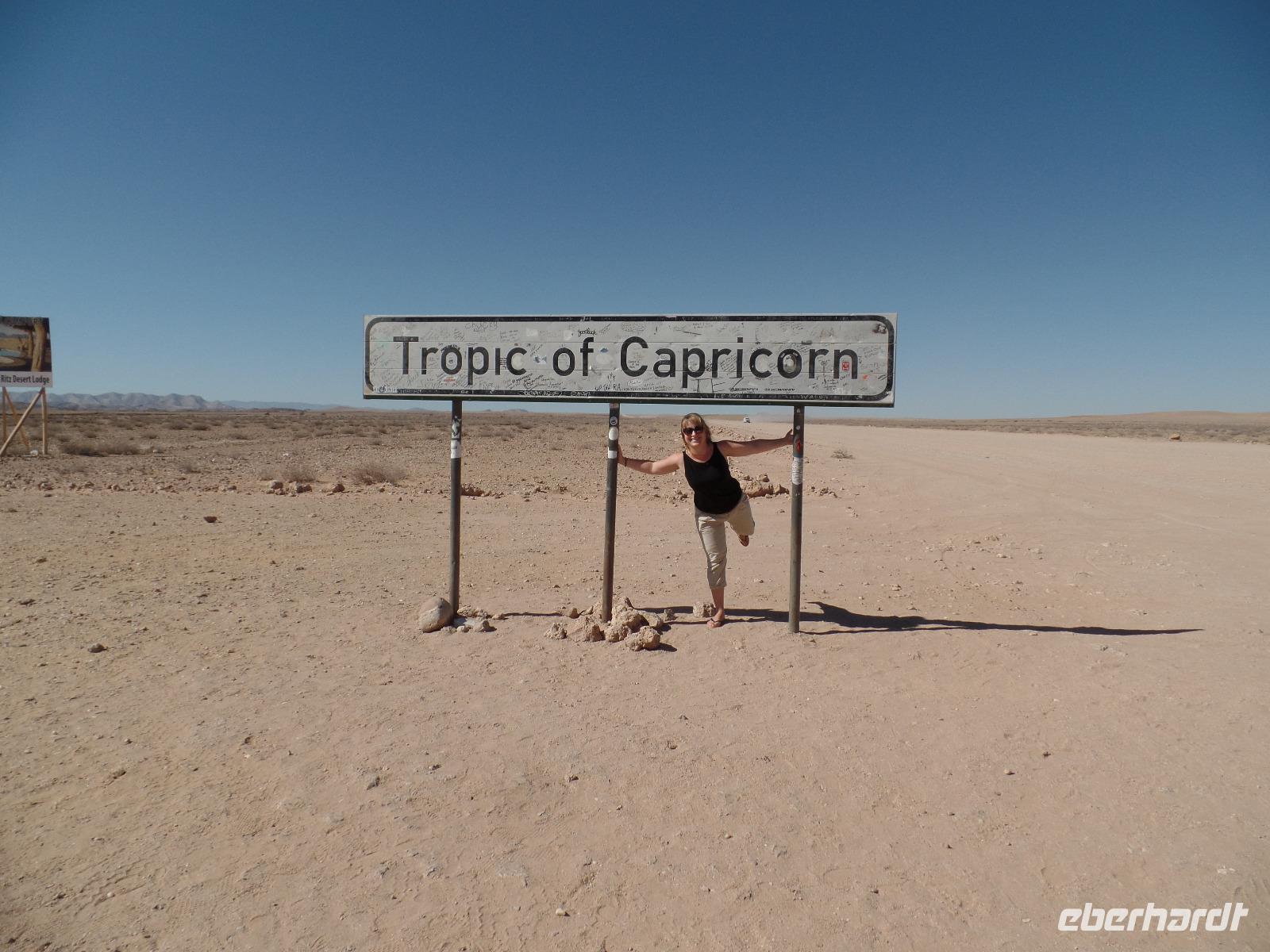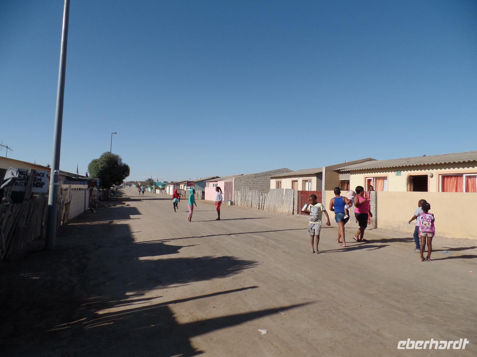Auf dem Weg durch das Naukluft Gebirge legten wir eine Pause im Örtchen Solitaire ein, welches berühmt für seinen Apfelkuchen ist. Natürlich kosteten wir den besten Apfelkuchen Afrikas und befanden ihn auch für gut. Den Punkt des südlichen Wendekreises des Steinbocks nutzten wir für eine weitere Pause und um Fotos zu machen. An diesem Punkt strahlt die Sonne am 21. Dezember jeden Jahres senkrecht auf die Erde, dass kein Schatten entsteht. Die Landschaft veränderte sich wieder in eine karge Wüste bis wir zu Felsformationen, bestehend aus Glitterschiefer kamen. Wir hatten also den Kuiseb Canyon erreicht, wo sich Prof. Dr. Henno Martin während des 2. Weltkrieges versteckt hielt. Die Höhle war ein guter Stopp für eine Pause und wir sahen den Originalschauplatz des Buches „Wenn es Krieg gibt, gehen wir in die Wüste". Der weitere Weg nach Swakopmund wurde wieder von einem wüstenartigen Gebiet begleitet und so erreichten wir die Walvis Bay. Bei einem Spaziergang konnten wir hunderte rosafarbene Flamingos beobachten, wie sie in großen Gruppen wild durcheinander zu laufen schienen. Nachdem wir im Hotel eingecheckt hatten unternahmen wir noch eine Township-Tour durch Mondesa weiter in das ärmste Stadtgebiet von Swakopmund. Die Einwohner wohnten in einfachen selbstgebauten Hütten und man sah, dass sich das Leben auf der Straße abspielte. In einem Vorgarten wurden uns von der Gruppe „Vocal Galore" afrikanische Lieder dargeboten. Die Stimmen waren so fantastische, dass wir Gänsehaut bekamen. Wir besichtigten noch das Haus eines Künstlers und eine Schule. Auch da wurde extra für uns gesungen. Beeindruckt vom Gesehenen fuhren wir zurück ins Hotel und konnten noch nach Lust und Laune bis zum Abend in der sehr europäisch anmutenden Stadt schlendern.