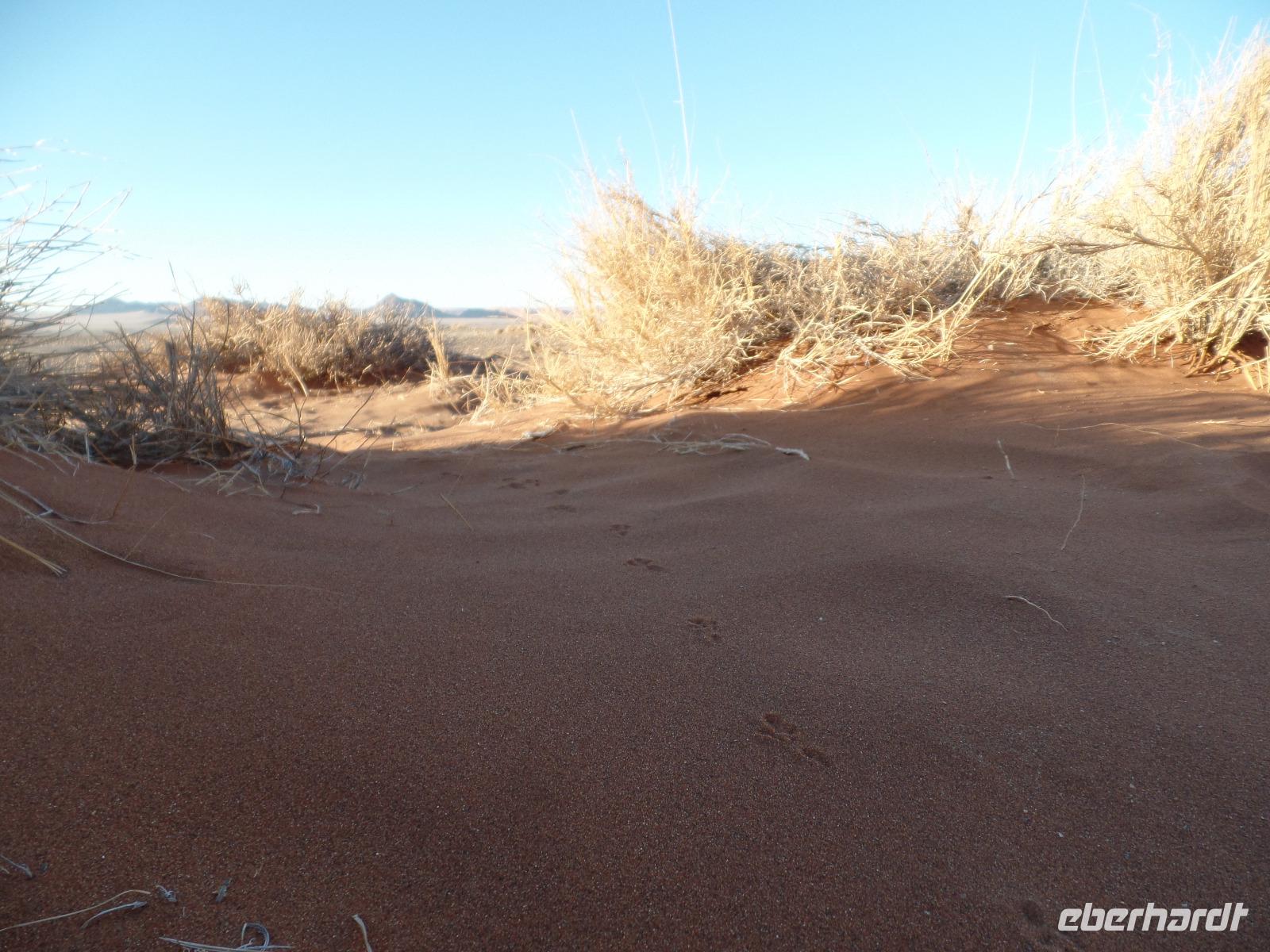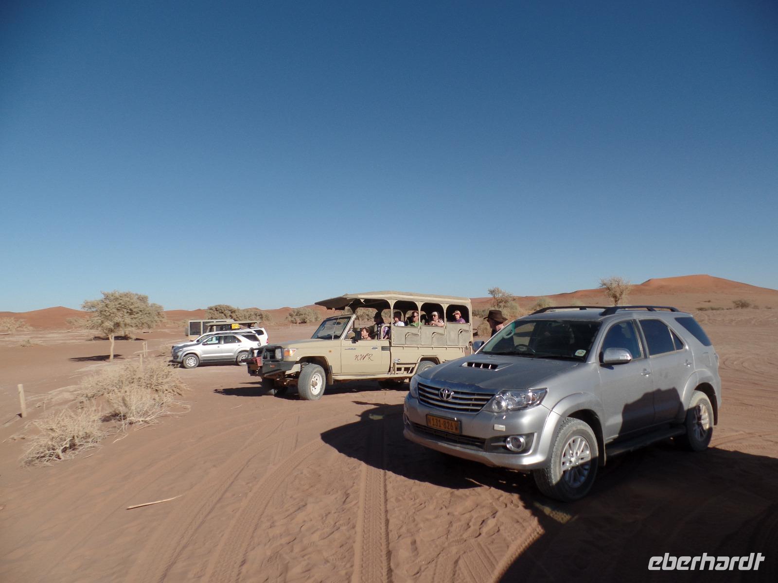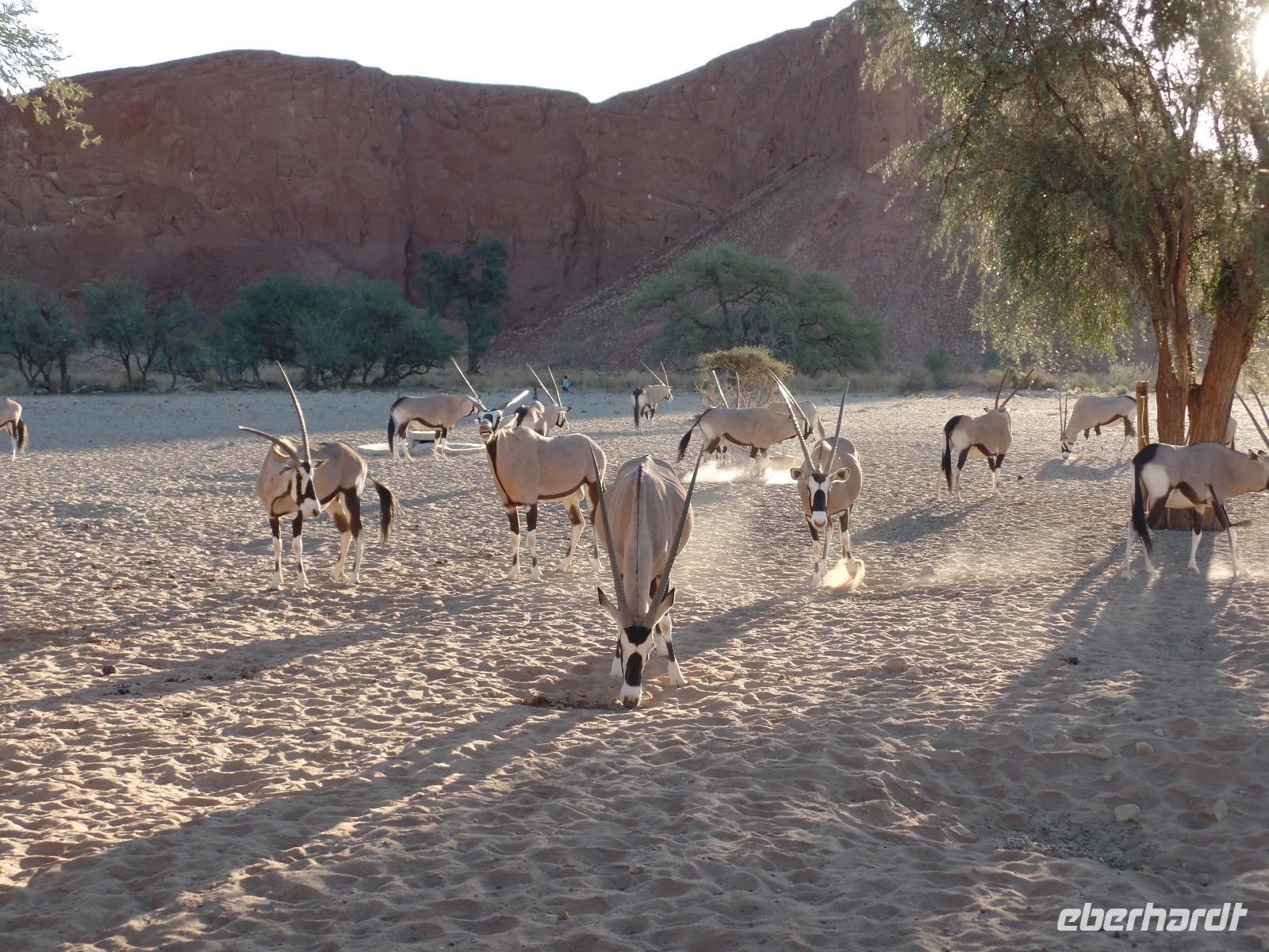 Die Sonne war noch nicht aufgegangen, doch wir waren schon unterwegs. Schließlich wollten wir den Sonnenaufgang live in der Wüste miterleben. Wir fuhren in den Sossusvlei hinein und erspähten schon einen Schakal, der vor unserem großen Safari-Jeep flüchtete. Wir hielten an einer der mächtigen Sanddünen und frühstückten in der aufgehenden Sonne. Es kamen immer mehr Besucher in den Nationalpark gefahren und einen Heißluftballon konnten wir auch am Himmel entdecken. Murray ging für uns auf Entdeckungstour und fand auch einige interessante Spuren im roten Sand. Er zeigte uns Hyänen- und Sandspinnenspuren. Wie aufregend das war. Noch vor nicht allzu langer Zeit waren an der Stelle, wo wir in Ruhe frühstückten, zwei Hyänen entlanggelaufen, die eine Eule jagten. Und auch fingen. Unsere Tour ging vorbei an der Wüste 45 weiter, bis wir in kleinere Jeeps umstiegen. Unser Ziel waren großen Dünen. Die bekannteste unter ihnen ist die von den Einheimischen „Big Daddy" oder „Crazy Dune" genannte Düne. Mit rund 350 Metern Höhe soll „Big Daddy" eine der höchsten Dünen der Welt sein. Auf dem Weg zur Düne staunten wir nicht schlecht, als Bianca eine kleine Baby-Sandviper entdeckte, auch Sidewinder genannt, die nicht minder giftig war als die erwachsenen Exemplare. Weiter durch den heißen Sand stapfend kamen wir immer näher zu „Big Daddy" und dem angrenzenden Dead Vlei, ein totes Tal mit schwarzen vertrockneten Bäumen. Es war nun um die Mittagszeit, die Sonne stand senkrecht über uns und trotzdem konnten wir unsere Entdeckungslust nicht zügeln. Drei der Reisgruppe stiegen „Big Daddy" hinauf. Wahnsinnig anstrengend aber der Ausblick hat alles belohnt. Während wir die Gegend bewunderten, entdeckten Murray und Bianca weitere Wüstenbewohner, die sie auch freudig der Reisegruppe zeigten. Eine ausgewachsene Sandviper und eine kleine Eidechse gewannen die Aufmerksamkeit. Wir stapften zurück zu den Jeeps und sahen auf der rumpeligen Rückfahrt, dass es selbst den Springböcken zu warm in der Sonne war. Mit unserem Safari-Jeep legten wir noch einen kurzen Fotostopp an der Düne 45 ein. Nach einem leckeren Mittags-Picknick am Rande der Namib unternahmen wir einen sportlichen Spaziergang im Sesriem Canyon und fuhren zurück zu unsere Lodge. Die freie Zeit genossen wir um die direkt an unseren Bungalows vorbei laufenden Oryxe zu beobachten, den Pool erneut zu testen oder afrikanisches Bier zu kosten. Nach dem Abendessen zeigte uns Bianca in ihrer liebevollen Art die Sterne am klaren Himmel und erläuterte uns die Sternbilder. Mit einem Amarula-Betthüpferl verabschiedeten wir uns und gingen vergnügt schlafen.
