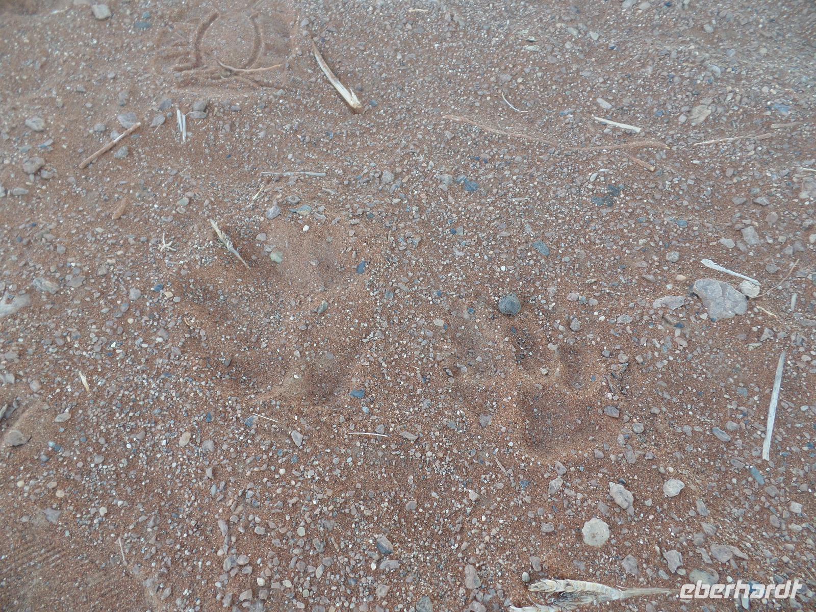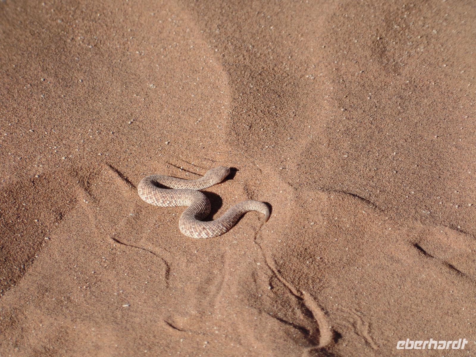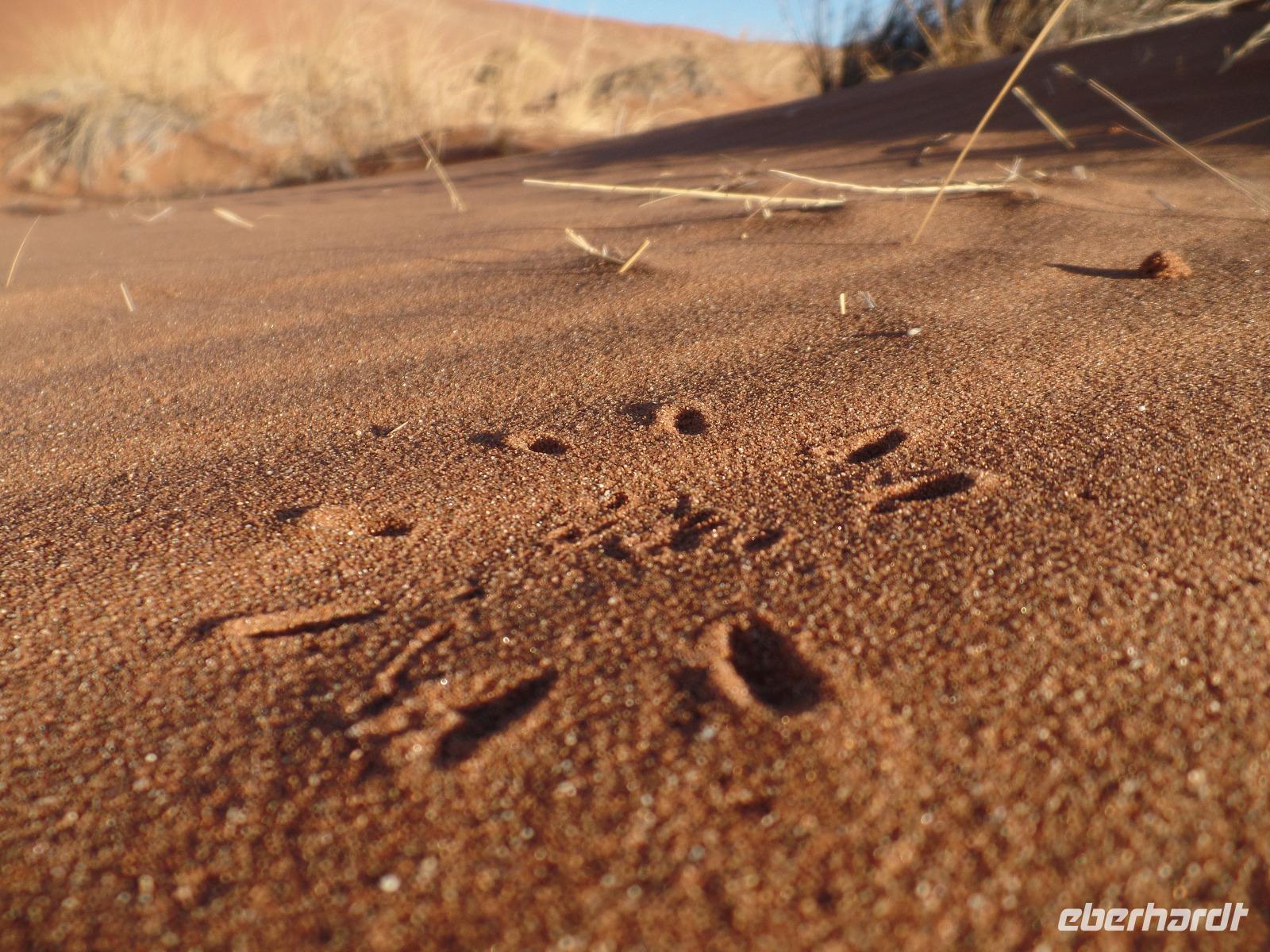 Die Sonne war noch nicht aufgegangen, doch wir waren schon unterwegs. Schließlich wollten wir den Sonnenaufgang live in der Wüste miterleben. Wir fuhren in den Sossusvlei hinein und erspähten schon einen Schakal, der vor unserem großen Safari-Jeep flüchtete. Wir hielten an einer der mächtigen Sanddünen und frühstückten in der aufgehenden Sonne. Es kamen immer mehr Besucher in den Nationalpark gefahren und einen Heißluftballon konnten wir auch am Himmel entdecken. Murray ging für uns auf Entdeckungstour und fand auch einige interessante Spuren im roten Sand. Er zeigte uns Hyänen- und Sandspinnenspuren. Wie aufregend das war. Noch vor nicht allzu langer Zeit waren an der Stelle, wo wir in Ruhe frühstückten, zwei Hyänen entlanggelaufen, die eine Eule jagten. Und auch fingen. Unsere Tour ging vorbei an der Wüste 45 weiter, bis wir in kleinere Jeeps umstiegen. Unser Ziel waren großen Dünen. Die bekannteste unter ihnen ist die von den Einheimischen „Big Daddy" oder „Crazy Dune" genannte Düne. Mit rund 350 Metern Höhe soll „Big Daddy" eine der höchsten Dünen der Welt sein. Auf dem Weg zur Düne staunten wir nicht schlecht, als Bianca eine kleine Baby-Sandviper entdeckte, auch Sidewinder genannt, die nicht minder giftig war als die erwachsenen Exemplare. Weiter durch den heißen Sand stapfend kamen wir immer näher zu „Big Daddy" und dem angrenzenden Dead Vlei, ein totes Tal mit schwarzen vertrockneten Bäumen. Es war nun um die Mittagszeit, die Sonne stand senkrecht über uns und trotzdem konnten wir unsere Entdeckungslust nicht zügeln. Drei der Reisgruppe stiegen „Big Daddy" hinauf. Wahnsinnig anstrengend aber der Ausblick hat alles belohnt. Während wir die Gegend bewunderten, entdeckten Murray und Bianca weitere Wüstenbewohner, die sie auch freudig der Reisegruppe zeigten. Eine ausgewachsene Sandviper und eine kleine Eidechse gewannen die Aufmerksamkeit. Wir stapften zurück zu den Jeeps und sahen auf der rumpeligen Rückfahrt, dass es selbst den Springböcken zu warm in der Sonne war. Mit unserem Safari-Jeep legten wir noch einen kurzen Fotostopp an der Düne 45 ein. Nach einem leckeren Mittags-Picknick am Rande der Namib unternahmen wir einen sportlichen Spaziergang im Sesriem Canyon und fuhren zurück zu unsere Lodge. Die freie Zeit genossen wir um die direkt an unseren Bungalows vorbei laufenden Oryxe zu beobachten, den Pool erneut zu testen oder afrikanisches Bier zu kosten. Nach dem Abendessen zeigte uns Bianca in ihrer liebevollen Art die Sterne am klaren Himmel und erläuterte uns die Sternbilder. Mit einem Amarula-Betthüpferl verabschiedeten wir uns und gingen vergnügt schlafen.