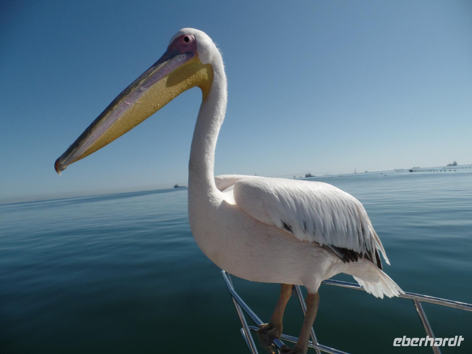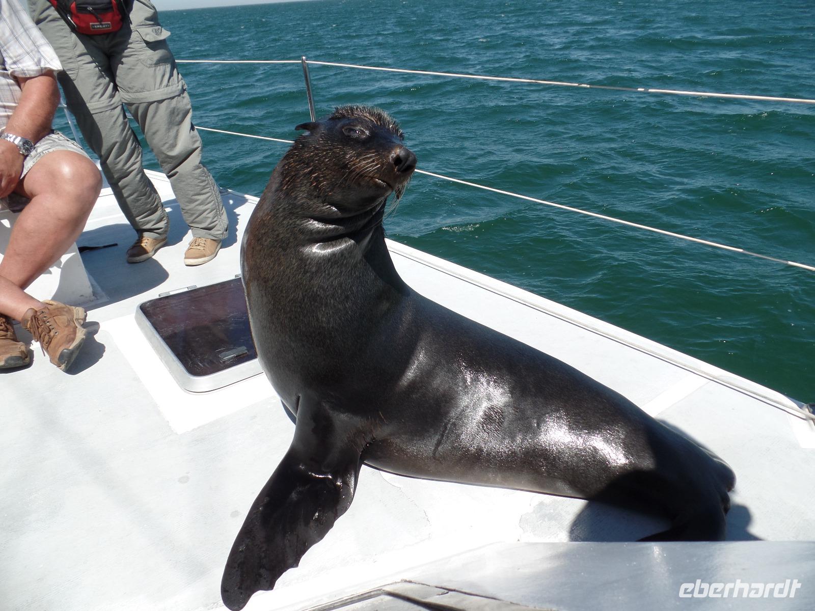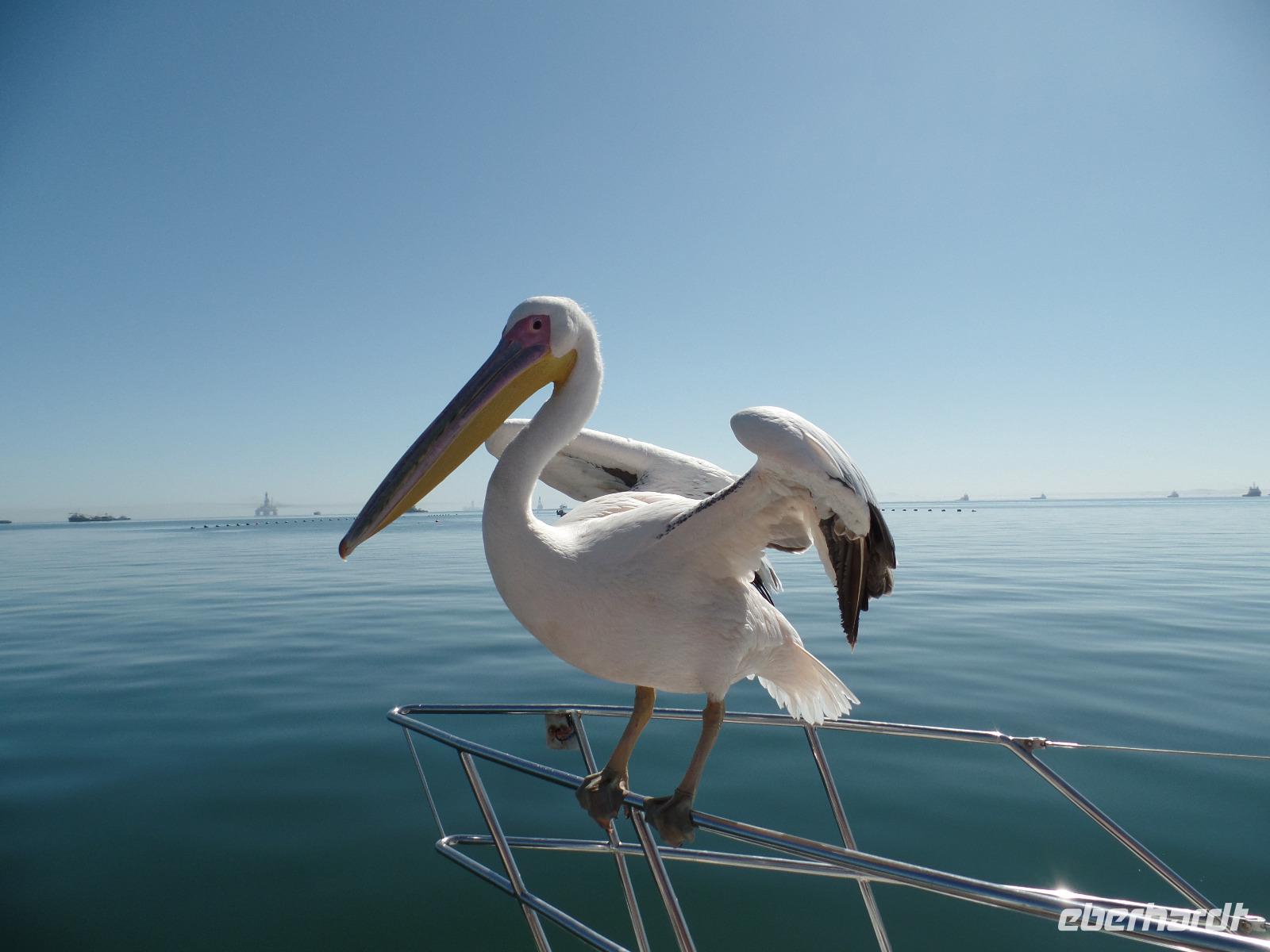 Am Morgen fuhr uns Murray zum Hafen in Walvis Bay. Vor dem Katamaran warteten schon Pelikane und eine Robbe auf uns. Die Fahrt fing mit der Fütterung der Pelikane spannend an. Die Tiere schienen überhaupt keine Scheu vor uns Menschen zu haben. Vertraut setzten sie sich auf die Reling und wir konnten ihnen so nah wie nirgends kommen. Natürlich wurde die Chance genutzt, einzigartige Selfies zu schießen. Wir trauten unseren Augen kaum, als aus dem Meer eine Robbe auf unseren Katamaran gesprungen kam. Auch sie schienen das Boot und die Besatzung zu kennen. Einmal hübsch pohsen und schon kam ein kleiner Fisch als Leckerli und weg waren sie wieder. Dieses bunte Treiben zog sich noch eine ganze Weile, wir hatten wirklich regen Besuch auf dem Boot.