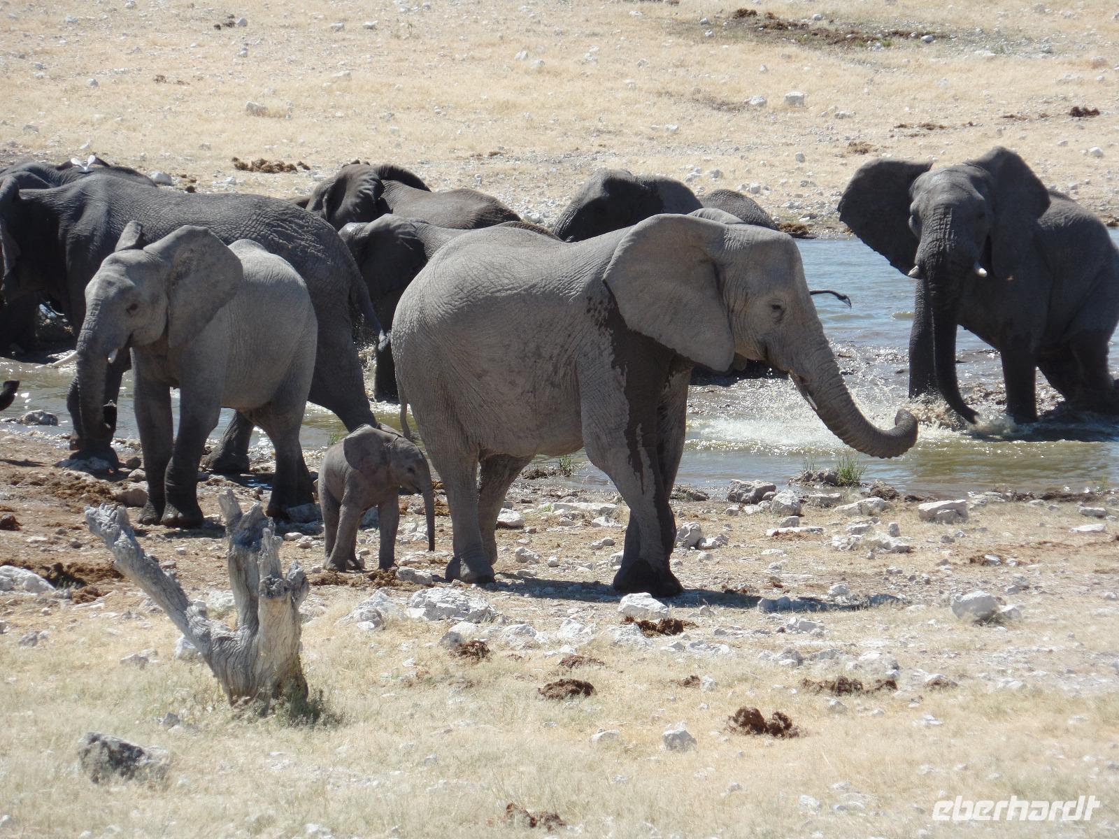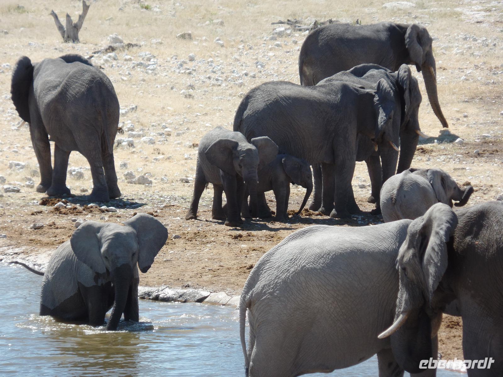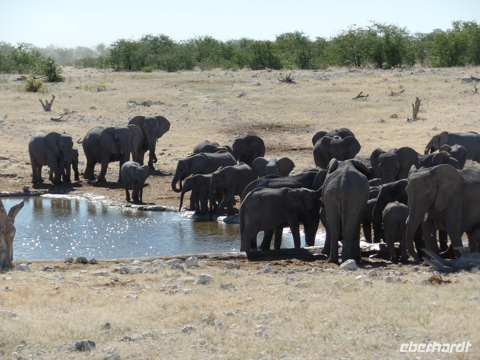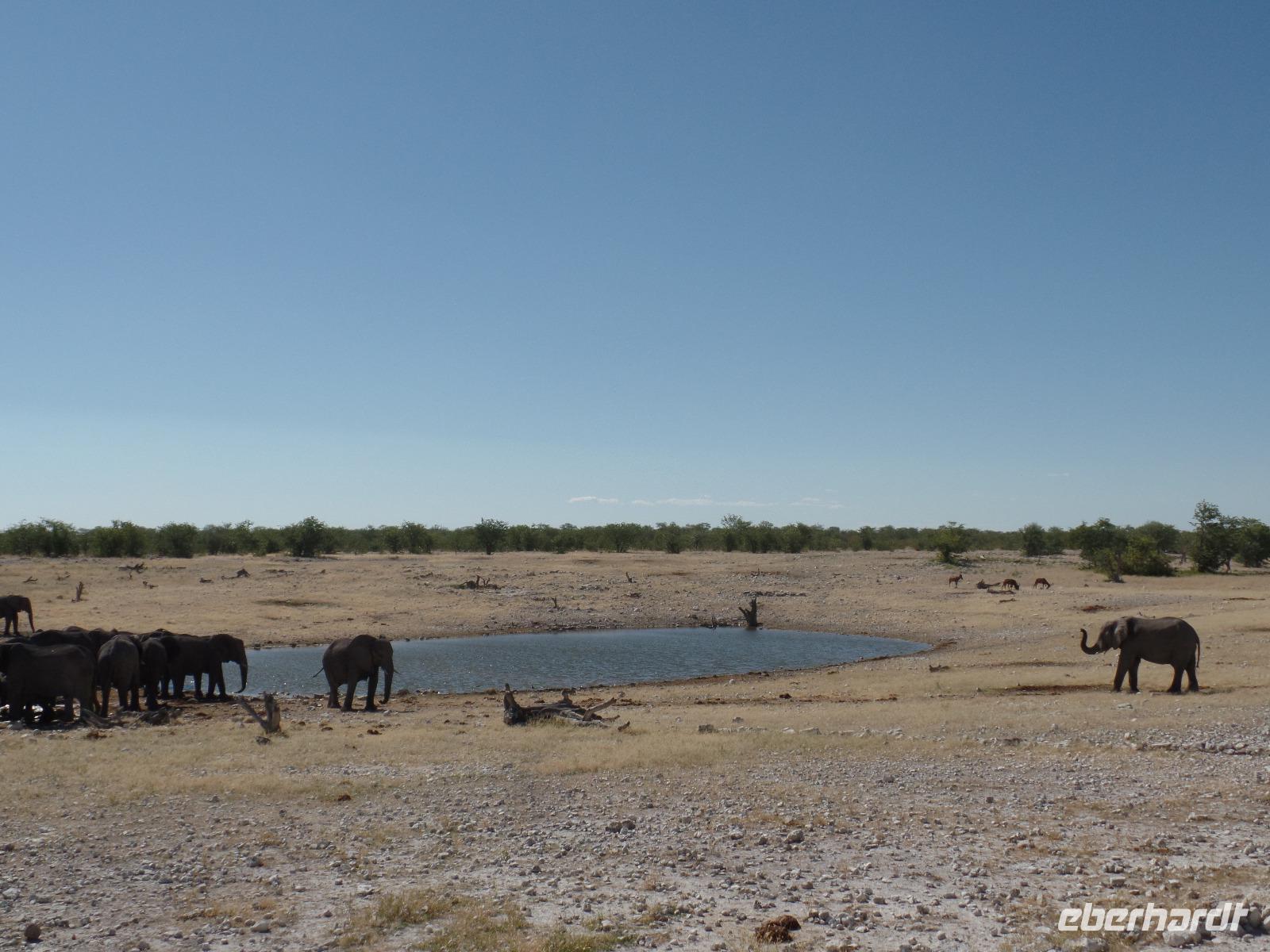 Früh am Morgen fuhren wir wieder voller Hoffnung auf spannende tierische Begegnungen in den Etosha Nationalpark. Wir fuhren wieder verschiedene Wasserlöcher an und entdeckten wilde Springböcke, Gnus, Zebras die umherstreiften und sogar wieder eine Löwin, die offensichtlich darauf wartete, die in der Nähe stehenden Antilopen näher zu betrachten. Eine große Überraschung war, als wir an einem Wasserloch eine riesige Elefantenherde entdeckten. Sogar kleine Elefantenkinder tollten herum, wurden aber von den Müttern nie aus den Augen gelassen. Wir standen sehr lange da und beobachteten fasziniert diese Herde. Immer mal kamen andere Tiere dazu, tranken und verschwanden wieder im Dickicht. Nachdem wir nun eine Weile diese wunderschönen Tiere beobachteten überkam uns langsam der Hunger. Murray und Bianca fuhren mit uns in eine abgesicherte Lodge und wir genossen ein letztes Mal ein rustikales Picknick unter freiem Himmel. Ein weiterer kleiner Höhepunkt des Tages war die Fahrt zur Etosha-Pfanne, mit einer Länge von 130 Kilometern und einer Breite von 50 Kilometern die größte Salzpfanne in Afrika. Immer wieder entdeckten wir die großartigen Tiere des Parks und ließen ihn beeindruckt hinter uns liegen.