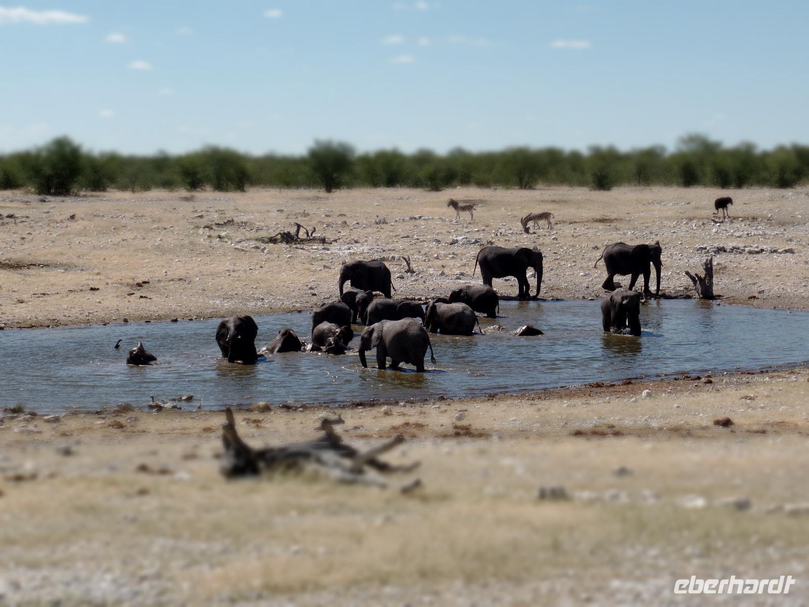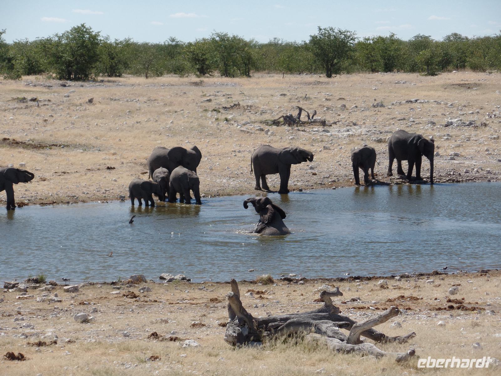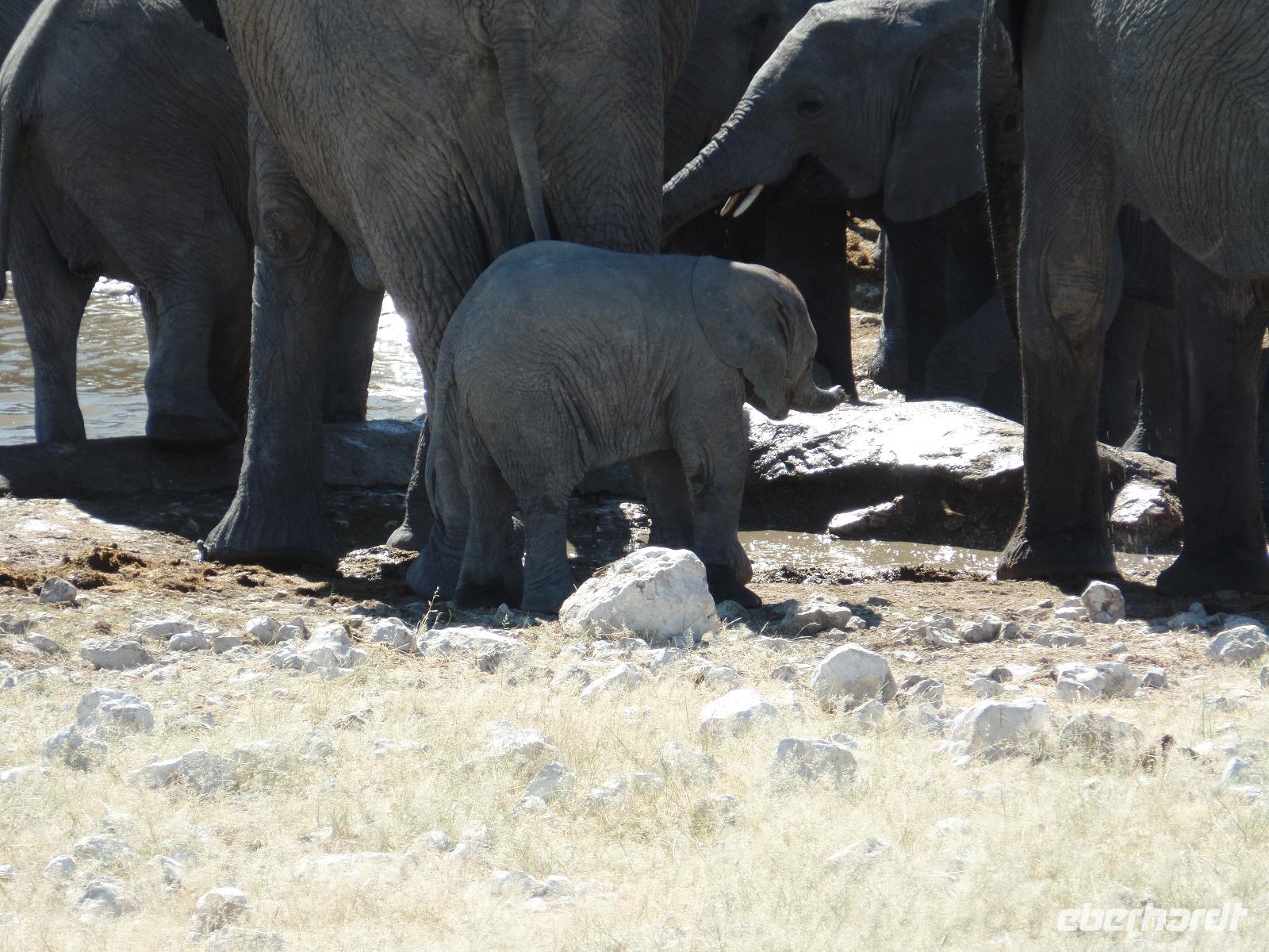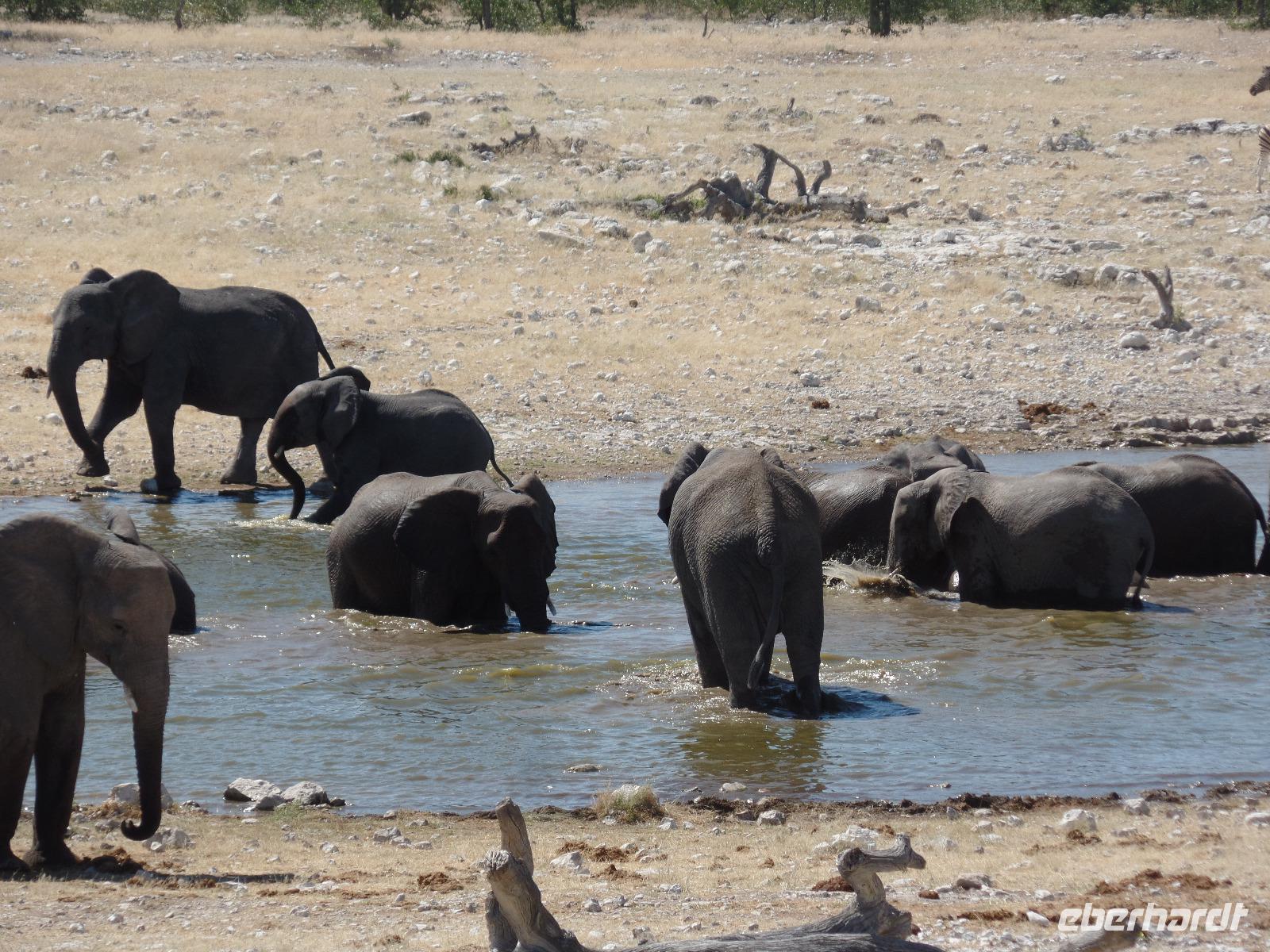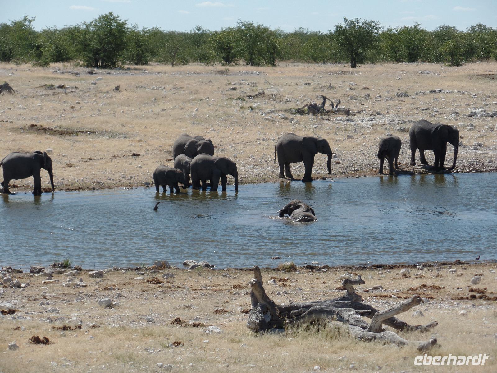 Früh am Morgen fuhren wir wieder voller Hoffnung auf spannende tierische Begegnungen in den Etosha Nationalpark. Wir fuhren wieder verschiedene Wasserlöcher an und entdeckten wilde Springböcke, Gnus, Zebras die umherstreiften und sogar wieder eine Löwin, die offensichtlich darauf wartete, die in der Nähe stehenden Antilopen näher zu betrachten. Eine große Überraschung war, als wir an einem Wasserloch eine riesige Elefantenherde entdeckten. Sogar kleine Elefantenkinder tollten herum, wurden aber von den Müttern nie aus den Augen gelassen. Wir standen sehr lange da und beobachteten fasziniert diese Herde. Immer mal kamen andere Tiere dazu, tranken und verschwanden wieder im Dickicht. Nachdem wir nun eine Weile diese wunderschönen Tiere beobachteten überkam uns langsam der Hunger. Murray und Bianca fuhren mit uns in eine abgesicherte Lodge und wir genossen ein letztes Mal ein rustikales Picknick unter freiem Himmel. Ein weiterer kleiner Höhepunkt des Tages war die Fahrt zur Etosha-Pfanne, mit einer Länge von 130 Kilometern und einer Breite von 50 Kilometern die größte Salzpfanne in Afrika. Immer wieder entdeckten wir die großartigen Tiere des Parks und ließen ihn beeindruckt hinter uns liegen.