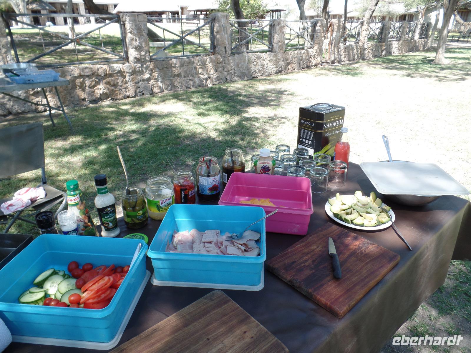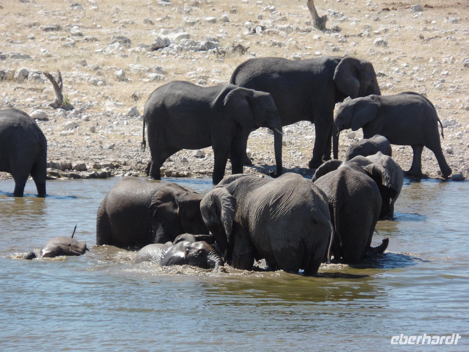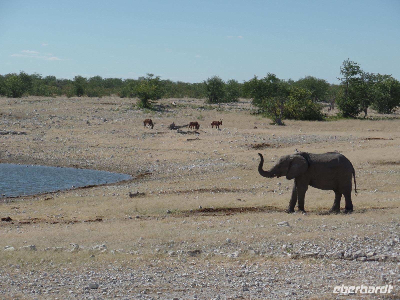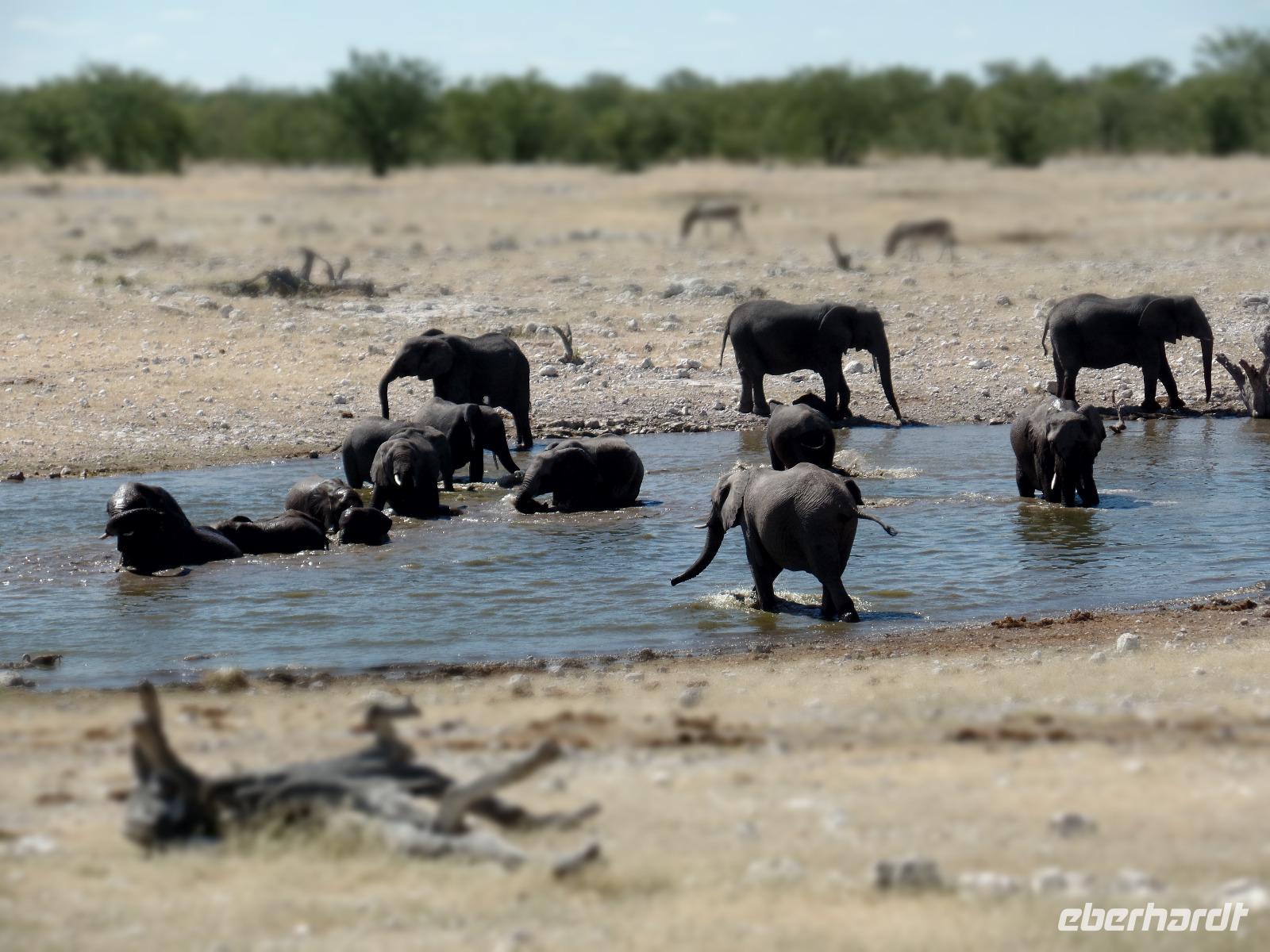 Früh am Morgen fuhren wir wieder voller Hoffnung auf spannende tierische Begegnungen in den Etosha Nationalpark. Wir fuhren wieder verschiedene Wasserlöcher an und entdeckten wilde Springböcke, Gnus, Zebras die umherstreiften und sogar wieder eine Löwin, die offensichtlich darauf wartete, die in der Nähe stehenden Antilopen näher zu betrachten. Eine große Überraschung war, als wir an einem Wasserloch eine riesige Elefantenherde entdeckten. Sogar kleine Elefantenkinder tollten herum, wurden aber von den Müttern nie aus den Augen gelassen. Wir standen sehr lange da und beobachteten fasziniert diese Herde. Immer mal kamen andere Tiere dazu, tranken und verschwanden wieder im Dickicht. Nachdem wir nun eine Weile diese wunderschönen Tiere beobachteten überkam uns langsam der Hunger. Murray und Bianca fuhren mit uns in eine abgesicherte Lodge und wir genossen ein letztes Mal ein rustikales Picknick unter freiem Himmel. Ein weiterer kleiner Höhepunkt des Tages war die Fahrt zur Etosha-Pfanne, mit einer Länge von 130 Kilometern und einer Breite von 50 Kilometern die größte Salzpfanne in Afrika. Immer wieder entdeckten wir die großartigen Tiere des Parks und ließen ihn beeindruckt hinter uns liegen.