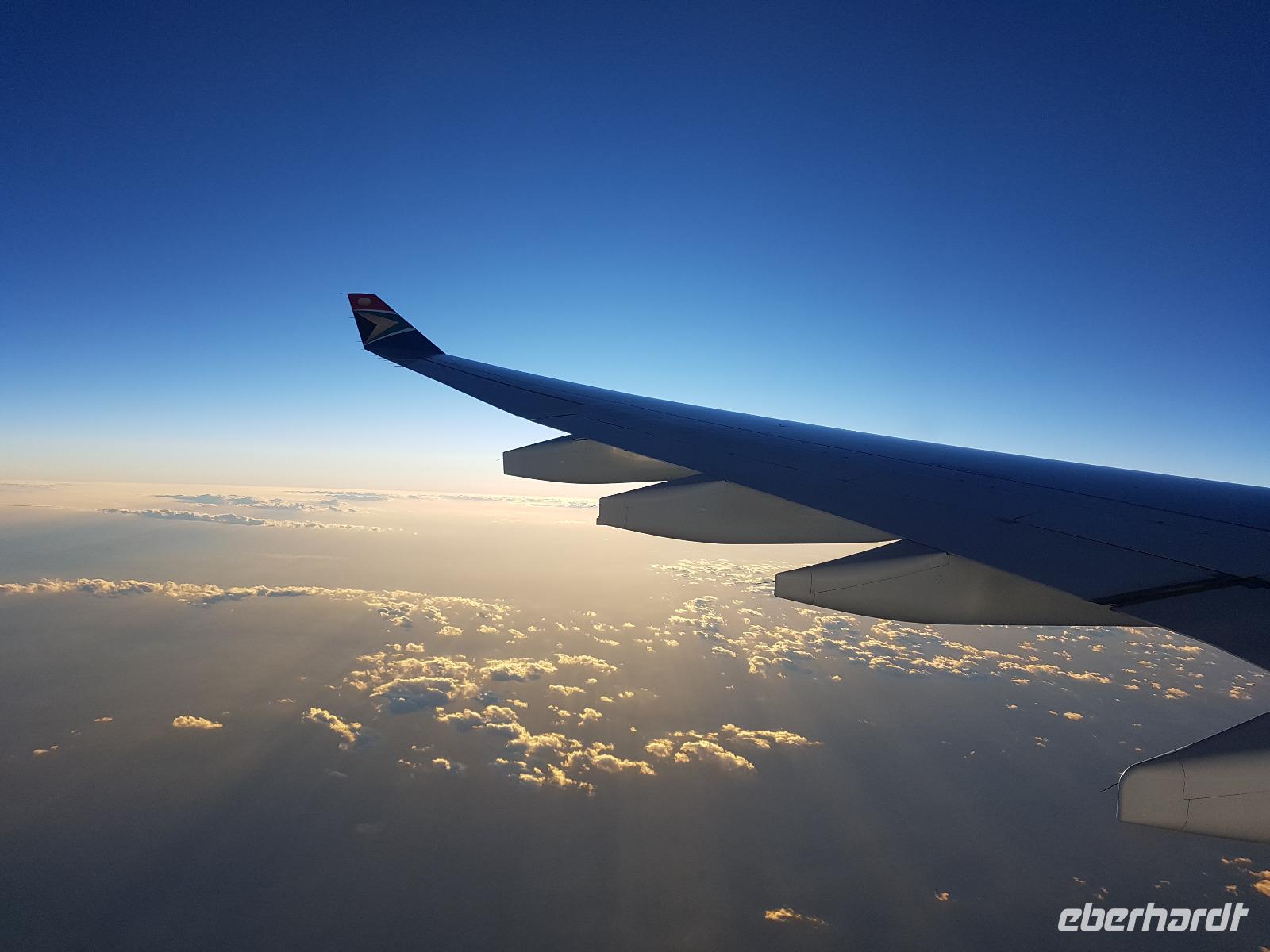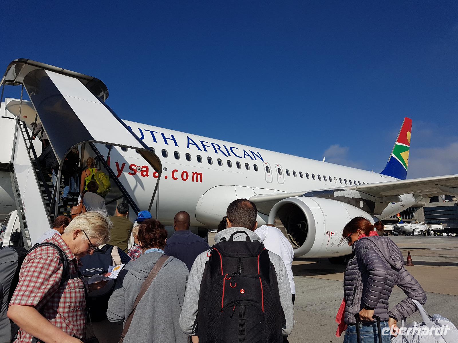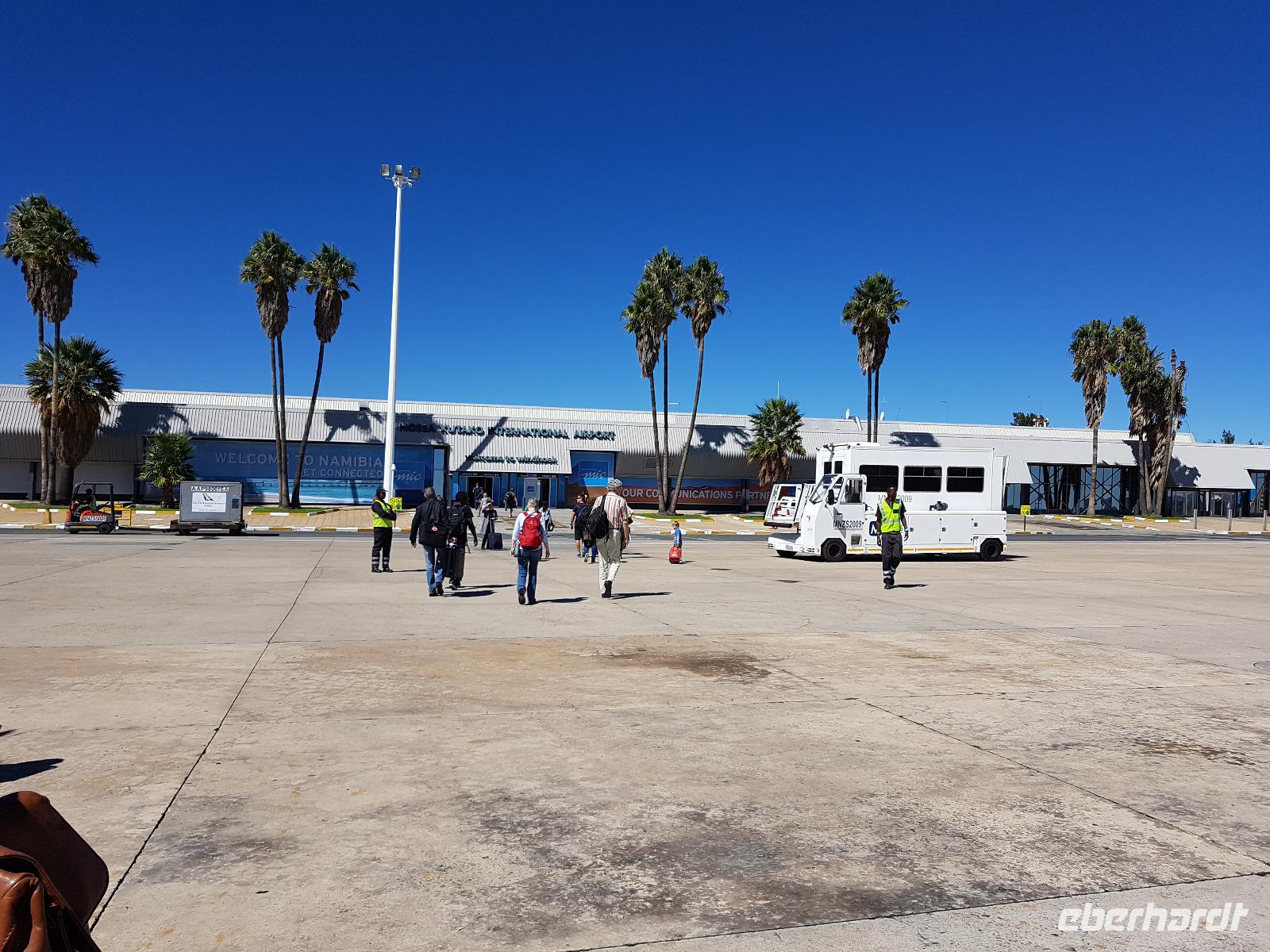 An der Christus Kirche stiegen wir aus und schauten die Kirche von Innen an. An dieser Stelle schaut man auf alle wichtigen Gebäude- die erste Schule, ein lang gezogenes Gebäude mit rotem Dach, dahinter die Bank of Namibia und gegenüber das imposante Bauwerk des Unabhängigkeitsmuseums mit der Statue des ersten namibischen Präsidenten Sam Nujoma. An vielen neuen, teilweise auch im Bau befindlichen Gebäuden vorbei kamen wir auf die Hauptstrasse im Zentrum - heute Independence Avenue und einst Kaiserstrasse. Dort ist aus der Kaiserzeit noch ein schönes grünweisses Gebäude erhalten, was heute das Grundbuchamt beherbergt. Den nächsten Stopp gab es am alten Bahnhof, wo das gut erhaltene Gebäude mit den alten Schaltern und Warteräumen bei vielen Erinnerungen wach riefen. Im Gelände der einstigen Brauerei befindet sich heute ein Handwerker Zentrum und dort war dann Gelegenheit, die letzten namibischen Dollar auszugeben. Die Fahrt zum 50 km entfernten Flughafen führte aus dem Grabenbruch heraus wieder auf die Hochebene und dort nahmen wir endgültig Abschied von Barbara und Vivien. Wir checkten ein und etwas verspätet flogen wir ab nach Johannesburg. Dort war dann noch Zeit für letzte Einkäufe.