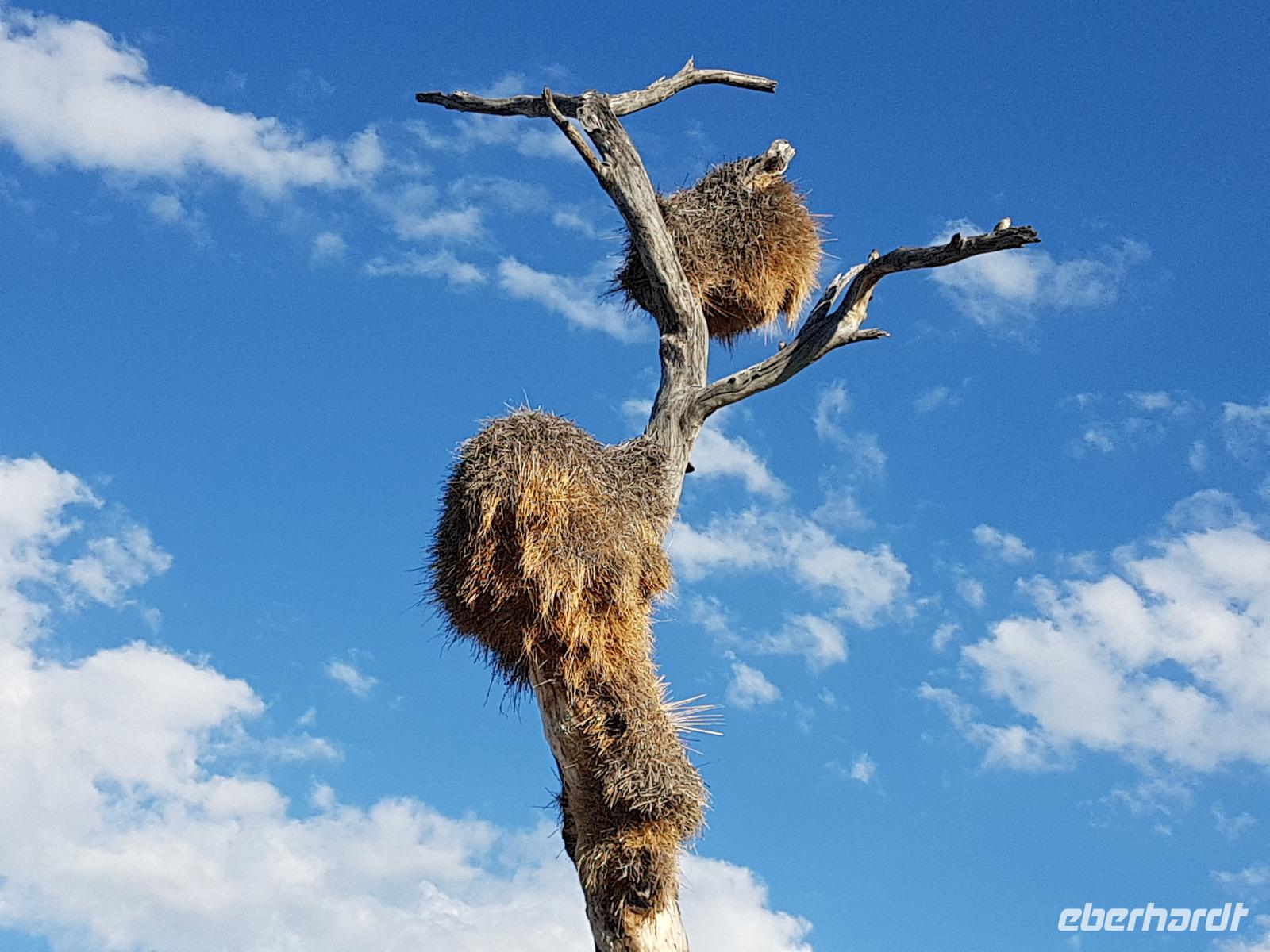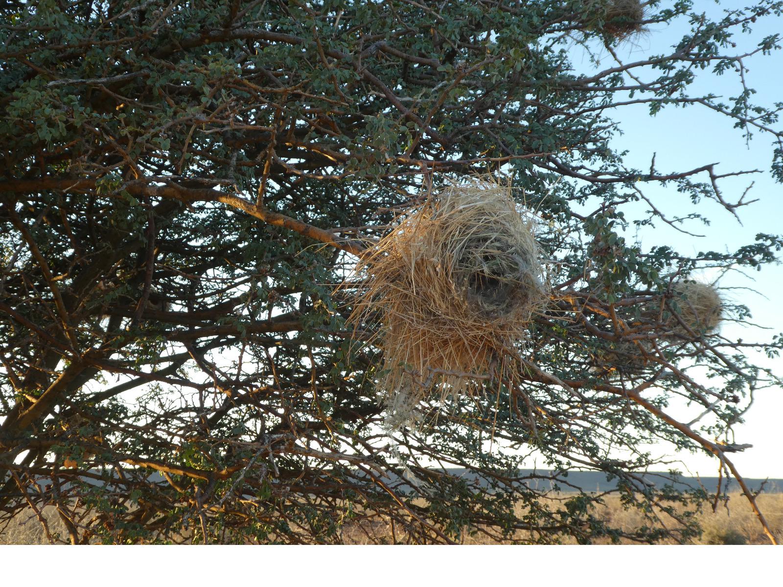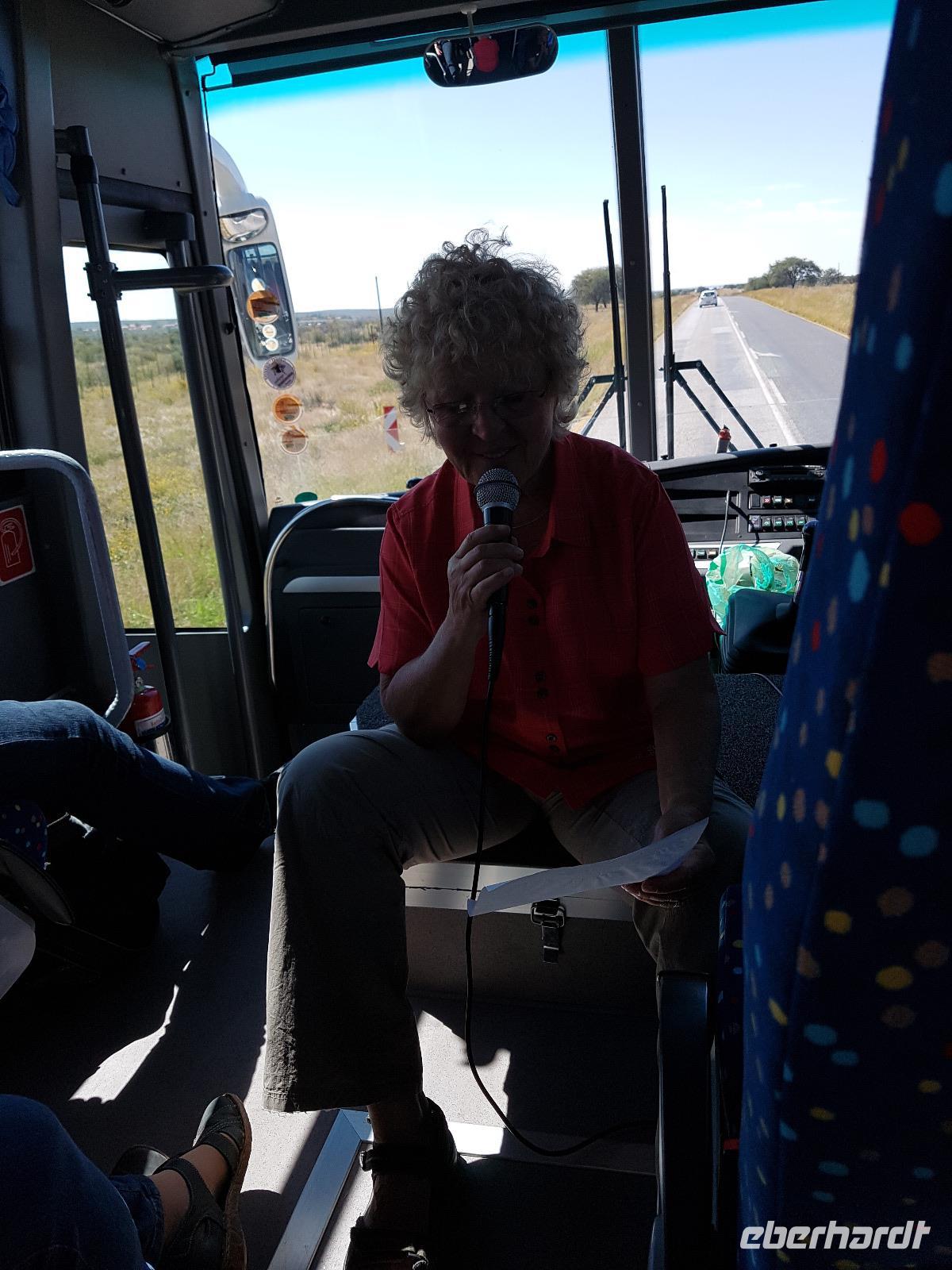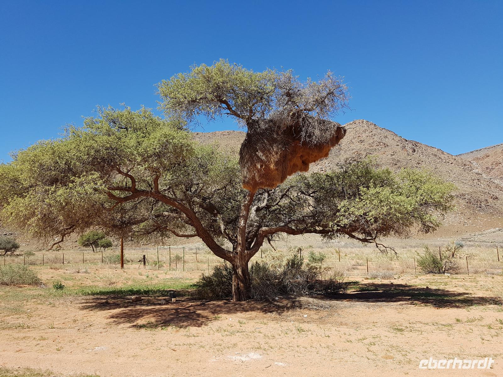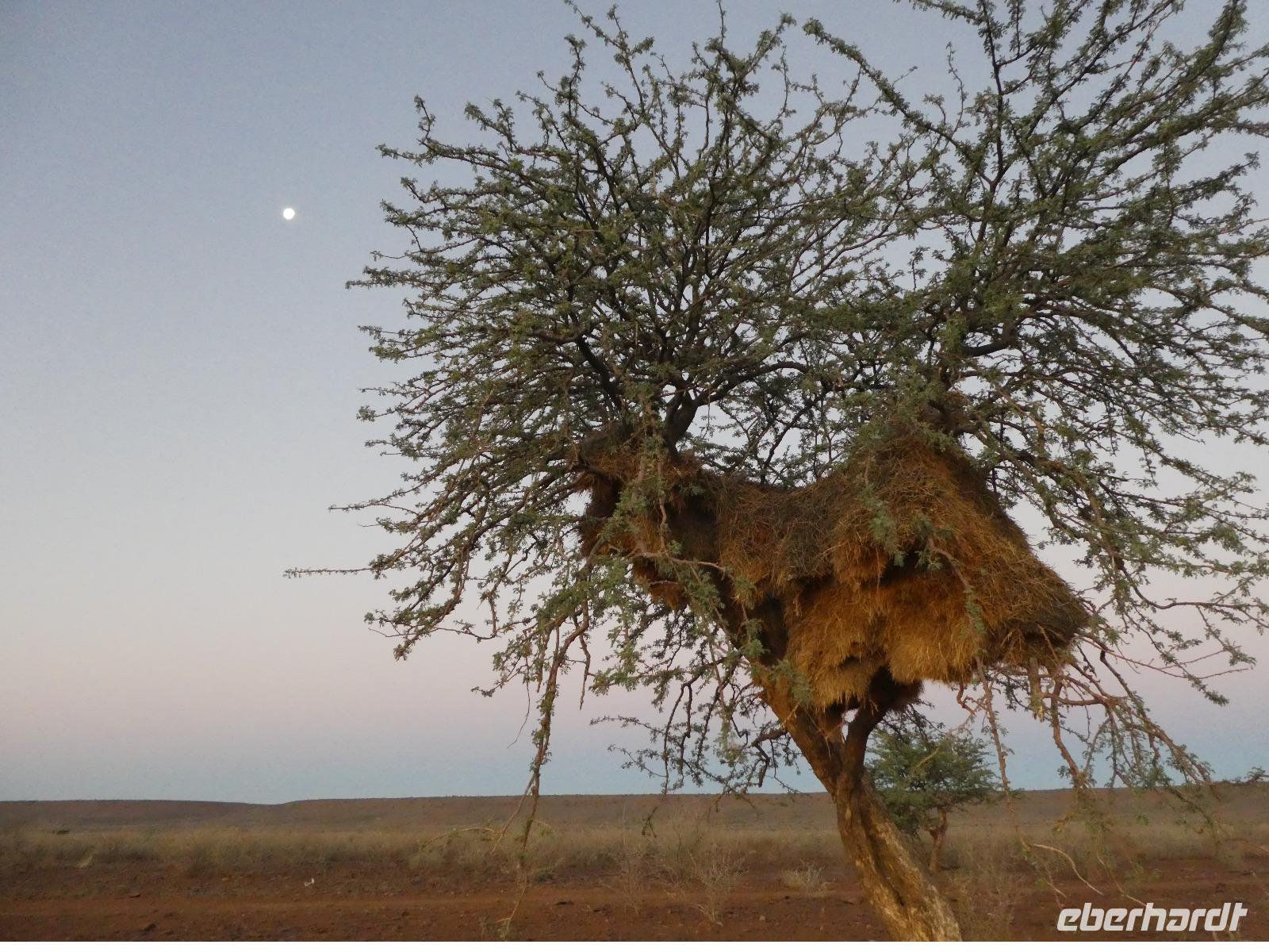Das Frühstück im Nesthotel genossen wir sehr und dann fuhren wir ein kurzes Stück bis zur Geisterstadt Kolmanskop. Während einer Führung lernten wir die verschiedenen noch erhaltenen Gebäude kennen und erfuhren viel Interessantes über das Leben von 1908 bis 1916 in der Siedlung. Danach stand uns eine lange Busfahrt erst auf einer Asphaltstrasse und dann auf Sandpisten bevor. Unterwegs sahen wir wieder ganz verschiedene Landschaften und an einem Baum mit einem riesigen Nest von Webervögeln hielten wir. Barbara prüfte erst, ob Schlangen beim Nest waren und berichtete dann ausführlich über die kleinen unseren Spatzen ähnelnden Vögel und wir fotografierten fleissig. In Helmerighausen gab es dann eine längere Pause in einem wunderschönen Gartenlokal. Apfelkuchen, Bratwurst, frisches Brot wurden angeboten und wir liessen es uns schmecken. Weiter fuhren wir auf Sandpisten bis zur Maltahöhe und dort begann schon das Gelände der Namseb Farm mit der Namseb Lodge. Am Abend dann endlich waren wir da, bezogen unsere Bungalows, genossen den Sonnenuntergang und freuten uns auf das Abendessen. Die afrikanischen Frauen kochten nicht nur gut, sondern tanzten und sangen auch für uns ganz spontan.