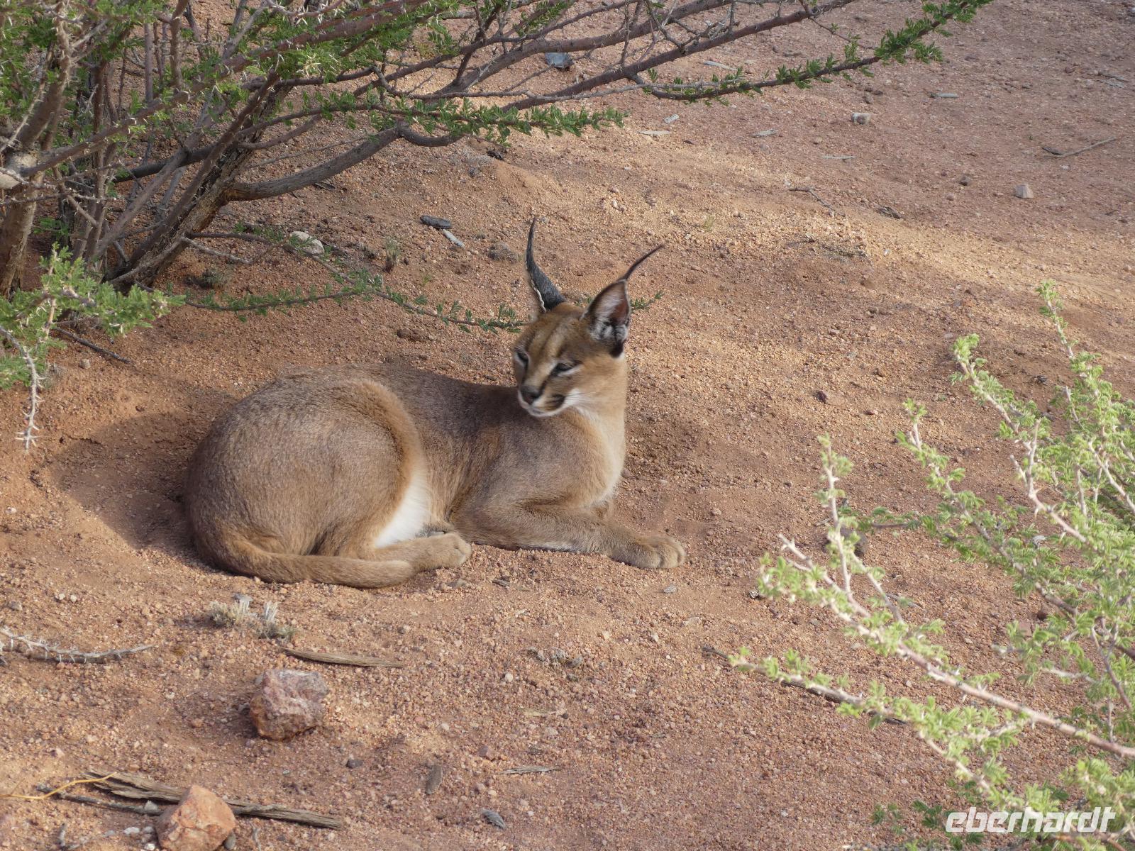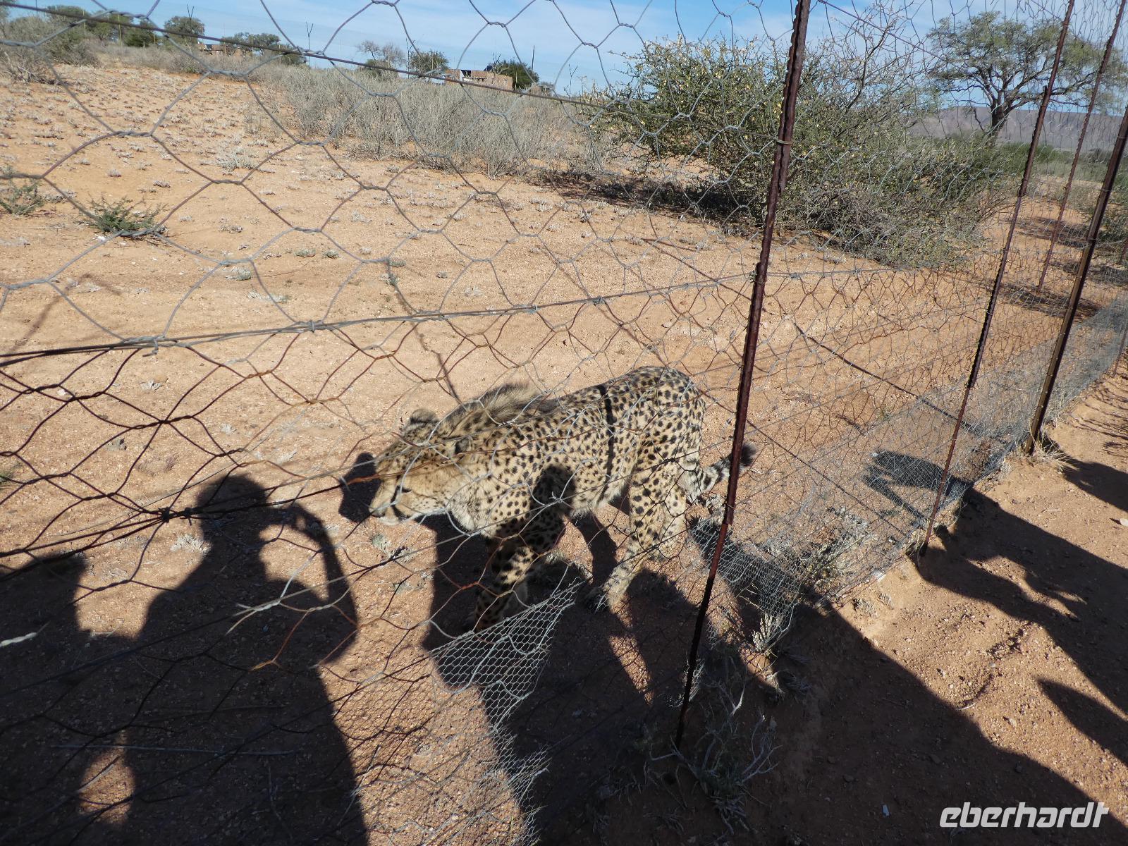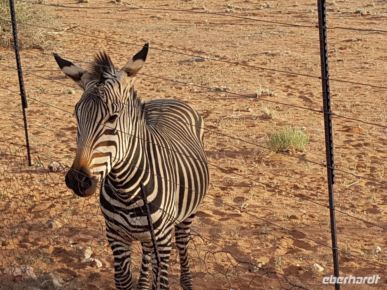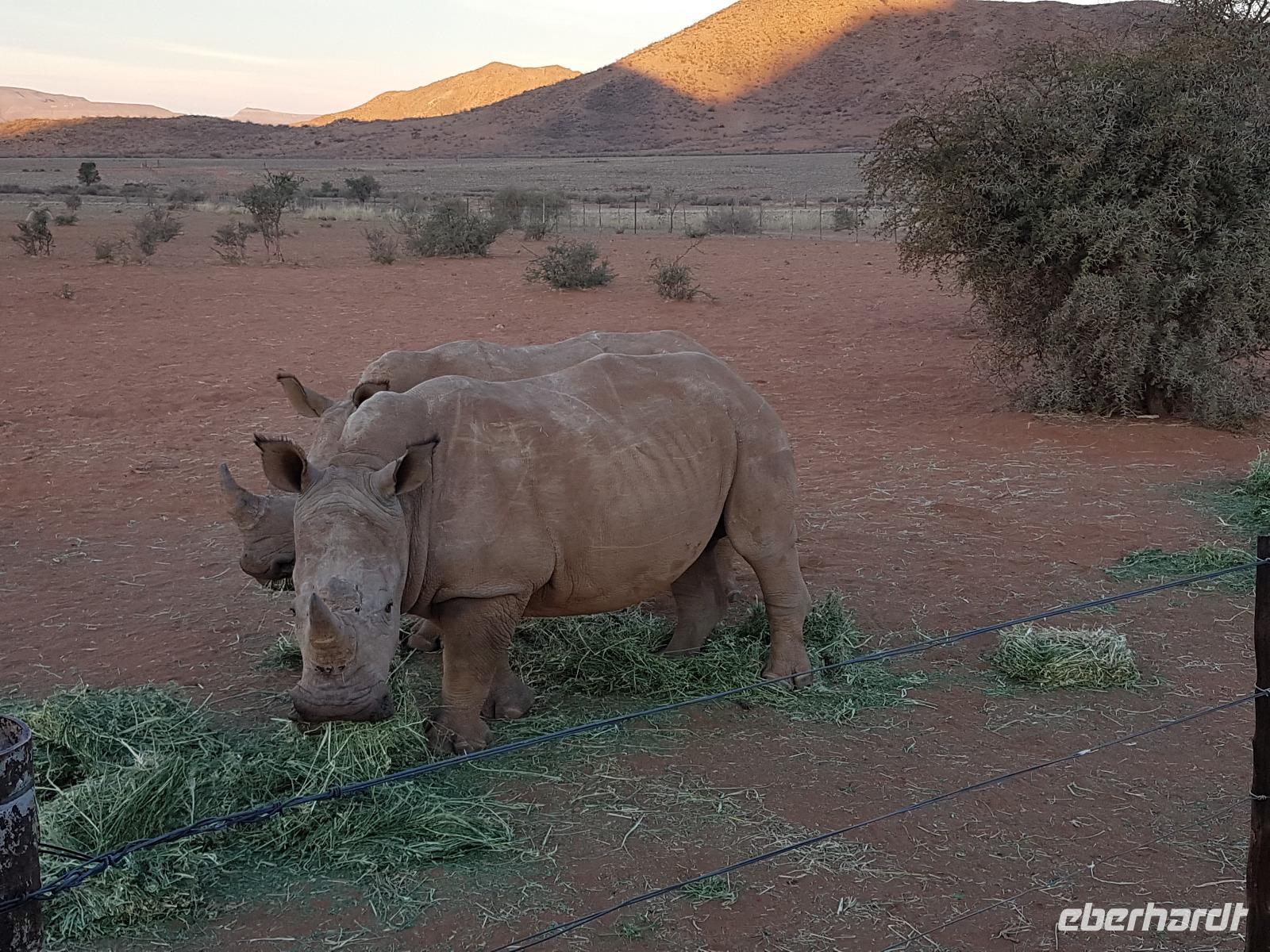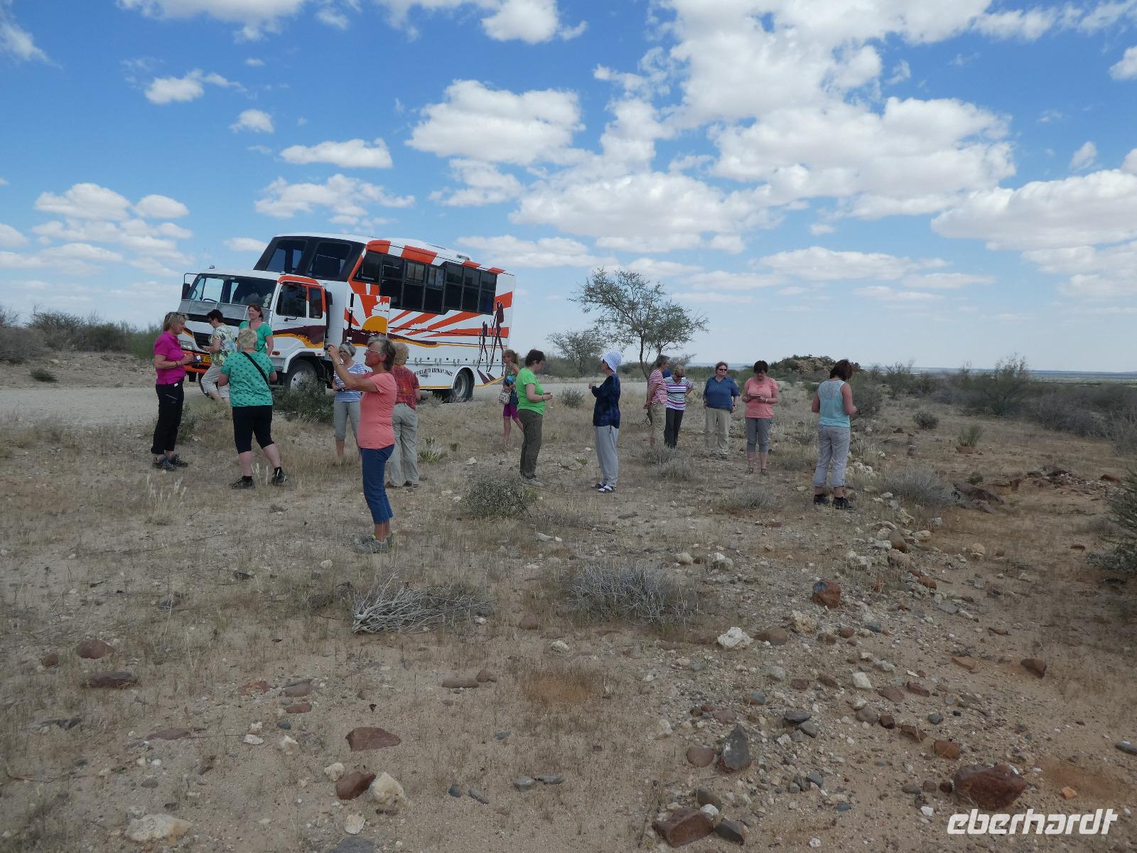 Ganz früh gab es einen Kaffee und dann fuhren wir zum Sonnenaufgang mit Guido über das Gelände der Farm. Sie misst 12000 ha und so sahen wir nur einen Teil und hielten Ausschau nach Tieren. Wir sahen eine Herde von Streifengnus, die Nester der Kapspatzen und einen Schabrackenschakal mit Beute im Maul. Guido berichtete über die schwierige Arbeit der Farmer, denn schon das 5. Jahr ist es viel zu trocken und die Wildtiere verenden. Zurück in der Lodge nahmen wir das Frühstück ein und fuhren dann zurück nach Maltahöhe. Unser Bus wurde betankt und wir nutzten die WCs. Dann fuhren wir weiter zu den Tsarisbergen. Unterwegs zeigte uns Barbara interessante Napfverwitterungen im schwarzen Kalk. Auch die für Schafe giftige Galgeria, die Buschmannskerze und die Hakendornakazie sahen wir. Nach dem Tsarispass konnten wir aussteigen und ins Tal hinunter laufen. Auf der Strasse lag eine tote Schlange und so konnten wir sie gut fotografieren. Unter einem grossen Baum gab es dann unser zweites Picknick und danach fuhren wir noch ein kurzes Stück bis zur Hammerstein Lodge. Am Nachmittag nahmen viele Singles an einer Katzentour teil. Sie führte zu Gehegen mit Leoparden und Karakalen. Wir erfuhren von den Schiksalen der Tiere, fotografierten fleissig und gingen zur Lodge zurück, denn die meisten hatten noch eine Tierbeobachtung im offenen Jeep gebucht. Die Jeeps verliessen das Gelände der Lodge und fuhren zu den Tieren, die in grossen Gehegen lebten. Wir sahen Springböcke, Zebras, eine junge Giraffe, die grösste Antilopenart, Nashörner und einiges mehr an Tieren. Zum Sonnenuntergang gab es einen Drink und dann fuhren wir zur Lodge zurück und freuten uns auf das Abendessen.