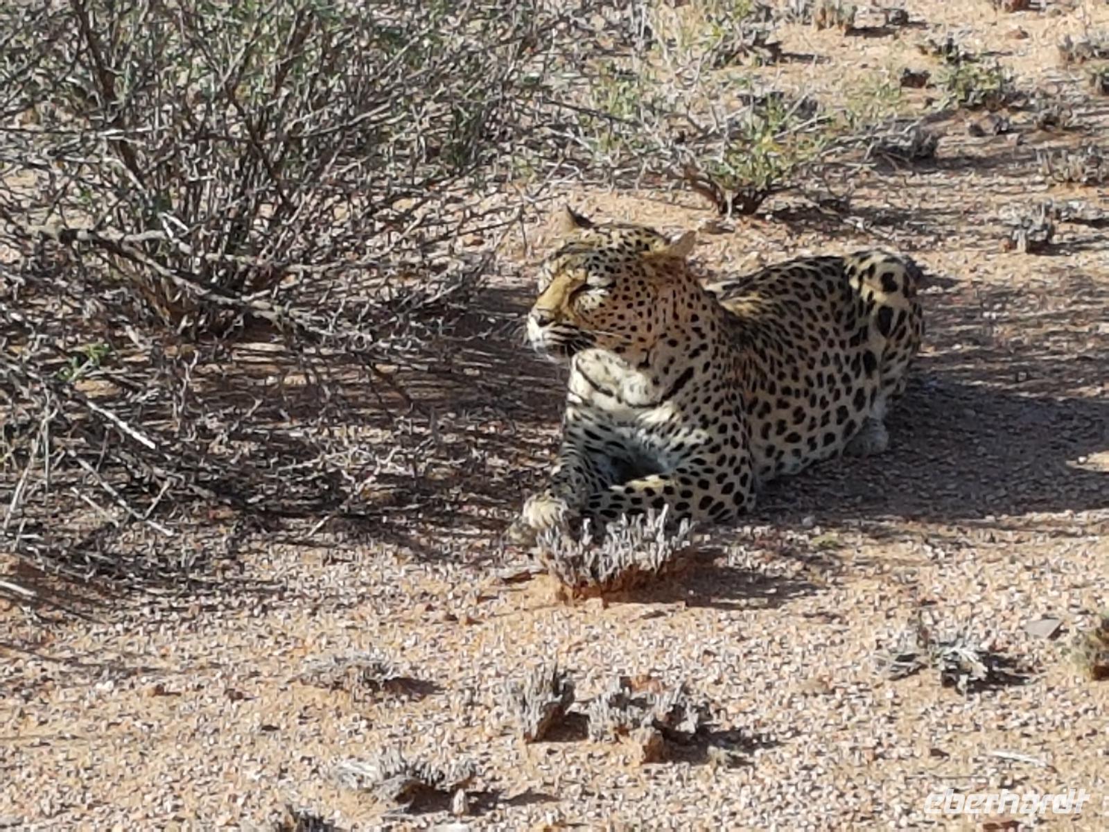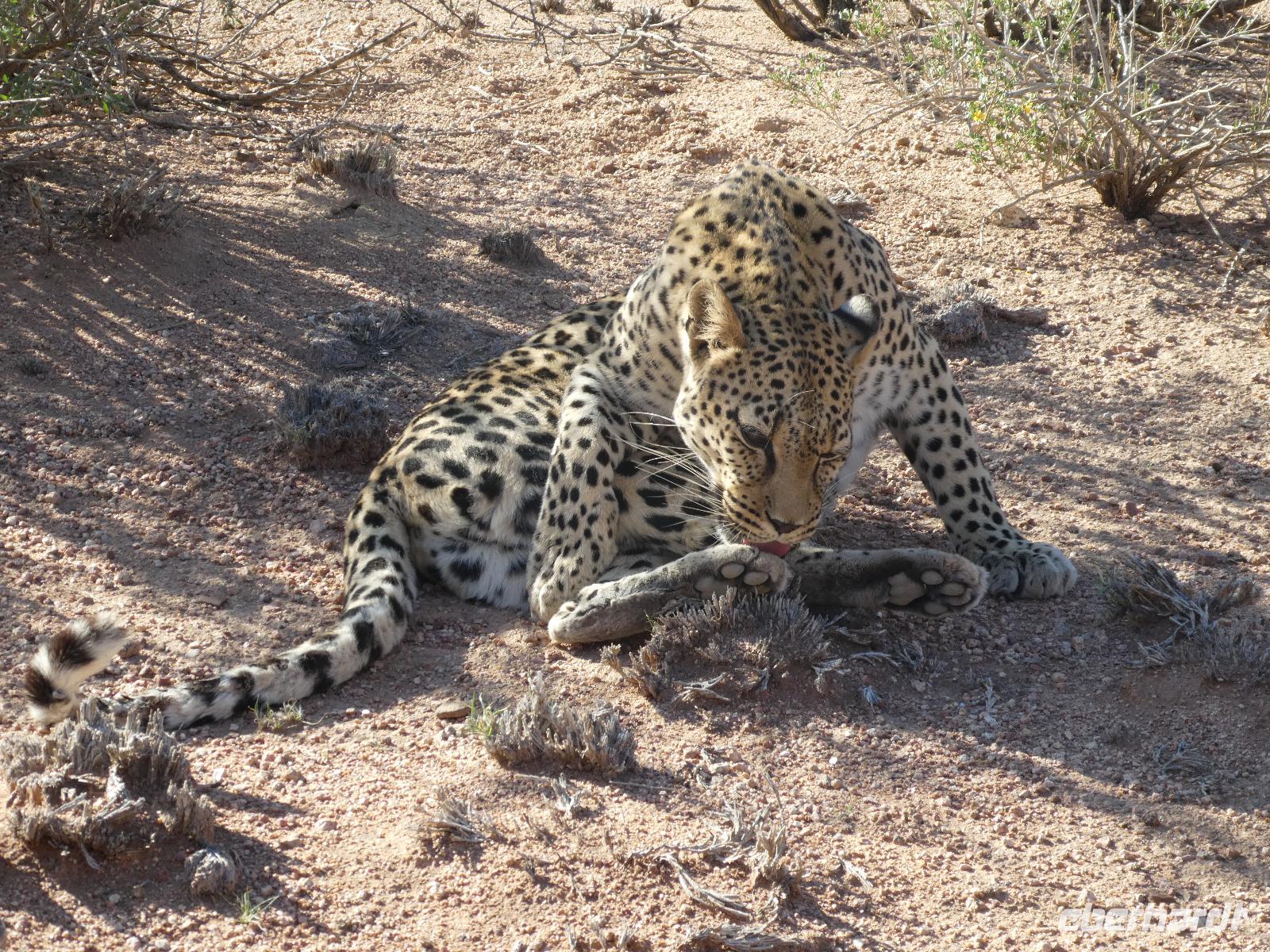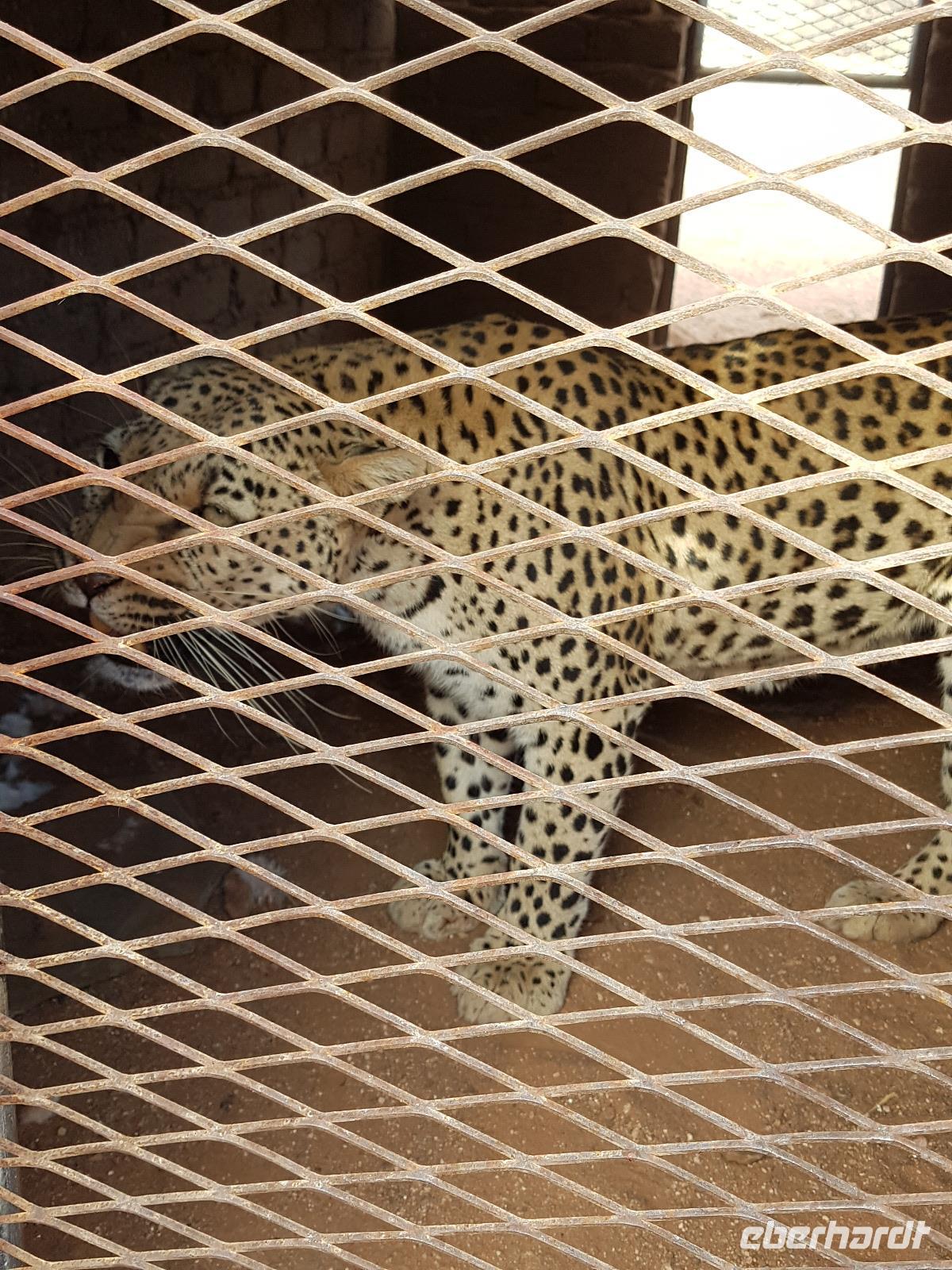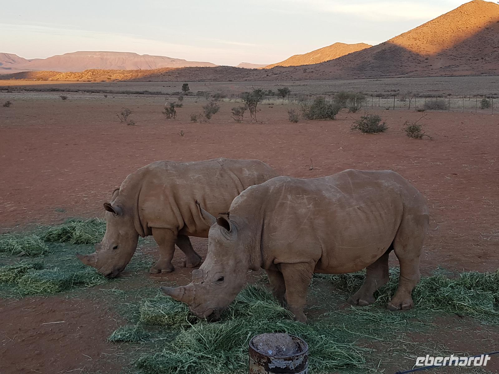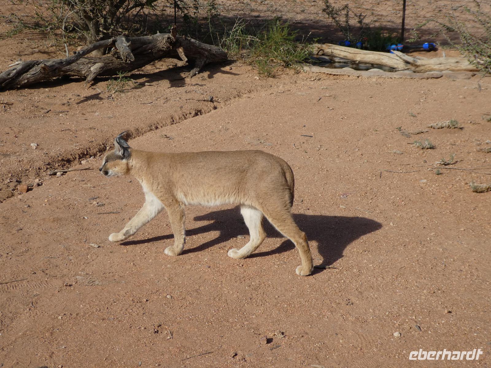 Ganz früh gab es einen Kaffee und dann fuhren wir zum Sonnenaufgang mit Guido über das Gelände der Farm. Sie misst 12000 ha und so sahen wir nur einen Teil und hielten Ausschau nach Tieren. Wir sahen eine Herde von Streifengnus, die Nester der Kapspatzen und einen Schabrackenschakal mit Beute im Maul. Guido berichtete über die schwierige Arbeit der Farmer, denn schon das 5. Jahr ist es viel zu trocken und die Wildtiere verenden. Zurück in der Lodge nahmen wir das Frühstück ein und fuhren dann zurück nach Maltahöhe. Unser Bus wurde betankt und wir nutzten die WCs. Dann fuhren wir weiter zu den Tsarisbergen. Unterwegs zeigte uns Barbara interessante Napfverwitterungen im schwarzen Kalk. Auch die für Schafe giftige Galgeria, die Buschmannskerze und die Hakendornakazie sahen wir. Nach dem Tsarispass konnten wir aussteigen und ins Tal hinunter laufen. Auf der Strasse lag eine tote Schlange und so konnten wir sie gut fotografieren. Unter einem grossen Baum gab es dann unser zweites Picknick und danach fuhren wir noch ein kurzes Stück bis zur Hammerstein Lodge. Am Nachmittag nahmen viele Singles an einer Katzentour teil. Sie führte zu Gehegen mit Leoparden und Karakalen. Wir erfuhren von den Schiksalen der Tiere, fotografierten fleissig und gingen zur Lodge zurück, denn die meisten hatten noch eine Tierbeobachtung im offenen Jeep gebucht. Die Jeeps verliessen das Gelände der Lodge und fuhren zu den Tieren, die in grossen Gehegen lebten. Wir sahen Springböcke, Zebras, eine junge Giraffe, die grösste Antilopenart, Nashörner und einiges mehr an Tieren. Zum Sonnenuntergang gab es einen Drink und dann fuhren wir zur Lodge zurück und freuten uns auf das Abendessen.