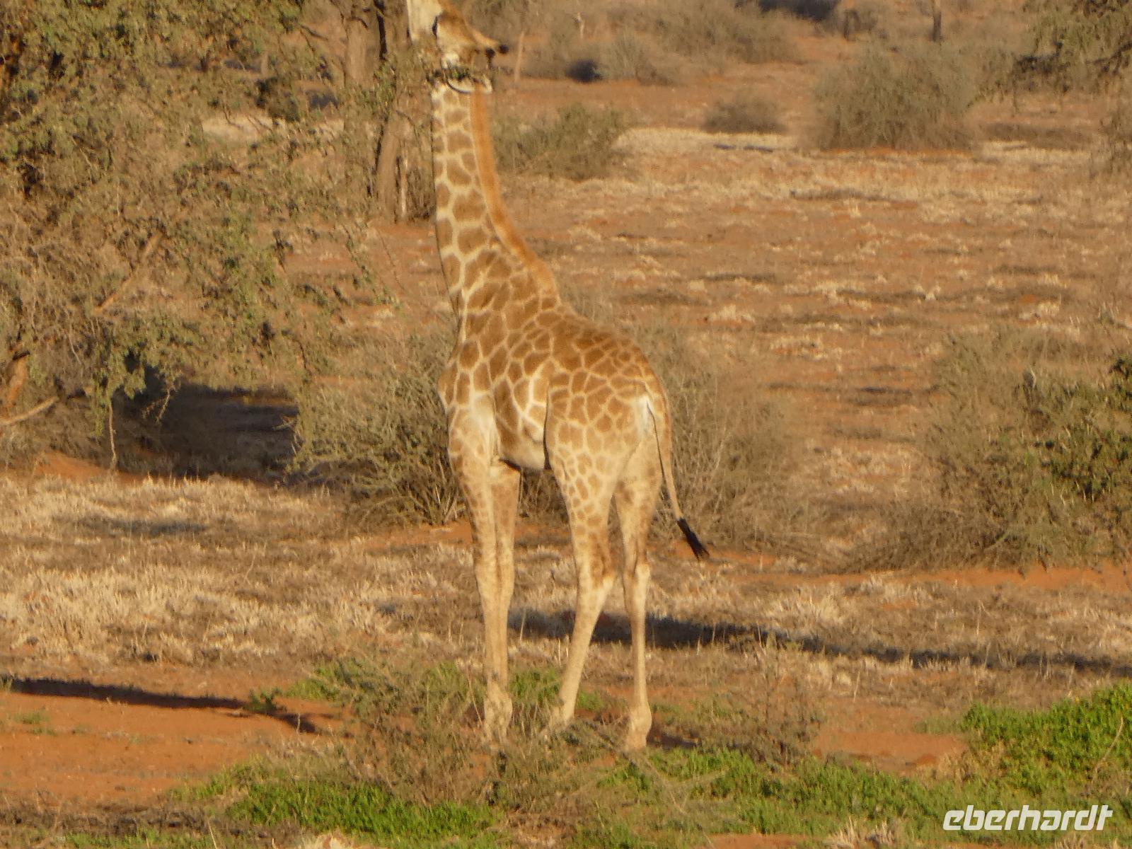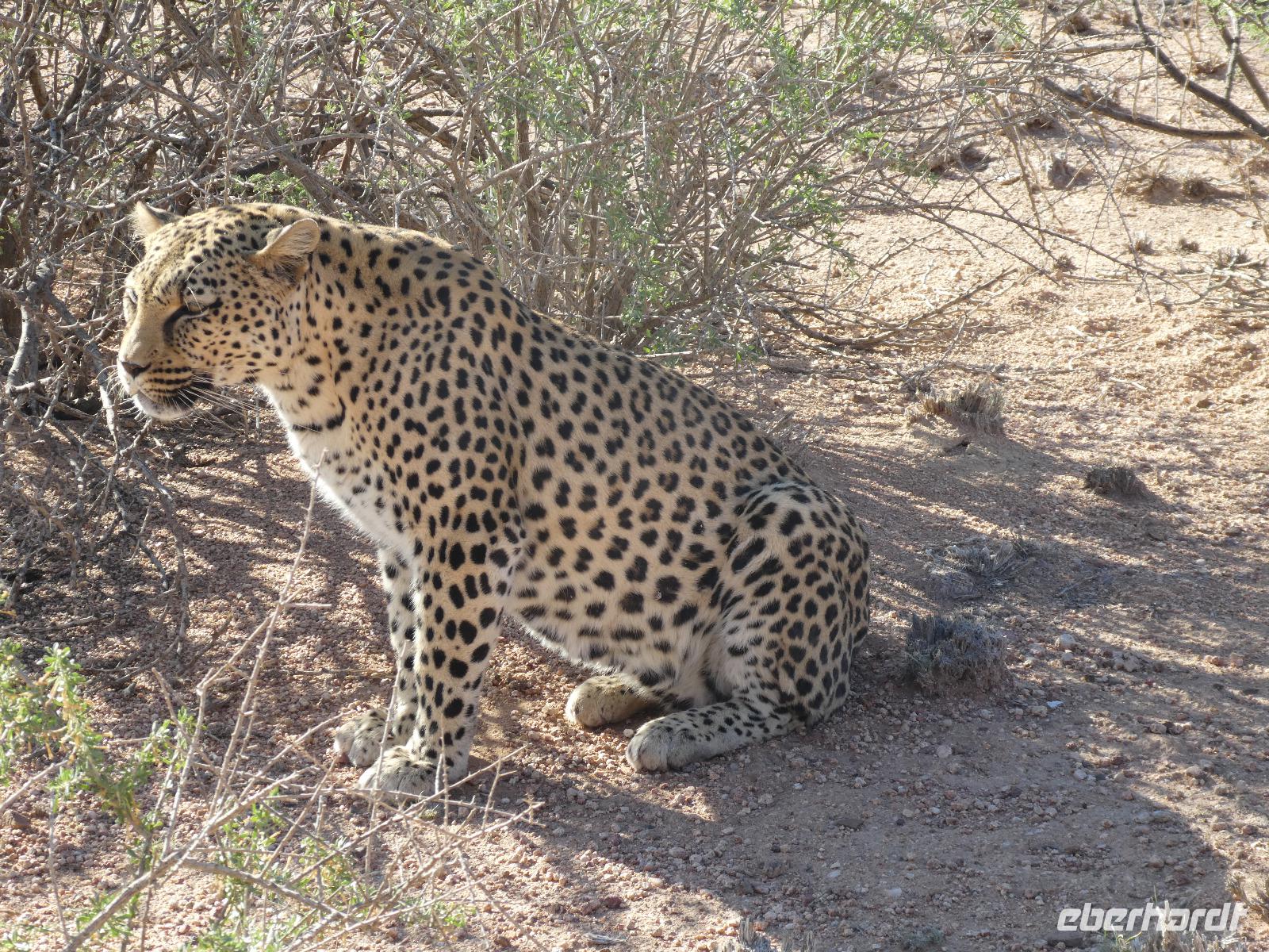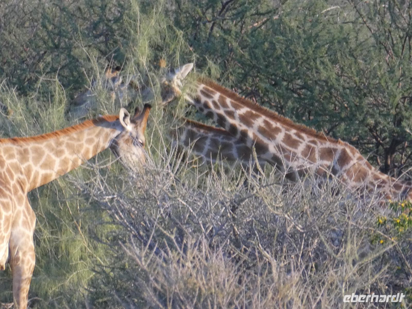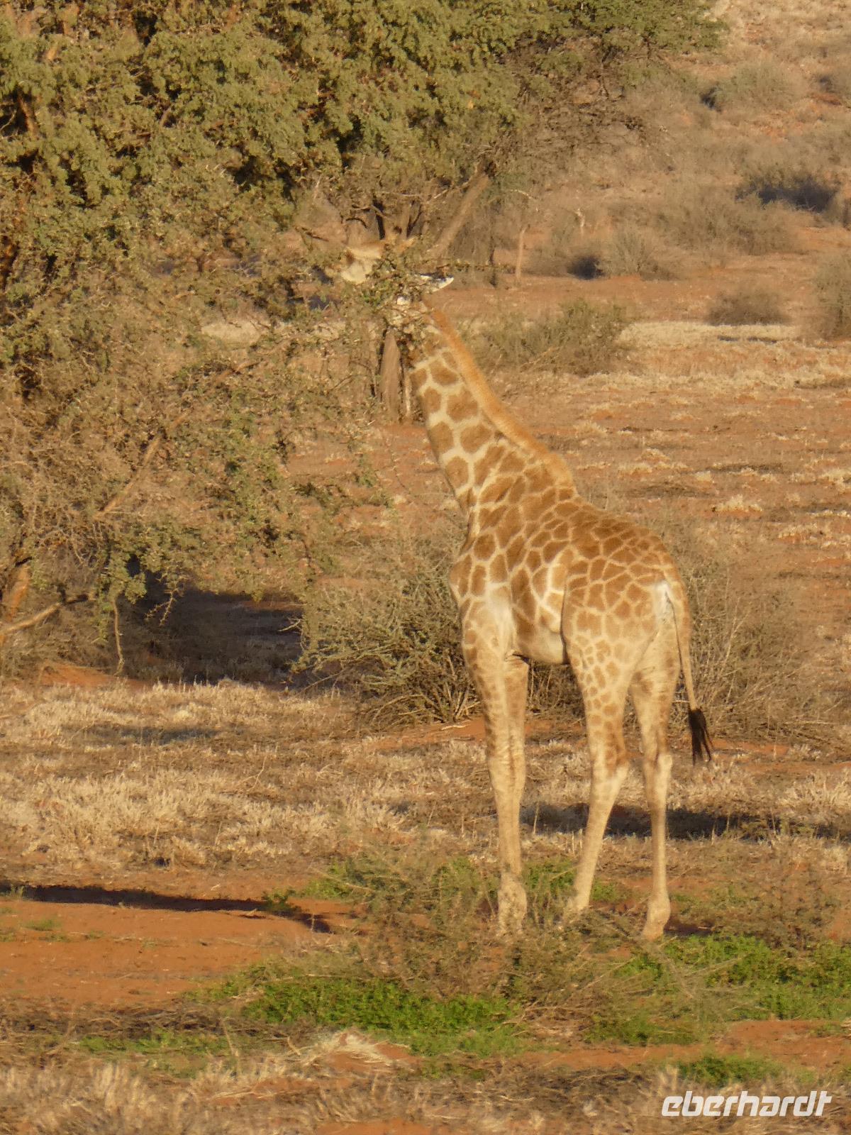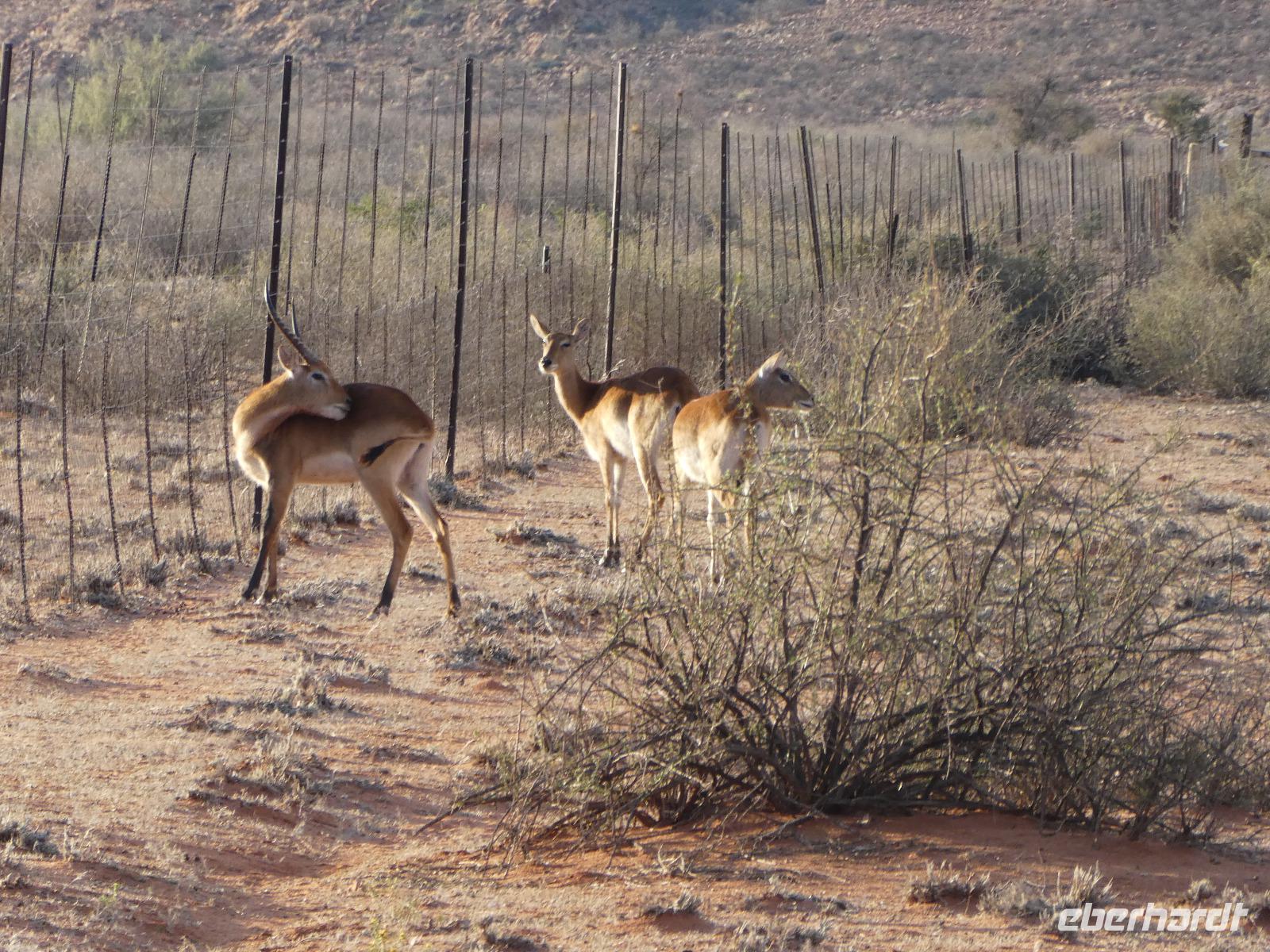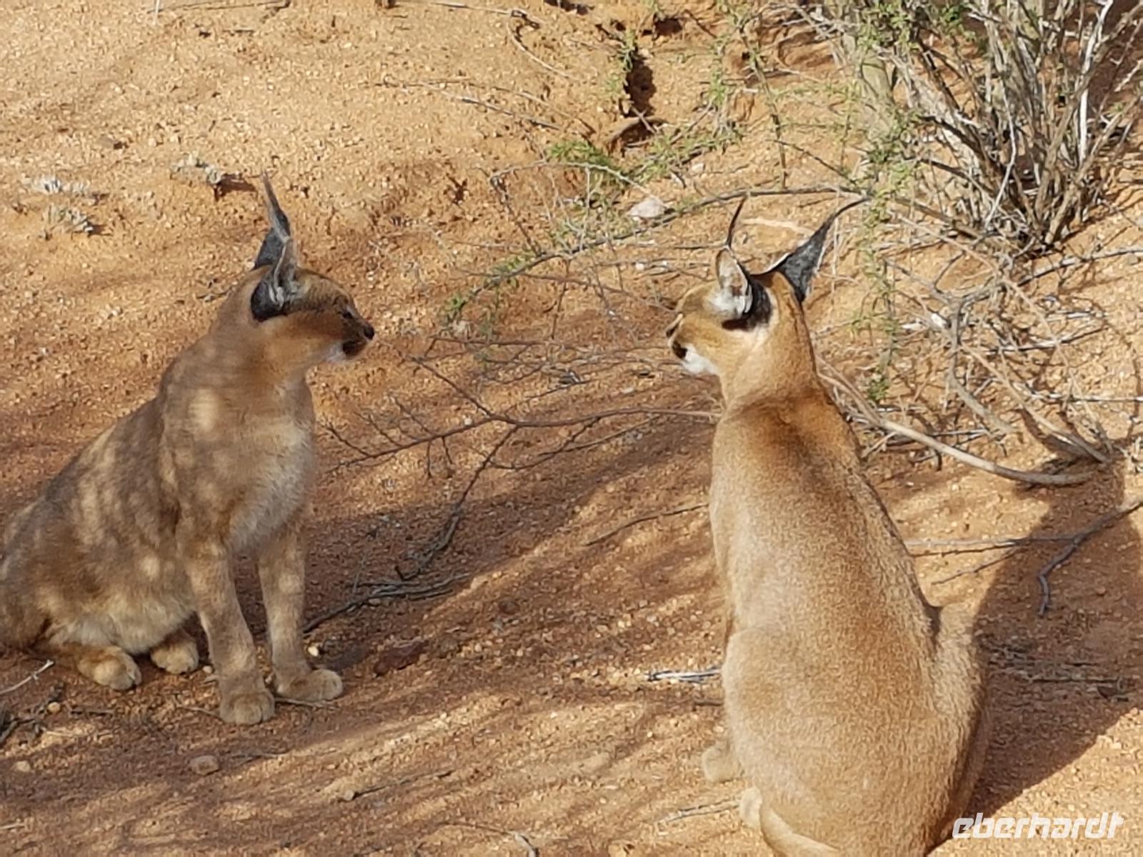Ganz früh gab es einen Kaffee und dann fuhren wir zum Sonnenaufgang mit Guido über das Gelände der Farm. Sie misst 12000 ha und so sahen wir nur einen Teil und hielten Ausschau nach Tieren. Wir sahen eine Herde von Streifengnus, die Nester der Kapspatzen und einen Schabrackenschakal mit Beute im Maul. Guido berichtete über die schwierige Arbeit der Farmer, denn schon das 5. Jahr ist es viel zu trocken und die Wildtiere verenden. Zurück in der Lodge nahmen wir das Frühstück ein und fuhren dann zurück nach Maltahöhe. Unser Bus wurde betankt und wir nutzten die WCs. Dann fuhren wir weiter zu den Tsarisbergen. Unterwegs zeigte uns Barbara interessante Napfverwitterungen im schwarzen Kalk. Auch die für Schafe giftige Galgeria, die Buschmannskerze und die Hakendornakazie sahen wir. Nach dem Tsarispass konnten wir aussteigen und ins Tal hinunter laufen. Auf der Strasse lag eine tote Schlange und so konnten wir sie gut fotografieren. Unter einem grossen Baum gab es dann unser zweites Picknick und danach fuhren wir noch ein kurzes Stück bis zur Hammerstein Lodge. Am Nachmittag nahmen viele Singles an einer Katzentour teil. Sie führte zu Gehegen mit Leoparden und Karakalen. Wir erfuhren von den Schiksalen der Tiere, fotografierten fleissig und gingen zur Lodge zurück, denn die meisten hatten noch eine Tierbeobachtung im offenen Jeep gebucht. Die Jeeps verliessen das Gelände der Lodge und fuhren zu den Tieren, die in grossen Gehegen lebten. Wir sahen Springböcke, Zebras, eine junge Giraffe, die grösste Antilopenart, Nashörner und einiges mehr an Tieren. Zum Sonnenuntergang gab es einen Drink und dann fuhren wir zur Lodge zurück und freuten uns auf das Abendessen.