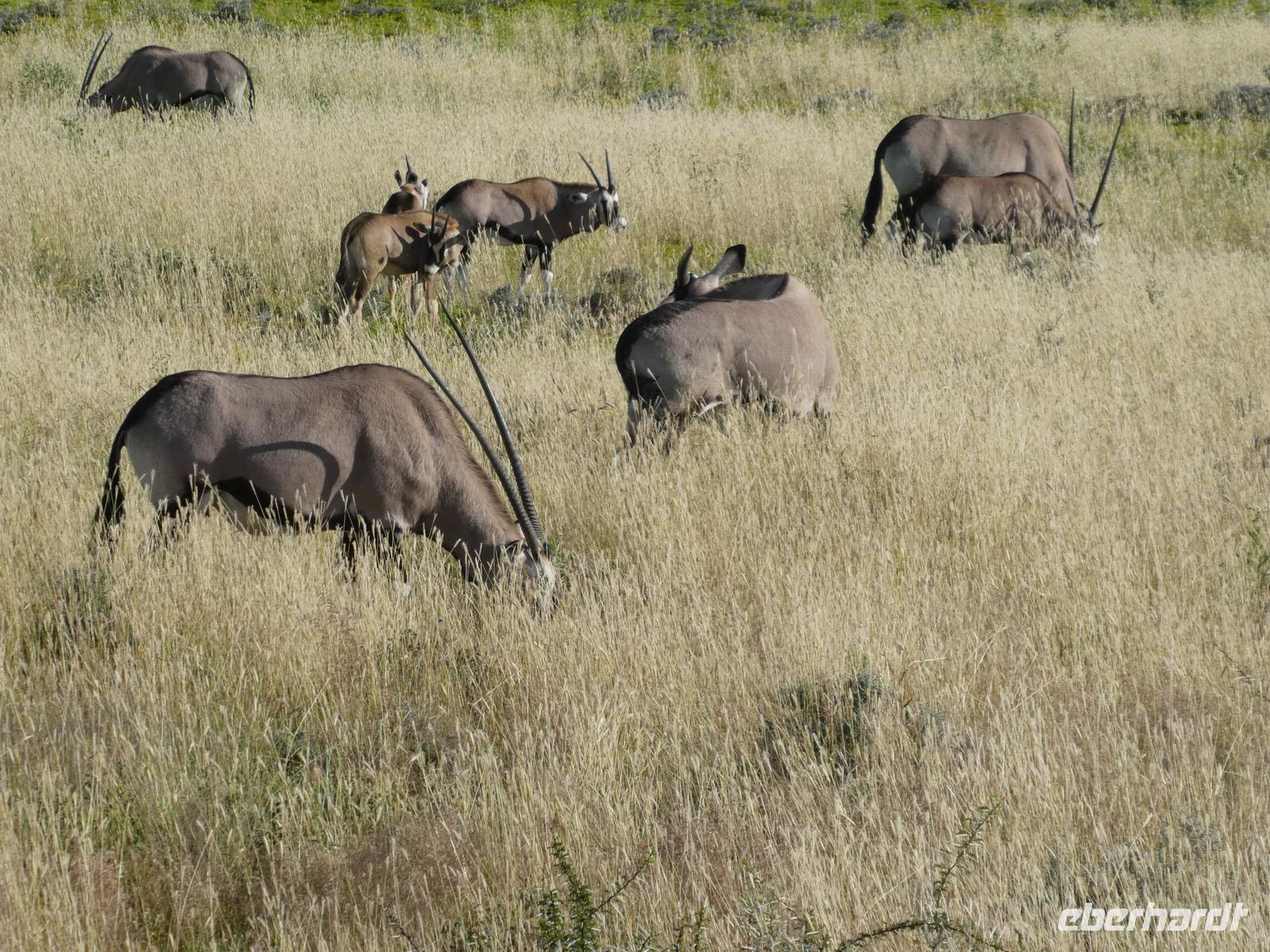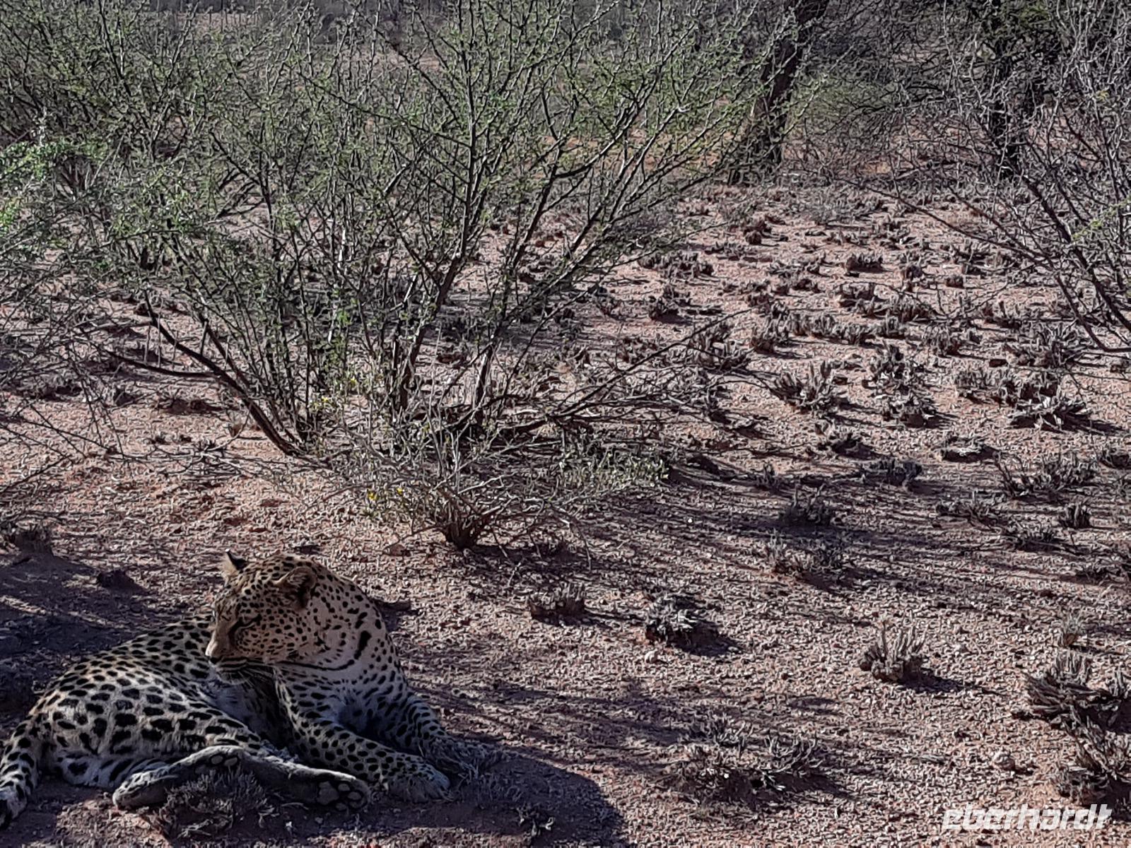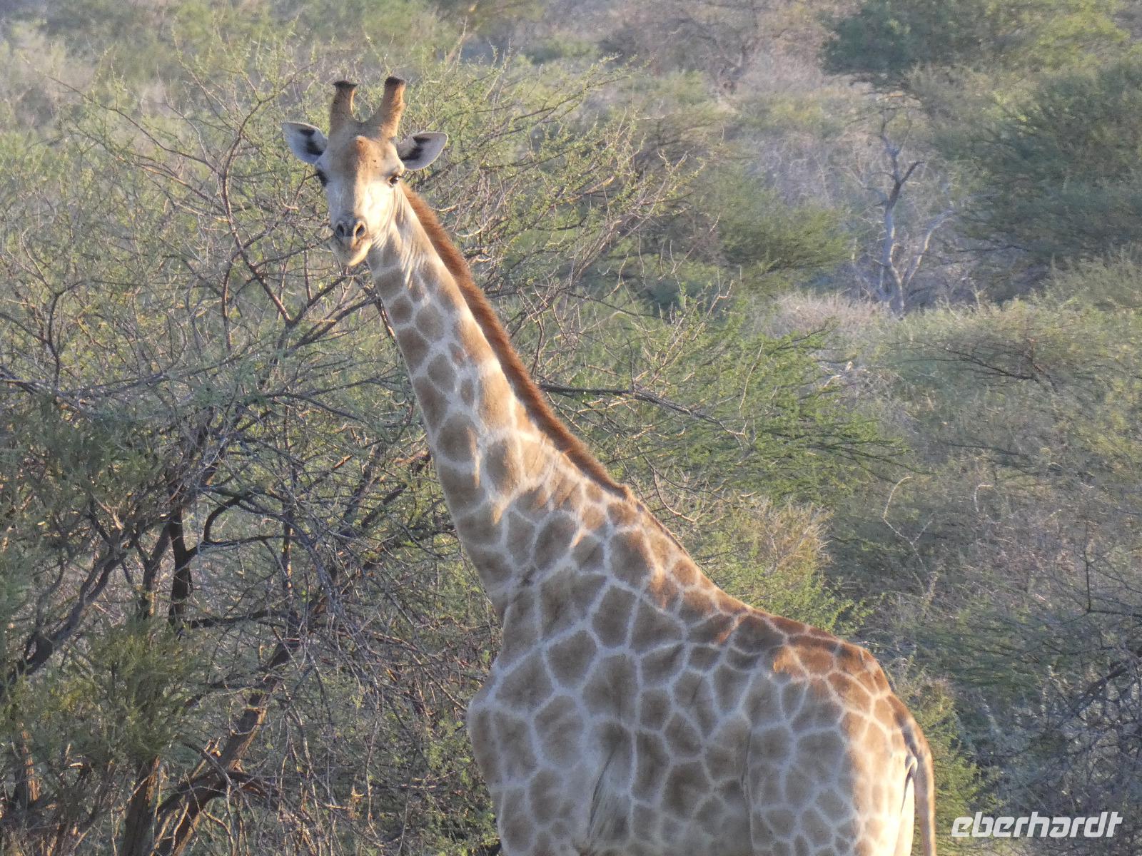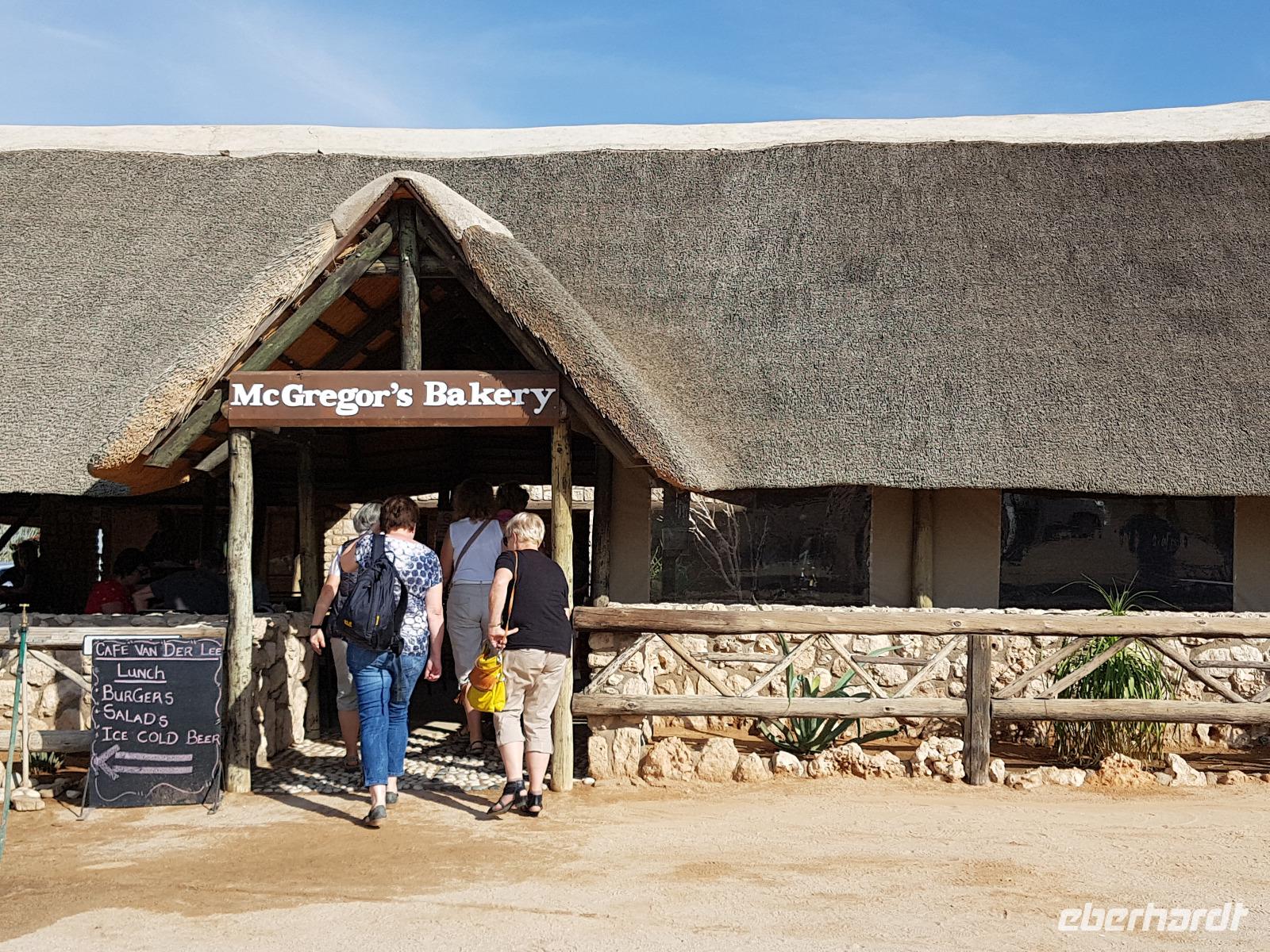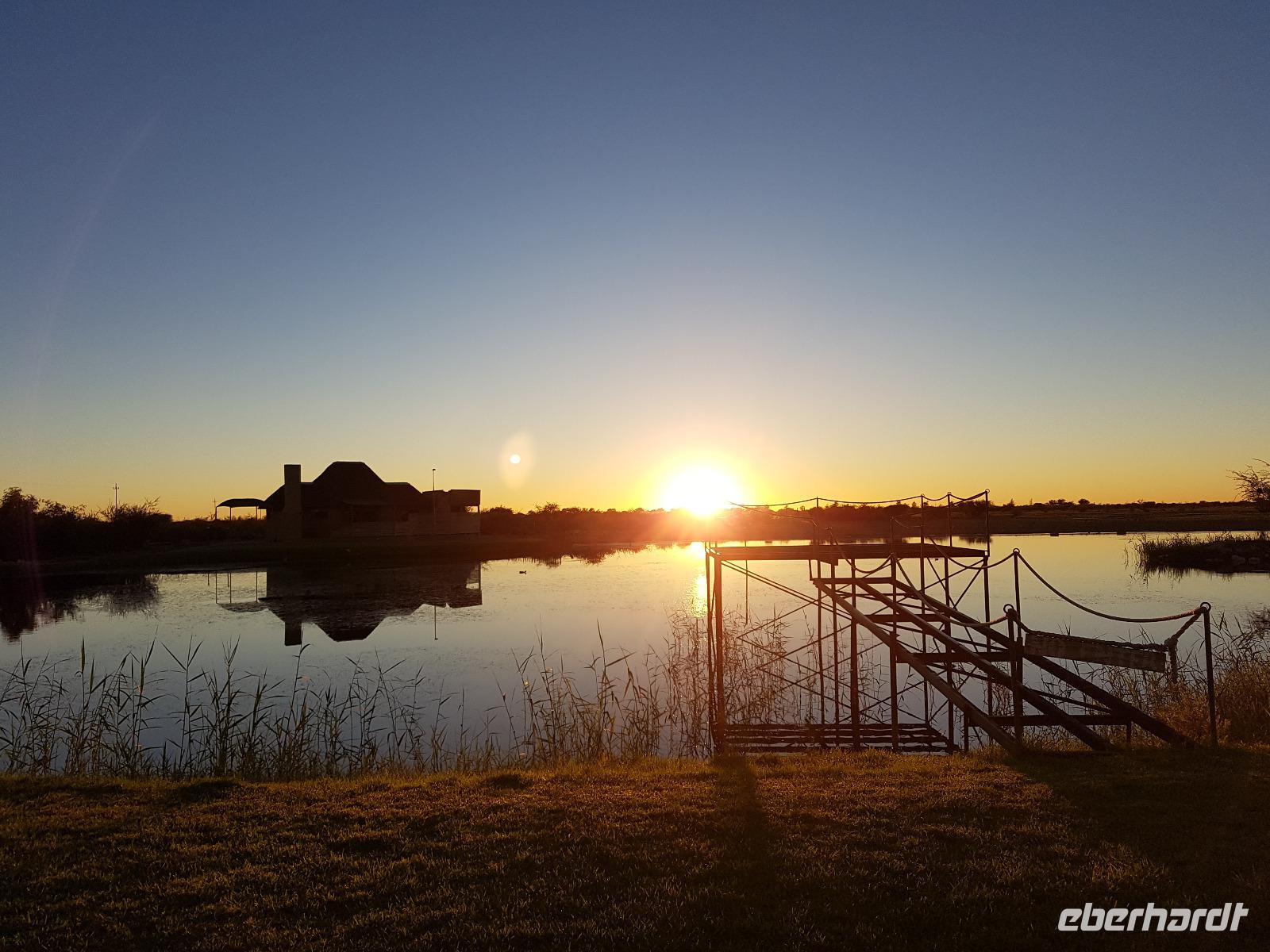 Ganz früh gab es einen Kaffee und dann fuhren wir zum Sonnenaufgang mit Guido über das Gelände der Farm. Sie misst 12000 ha und so sahen wir nur einen Teil und hielten Ausschau nach Tieren. Wir sahen eine Herde von Streifengnus, die Nester der Kapspatzen und einen Schabrackenschakal mit Beute im Maul. Guido berichtete über die schwierige Arbeit der Farmer, denn schon das 5. Jahr ist es viel zu trocken und die Wildtiere verenden. Zurück in der Lodge nahmen wir das Frühstück ein und fuhren dann zurück nach Maltahöhe. Unser Bus wurde betankt und wir nutzten die WCs. Dann fuhren wir weiter zu den Tsarisbergen. Unterwegs zeigte uns Barbara interessante Napfverwitterungen im schwarzen Kalk. Auch die für Schafe giftige Galgeria, die Buschmannskerze und die Hakendornakazie sahen wir. Nach dem Tsarispass konnten wir aussteigen und ins Tal hinunter laufen. Auf der Strasse lag eine tote Schlange und so konnten wir sie gut fotografieren. Unter einem grossen Baum gab es dann unser zweites Picknick und danach fuhren wir noch ein kurzes Stück bis zur Hammerstein Lodge. Am Nachmittag nahmen viele Singles an einer Katzentour teil. Sie führte zu Gehegen mit Leoparden und Karakalen. Wir erfuhren von den Schiksalen der Tiere, fotografierten fleissig und gingen zur Lodge zurück, denn die meisten hatten noch eine Tierbeobachtung im offenen Jeep gebucht. Die Jeeps verliessen das Gelände der Lodge und fuhren zu den Tieren, die in grossen Gehegen lebten. Wir sahen Springböcke, Zebras, eine junge Giraffe, die grösste Antilopenart, Nashörner und einiges mehr an Tieren. Zum Sonnenuntergang gab es einen Drink und dann fuhren wir zur Lodge zurück und freuten uns auf das Abendessen.