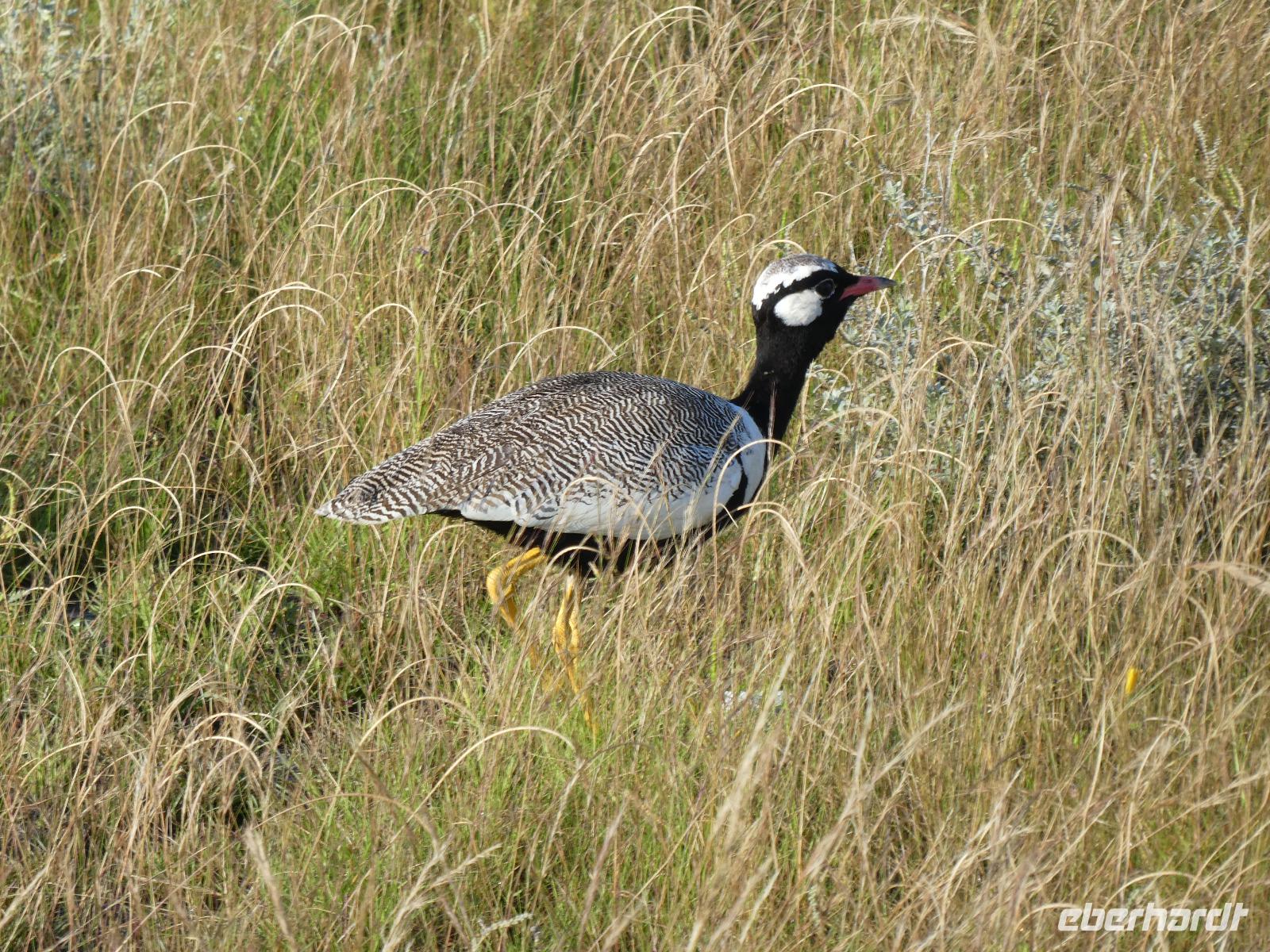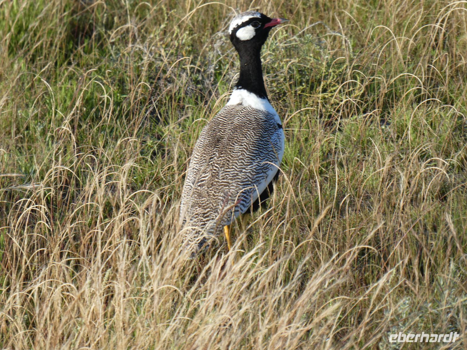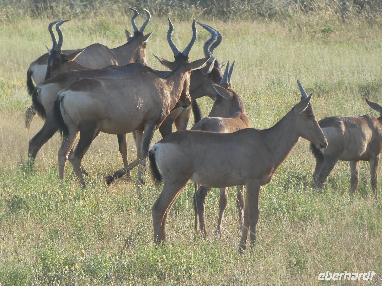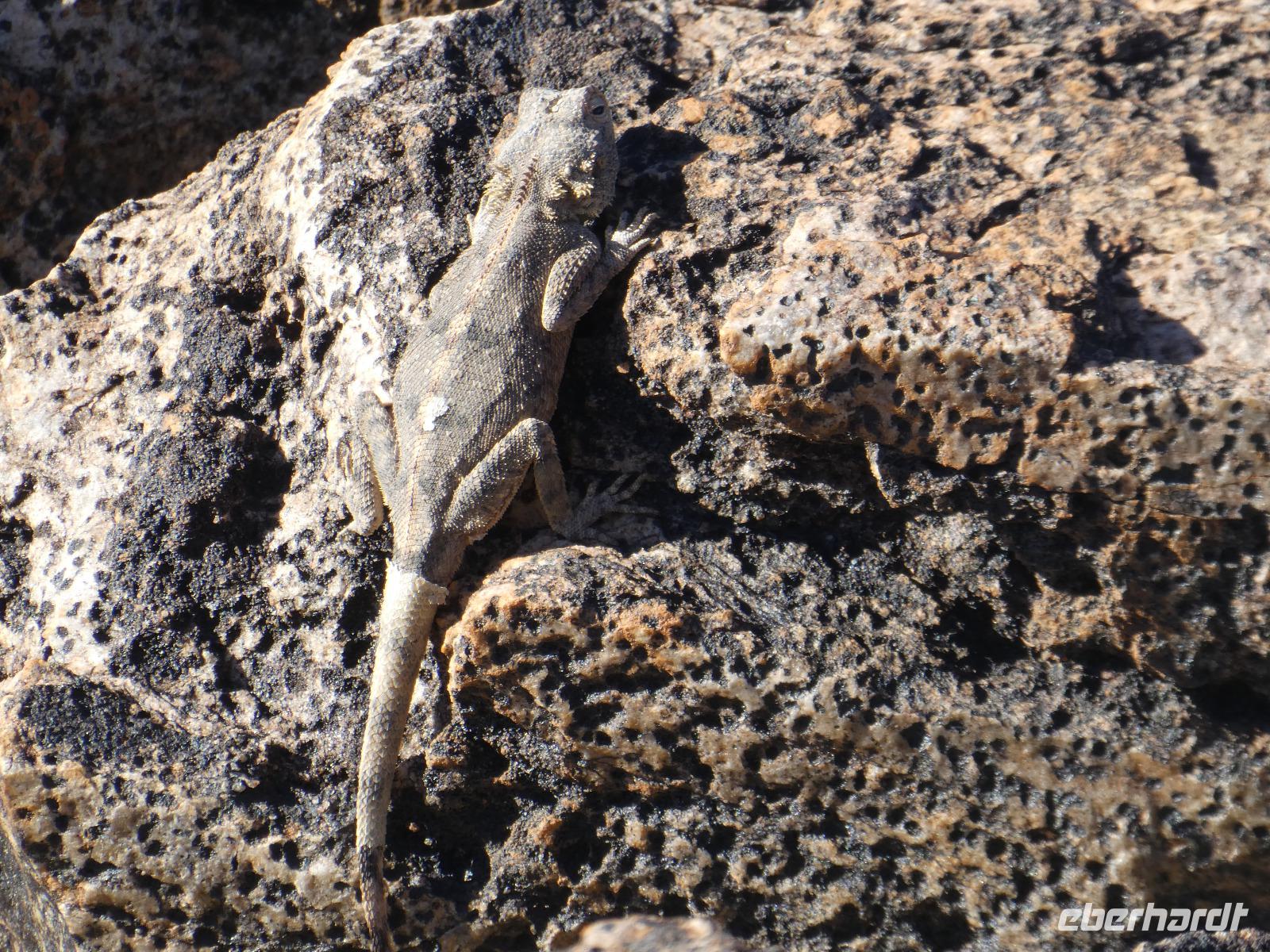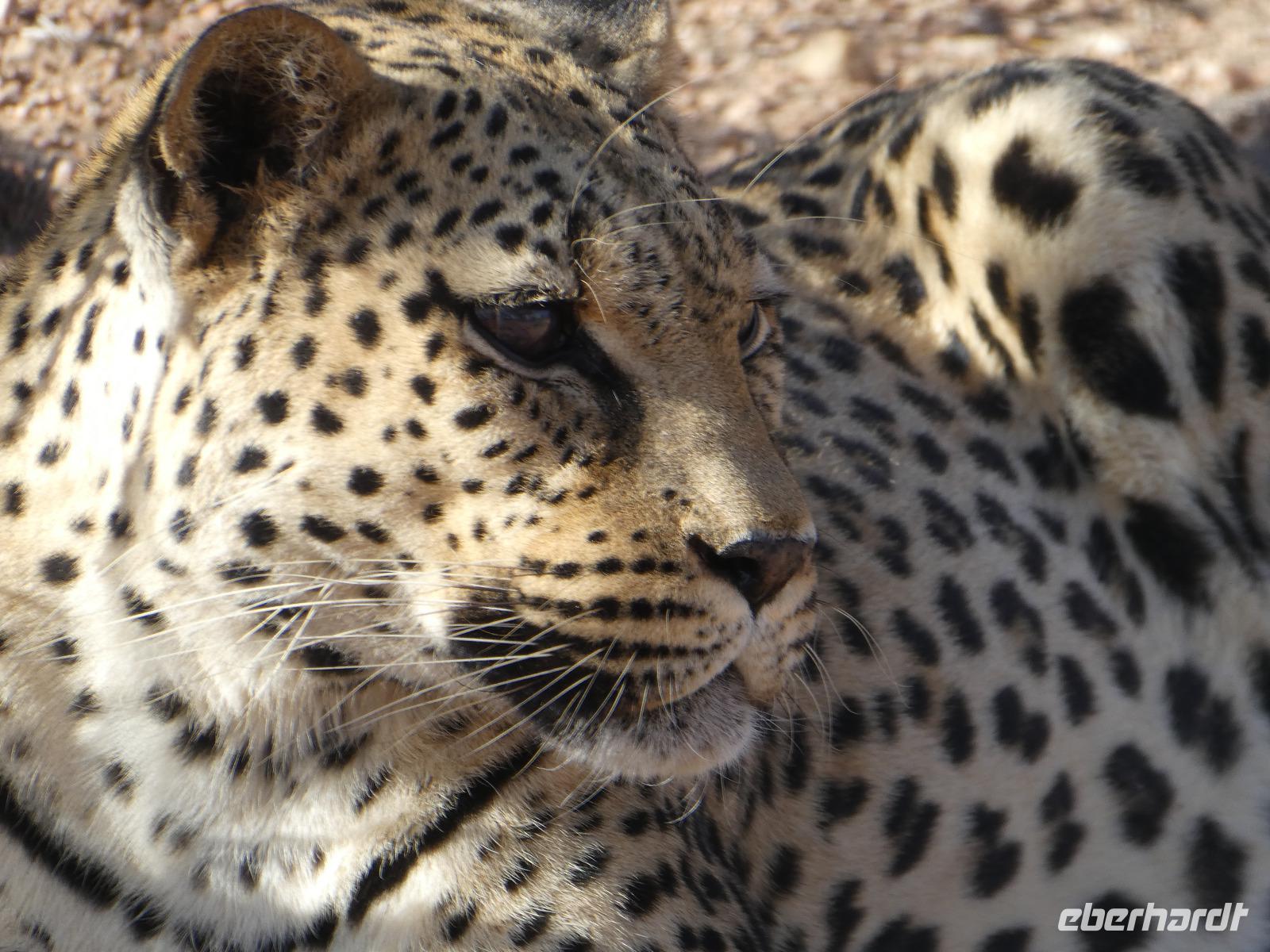 Ganz früh gab es einen Kaffee und dann fuhren wir zum Sonnenaufgang mit Guido über das Gelände der Farm. Sie misst 12000 ha und so sahen wir nur einen Teil und hielten Ausschau nach Tieren. Wir sahen eine Herde von Streifengnus, die Nester der Kapspatzen und einen Schabrackenschakal mit Beute im Maul. Guido berichtete über die schwierige Arbeit der Farmer, denn schon das 5. Jahr ist es viel zu trocken und die Wildtiere verenden. Zurück in der Lodge nahmen wir das Frühstück ein und fuhren dann zurück nach Maltahöhe. Unser Bus wurde betankt und wir nutzten die WCs. Dann fuhren wir weiter zu den Tsarisbergen. Unterwegs zeigte uns Barbara interessante Napfverwitterungen im schwarzen Kalk. Auch die für Schafe giftige Galgeria, die Buschmannskerze und die Hakendornakazie sahen wir. Nach dem Tsarispass konnten wir aussteigen und ins Tal hinunter laufen. Auf der Strasse lag eine tote Schlange und so konnten wir sie gut fotografieren. Unter einem grossen Baum gab es dann unser zweites Picknick und danach fuhren wir noch ein kurzes Stück bis zur Hammerstein Lodge. Am Nachmittag nahmen viele Singles an einer Katzentour teil. Sie führte zu Gehegen mit Leoparden und Karakalen. Wir erfuhren von den Schiksalen der Tiere, fotografierten fleissig und gingen zur Lodge zurück, denn die meisten hatten noch eine Tierbeobachtung im offenen Jeep gebucht. Die Jeeps verliessen das Gelände der Lodge und fuhren zu den Tieren, die in grossen Gehegen lebten. Wir sahen Springböcke, Zebras, eine junge Giraffe, die grösste Antilopenart, Nashörner und einiges mehr an Tieren. Zum Sonnenuntergang gab es einen Drink und dann fuhren wir zur Lodge zurück und freuten uns auf das Abendessen.
