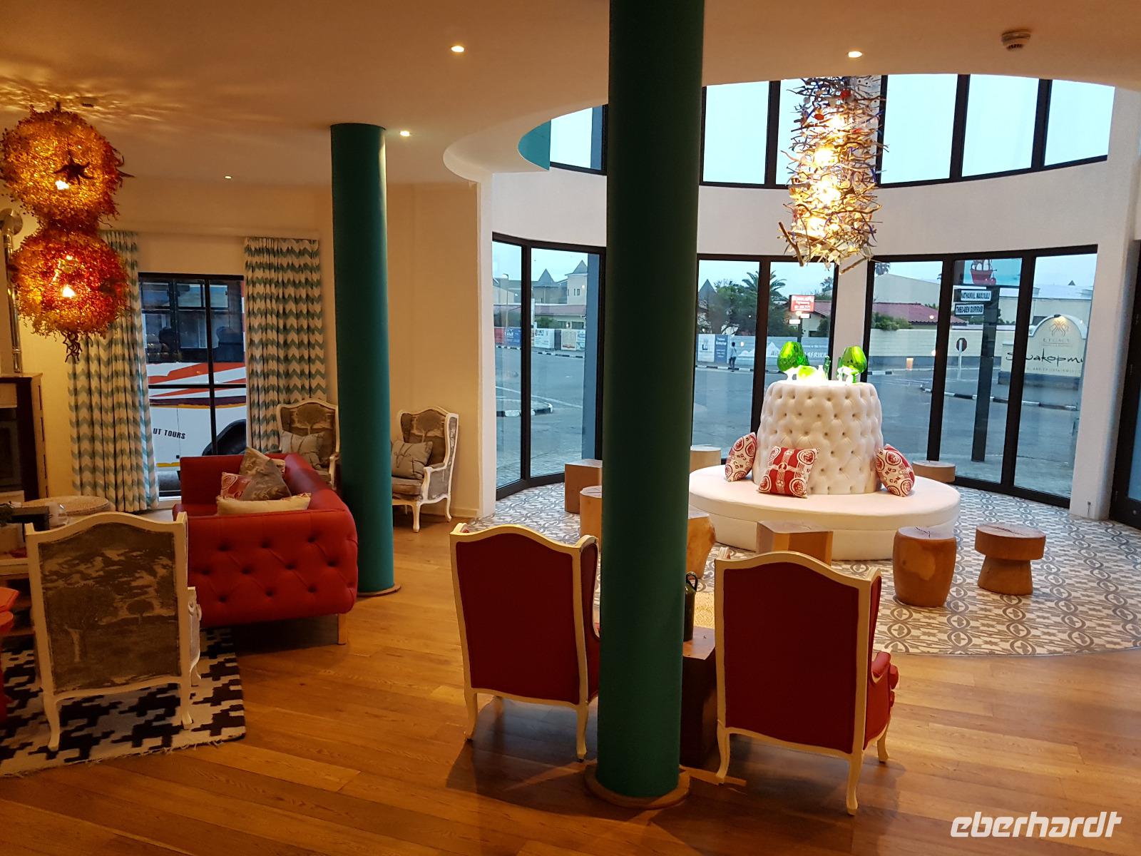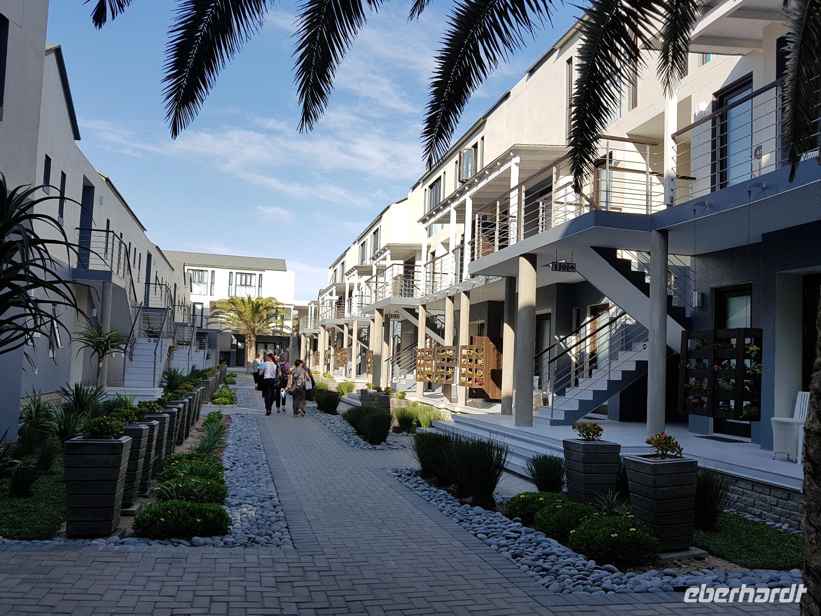 Nach dem Frühstück verliessen wir die Hammerstein Lodge und fuhren gen Norden. Viele Antilopen waren ausserhalb der umzäunten Gehege zu sehen und 2 Springböcke rannten mit unserem Truck um die Wette. In Solitär machten wir einen Stopp bei einer Bäckerei und probierten Apfelkuchen und kauften leckeres Mittagessen in Assietten für unterwegs. Dann folgte eine sehr lange Fahrt auf Sandpisten mit viel Staub. Den nächsten Stopp legten wir beim Schild am südlichen Wendekreis des Steinbockes ein und machten ein Gruppen Foto. Barbara zeigte uns Marmoreinschlüsse im Felsen sowie eine Formation mit einer alten und einer jüngeren Düne. Auch über Berge in der Ferne wusste sie Interessantes zu berichten. Dann folgte ein Stopp über dem Kuiseb Canyon und Barbara erzählte uns die Geschichte von zwei deutschen Geologen, die sich hier im 2 Weltkrieg zweieinhalb Jahre versteckten und ums Überleben kämpften. Ihre wahre Geschichte wird in einem Buch erzählt. Noch weitere Stopps folgten mit einem Spaziergang auf einen Hügel sowie zu einer schönen Aussicht, wo Barbara Granatsteine fand. Dann erreichten wir endlich die Küste bei Wallfish Bay und machten Halt, um die frische Seeluft zu schnuppern und Flamigos zu sehen. An der Strasse nach Swakopmund reichten die Sanddünen wieder bis fast an den Strand und wir sahen viele Angler. Dann endlich war Swakopmund erreicht und an der Seebrücke machten wir nochmals Fotos. Dann zeigte uns Barbara das hübsche kleine Stadtzentrum und an unserem Hotel Delight endete die Rundfahrt. Zum Abendessen fuhren wir mit unserem Truck zum Dom, wo wir vorzüglich speisten. Zu unserer Überraschung weilte der namibische Präsident Hage Geingob auch dort und nahm an einem Empfang teil. Schicke Abendkleider waren da u. a. zu bewundern.