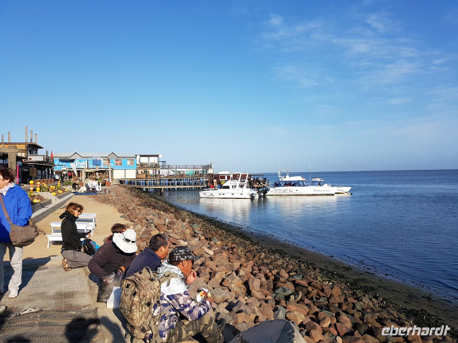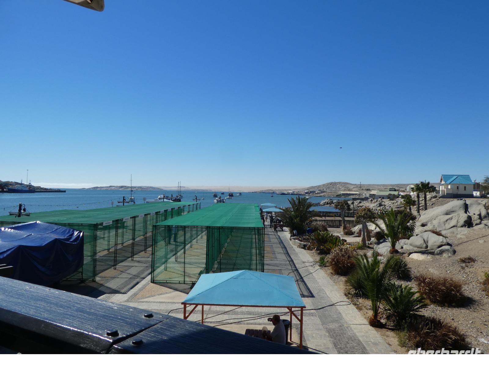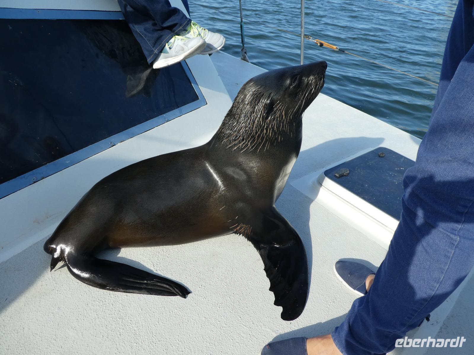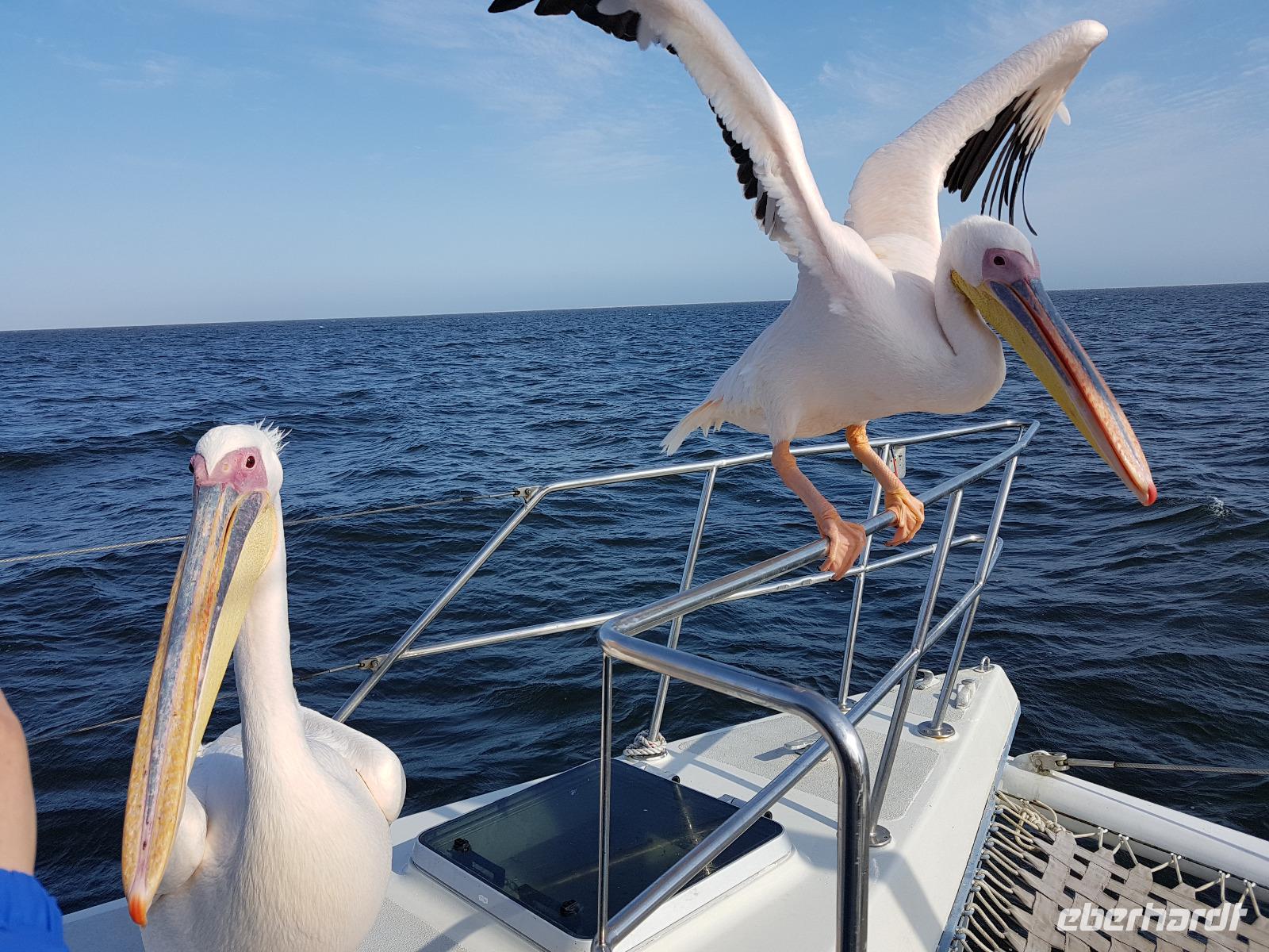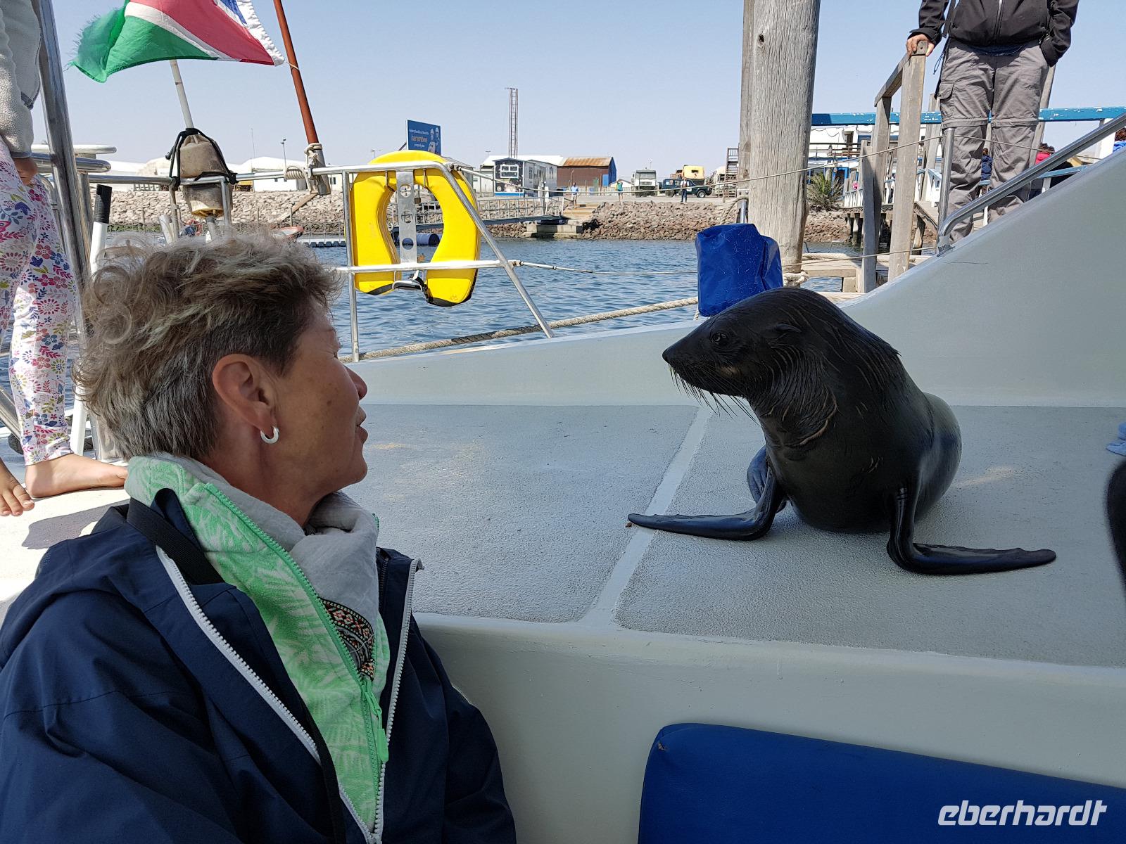 Mit unserem Truck fuhren wir nach Walvis Bay und warteten geduldig bis unser Katamaran endlich kam. Eine Robbe war schon an Bord und 2 weitere kamen gleich, um ihre Portion Fisch abzuholen. Eine 4 Monate alte Robbe war blind und eine andere sah nur auf einem Auge. Aber alle waren Menschen gewöhnt. Auch 2 Pelikane gehörten zur "Crew" und spazierten frech zwischen den Gästen herum. Der Kapitän berichtete, dass einer der Pelikane an dessen Pool mit verletztem Schnabel gelandet sei und gepflegt wurde. Wir fuhren weit hinaus bis zu einer Seehundebank, konnten sie aber wegen der starken Brandung nur aus der Ferne sehen. Auf dem Schiff bekamen wir wieder frische Austern, Sekt und andere Spezialitäten zur Mittagszeit. Dann fuhren wir mit unserem Truck zurück nach Swakopmund und hatten den Sonntag Nachmittag frei. Es gab verschiedene Museen zu erkunden und 4 Singles wagten sich in die Luft, um mit einem Kleinflugzeug die Küstenregion und die Wüste von oben zu sehen. Zum Abendessen fuhren wir an die Seebrücke Jetty und speisten mit vielen anderen Reisegruppen vorzüglich im "The Tug".