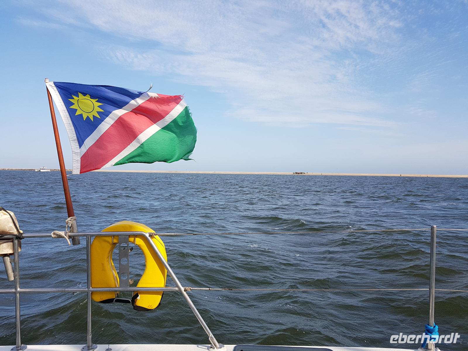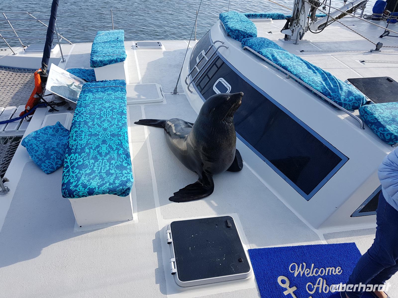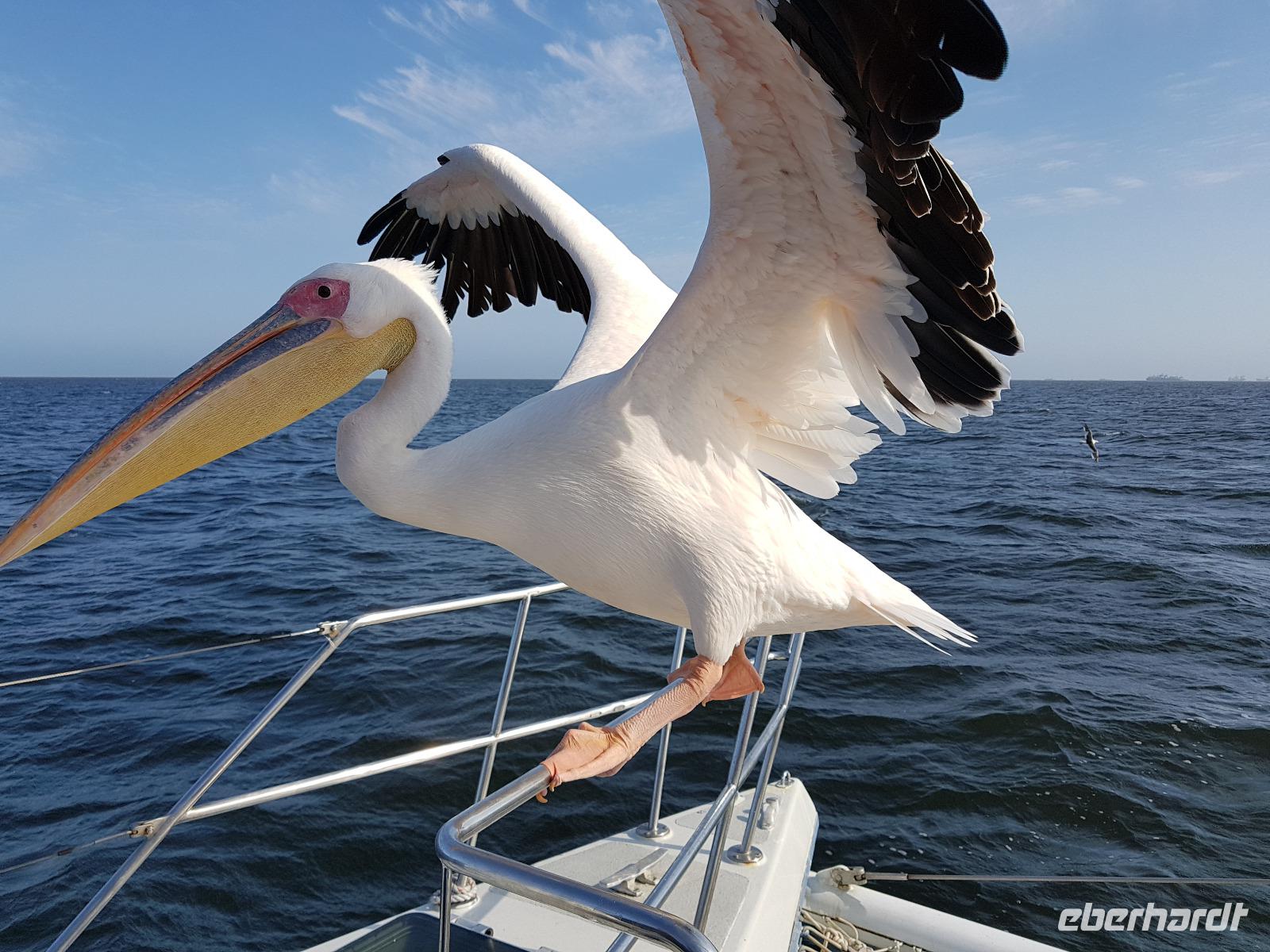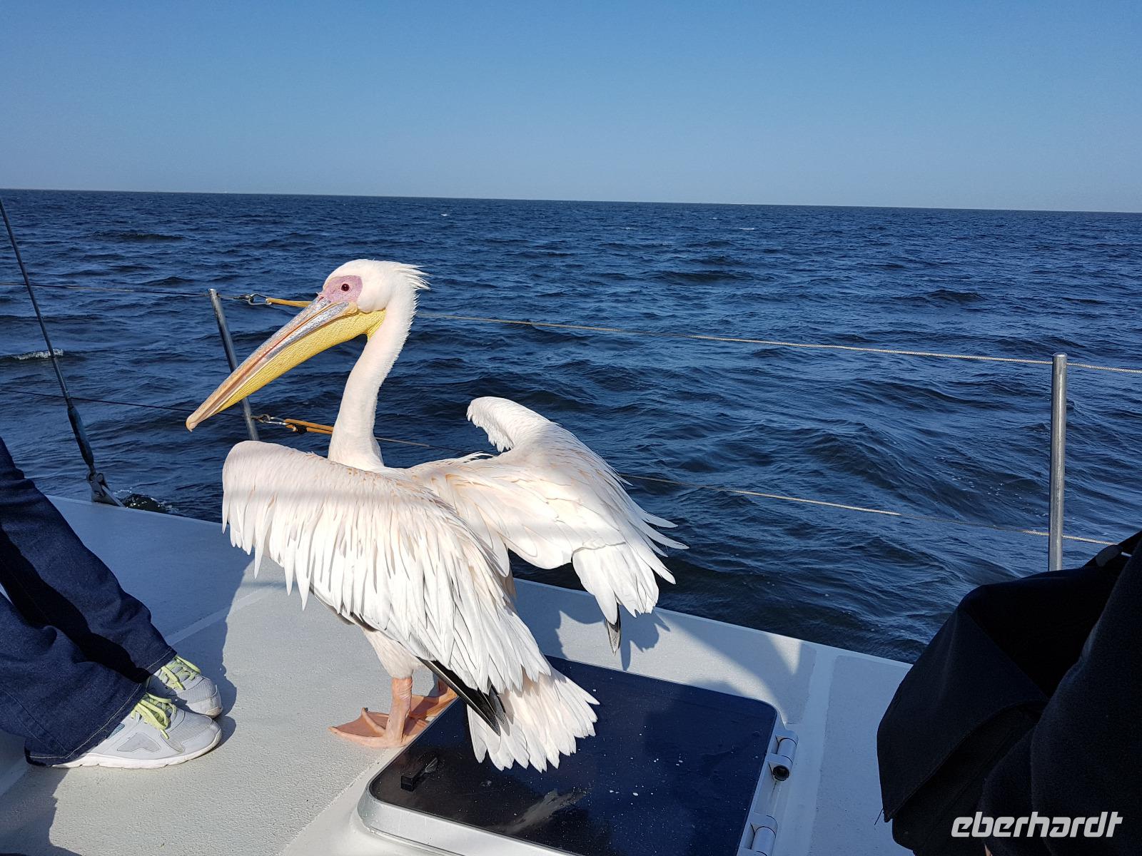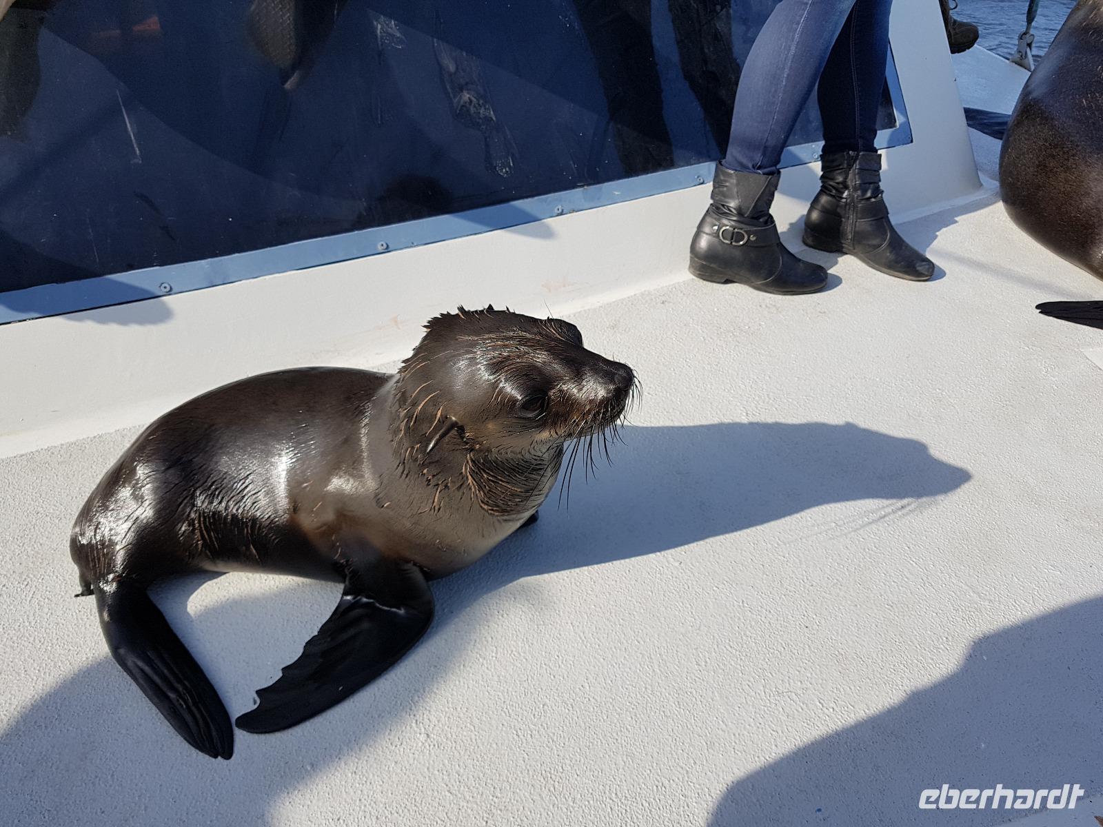 Mit unserem Truck fuhren wir nach Walvis Bay und warteten geduldig bis unser Katamaran endlich kam. Eine Robbe war schon an Bord und 2 weitere kamen gleich, um ihre Portion Fisch abzuholen. Eine 4 Monate alte Robbe war blind und eine andere sah nur auf einem Auge. Aber alle waren Menschen gewöhnt. Auch 2 Pelikane gehörten zur "Crew" und spazierten frech zwischen den Gästen herum. Der Kapitän berichtete, dass einer der Pelikane an dessen Pool mit verletztem Schnabel gelandet sei und gepflegt wurde. Wir fuhren weit hinaus bis zu einer Seehundebank, konnten sie aber wegen der starken Brandung nur aus der Ferne sehen. Auf dem Schiff bekamen wir wieder frische Austern, Sekt und andere Spezialitäten zur Mittagszeit. Dann fuhren wir mit unserem Truck zurück nach Swakopmund und hatten den Sonntag Nachmittag frei. Es gab verschiedene Museen zu erkunden und 4 Singles wagten sich in die Luft, um mit einem Kleinflugzeug die Küstenregion und die Wüste von oben zu sehen. Zum Abendessen fuhren wir an die Seebrücke Jetty und speisten mit vielen anderen Reisegruppen vorzüglich im "The Tug".