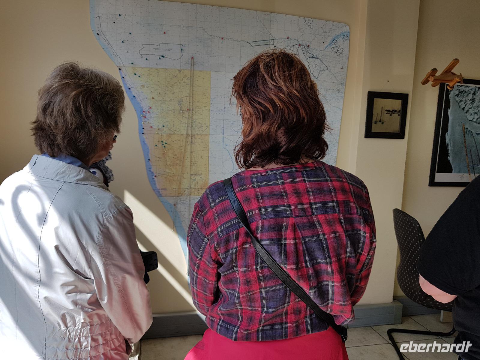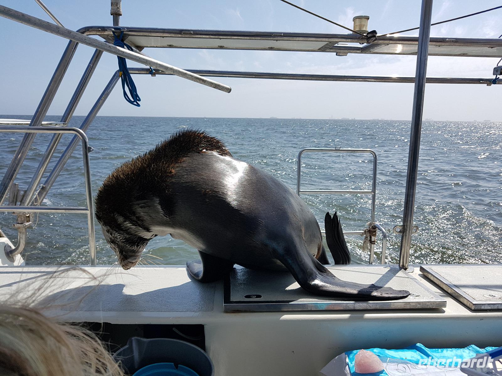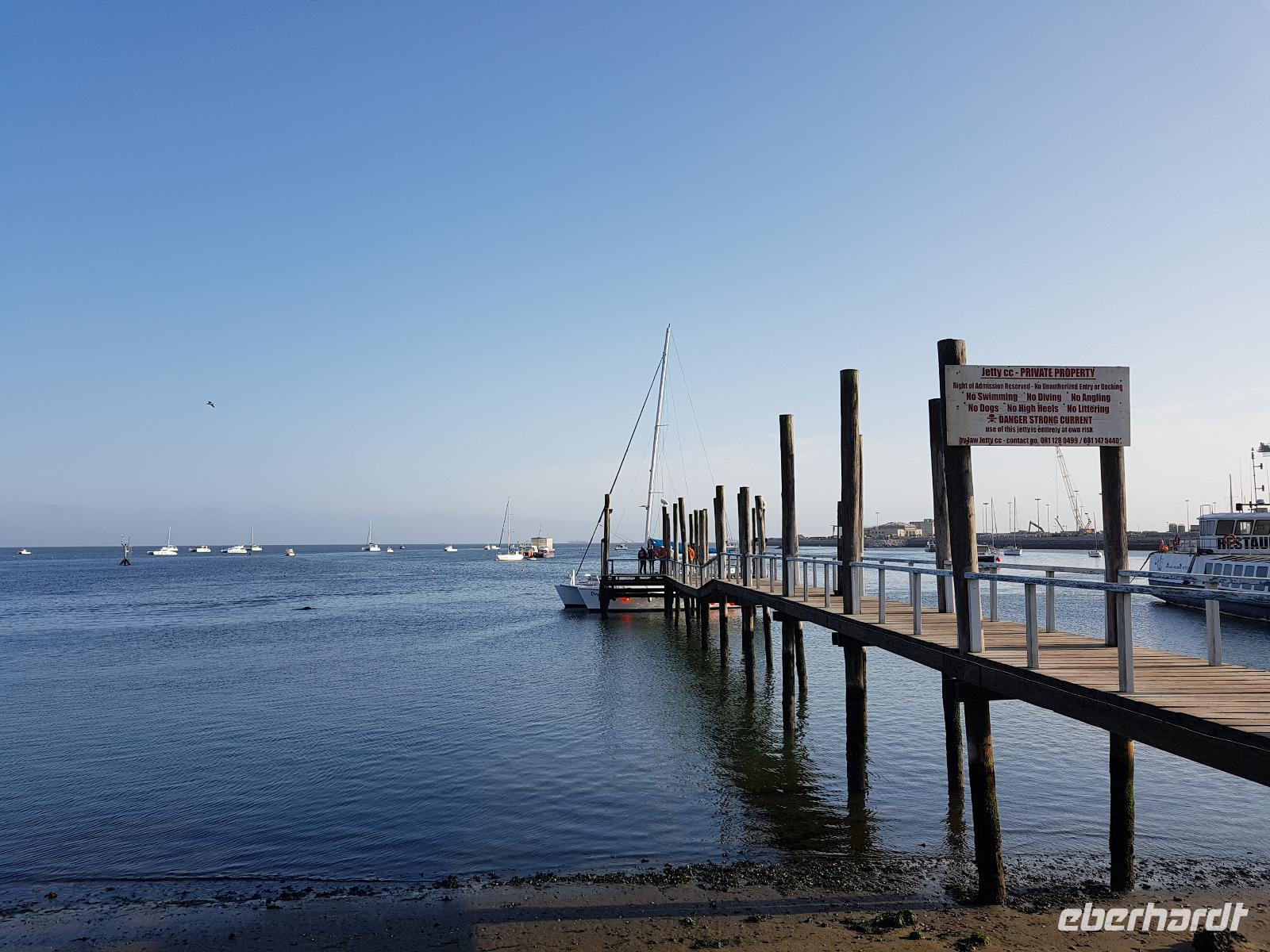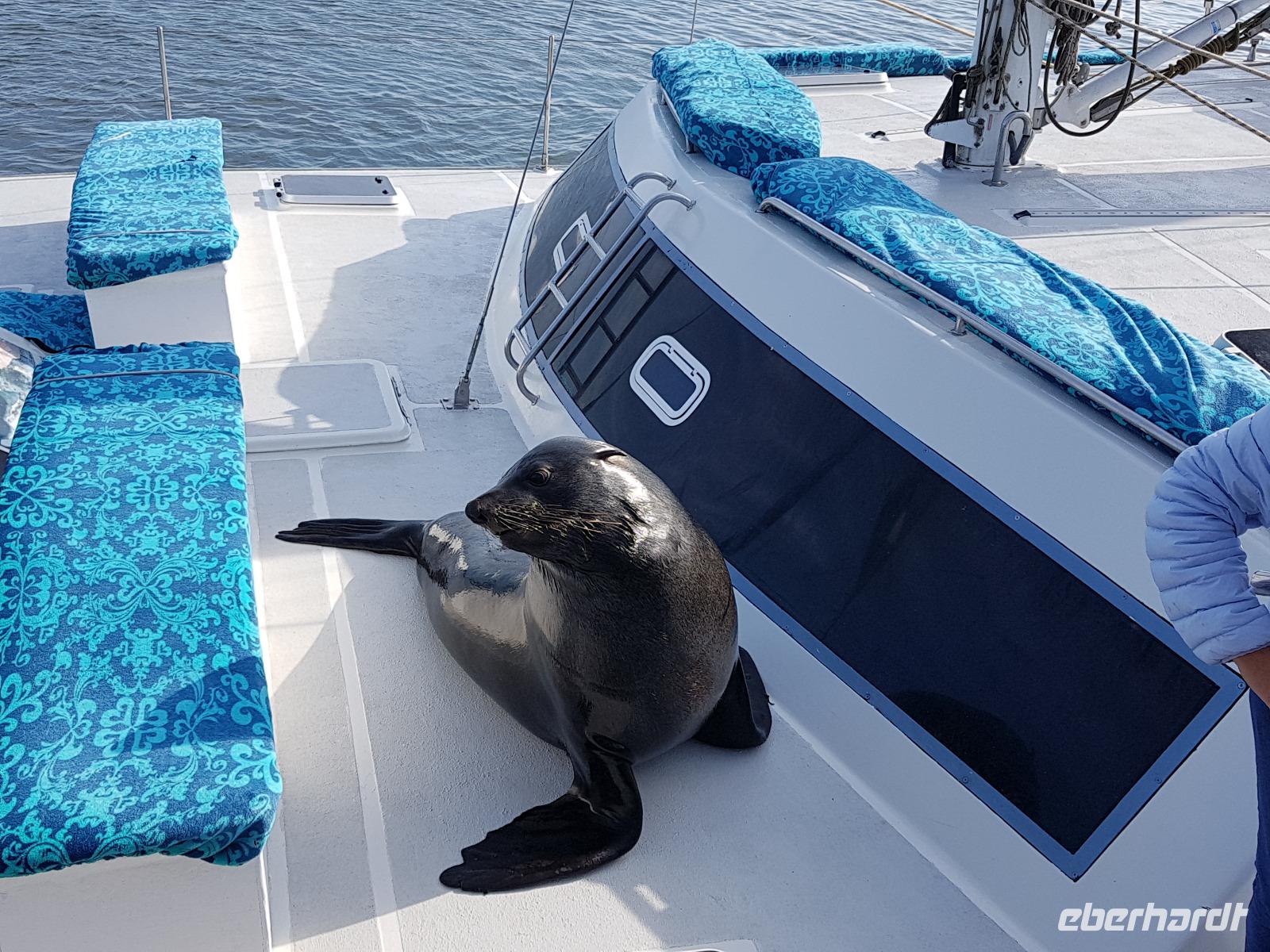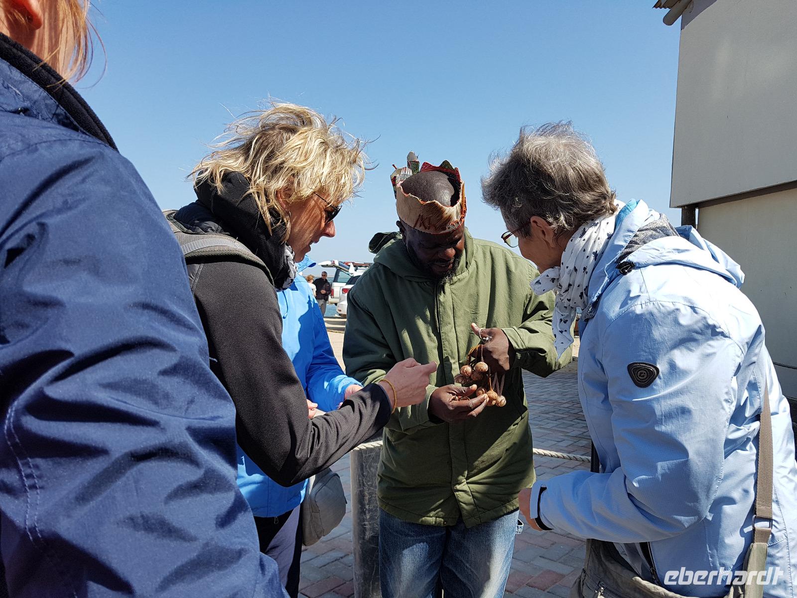 Mit unserem Truck fuhren wir nach Walvis Bay und warteten geduldig bis unser Katamaran endlich kam. Eine Robbe war schon an Bord und 2 weitere kamen gleich, um ihre Portion Fisch abzuholen. Eine 4 Monate alte Robbe war blind und eine andere sah nur auf einem Auge. Aber alle waren Menschen gewöhnt. Auch 2 Pelikane gehörten zur "Crew" und spazierten frech zwischen den Gästen herum. Der Kapitän berichtete, dass einer der Pelikane an dessen Pool mit verletztem Schnabel gelandet sei und gepflegt wurde. Wir fuhren weit hinaus bis zu einer Seehundebank, konnten sie aber wegen der starken Brandung nur aus der Ferne sehen. Auf dem Schiff bekamen wir wieder frische Austern, Sekt und andere Spezialitäten zur Mittagszeit. Dann fuhren wir mit unserem Truck zurück nach Swakopmund und hatten den Sonntag Nachmittag frei. Es gab verschiedene Museen zu erkunden und 4 Singles wagten sich in die Luft, um mit einem Kleinflugzeug die Küstenregion und die Wüste von oben zu sehen. Zum Abendessen fuhren wir an die Seebrücke Jetty und speisten mit vielen anderen Reisegruppen vorzüglich im "The Tug".