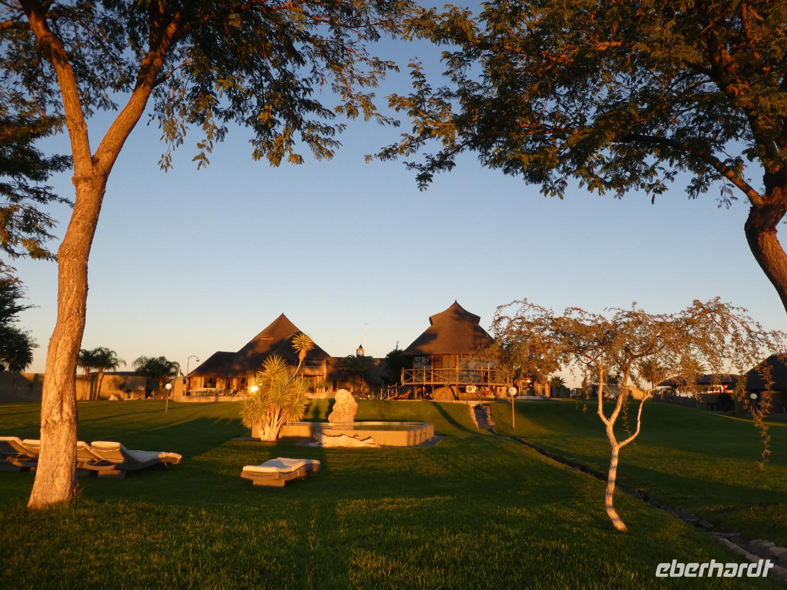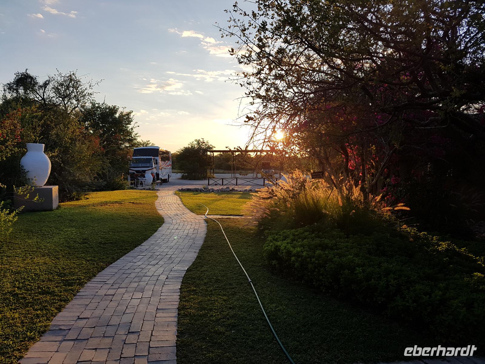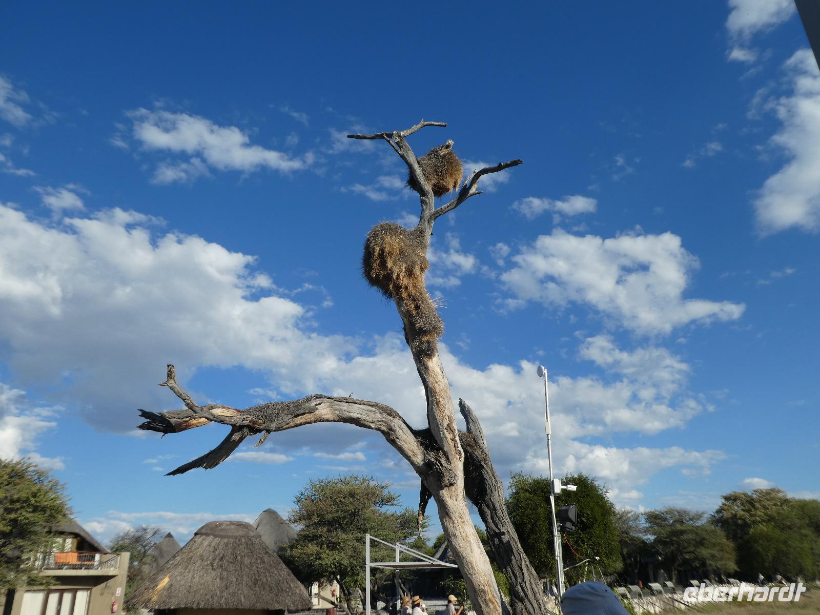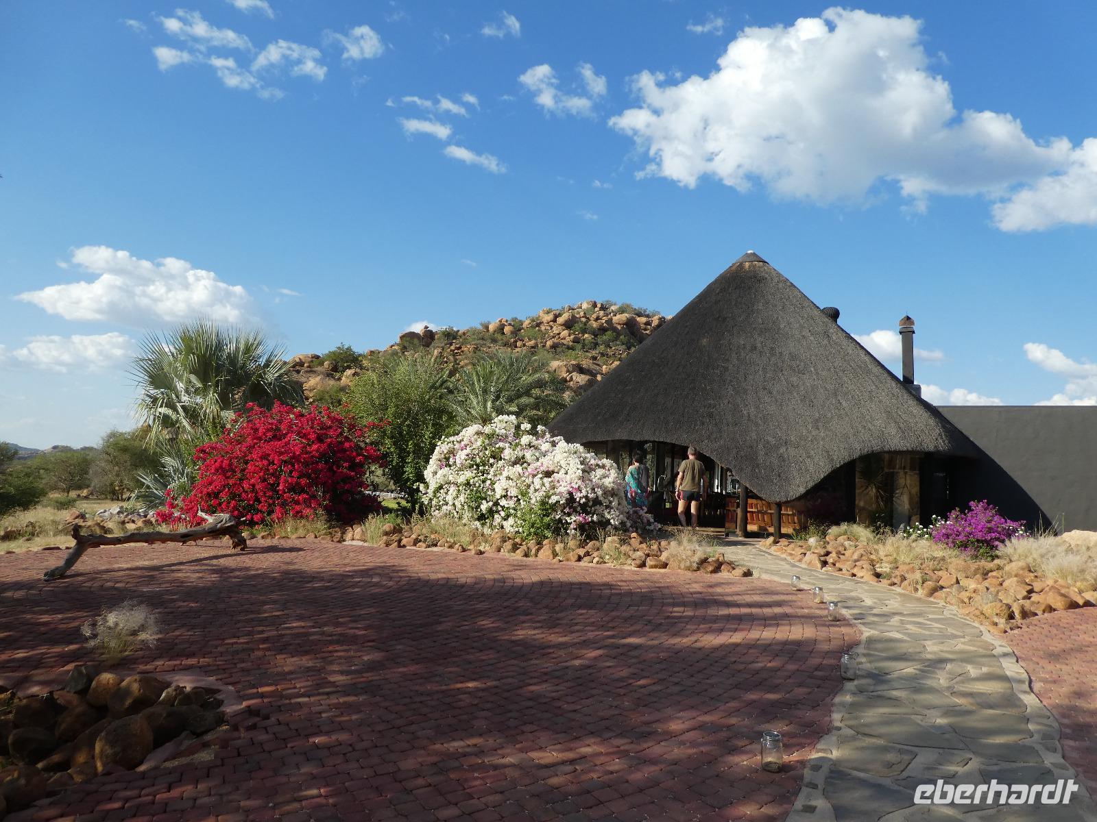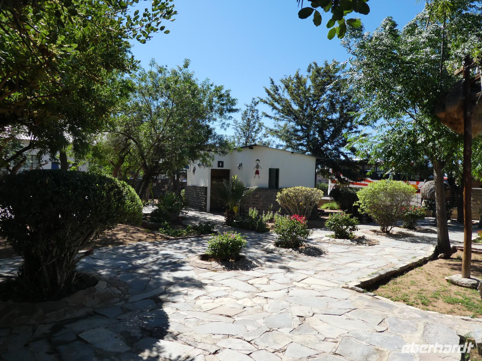 Nach dem Frühstück verliessen wir diesen paradiesischen Ort und fuhren weiter nordwärts. Die Gedanken schwirrten um das Datum 1. Mai und viele Erinnerungen kamen auf. Unser Bus musste tanken und wir besuchten derweil einen Supermarkt. Auf der Weiterfahrt kamen wir durch Kalkfeld, was heute fast verlassen ist, weil der Kalkabbau eingestellt wurde. Unterwegs gab es reichlich Termitenhügel und an einem stiegen wir aus und erhielten ausführliche Erläuterungen von Barbara. Unsere Mittagspause machten wir in Outjo in einem Gartenlokal und unser Mittagspicknick verzehrten wir auf der Weiterfahrt im Bus, denn wir wollten keine Zeit verlieren und noch Tiere sehen. Kurz nach 14 Uhr erreichten wir das Anderson Tor und fuhren mit unserem Truck hinein in den Etoscha Nationalpark. Barbara hatte einen guten Blick für die Tiere und so bekamen wir Empalas, Giraffe, Elefanten, Strausse, Paradieskranich, Sekretärvogel, Riesentrappe, Springböcke und Oryx zu sehen. In einem Camp mitten im Park machten wir eine Pause und gingen zu Fuss zu einem Wasserloch. Im zweiten Teil unserer "Pirschfahrt" sahen wir nochmals einen Elefanten und ein Nashorn. Wir nutzten die Zeit bis zur Parkschliessung und waren ganz glücklich, schon so viele Tiere gesehen zu haben. Etwas südlich des Parkes lag unsere Toshara Lodge und dort zogen wir für 2 Nächte ein. Die Bungalows waren in einem grossen Gelände verstreut und die gesamte Anlage sehr gepflegt und wunderschön bepflanzt. Zum Abendessen war es schon dunkel und so musste der Rundgang durch das Gelände der Lodge auf den nächsten Tag verschoben werden.