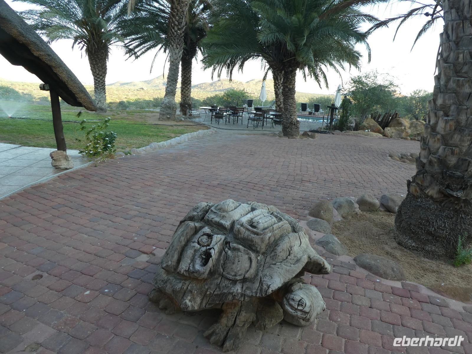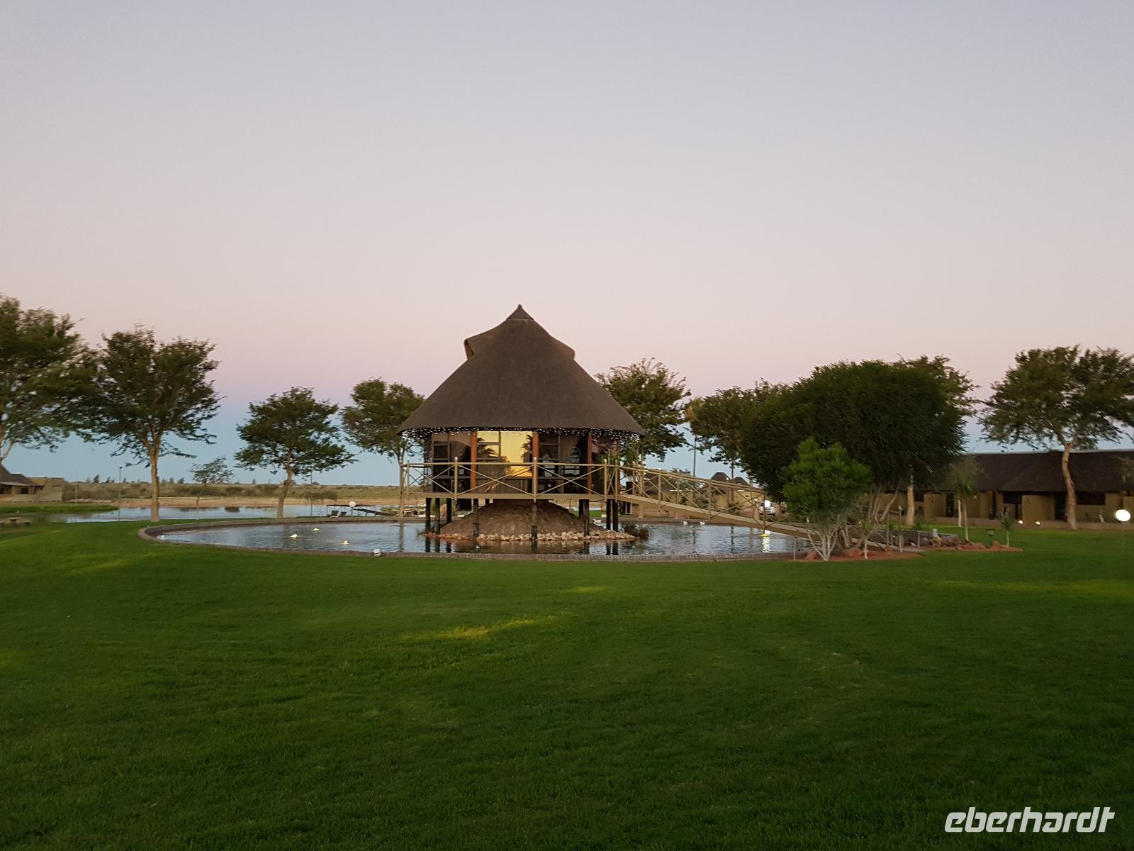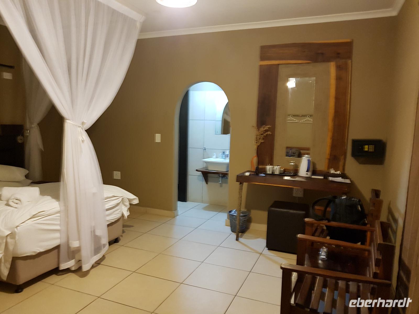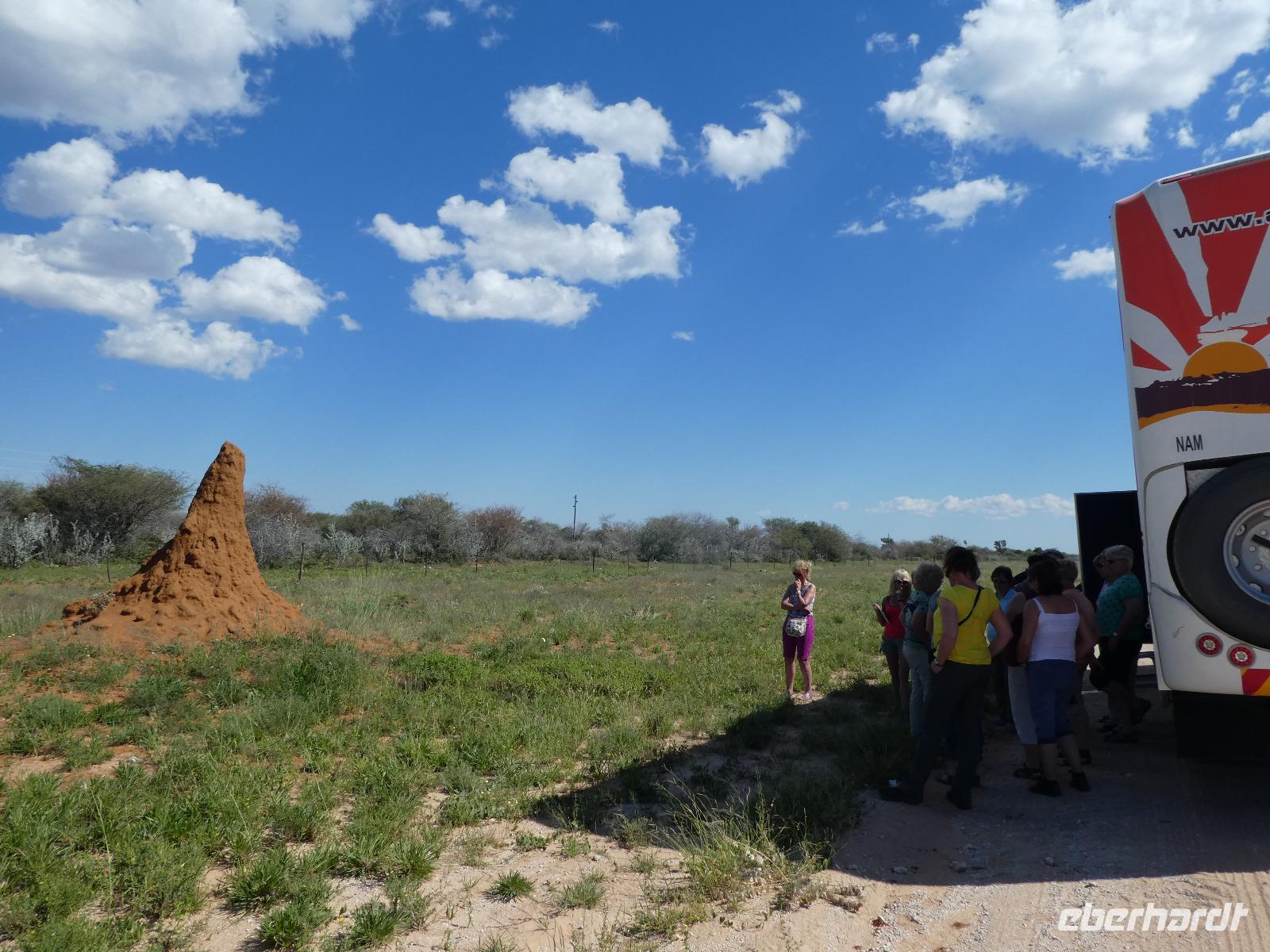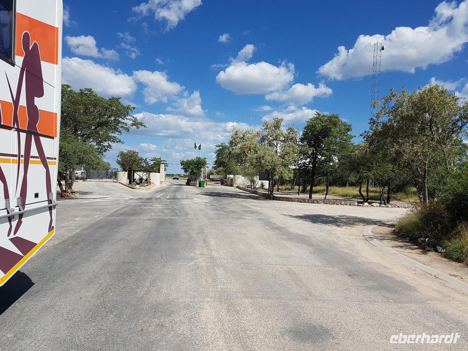 Nach dem Frühstück verliessen wir diesen paradiesischen Ort und fuhren weiter nordwärts. Die Gedanken schwirrten um das Datum 1. Mai und viele Erinnerungen kamen auf. Unser Bus musste tanken und wir besuchten derweil einen Supermarkt. Auf der Weiterfahrt kamen wir durch Kalkfeld, was heute fast verlassen ist, weil der Kalkabbau eingestellt wurde. Unterwegs gab es reichlich Termitenhügel und an einem stiegen wir aus und erhielten ausführliche Erläuterungen von Barbara. Unsere Mittagspause machten wir in Outjo in einem Gartenlokal und unser Mittagspicknick verzehrten wir auf der Weiterfahrt im Bus, denn wir wollten keine Zeit verlieren und noch Tiere sehen. Kurz nach 14 Uhr erreichten wir das Anderson Tor und fuhren mit unserem Truck hinein in den Etoscha Nationalpark. Barbara hatte einen guten Blick für die Tiere und so bekamen wir Empalas, Giraffe, Elefanten, Strausse, Paradieskranich, Sekretärvogel, Riesentrappe, Springböcke und Oryx zu sehen. In einem Camp mitten im Park machten wir eine Pause und gingen zu Fuss zu einem Wasserloch. Im zweiten Teil unserer "Pirschfahrt" sahen wir nochmals einen Elefanten und ein Nashorn. Wir nutzten die Zeit bis zur Parkschliessung und waren ganz glücklich, schon so viele Tiere gesehen zu haben. Etwas südlich des Parkes lag unsere Toshara Lodge und dort zogen wir für 2 Nächte ein. Die Bungalows waren in einem grossen Gelände verstreut und die gesamte Anlage sehr gepflegt und wunderschön bepflanzt. Zum Abendessen war es schon dunkel und so musste der Rundgang durch das Gelände der Lodge auf den nächsten Tag verschoben werden.