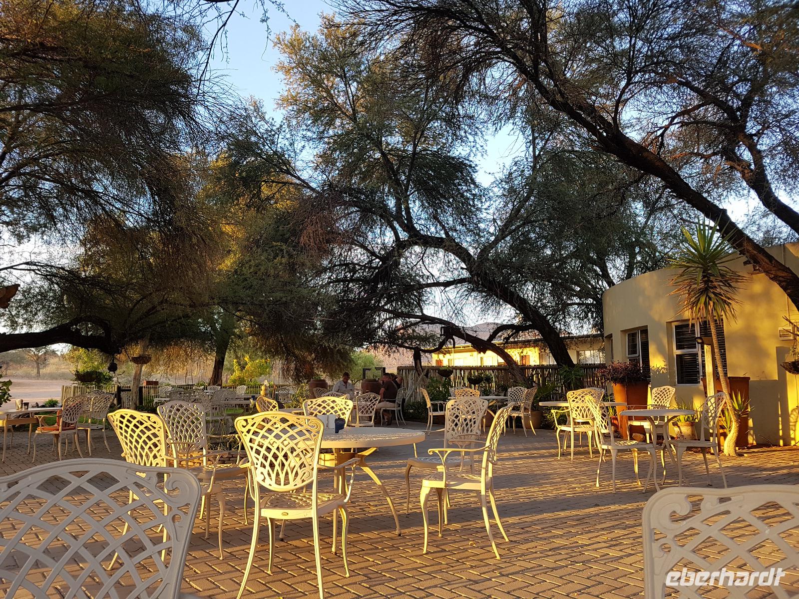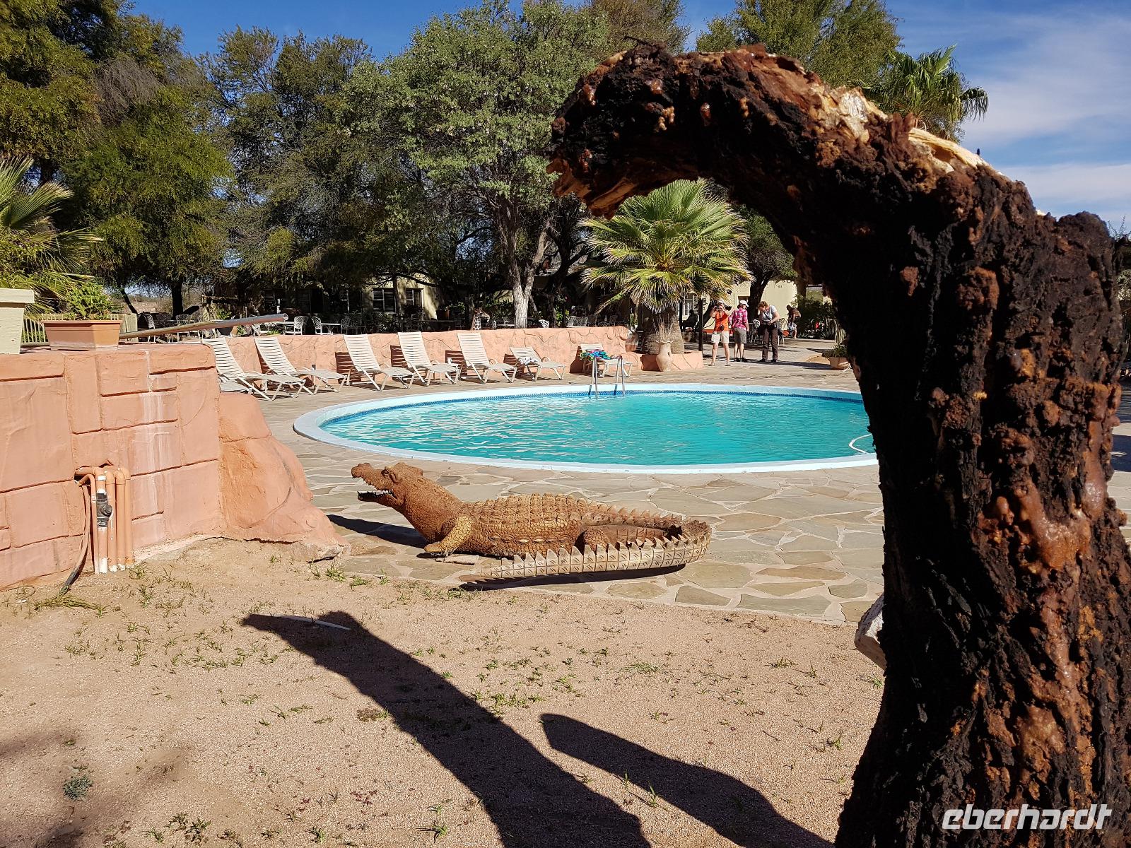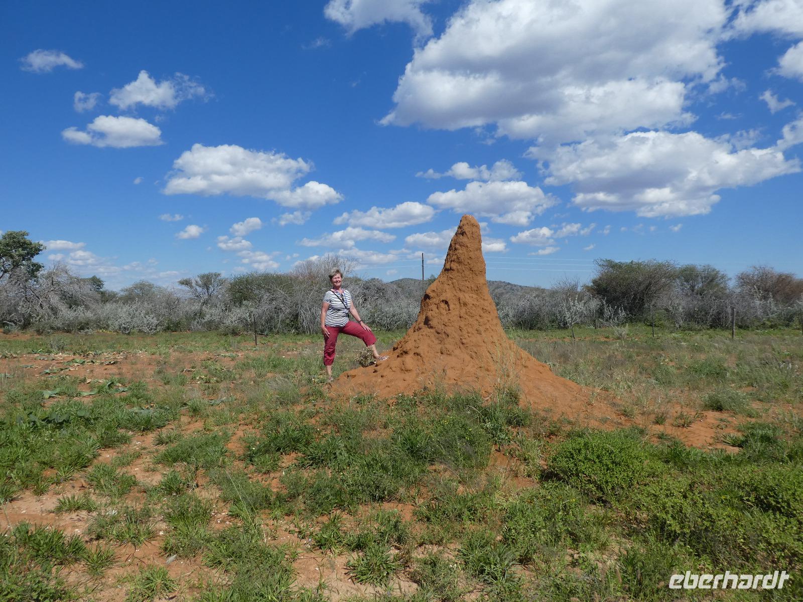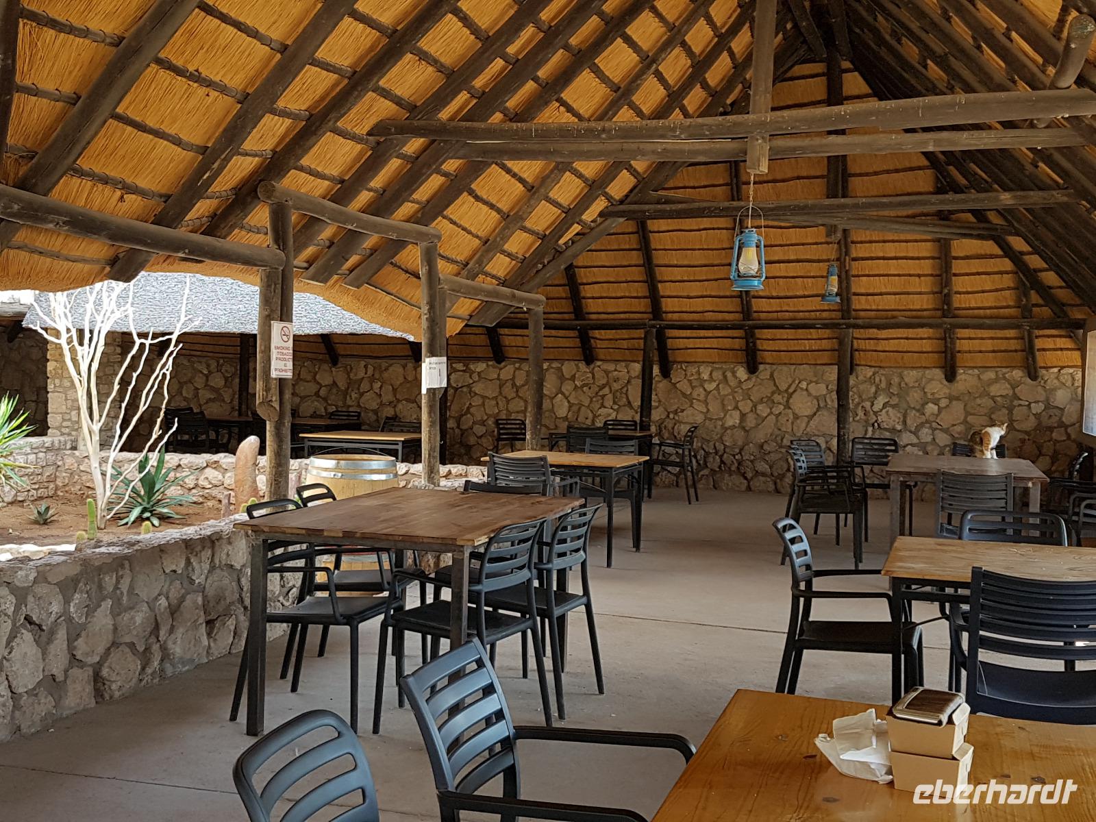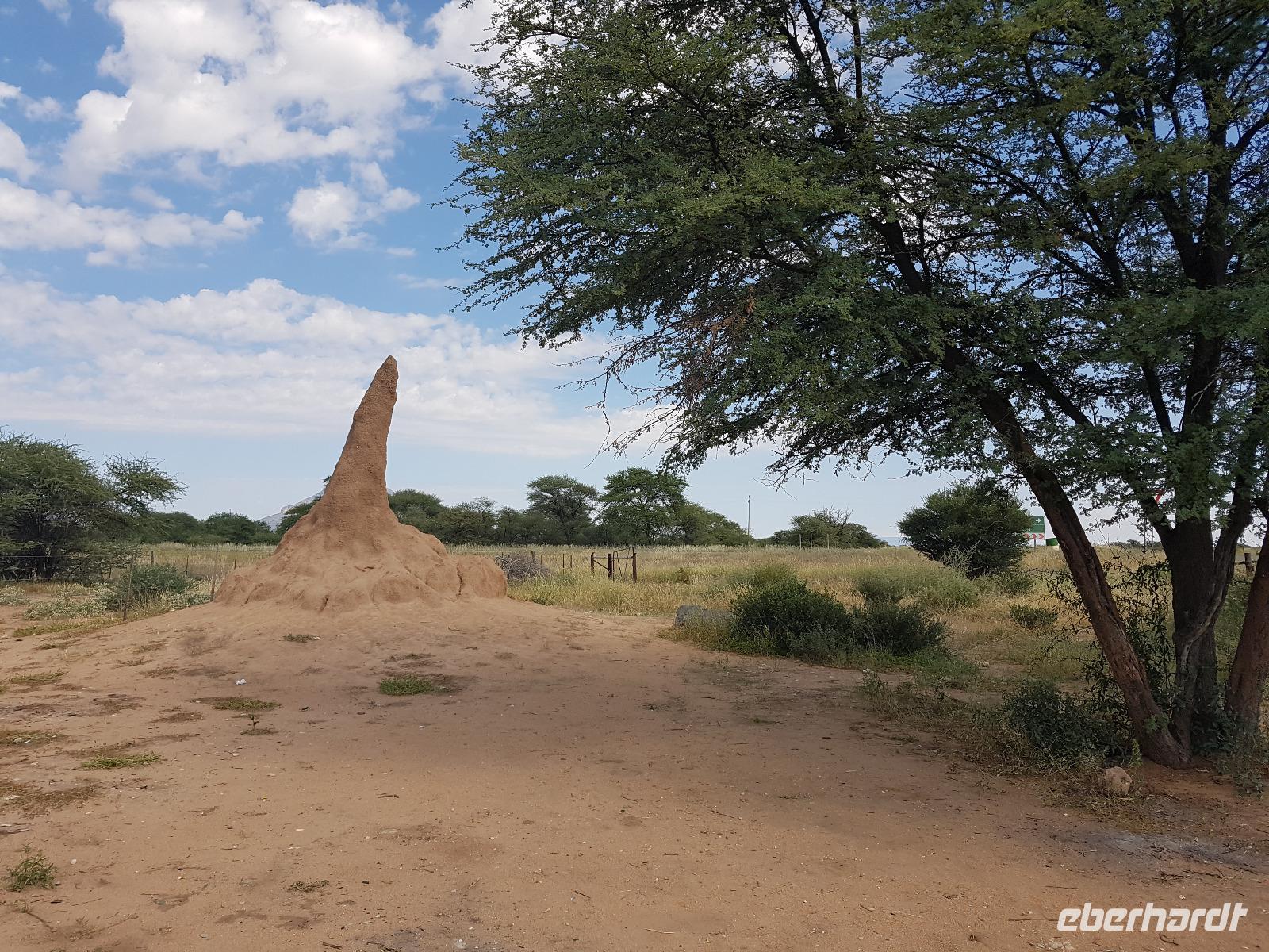 Nach dem Frühstück verliessen wir diesen paradiesischen Ort und fuhren weiter nordwärts. Die Gedanken schwirrten um das Datum 1. Mai und viele Erinnerungen kamen auf. Unser Bus musste tanken und wir besuchten derweil einen Supermarkt. Auf der Weiterfahrt kamen wir durch Kalkfeld, was heute fast verlassen ist, weil der Kalkabbau eingestellt wurde. Unterwegs gab es reichlich Termitenhügel und an einem stiegen wir aus und erhielten ausführliche Erläuterungen von Barbara. Unsere Mittagspause machten wir in Outjo in einem Gartenlokal und unser Mittagspicknick verzehrten wir auf der Weiterfahrt im Bus, denn wir wollten keine Zeit verlieren und noch Tiere sehen. Kurz nach 14 Uhr erreichten wir das Anderson Tor und fuhren mit unserem Truck hinein in den Etoscha Nationalpark. Barbara hatte einen guten Blick für die Tiere und so bekamen wir Empalas, Giraffe, Elefanten, Strausse, Paradieskranich, Sekretärvogel, Riesentrappe, Springböcke und Oryx zu sehen. In einem Camp mitten im Park machten wir eine Pause und gingen zu Fuss zu einem Wasserloch. Im zweiten Teil unserer "Pirschfahrt" sahen wir nochmals einen Elefanten und ein Nashorn. Wir nutzten die Zeit bis zur Parkschliessung und waren ganz glücklich, schon so viele Tiere gesehen zu haben. Etwas südlich des Parkes lag unsere Toshara Lodge und dort zogen wir für 2 Nächte ein. Die Bungalows waren in einem grossen Gelände verstreut und die gesamte Anlage sehr gepflegt und wunderschön bepflanzt. Zum Abendessen war es schon dunkel und so musste der Rundgang durch das Gelände der Lodge auf den nächsten Tag verschoben werden.