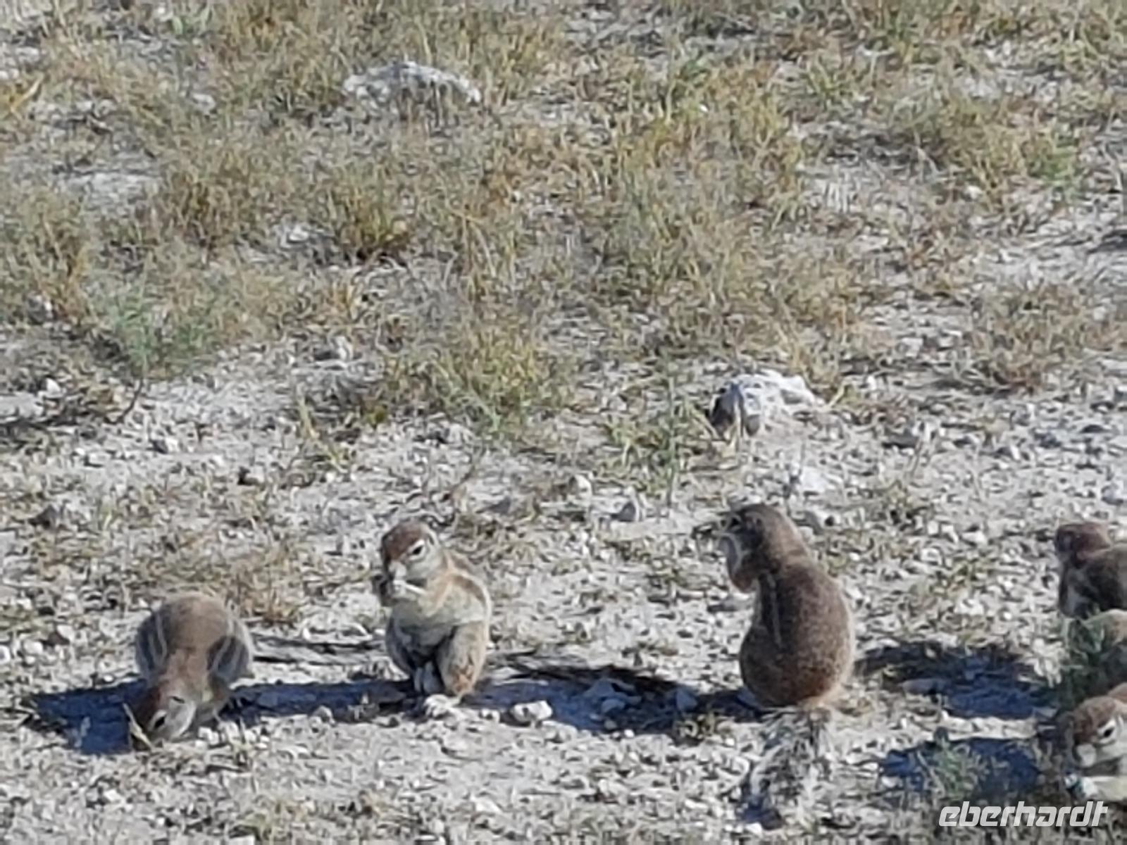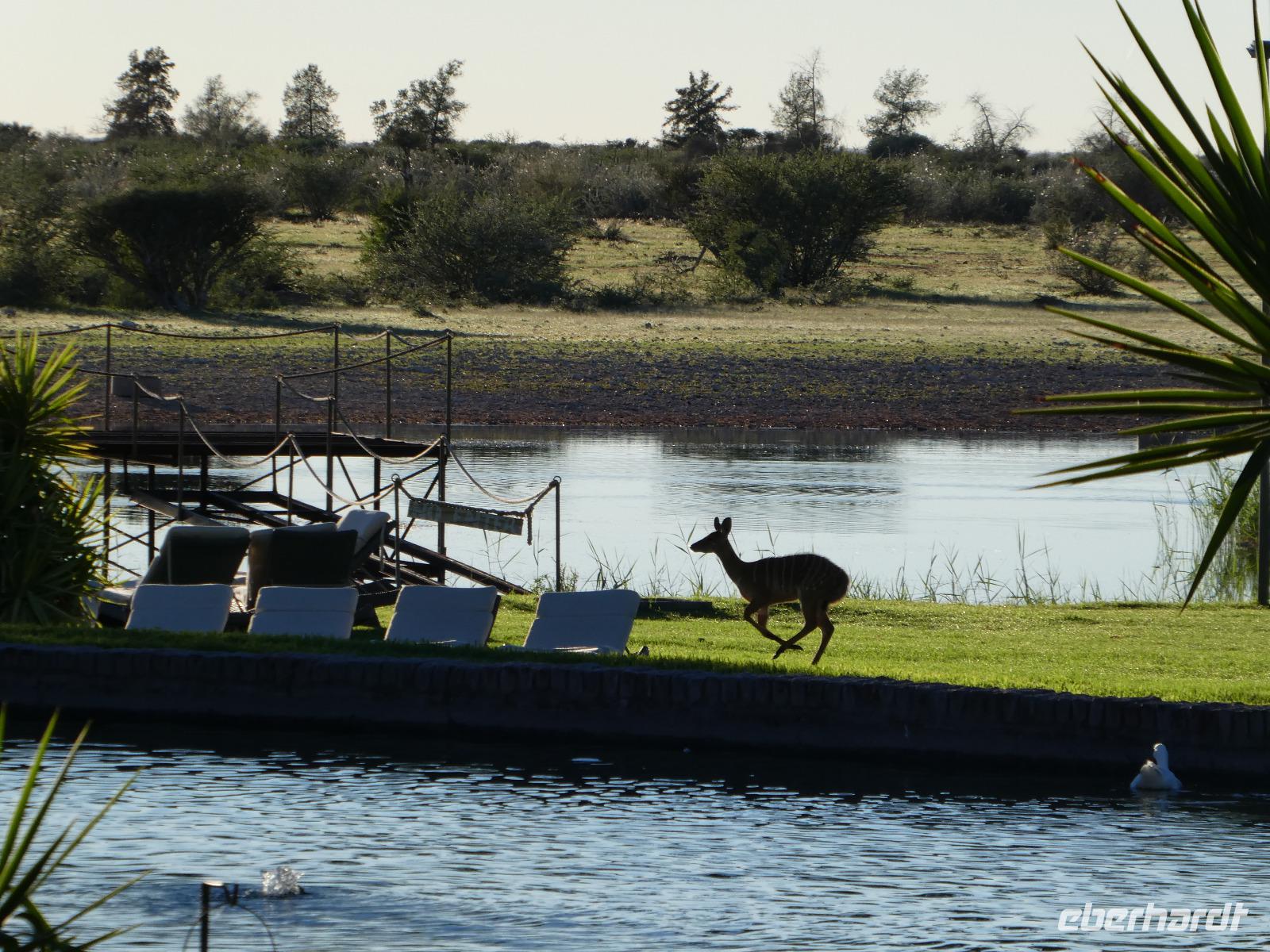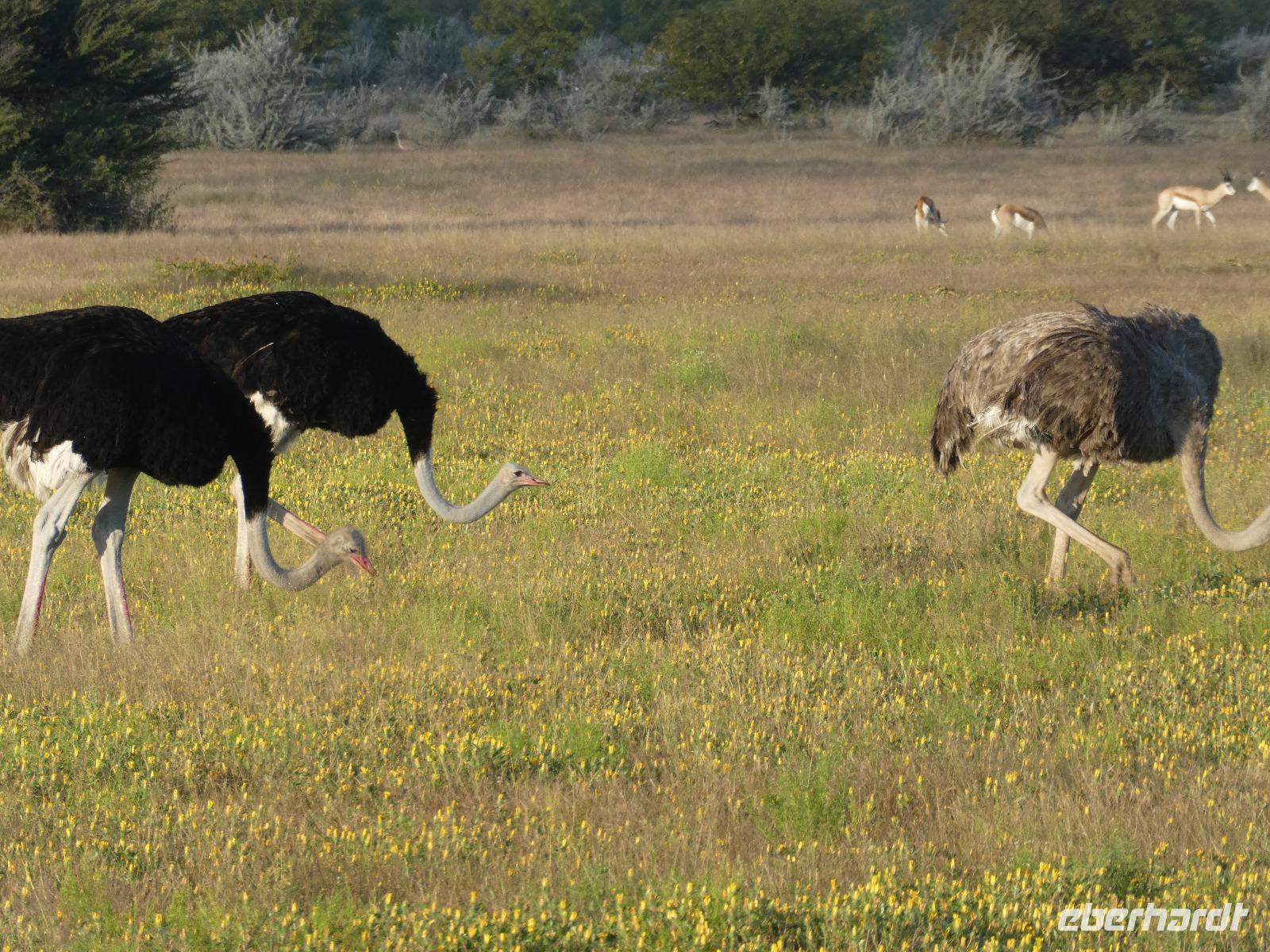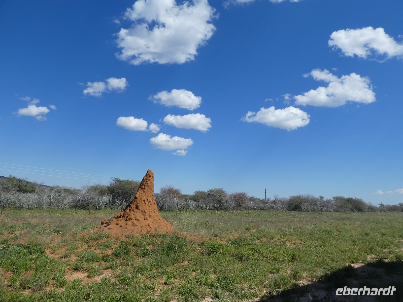 Nach dem Frühstück verliessen wir diesen paradiesischen Ort und fuhren weiter nordwärts. Die Gedanken schwirrten um das Datum 1. Mai und viele Erinnerungen kamen auf. Unser Bus musste tanken und wir besuchten derweil einen Supermarkt. Auf der Weiterfahrt kamen wir durch Kalkfeld, was heute fast verlassen ist, weil der Kalkabbau eingestellt wurde. Unterwegs gab es reichlich Termitenhügel und an einem stiegen wir aus und erhielten ausführliche Erläuterungen von Barbara. Unsere Mittagspause machten wir in Outjo in einem Gartenlokal und unser Mittagspicknick verzehrten wir auf der Weiterfahrt im Bus, denn wir wollten keine Zeit verlieren und noch Tiere sehen. Kurz nach 14 Uhr erreichten wir das Anderson Tor und fuhren mit unserem Truck hinein in den Etoscha Nationalpark. Barbara hatte einen guten Blick für die Tiere und so bekamen wir Empalas, Giraffe, Elefanten, Strausse, Paradieskranich, Sekretärvogel, Riesentrappe, Springböcke und Oryx zu sehen. In einem Camp mitten im Park machten wir eine Pause und gingen zu Fuss zu einem Wasserloch. Im zweiten Teil unserer "Pirschfahrt" sahen wir nochmals einen Elefanten und ein Nashorn. Wir nutzten die Zeit bis zur Parkschliessung und waren ganz glücklich, schon so viele Tiere gesehen zu haben. Etwas südlich des Parkes lag unsere Toshara Lodge und dort zogen wir für 2 Nächte ein. Die Bungalows waren in einem grossen Gelände verstreut und die gesamte Anlage sehr gepflegt und wunderschön bepflanzt. Zum Abendessen war es schon dunkel und so musste der Rundgang durch das Gelände der Lodge auf den nächsten Tag verschoben werden.