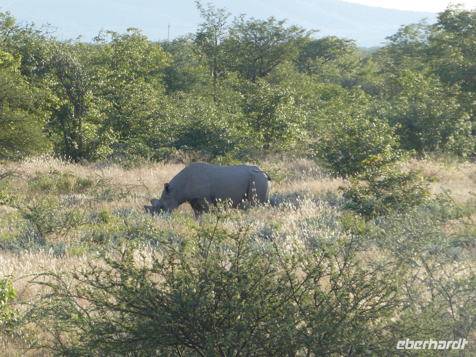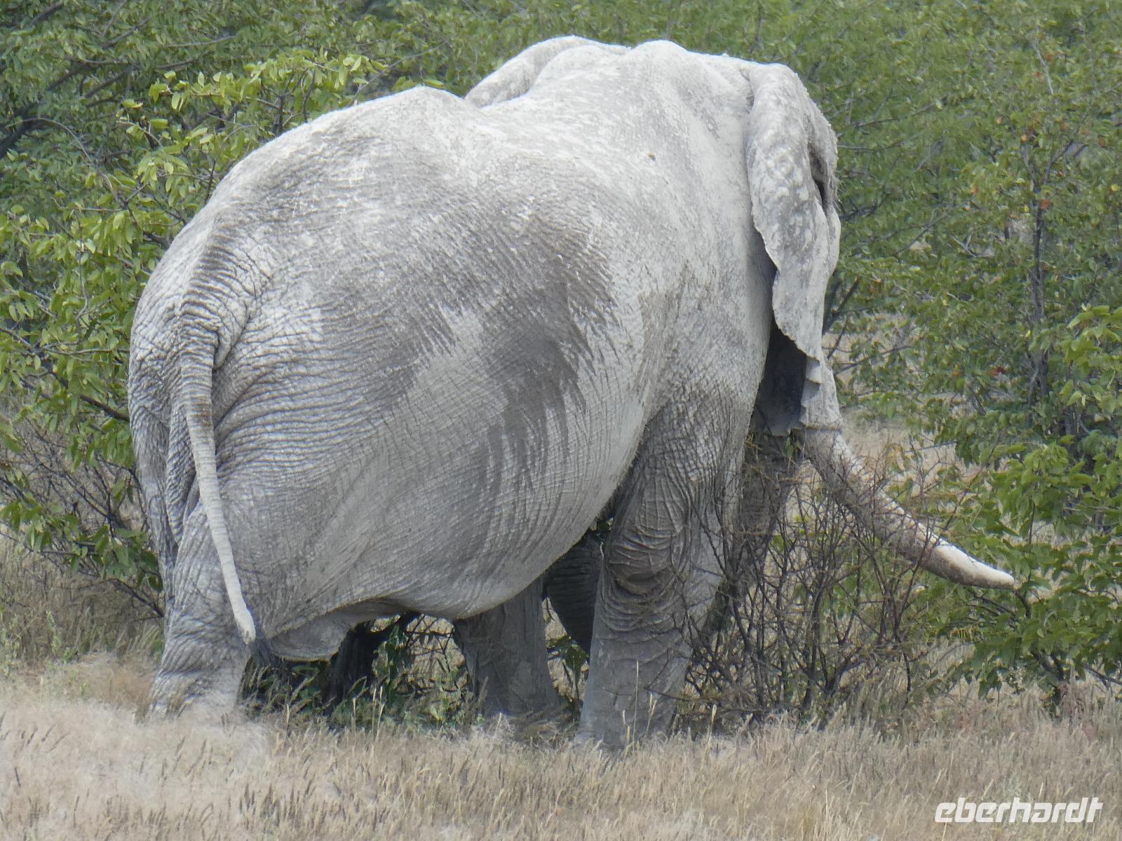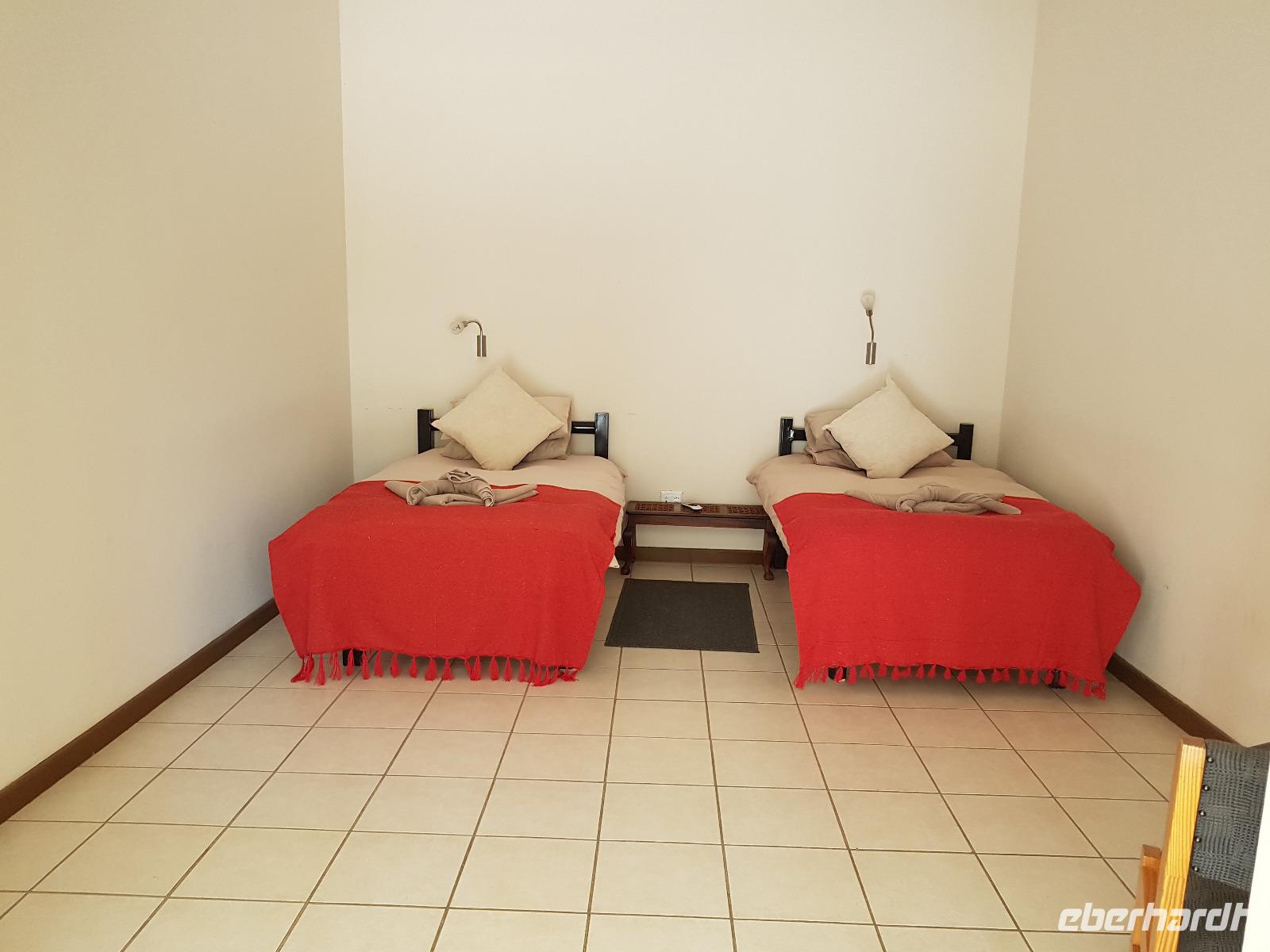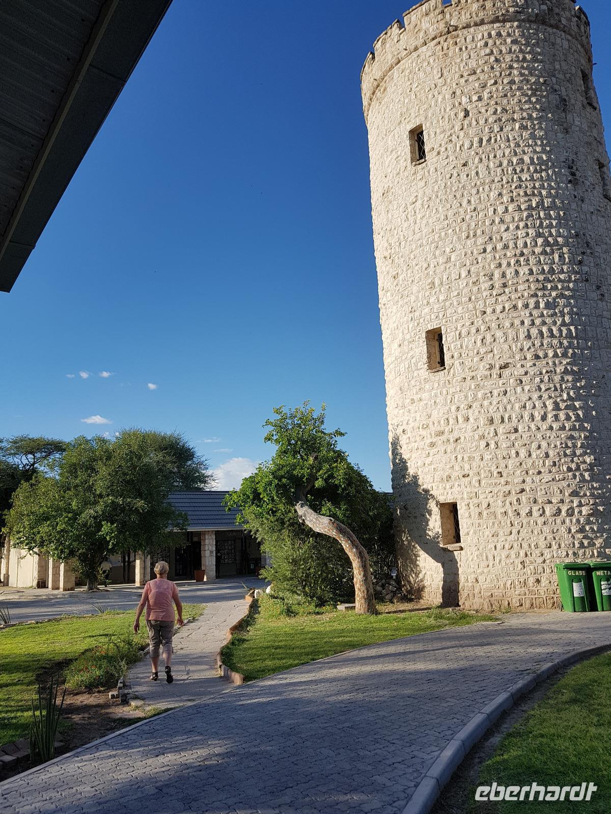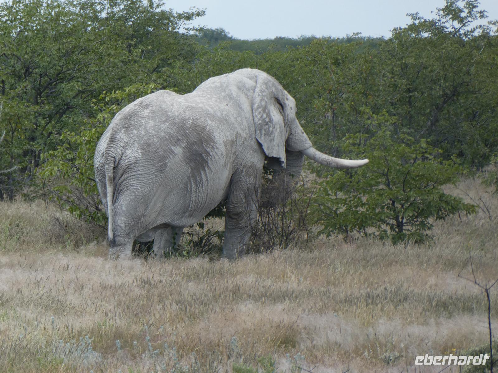 Nach dem Frühstück verliessen wir diesen paradiesischen Ort und fuhren weiter nordwärts. Die Gedanken schwirrten um das Datum 1. Mai und viele Erinnerungen kamen auf. Unser Bus musste tanken und wir besuchten derweil einen Supermarkt. Auf der Weiterfahrt kamen wir durch Kalkfeld, was heute fast verlassen ist, weil der Kalkabbau eingestellt wurde. Unterwegs gab es reichlich Termitenhügel und an einem stiegen wir aus und erhielten ausführliche Erläuterungen von Barbara. Unsere Mittagspause machten wir in Outjo in einem Gartenlokal und unser Mittagspicknick verzehrten wir auf der Weiterfahrt im Bus, denn wir wollten keine Zeit verlieren und noch Tiere sehen. Kurz nach 14 Uhr erreichten wir das Anderson Tor und fuhren mit unserem Truck hinein in den Etoscha Nationalpark. Barbara hatte einen guten Blick für die Tiere und so bekamen wir Empalas, Giraffe, Elefanten, Strausse, Paradieskranich, Sekretärvogel, Riesentrappe, Springböcke und Oryx zu sehen. In einem Camp mitten im Park machten wir eine Pause und gingen zu Fuss zu einem Wasserloch. Im zweiten Teil unserer "Pirschfahrt" sahen wir nochmals einen Elefanten und ein Nashorn. Wir nutzten die Zeit bis zur Parkschliessung und waren ganz glücklich, schon so viele Tiere gesehen zu haben. Etwas südlich des Parkes lag unsere Toshara Lodge und dort zogen wir für 2 Nächte ein. Die Bungalows waren in einem grossen Gelände verstreut und die gesamte Anlage sehr gepflegt und wunderschön bepflanzt. Zum Abendessen war es schon dunkel und so musste der Rundgang durch das Gelände der Lodge auf den nächsten Tag verschoben werden.