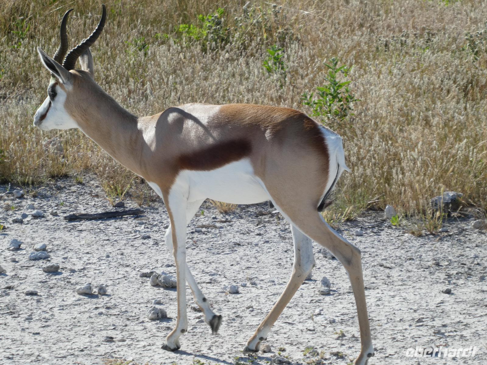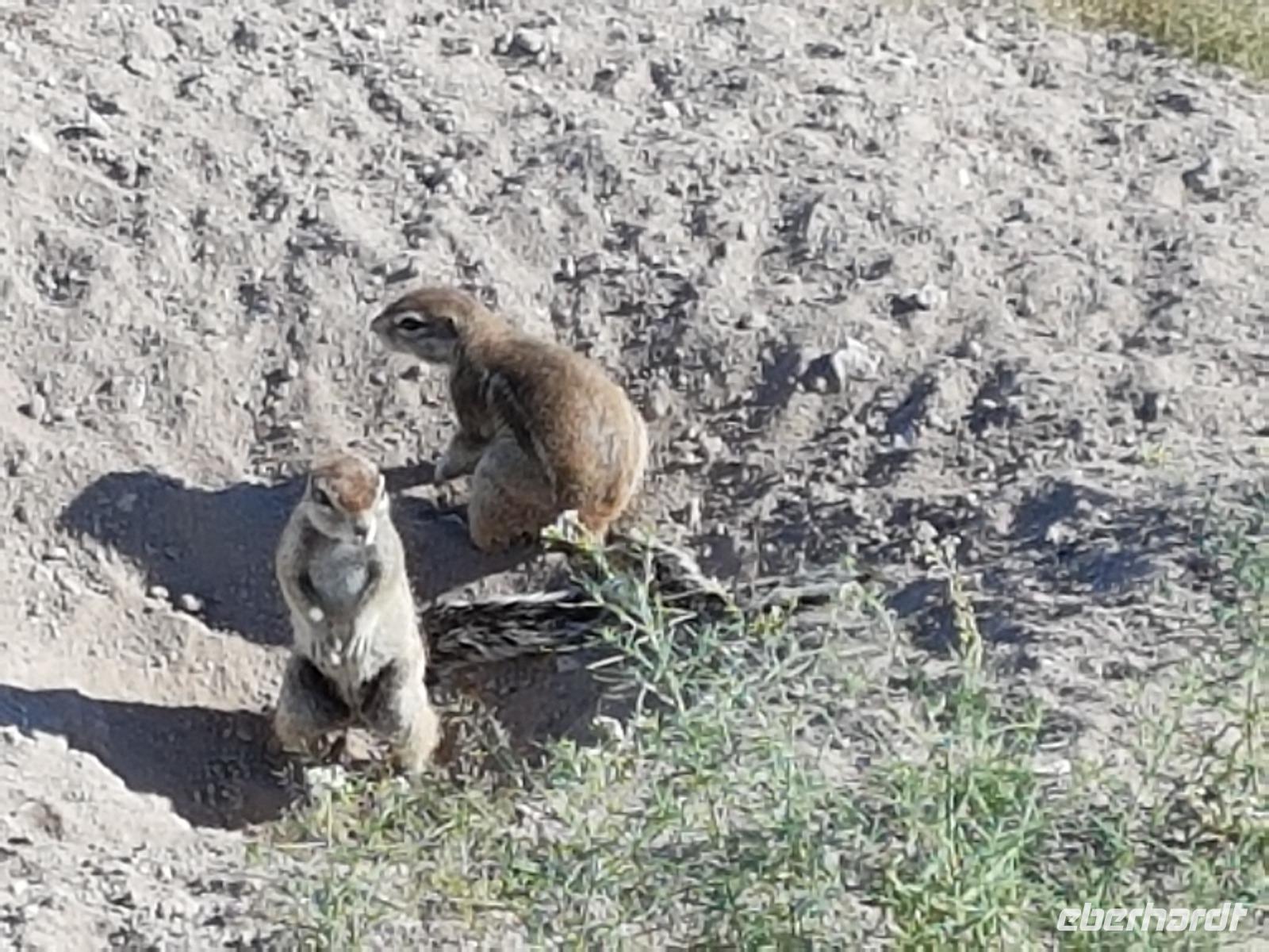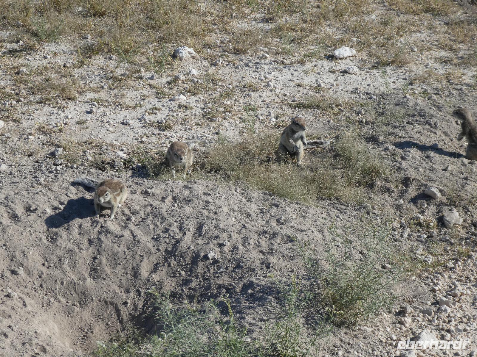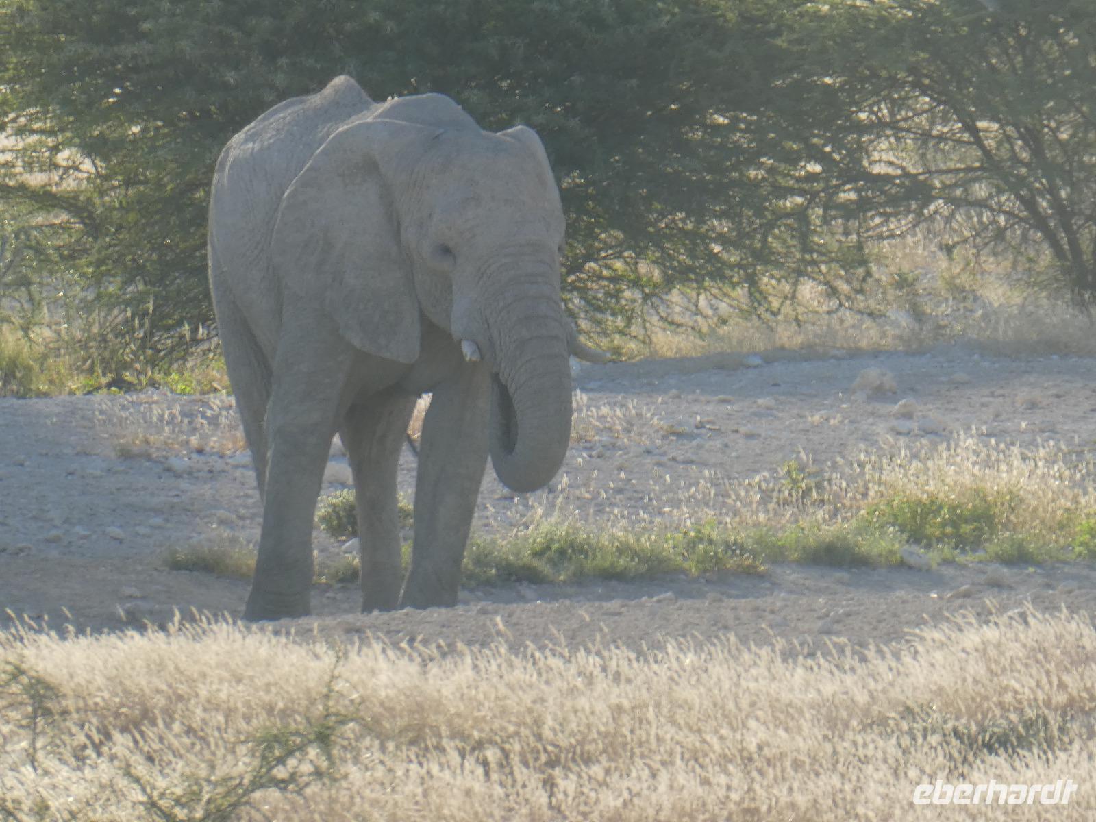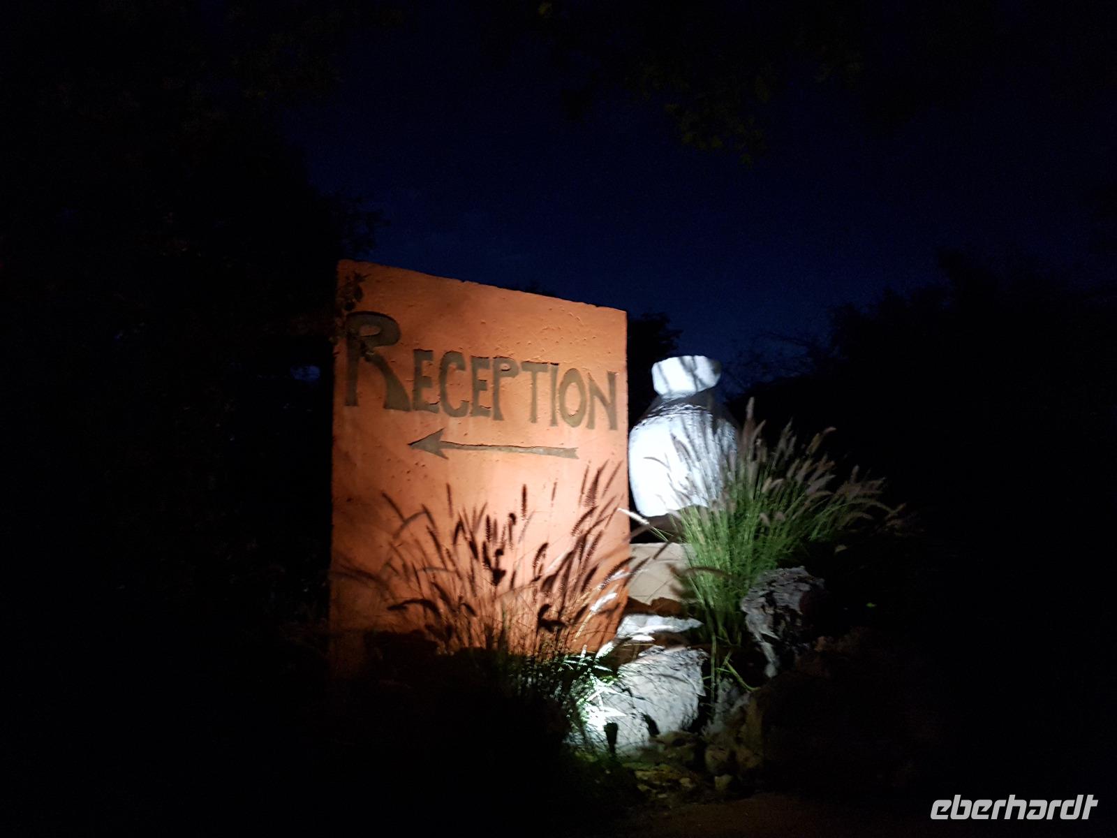 Nach dem Frühstück verliessen wir diesen paradiesischen Ort und fuhren weiter nordwärts. Die Gedanken schwirrten um das Datum 1. Mai und viele Erinnerungen kamen auf. Unser Bus musste tanken und wir besuchten derweil einen Supermarkt. Auf der Weiterfahrt kamen wir durch Kalkfeld, was heute fast verlassen ist, weil der Kalkabbau eingestellt wurde. Unterwegs gab es reichlich Termitenhügel und an einem stiegen wir aus und erhielten ausführliche Erläuterungen von Barbara. Unsere Mittagspause machten wir in Outjo in einem Gartenlokal und unser Mittagspicknick verzehrten wir auf der Weiterfahrt im Bus, denn wir wollten keine Zeit verlieren und noch Tiere sehen. Kurz nach 14 Uhr erreichten wir das Anderson Tor und fuhren mit unserem Truck hinein in den Etoscha Nationalpark. Barbara hatte einen guten Blick für die Tiere und so bekamen wir Empalas, Giraffe, Elefanten, Strausse, Paradieskranich, Sekretärvogel, Riesentrappe, Springböcke und Oryx zu sehen. In einem Camp mitten im Park machten wir eine Pause und gingen zu Fuss zu einem Wasserloch. Im zweiten Teil unserer "Pirschfahrt" sahen wir nochmals einen Elefanten und ein Nashorn. Wir nutzten die Zeit bis zur Parkschliessung und waren ganz glücklich, schon so viele Tiere gesehen zu haben. Etwas südlich des Parkes lag unsere Toshara Lodge und dort zogen wir für 2 Nächte ein. Die Bungalows waren in einem grossen Gelände verstreut und die gesamte Anlage sehr gepflegt und wunderschön bepflanzt. Zum Abendessen war es schon dunkel und so musste der Rundgang durch das Gelände der Lodge auf den nächsten Tag verschoben werden.