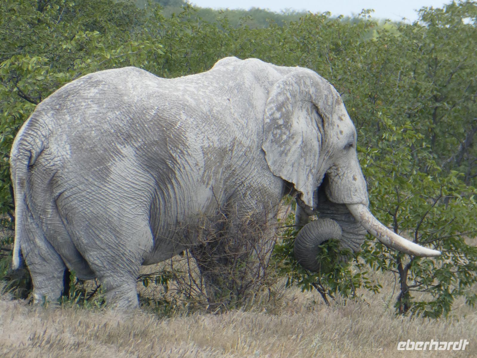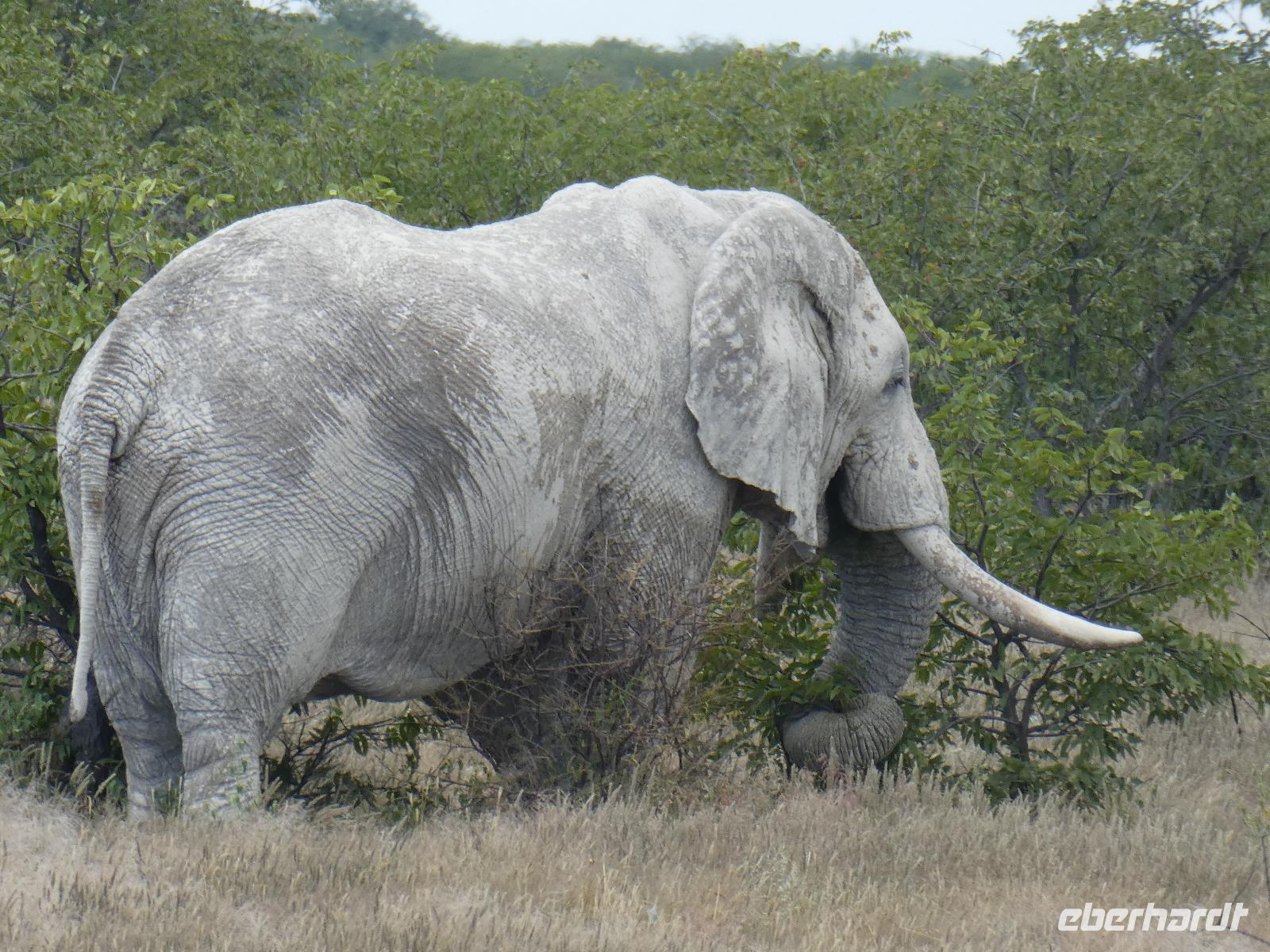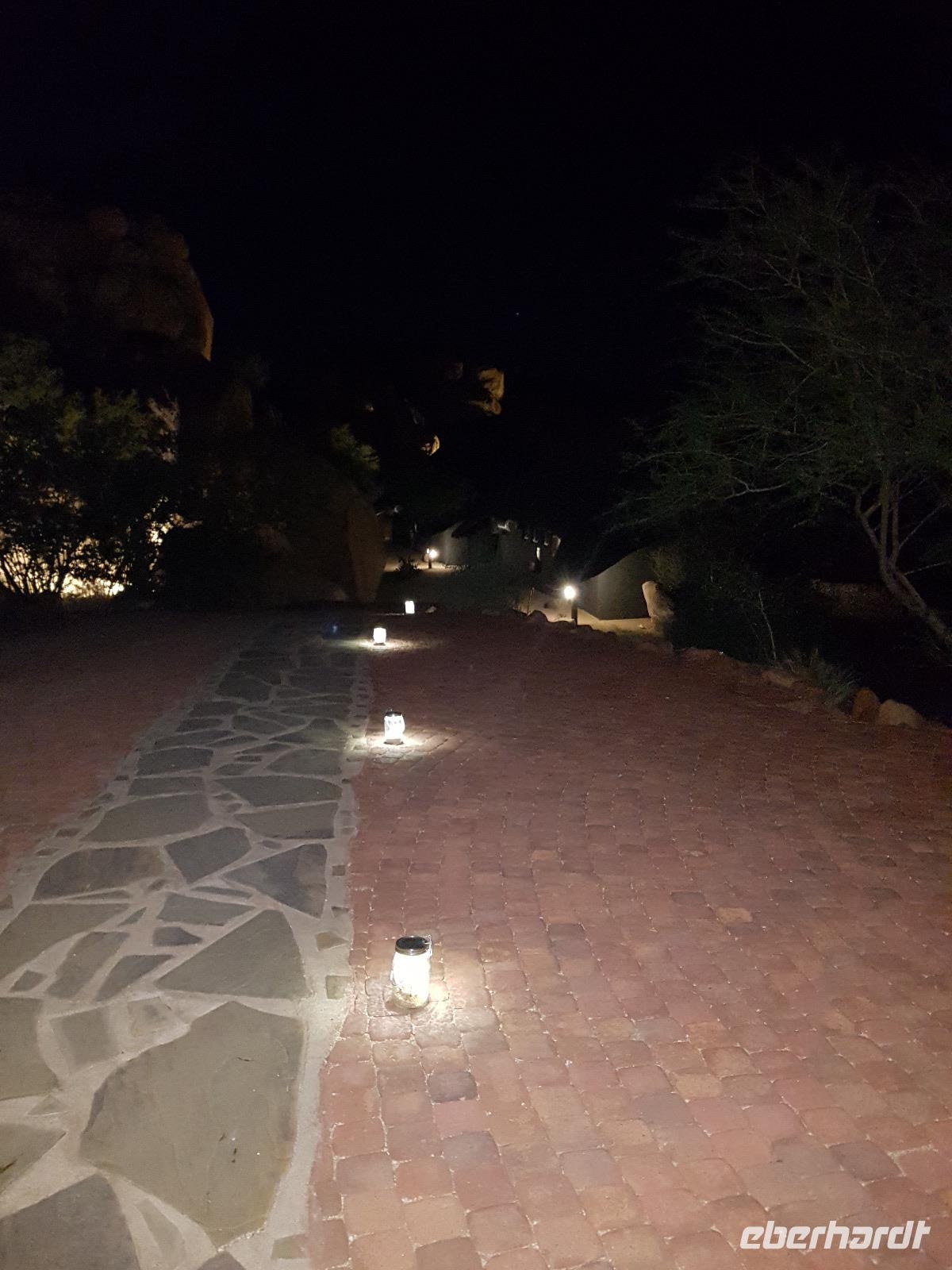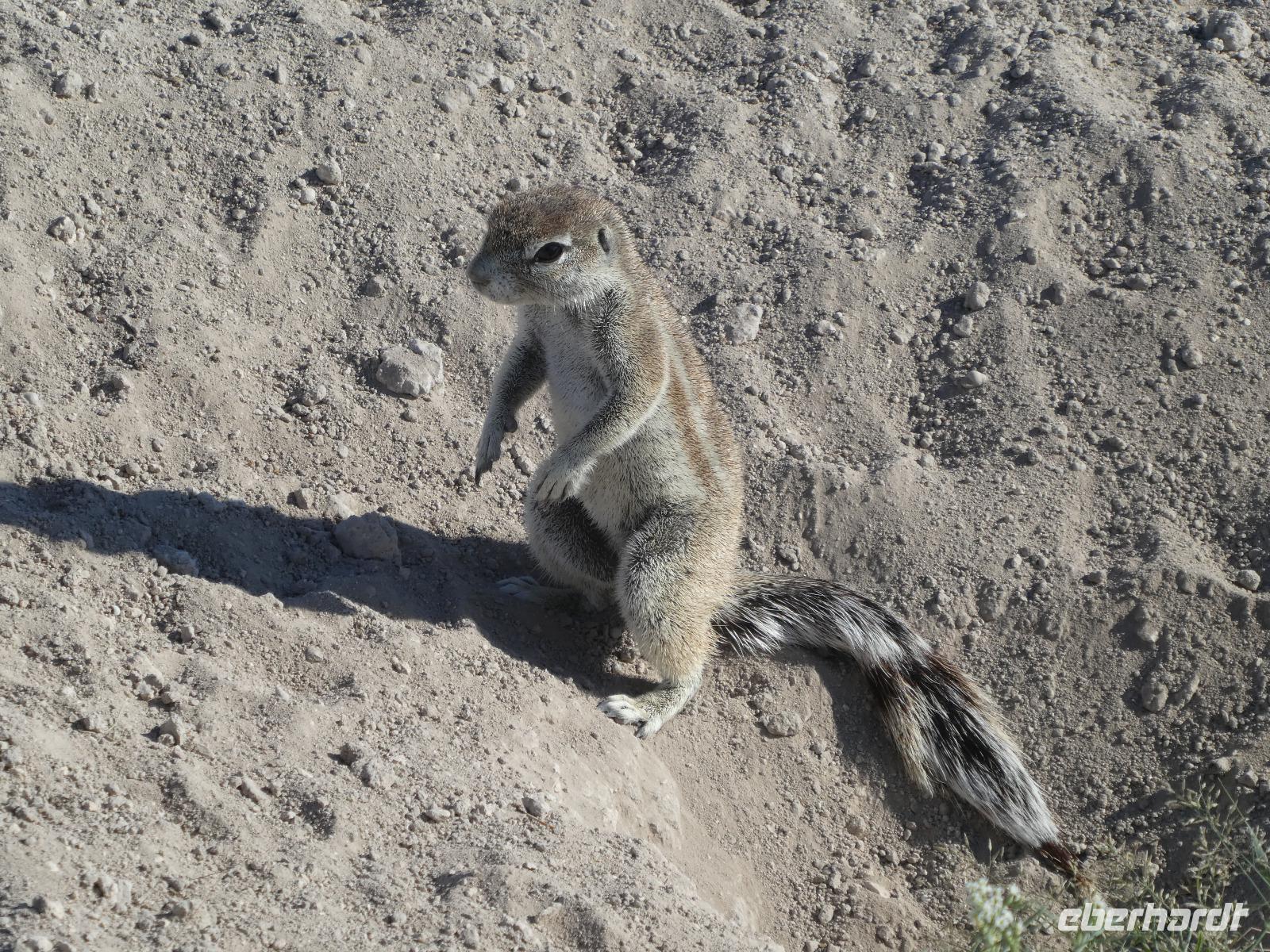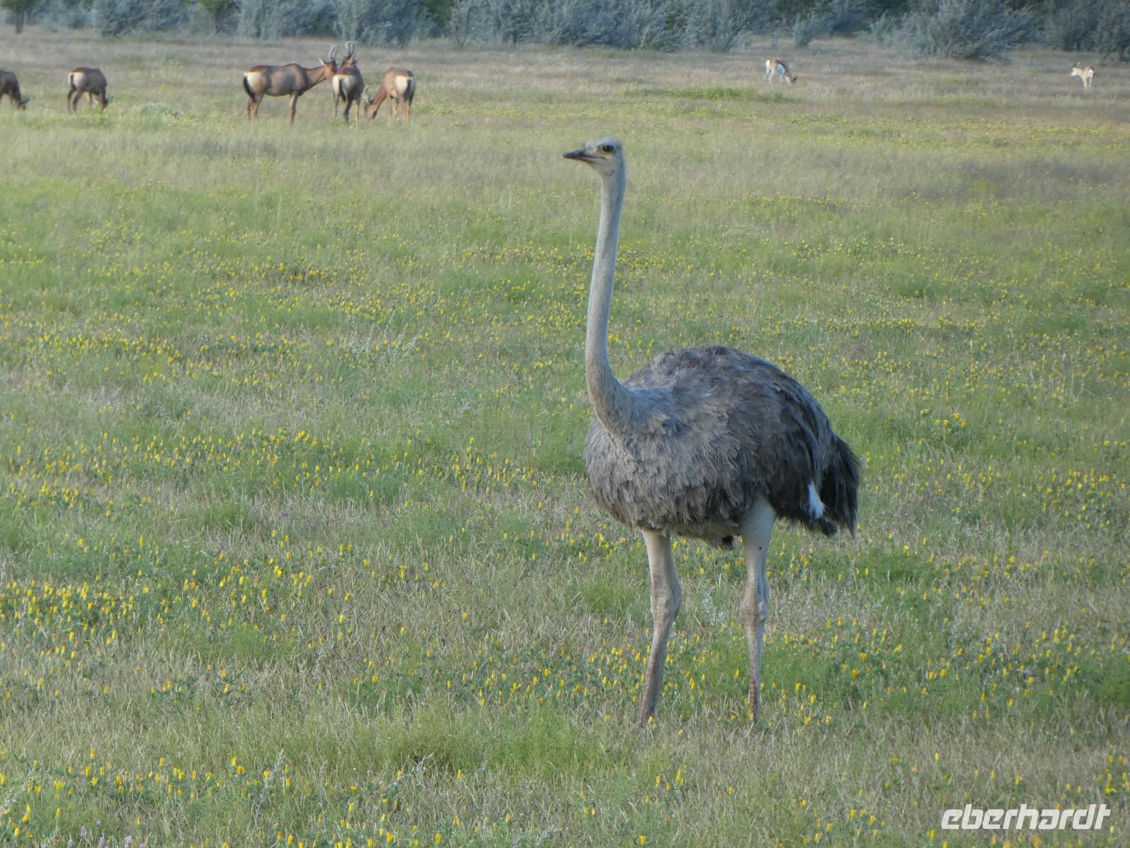 Nach dem Frühstück verliessen wir diesen paradiesischen Ort und fuhren weiter nordwärts. Die Gedanken schwirrten um das Datum 1. Mai und viele Erinnerungen kamen auf. Unser Bus musste tanken und wir besuchten derweil einen Supermarkt. Auf der Weiterfahrt kamen wir durch Kalkfeld, was heute fast verlassen ist, weil der Kalkabbau eingestellt wurde. Unterwegs gab es reichlich Termitenhügel und an einem stiegen wir aus und erhielten ausführliche Erläuterungen von Barbara. Unsere Mittagspause machten wir in Outjo in einem Gartenlokal und unser Mittagspicknick verzehrten wir auf der Weiterfahrt im Bus, denn wir wollten keine Zeit verlieren und noch Tiere sehen. Kurz nach 14 Uhr erreichten wir das Anderson Tor und fuhren mit unserem Truck hinein in den Etoscha Nationalpark. Barbara hatte einen guten Blick für die Tiere und so bekamen wir Empalas, Giraffe, Elefanten, Strausse, Paradieskranich, Sekretärvogel, Riesentrappe, Springböcke und Oryx zu sehen. In einem Camp mitten im Park machten wir eine Pause und gingen zu Fuss zu einem Wasserloch. Im zweiten Teil unserer "Pirschfahrt" sahen wir nochmals einen Elefanten und ein Nashorn. Wir nutzten die Zeit bis zur Parkschliessung und waren ganz glücklich, schon so viele Tiere gesehen zu haben. Etwas südlich des Parkes lag unsere Toshara Lodge und dort zogen wir für 2 Nächte ein. Die Bungalows waren in einem grossen Gelände verstreut und die gesamte Anlage sehr gepflegt und wunderschön bepflanzt. Zum Abendessen war es schon dunkel und so musste der Rundgang durch das Gelände der Lodge auf den nächsten Tag verschoben werden.