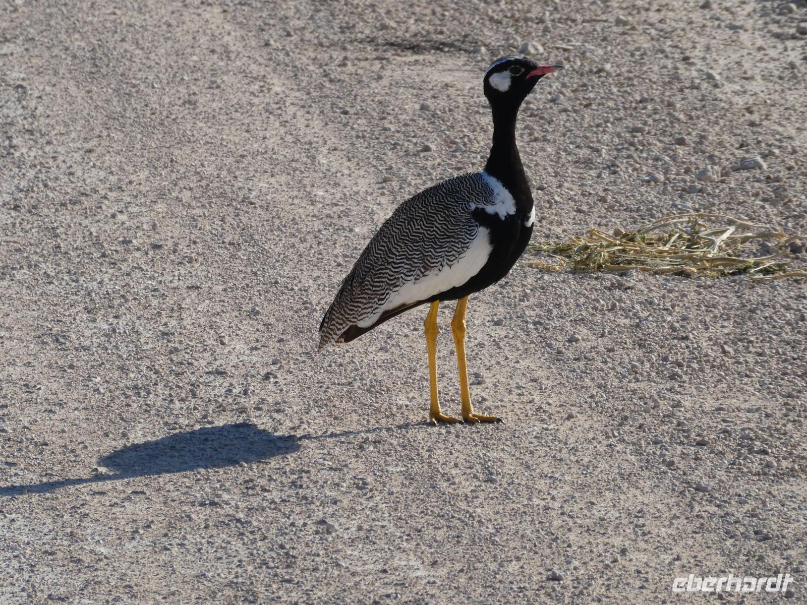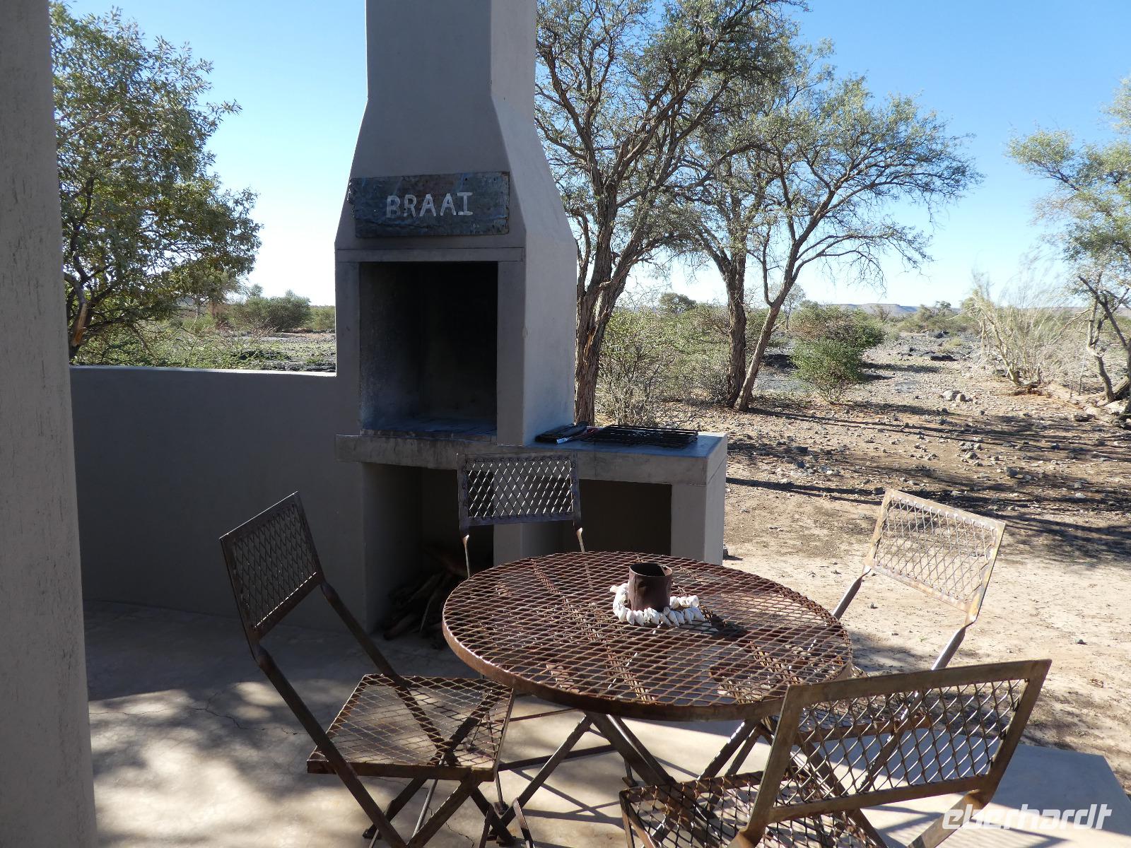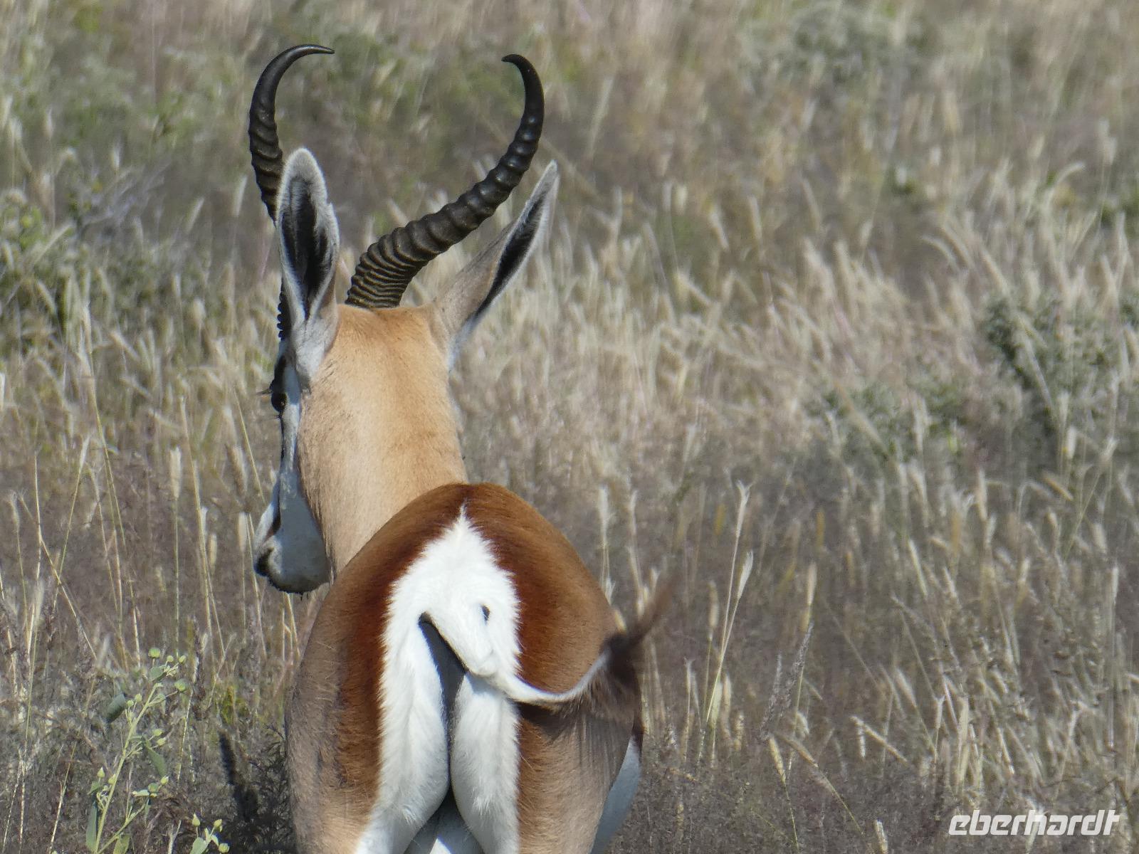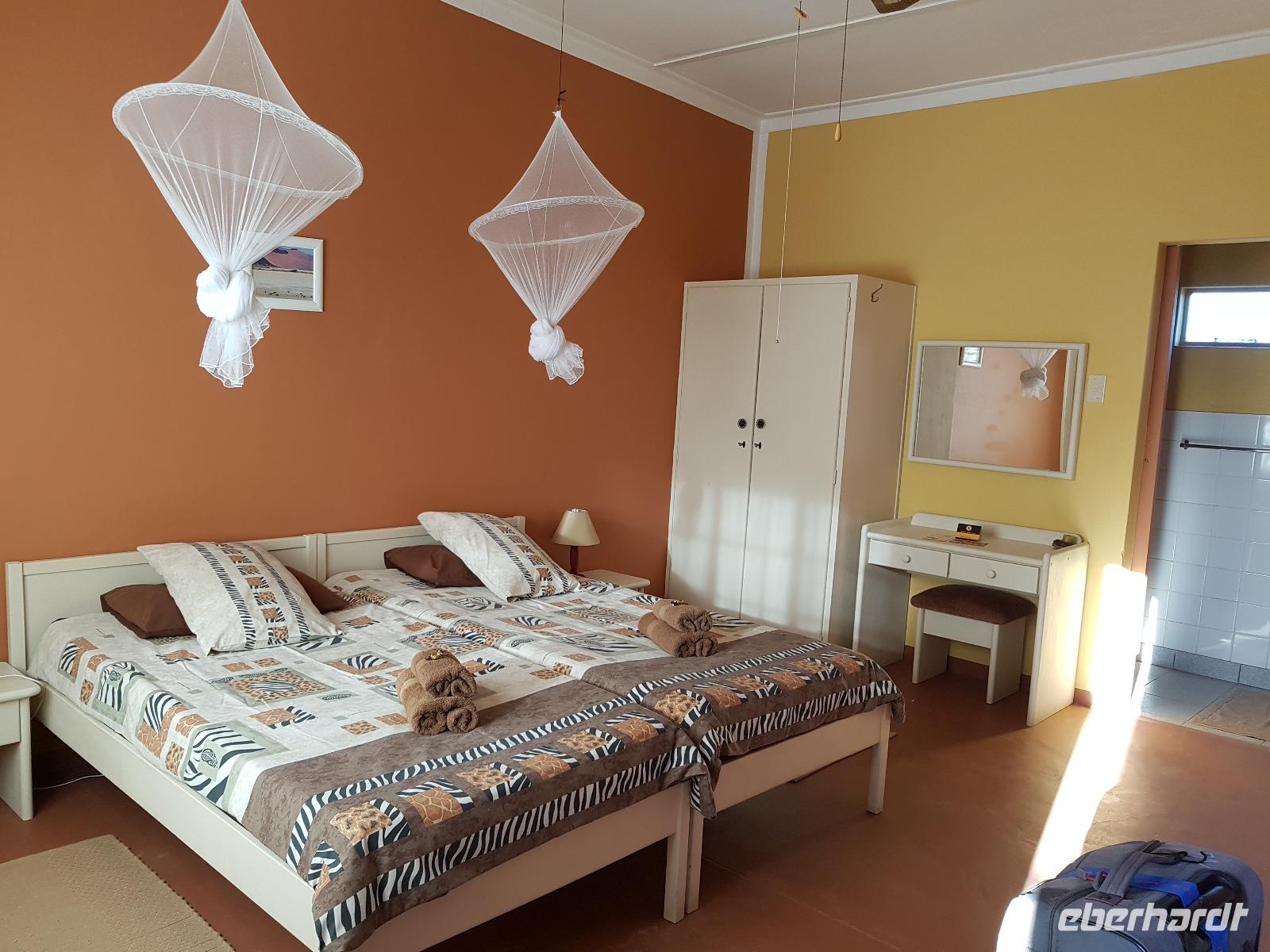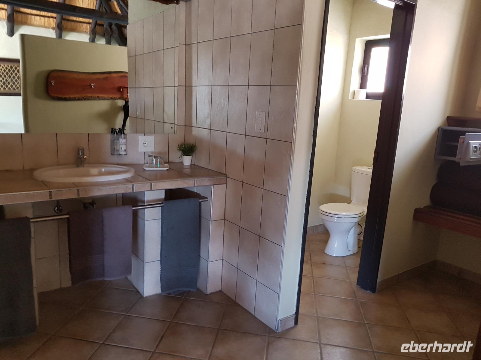 Nach dem Frühstück verliessen wir diesen paradiesischen Ort und fuhren weiter nordwärts. Die Gedanken schwirrten um das Datum 1. Mai und viele Erinnerungen kamen auf. Unser Bus musste tanken und wir besuchten derweil einen Supermarkt. Auf der Weiterfahrt kamen wir durch Kalkfeld, was heute fast verlassen ist, weil der Kalkabbau eingestellt wurde. Unterwegs gab es reichlich Termitenhügel und an einem stiegen wir aus und erhielten ausführliche Erläuterungen von Barbara. Unsere Mittagspause machten wir in Outjo in einem Gartenlokal und unser Mittagspicknick verzehrten wir auf der Weiterfahrt im Bus, denn wir wollten keine Zeit verlieren und noch Tiere sehen. Kurz nach 14 Uhr erreichten wir das Anderson Tor und fuhren mit unserem Truck hinein in den Etoscha Nationalpark. Barbara hatte einen guten Blick für die Tiere und so bekamen wir Empalas, Giraffe, Elefanten, Strausse, Paradieskranich, Sekretärvogel, Riesentrappe, Springböcke und Oryx zu sehen. In einem Camp mitten im Park machten wir eine Pause und gingen zu Fuss zu einem Wasserloch. Im zweiten Teil unserer "Pirschfahrt" sahen wir nochmals einen Elefanten und ein Nashorn. Wir nutzten die Zeit bis zur Parkschliessung und waren ganz glücklich, schon so viele Tiere gesehen zu haben. Etwas südlich des Parkes lag unsere Toshara Lodge und dort zogen wir für 2 Nächte ein. Die Bungalows waren in einem grossen Gelände verstreut und die gesamte Anlage sehr gepflegt und wunderschön bepflanzt. Zum Abendessen war es schon dunkel und so musste der Rundgang durch das Gelände der Lodge auf den nächsten Tag verschoben werden.