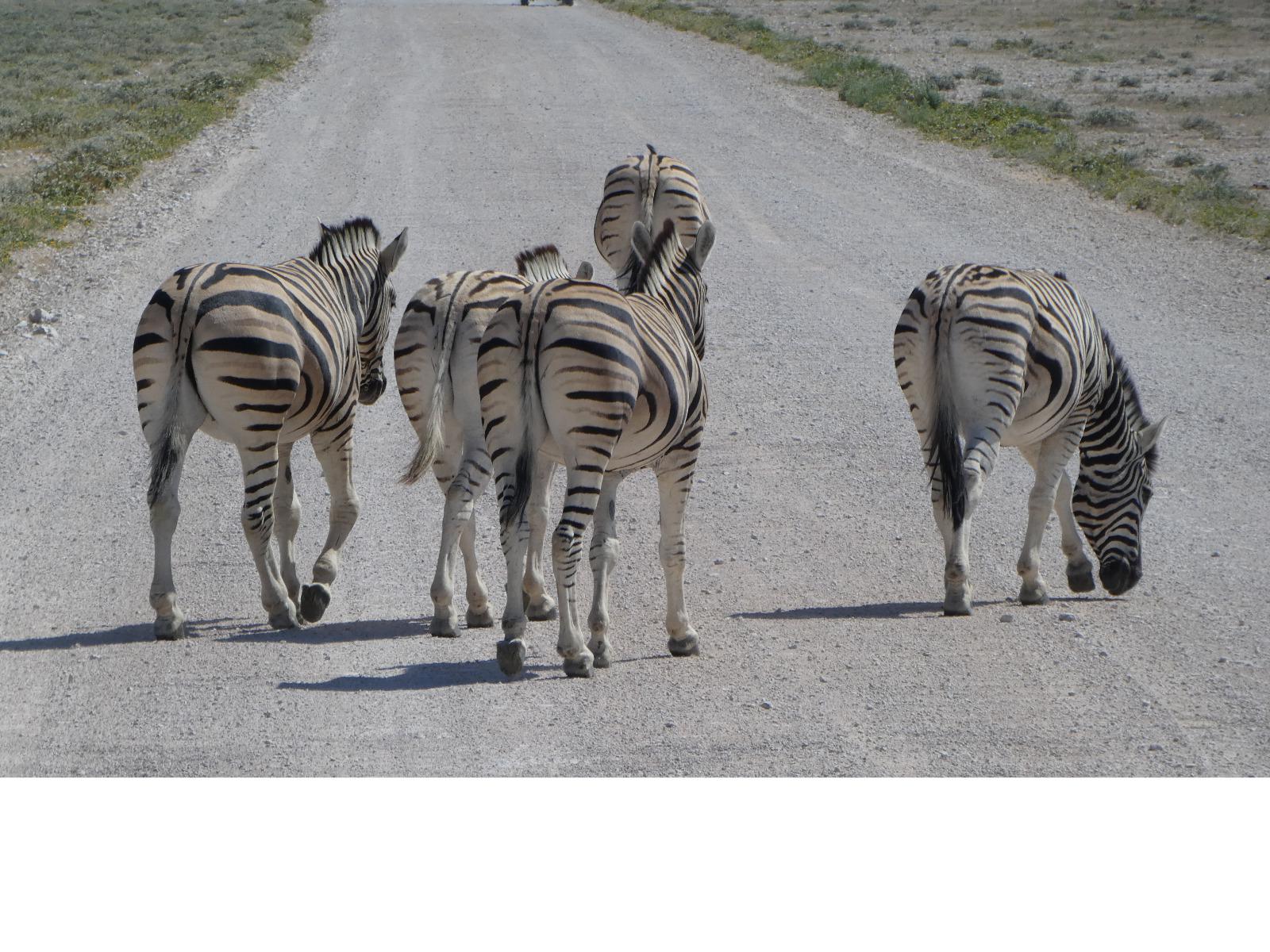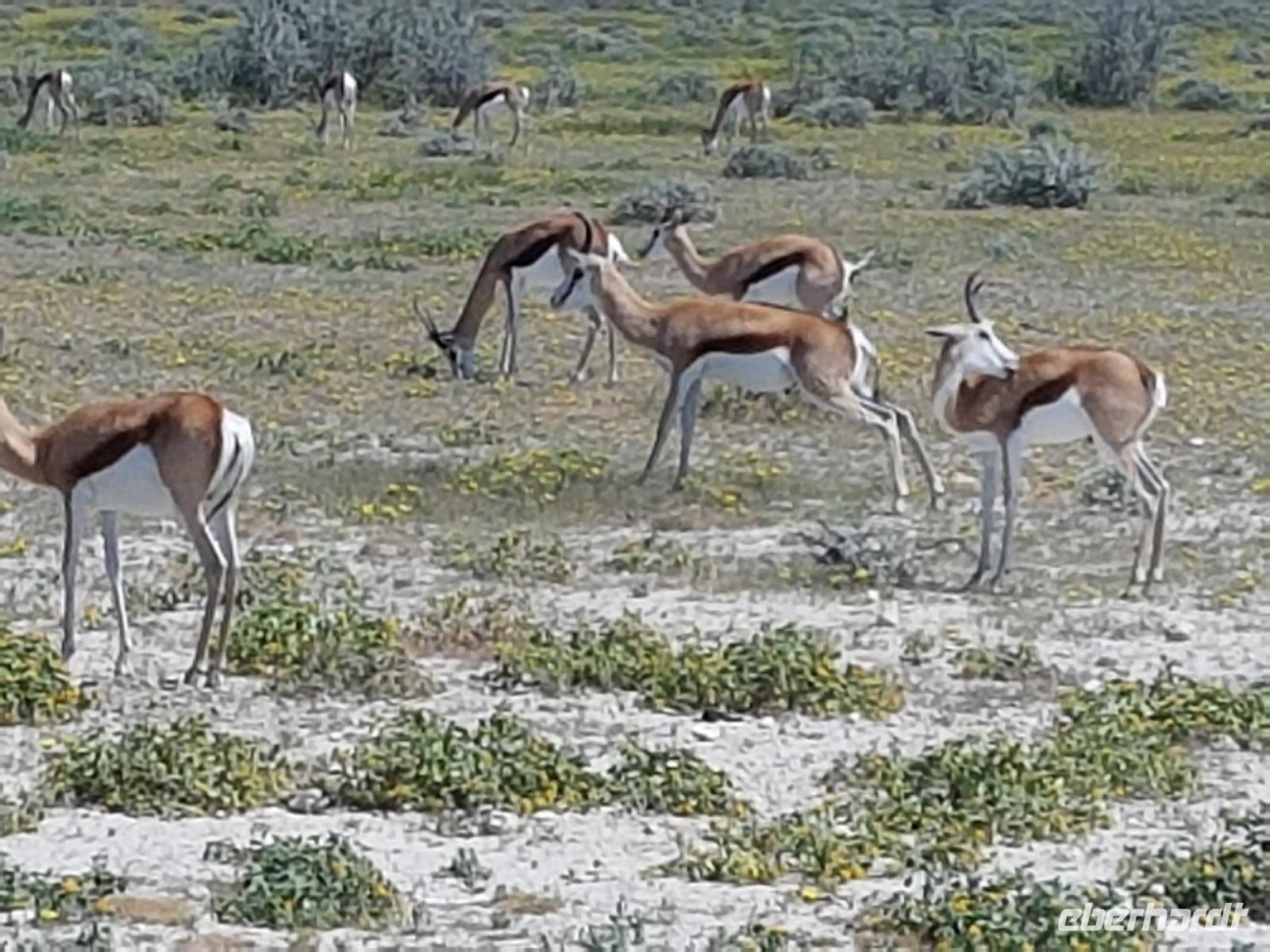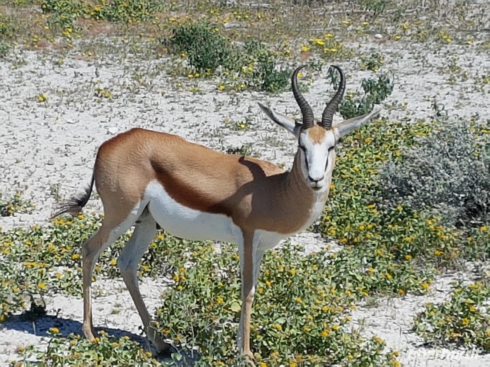 Es ging sehr früh los, denn wir wollten bei Sonnenaufgang auch gleich im Park sein. 9 Singles hatten eine Pirschfahrt im offenen Jeep gebucht und stiegen deshalb am Anderson Gate um. Alle anderen gingen im Truck mit Barbara und Vivien auf Pirschfahrt. Es waren sehr viele Fahrzeuge so früh unterwegs und die Fahrer informierten einander, wenn ein besonderes Tier gesichtet wurde. Um einen Löwen rankten sich dann einige Episoden, aber keiner hatte ihn wohl wirklich zu Gesicht bekommen. Da es die Wochen vorher geregnet hatte, war es grün im Park und die Tiere fanden genug zum Fressen und mussten deshalb zum Trinken auch nicht zwingend die Wasserlöcher aufsuchen. Dennoch sahen wir viele Strausse, grosse Herden mit Springböcken und Zebras, Kuhantilopen, einen Bananenvogel mit einem gelben Schnabel wie eine Banane und wir hielten in der Etoschapfanne und konnten hineingehen und über das weiche weisse Salz"meer" laufen . Das war etwas ganz Besonderes und bei einem Kaffee - welch ein Luxus - verriet uns der Jeepfahrer, dass er Geburtstag hatte. Wir sangen ihm ein Ständchen und er war ganz gerührt und erzählte dann von seiner Familie im Norden, die er schon seit Monaten nicht mehr gesehen hatte. Unsere Mittagspause verbrachten wir dann wieder alle gemeinsam im Camp und anschliessend fuhren wir nochmal auf Pirsch. Leider waren um diese Zeit kam Tiere zu beobachten, nur einem stattlichen Elefanten durften wir beim Fressen zuschauen. Wir verliessen den Park am Nachmittag und nutzten die Zeit bis zum Abendessen, um das Gelände unserer Lodge zu erkunden. Nach dem Abendessen bot das Personal ein lustiges Programm unter Mitwirkung der Gäste. Wir liessen den Tag dann im Garten der Lodge mit Rot- und Weisswein ausklingen und dachten schon etwas wehmütig an das Ende unserer Reise.