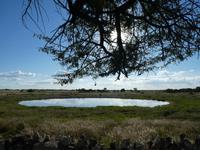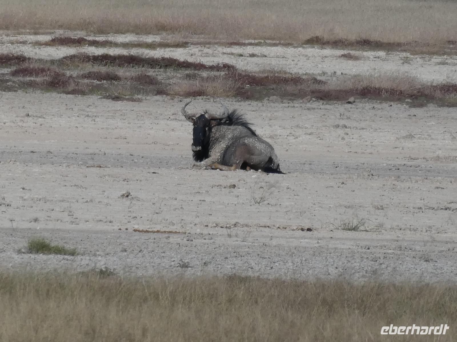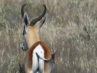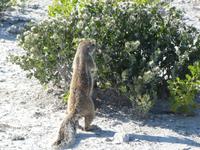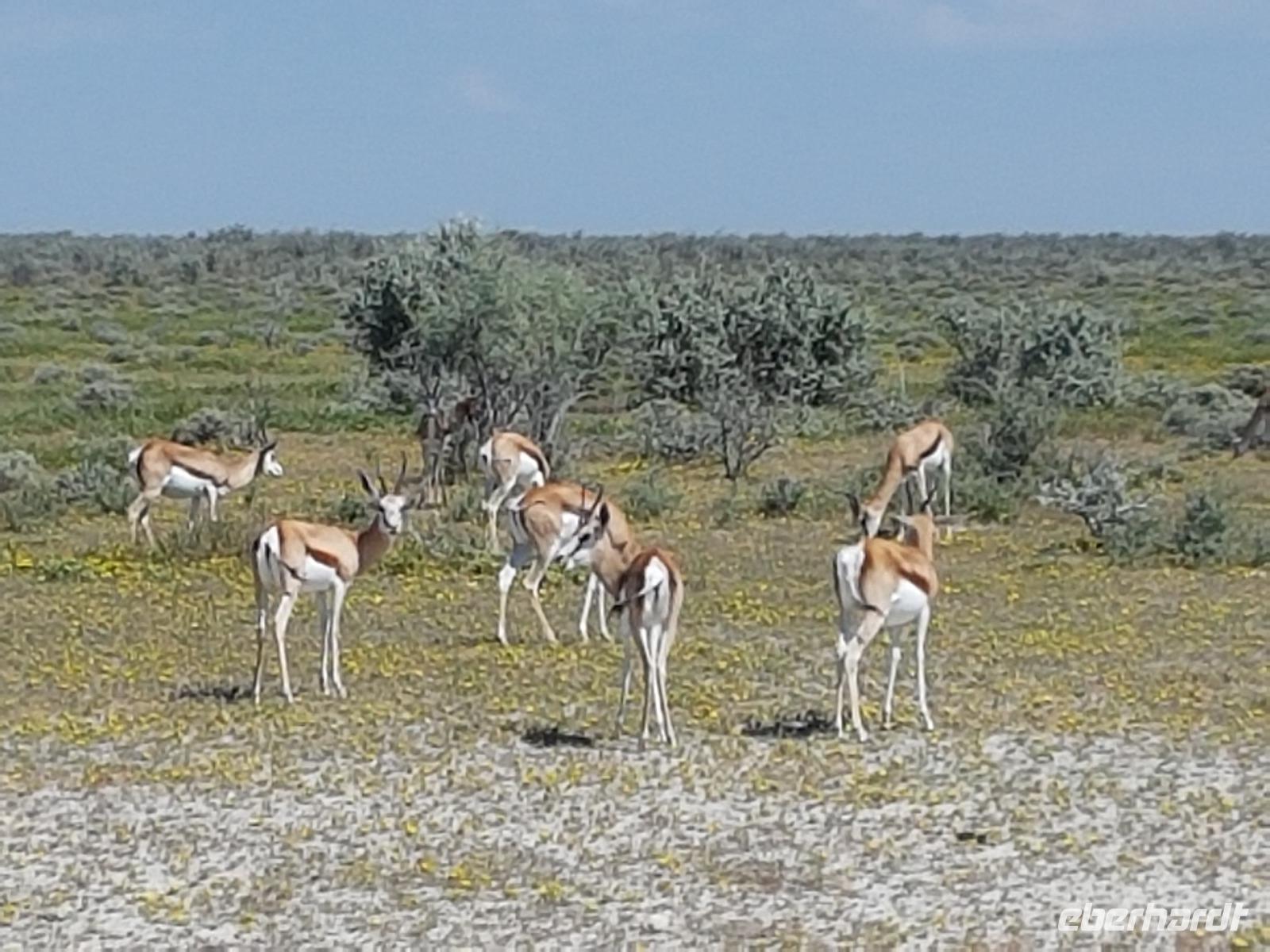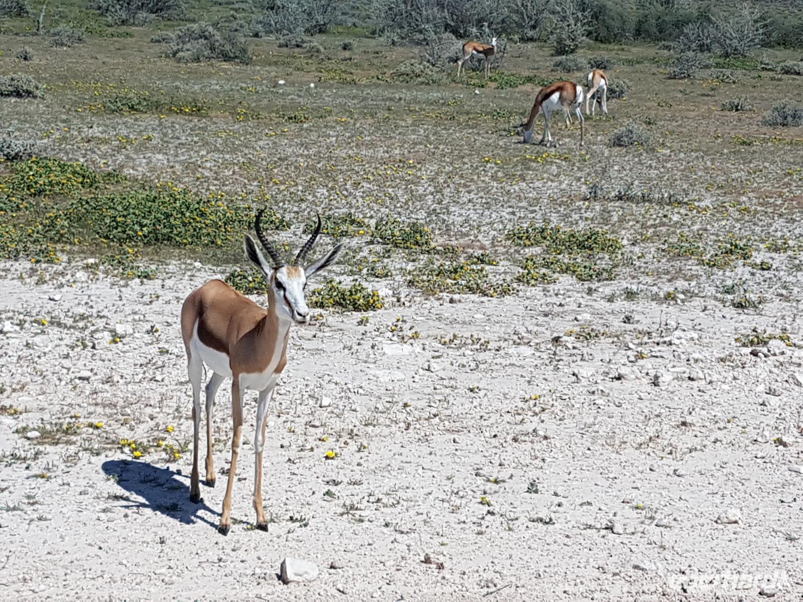 Es ging sehr früh los, denn wir wollten bei Sonnenaufgang auch gleich im Park sein. 9 Singles hatten eine Pirschfahrt im offenen Jeep gebucht und stiegen deshalb am Anderson Gate um. Alle anderen gingen im Truck mit Barbara und Vivien auf Pirschfahrt. Es waren sehr viele Fahrzeuge so früh unterwegs und die Fahrer informierten einander, wenn ein besonderes Tier gesichtet wurde. Um einen Löwen rankten sich dann einige Episoden, aber keiner hatte ihn wohl wirklich zu Gesicht bekommen. Da es die Wochen vorher geregnet hatte, war es grün im Park und die Tiere fanden genug zum Fressen und mussten deshalb zum Trinken auch nicht zwingend die Wasserlöcher aufsuchen. Dennoch sahen wir viele Strausse, grosse Herden mit Springböcken und Zebras, Kuhantilopen, einen Bananenvogel mit einem gelben Schnabel wie eine Banane und wir hielten in der Etoschapfanne und konnten hineingehen und über das weiche weisse Salz"meer" laufen . Das war etwas ganz Besonderes und bei einem Kaffee - welch ein Luxus - verriet uns der Jeepfahrer, dass er Geburtstag hatte. Wir sangen ihm ein Ständchen und er war ganz gerührt und erzählte dann von seiner Familie im Norden, die er schon seit Monaten nicht mehr gesehen hatte. Unsere Mittagspause verbrachten wir dann wieder alle gemeinsam im Camp und anschliessend fuhren wir nochmal auf Pirsch. Leider waren um diese Zeit kam Tiere zu beobachten, nur einem stattlichen Elefanten durften wir beim Fressen zuschauen. Wir verliessen den Park am Nachmittag und nutzten die Zeit bis zum Abendessen, um das Gelände unserer Lodge zu erkunden. Nach dem Abendessen bot das Personal ein lustiges Programm unter Mitwirkung der Gäste. Wir liessen den Tag dann im Garten der Lodge mit Rot- und Weisswein ausklingen und dachten schon etwas wehmütig an das Ende unserer Reise.