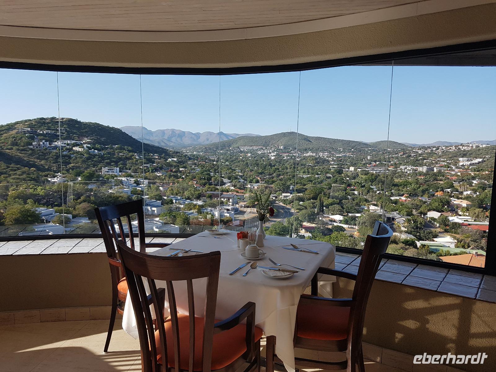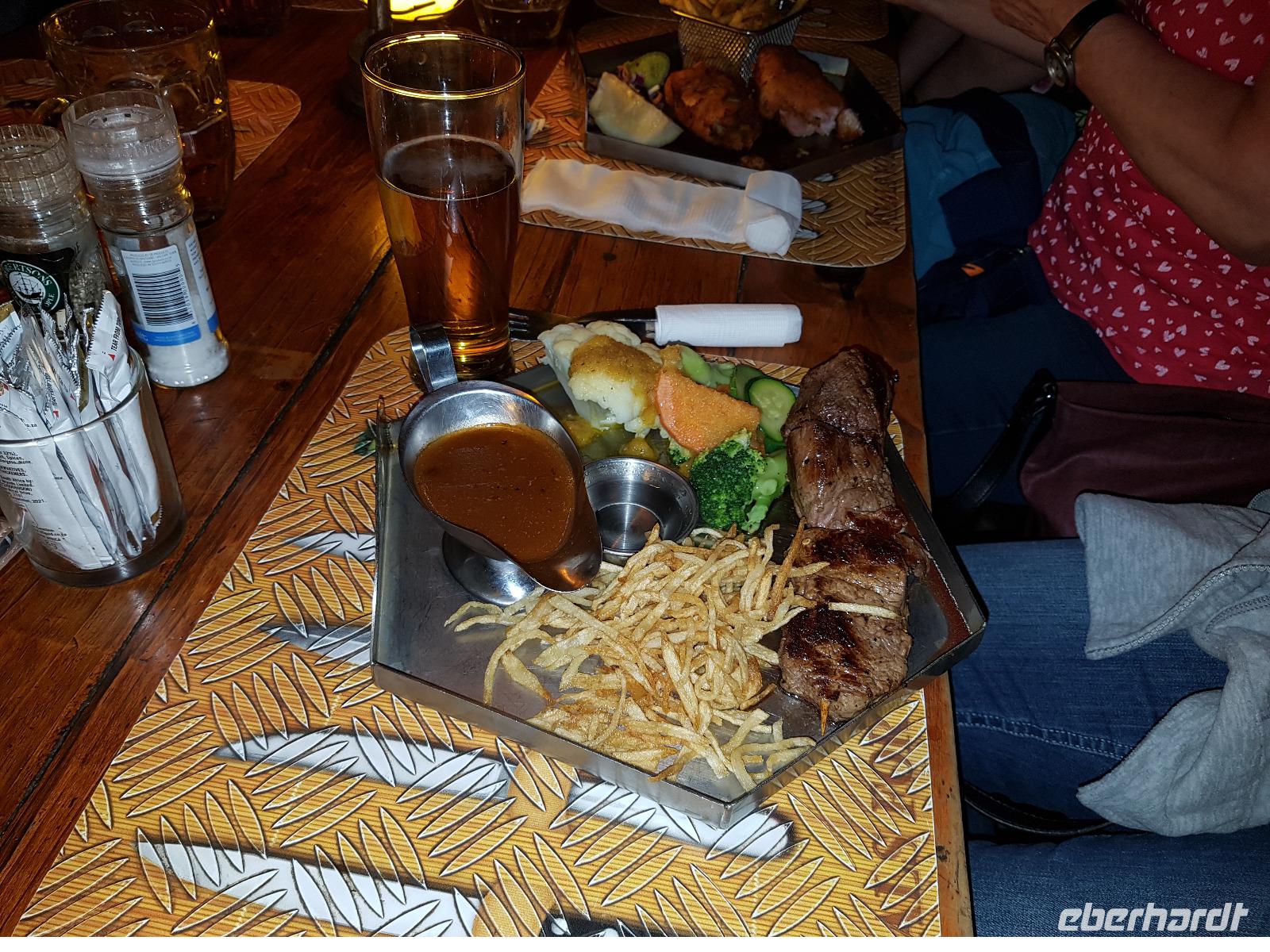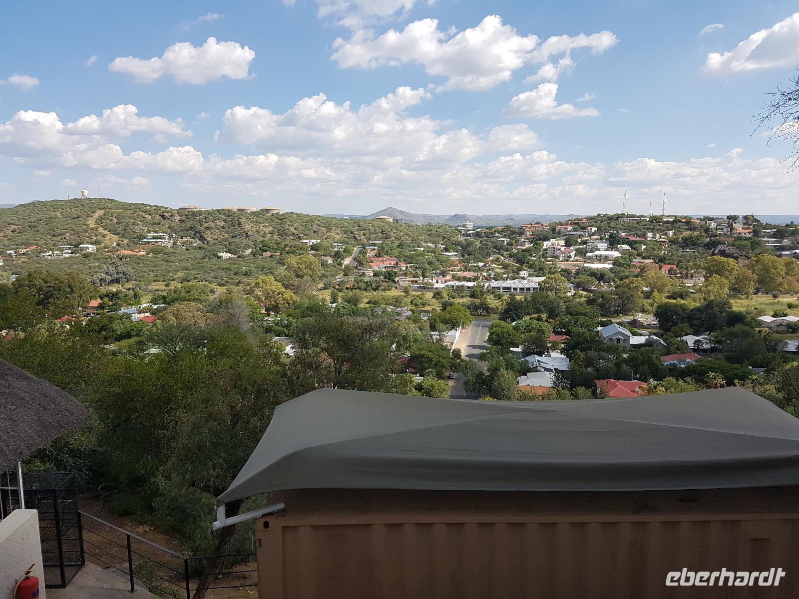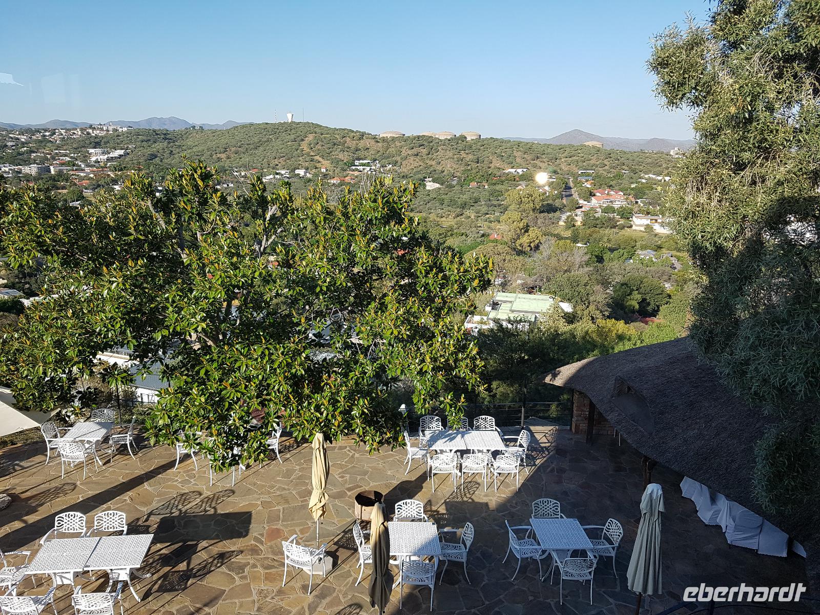 Heute stand eine 400 km Fahrt gen Süden auf dem Programm und dazu kam eine Strassensperrung wegen einer Sprengung. So beeilten wir uns in unseren Pausen und blieben nur über Mittag in Okahandje etwas länger. Dort gab es ein schönes Cafe und den Markt mit typischen Schnitzereien. Jeder nutzte die Pause nach seinem Geschmack und bevor wir weiter fuhren, bedankten wir uns bei Barbara und Vivien für die tolle Betreuung und die unvergesslichen Tage in Namibia. Nach Windhoek fuhren wir auf einer breiten Autobahn ähnlichen Strasse und erreichten unser Hotel Thule gegen 14 Uhr. Bis dahin waren wir in unserem Truck 4158 km gefahren und vor allem Vivien hatte eine grandiose Leistung vollbracht. Viele km waren Sandpisten, die ihm alles abverlangten. Zum Abendessen holte er uns wieder ab und wir verbrachten unseren letzten gemeinsamen Abend in Joes Bierhouse. Das urige Lokal war ein Erlebnis und die Portionen recht gross. Barbara traf endlich mal ihren Mann Fritz wieder, der auch als Guide arbeitet und mit einer Gruppe dort zum Abgesessen war. Wieder zurück im Hotel Thule trafen wir uns auf der Terrasse zu einem Drink und erfreuten uns am herrlichen Ausblick auf das Lichtermeer von Windhoek unter uns.