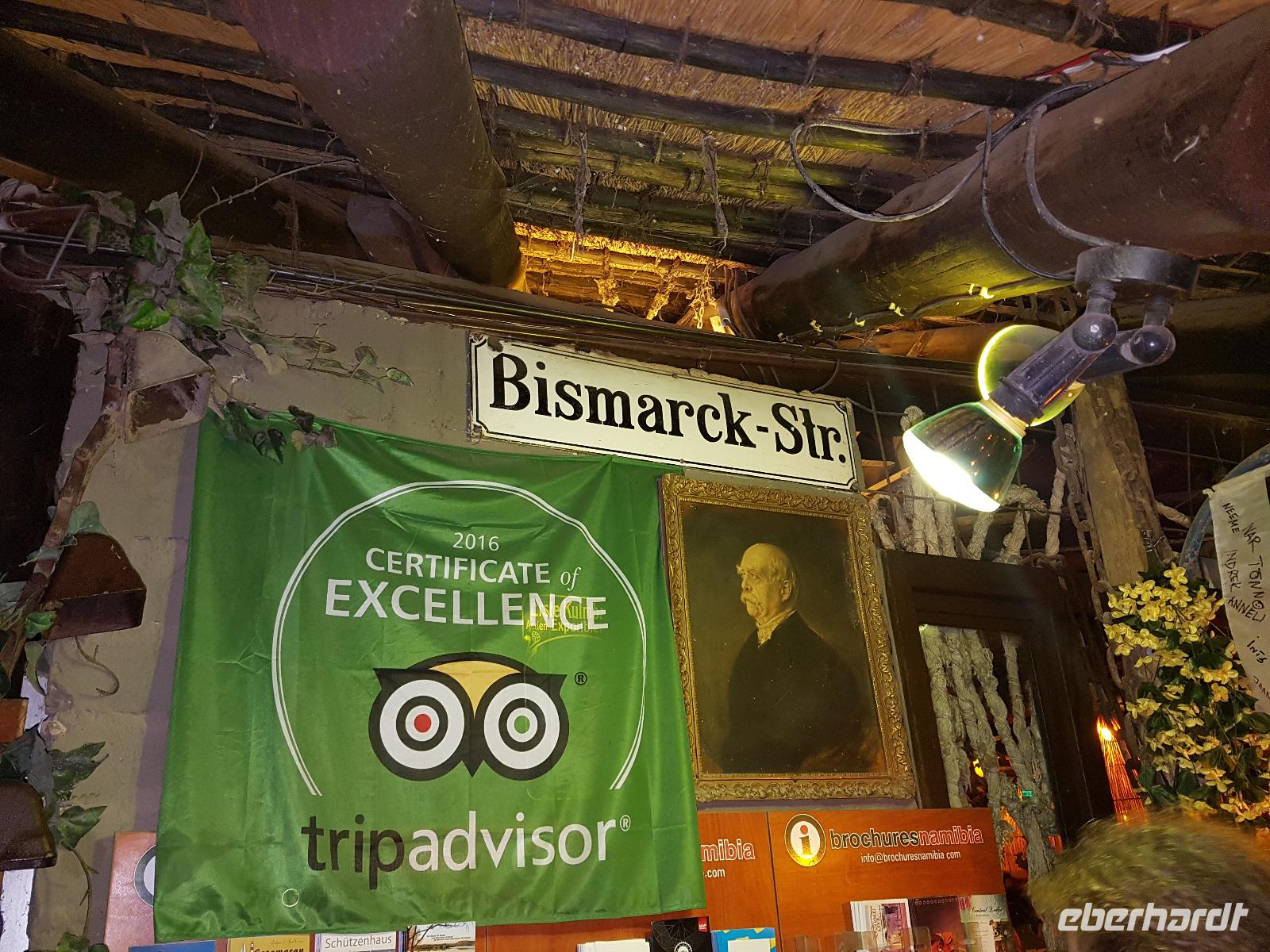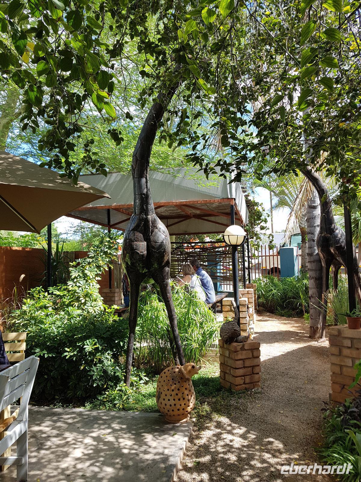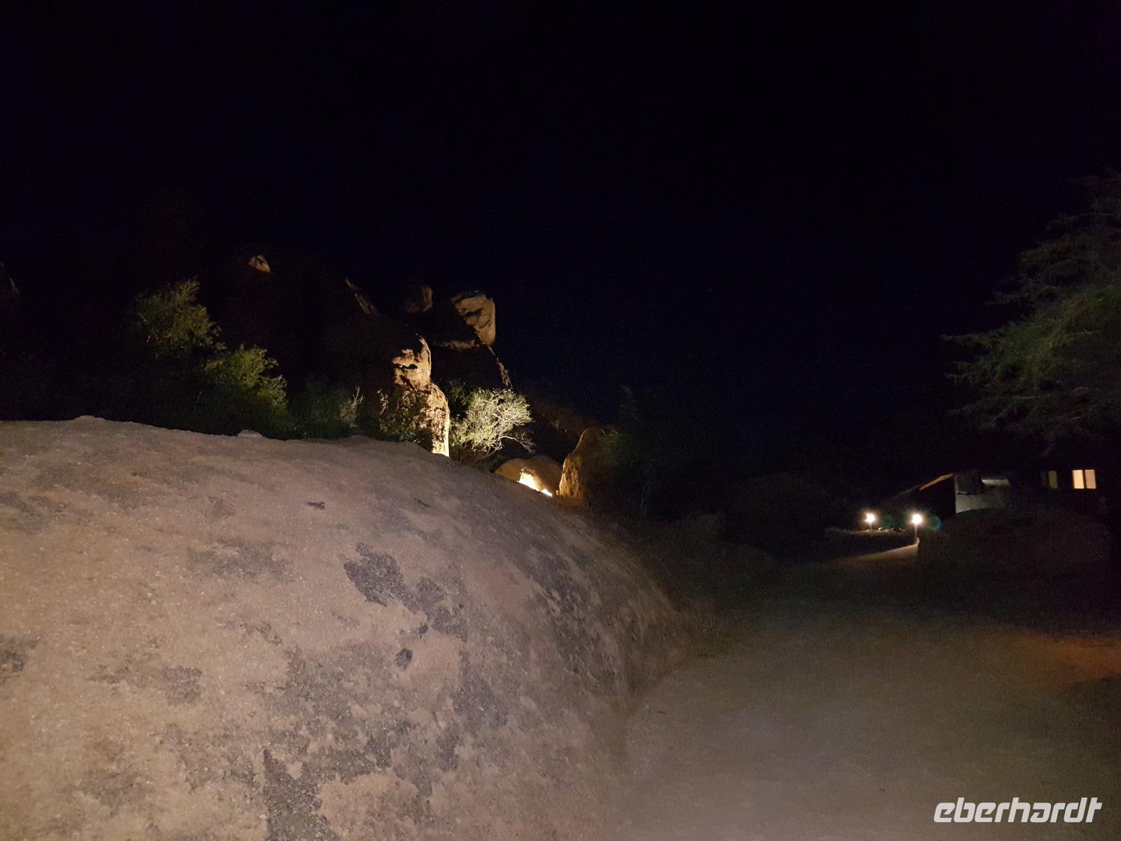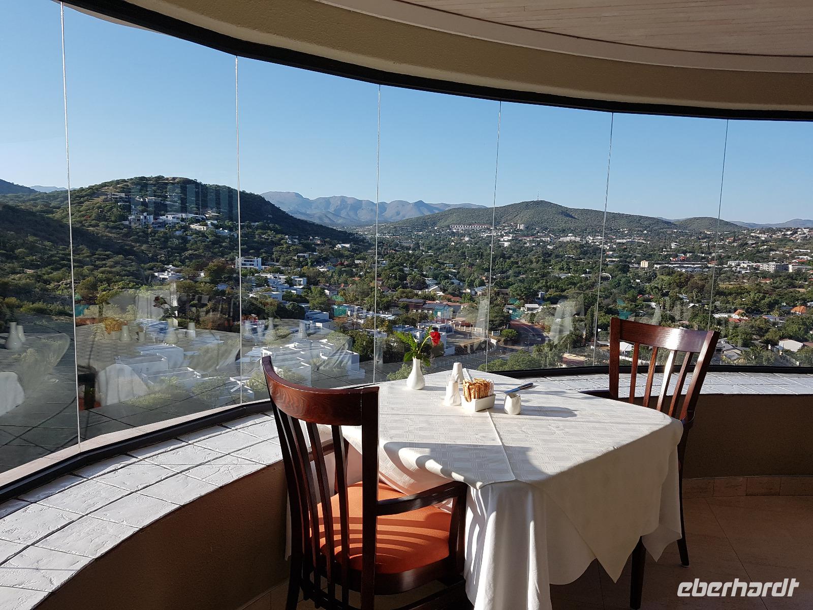 Heute stand eine 400 km Fahrt gen Süden auf dem Programm und dazu kam eine Strassensperrung wegen einer Sprengung. So beeilten wir uns in unseren Pausen und blieben nur über Mittag in Okahandje etwas länger. Dort gab es ein schönes Cafe und den Markt mit typischen Schnitzereien. Jeder nutzte die Pause nach seinem Geschmack und bevor wir weiter fuhren, bedankten wir uns bei Barbara und Vivien für die tolle Betreuung und die unvergesslichen Tage in Namibia. Nach Windhoek fuhren wir auf einer breiten Autobahn ähnlichen Strasse und erreichten unser Hotel Thule gegen 14 Uhr. Bis dahin waren wir in unserem Truck 4158 km gefahren und vor allem Vivien hatte eine grandiose Leistung vollbracht. Viele km waren Sandpisten, die ihm alles abverlangten. Zum Abendessen holte er uns wieder ab und wir verbrachten unseren letzten gemeinsamen Abend in Joes Bierhouse. Das urige Lokal war ein Erlebnis und die Portionen recht gross. Barbara traf endlich mal ihren Mann Fritz wieder, der auch als Guide arbeitet und mit einer Gruppe dort zum Abgesessen war. Wieder zurück im Hotel Thule trafen wir uns auf der Terrasse zu einem Drink und erfreuten uns am herrlichen Ausblick auf das Lichtermeer von Windhoek unter uns.