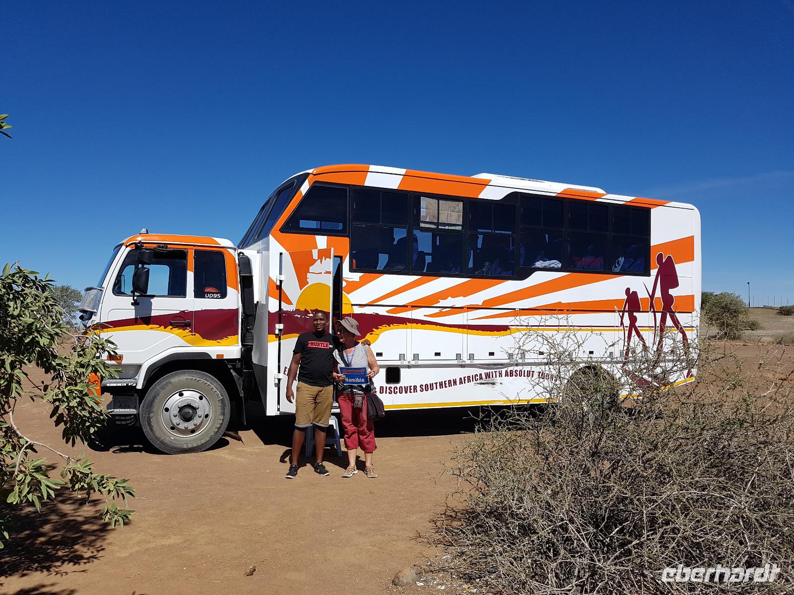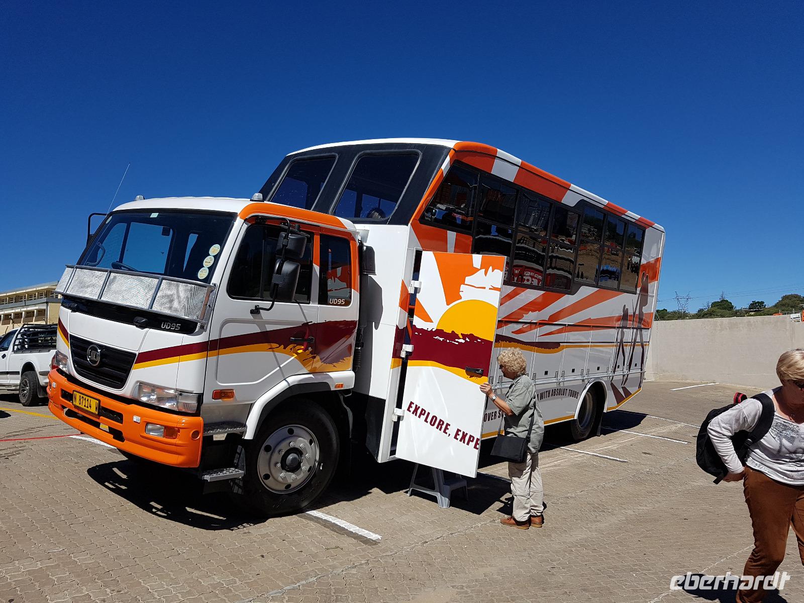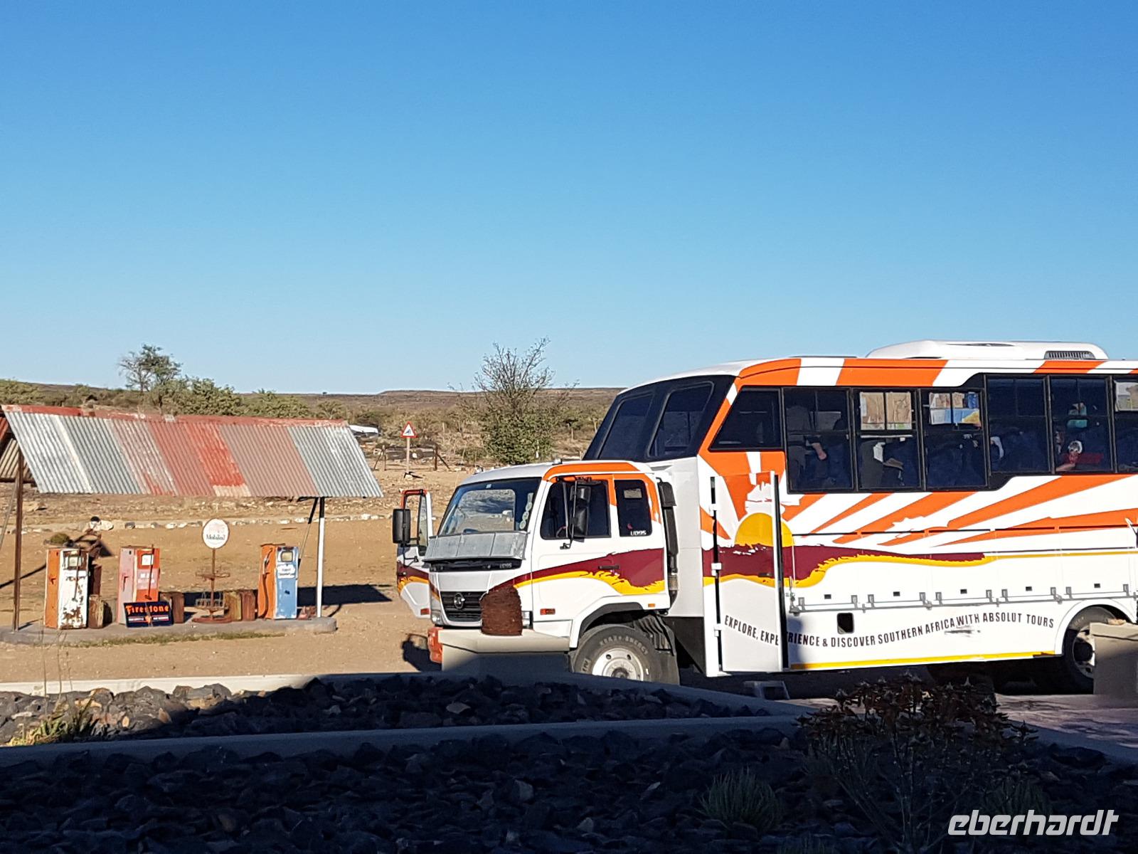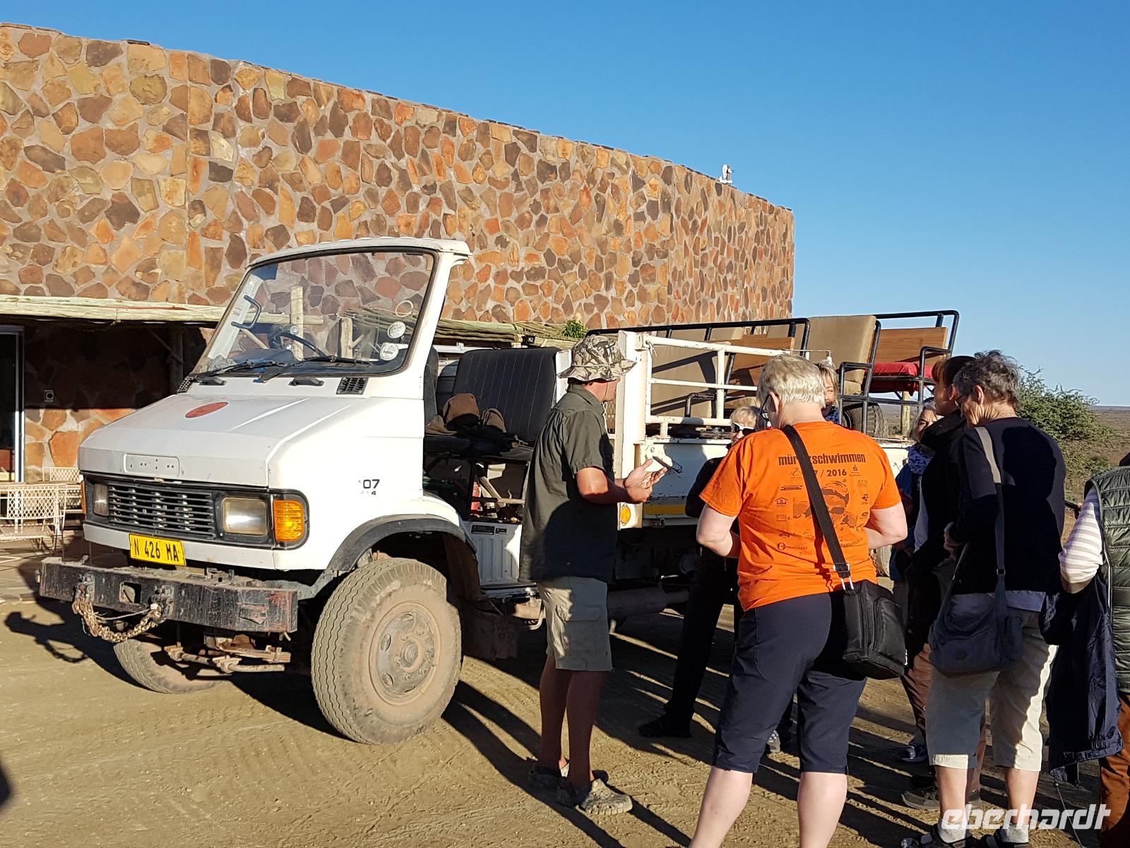 Endlich war es soweit, unsere Reise nach Namibia begann. Von Dresden, Leipzig und Berlin flogen wir mit Lufthansa nach München und von dort weiter am späten Abend mit South African Airways über Nacht nach Johannesburg. Dort trafen wir am Morgen ein, passierten die Pass- und Sicherheitskontrolle und flogen dann noch einmal reichlich 2 Stunden nach Windhoek in Namibias Hauptstadt. Bereits im Flugzeug hatten wir die Einreisekarten ausgefüllt und trotzdem brauchte es einige Geduld an der Passkontrolle. Dann endlich nahmen wir unsere Koffer und draussen erwartete uns Barbara. Sie wird uns auf der gesamten Reise begleiten. Noch Geld umtauschen und dann endlich waren wir in der Sonne Afrikas und gingen zu unserem Truck. Er wurde unser "zu Hause" auf den Asphalt- und Sandpisten in den nächsten 14 Tagen. Unsere Koffer wurden in grosse Fächer verladen und wir nahmen hoch oben Platz. Nun ging es richtig los. Vivien, unser Fahrer stellte eine kleine Fussbank auf, damit die unterste Stufe besser zu erreichen war. Zunächst fuhren wir hinein nach Windhoek, um noch einiges einzukaufen und dann ging es immer gen Süden bis nach Mariental. Bei Sonnenuntergang endlich erreichten wir die Napa Lange Lodge, bezogen unsere Bungalows und gingen zum Essen. Wir waren überwältigt vom tollen Buffet am Abend und freuten uns danach nur noch auf unsere Betten nach der langen Anreise. Für Tierbeobachtungen am Wasserloch waren wir zu müde.