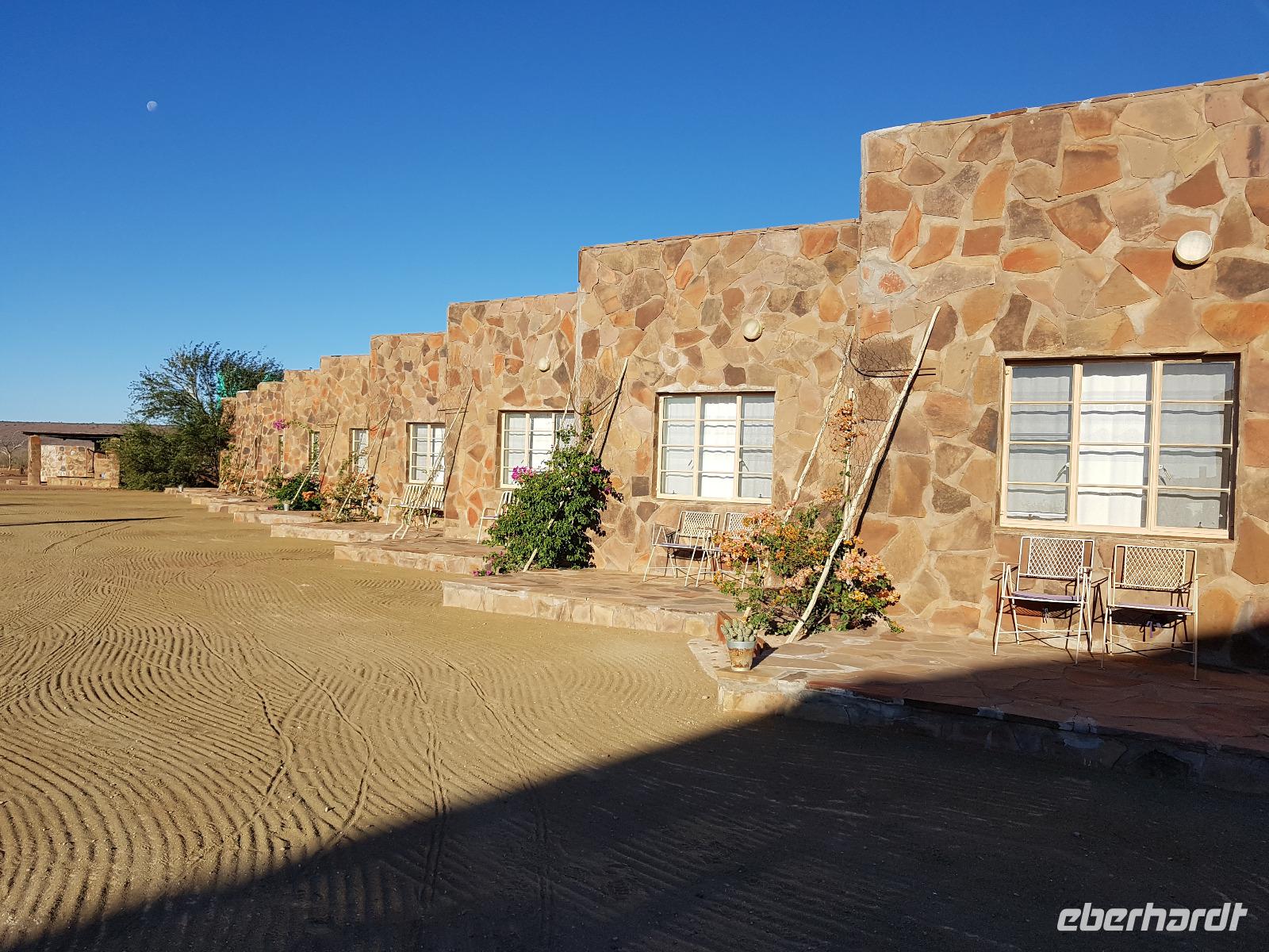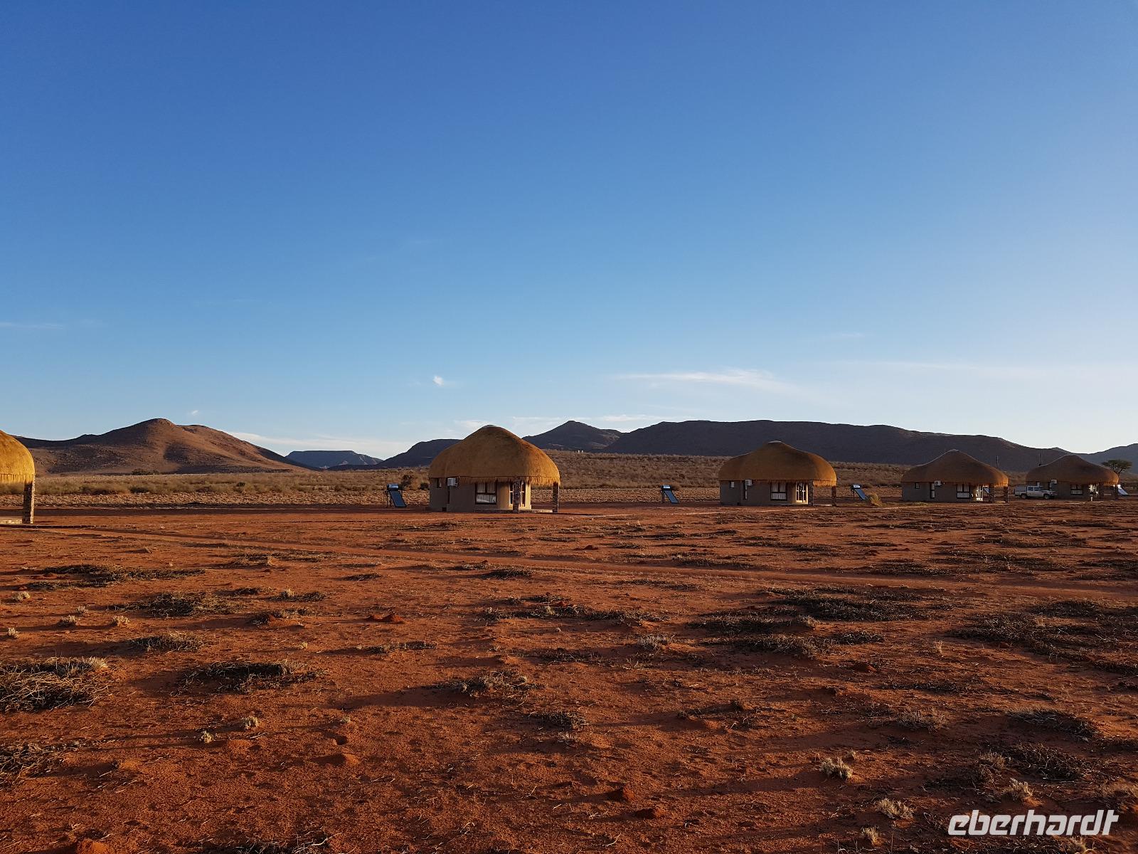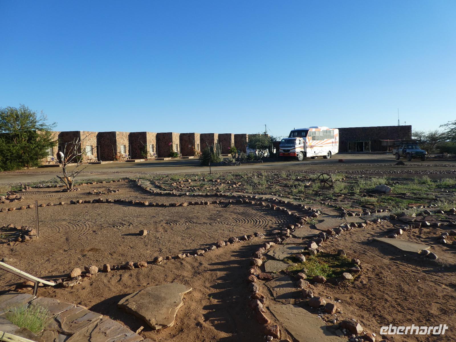 Endlich war es soweit, unsere Reise nach Namibia begann. Von Dresden, Leipzig und Berlin flogen wir mit Lufthansa nach München und von dort weiter am späten Abend mit South African Airways über Nacht nach Johannesburg. Dort trafen wir am Morgen ein, passierten die Pass- und Sicherheitskontrolle und flogen dann noch einmal reichlich 2 Stunden nach Windhoek in Namibias Hauptstadt. Bereits im Flugzeug hatten wir die Einreisekarten ausgefüllt und trotzdem brauchte es einige Geduld an der Passkontrolle. Dann endlich nahmen wir unsere Koffer und draussen erwartete uns Barbara. Sie wird uns auf der gesamten Reise begleiten. Noch Geld umtauschen und dann endlich waren wir in der Sonne Afrikas und gingen zu unserem Truck. Er wurde unser "zu Hause" auf den Asphalt- und Sandpisten in den nächsten 14 Tagen. Unsere Koffer wurden in grosse Fächer verladen und wir nahmen hoch oben Platz. Nun ging es richtig los. Vivien, unser Fahrer stellte eine kleine Fussbank auf, damit die unterste Stufe besser zu erreichen war. Zunächst fuhren wir hinein nach Windhoek, um noch einiges einzukaufen und dann ging es immer gen Süden bis nach Mariental. Bei Sonnenuntergang endlich erreichten wir die Napa Lange Lodge, bezogen unsere Bungalows und gingen zum Essen. Wir waren überwältigt vom tollen Buffet am Abend und freuten uns danach nur noch auf unsere Betten nach der langen Anreise. Für Tierbeobachtungen am Wasserloch waren wir zu müde.