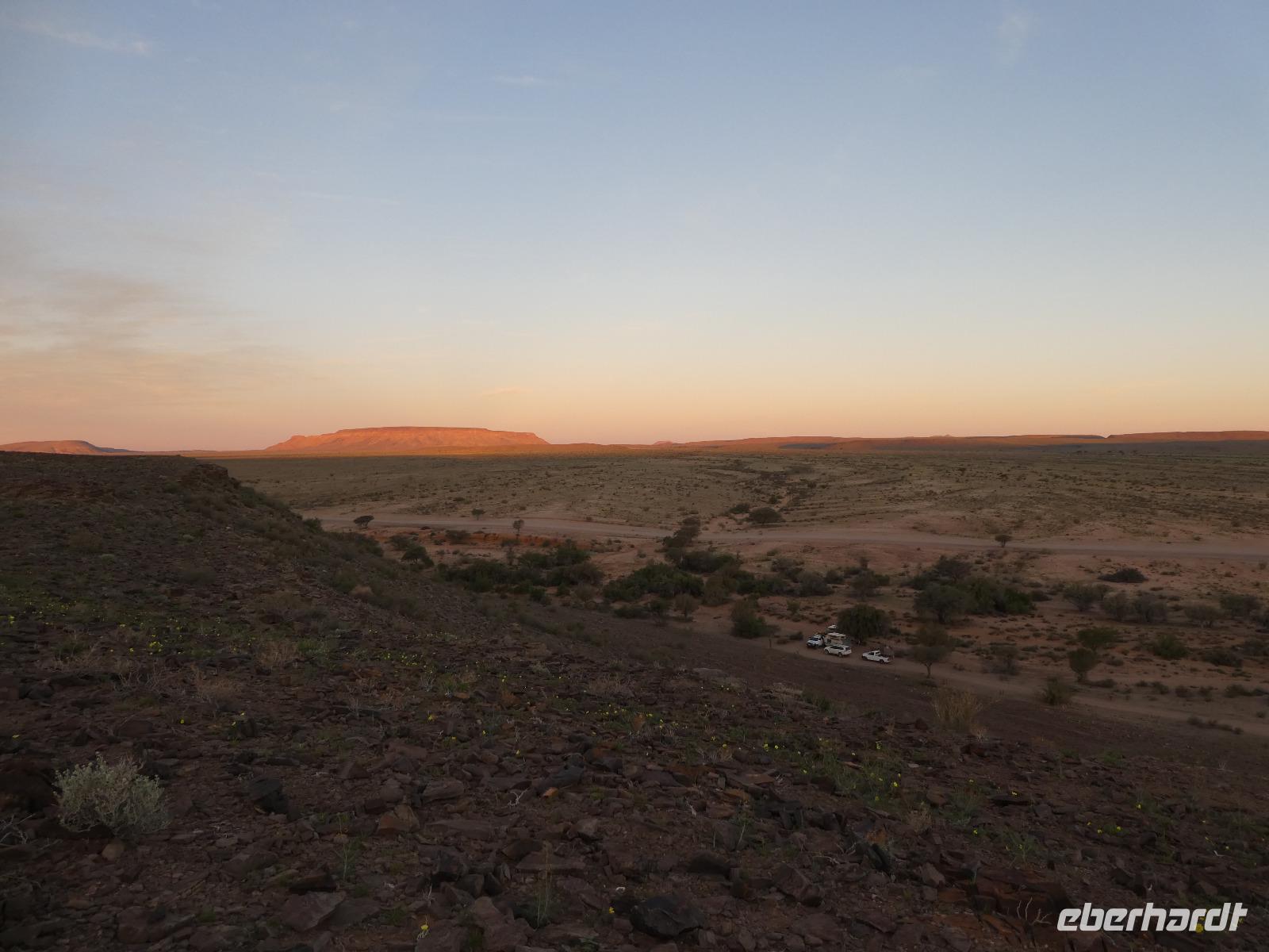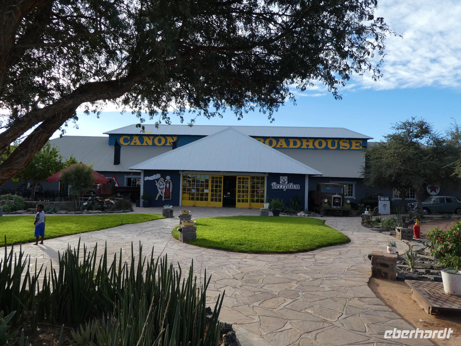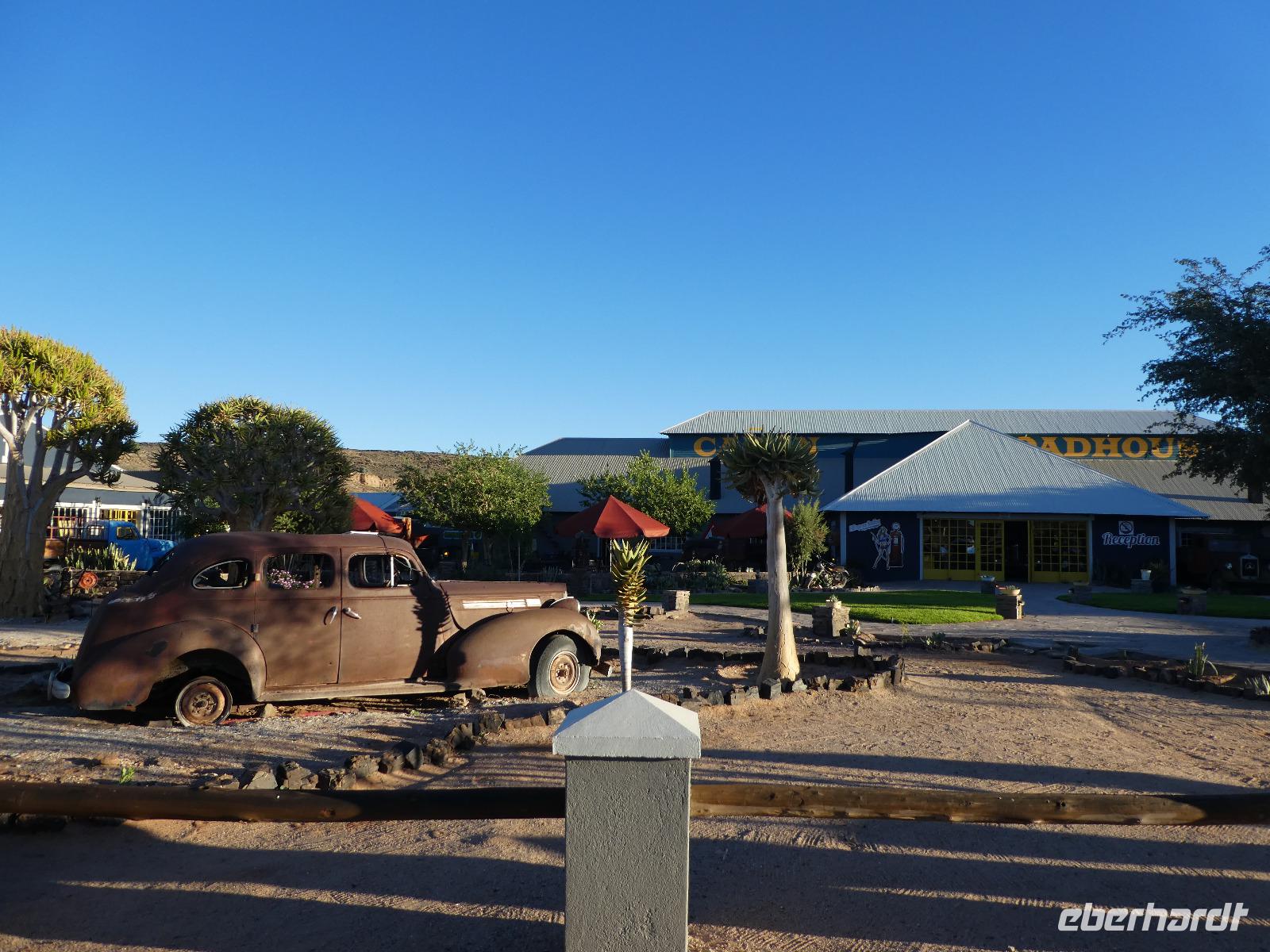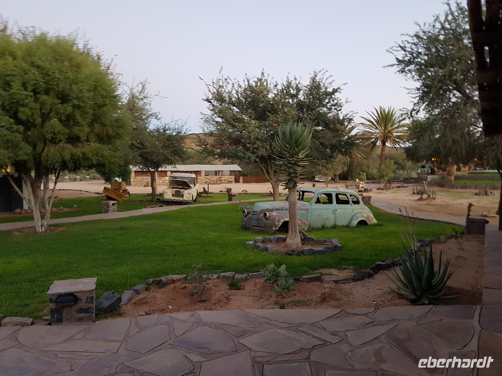 Gut ausgeruht und nach einem fantastischen Frühstück auf der Terrasse starteten wir unsere Tour. Um unsere Koffer brauchten wir uns nie kümmern. Sie wurden vom Truck in unsere Zimmer gebracht und am nächsten Morgen von fleissigen Helfern auch dort wieder abgeholt. Auf unserer langen Fahrt gab uns Barbara viele Informationen zum Land und berichtete immer wieder von ihrem spannendem Leben in Namibia. Sie lebte nun fast 20 Jahre hier und hatte somit viel zu erzählen. Aber auch die Flora Namibia kannte sie und so blieb kein Blümchen unerwähnt. Durch den Regen der vergangenen Wochen war es außergewöhnlich grün und sehr viele Pflanzen erweckten zum Leben. Bei den Köcherbäumen machten wir einen schönen Spaziergang, um die Riesen aus der Nähe zu betrachten. Einige Damen sahen sogar Klippschliefer zwischen den Steinen. Sie haben Ähnlichkeit mit den Murmeltieren, haben aber den gleichen Ursprung wie die Elefanten. Ein Stück weiter, am "Spielplatz" der Riesen machten wir im Schatten unseres Trucks unser erstes Picknick und danach stellte sich jeder kurz vor. Bei 15 Singles behält man zwar nicht gleich alle Namen, aber wir hatten noch 13 Tage Zeit zum Lernen. Plötzlich wurde es grüner. Wir sahen eine Linearoase und kamen am Naute Staudamm vorbei. Am frühen Abend dann erreichten wir unsere Unterkunft im Canyon Roadhouse. Es mutete an wie ein Autofriedhof im Nichts. Aber es war eine grandiose Idee, alte Autos so zu präsentieren. Noch vor Sonnenuntergang bestiegen wir den Hausberg und von oben bot sich ein unvergessliches Bild im Licht der untergehenden Sonne. Das Abendessen nahmen wir draussen ein zwischen Traktoren, Motorrädern und Autos.