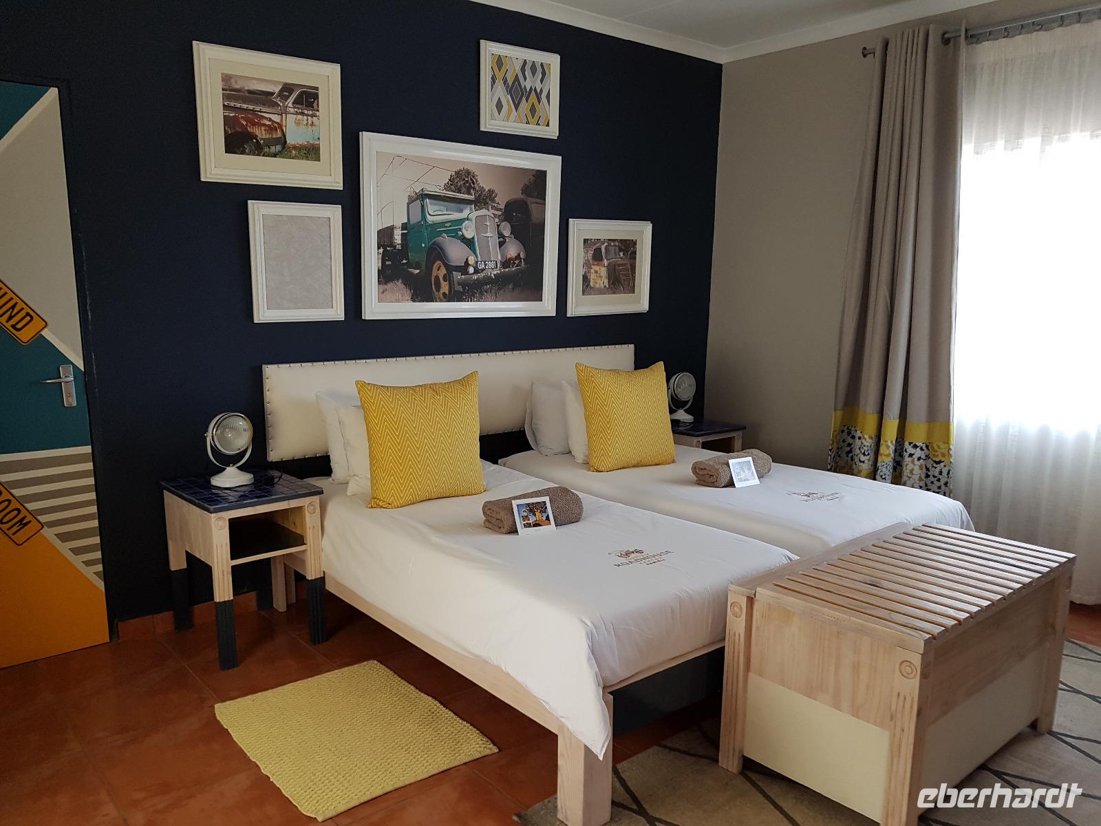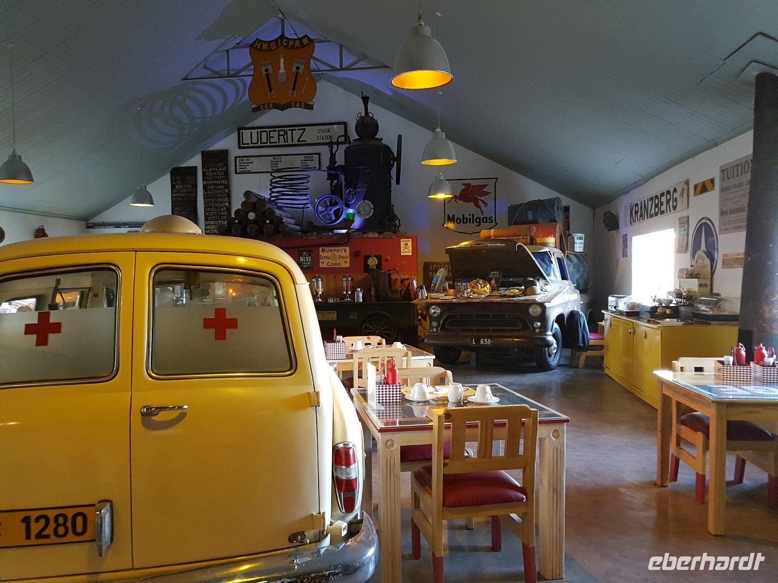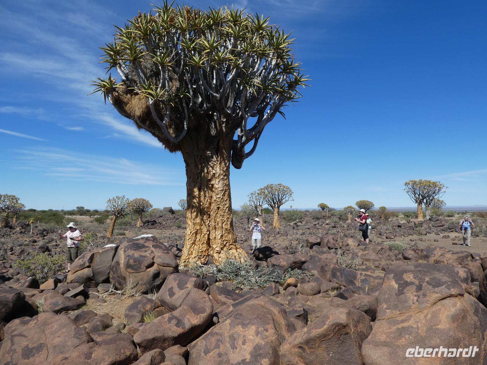 Gut ausgeruht und nach einem fantastischen Frühstück auf der Terrasse starteten wir unsere Tour. Um unsere Koffer brauchten wir uns nie kümmern. Sie wurden vom Truck in unsere Zimmer gebracht und am nächsten Morgen von fleissigen Helfern auch dort wieder abgeholt. Auf unserer langen Fahrt gab uns Barbara viele Informationen zum Land und berichtete immer wieder von ihrem spannendem Leben in Namibia. Sie lebte nun fast 20 Jahre hier und hatte somit viel zu erzählen. Aber auch die Flora Namibia kannte sie und so blieb kein Blümchen unerwähnt. Durch den Regen der vergangenen Wochen war es außergewöhnlich grün und sehr viele Pflanzen erweckten zum Leben. Bei den Köcherbäumen machten wir einen schönen Spaziergang, um die Riesen aus der Nähe zu betrachten. Einige Damen sahen sogar Klippschliefer zwischen den Steinen. Sie haben Ähnlichkeit mit den Murmeltieren, haben aber den gleichen Ursprung wie die Elefanten. Ein Stück weiter, am "Spielplatz" der Riesen machten wir im Schatten unseres Trucks unser erstes Picknick und danach stellte sich jeder kurz vor. Bei 15 Singles behält man zwar nicht gleich alle Namen, aber wir hatten noch 13 Tage Zeit zum Lernen. Plötzlich wurde es grüner. Wir sahen eine Linearoase und kamen am Naute Staudamm vorbei. Am frühen Abend dann erreichten wir unsere Unterkunft im Canyon Roadhouse. Es mutete an wie ein Autofriedhof im Nichts. Aber es war eine grandiose Idee, alte Autos so zu präsentieren. Noch vor Sonnenuntergang bestiegen wir den Hausberg und von oben bot sich ein unvergessliches Bild im Licht der untergehenden Sonne. Das Abendessen nahmen wir draussen ein zwischen Traktoren, Motorrädern und Autos.