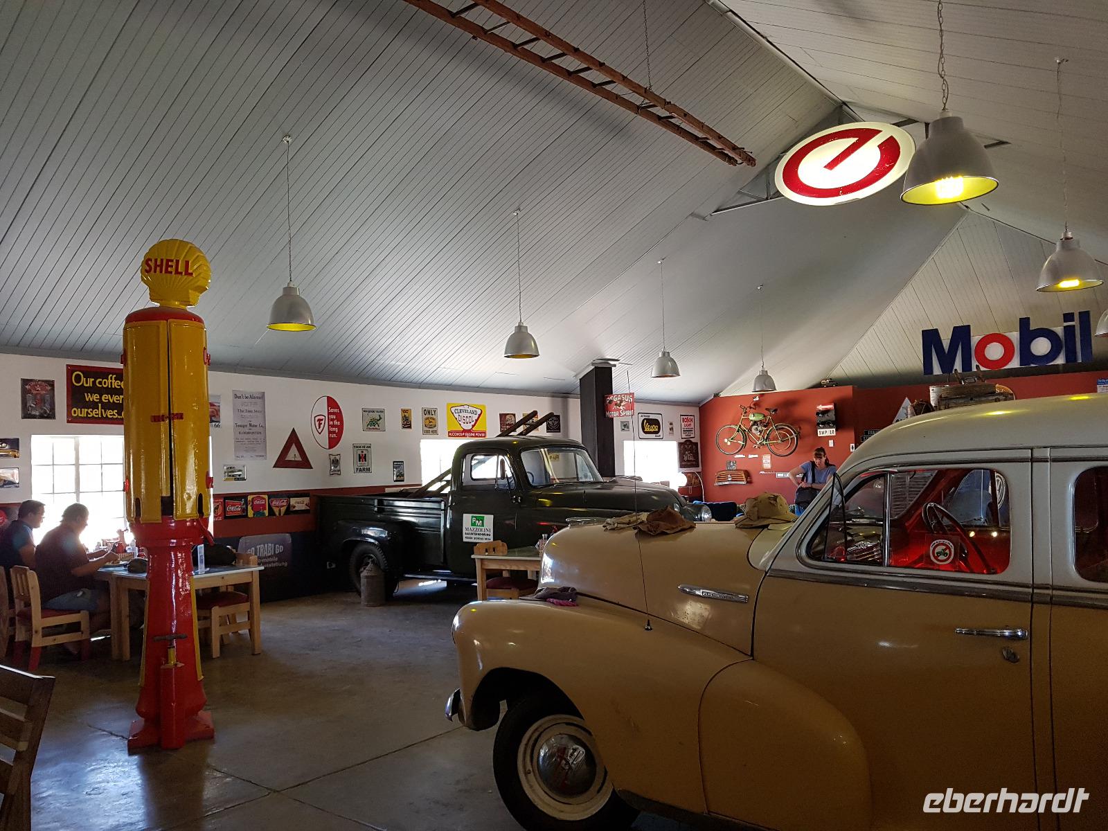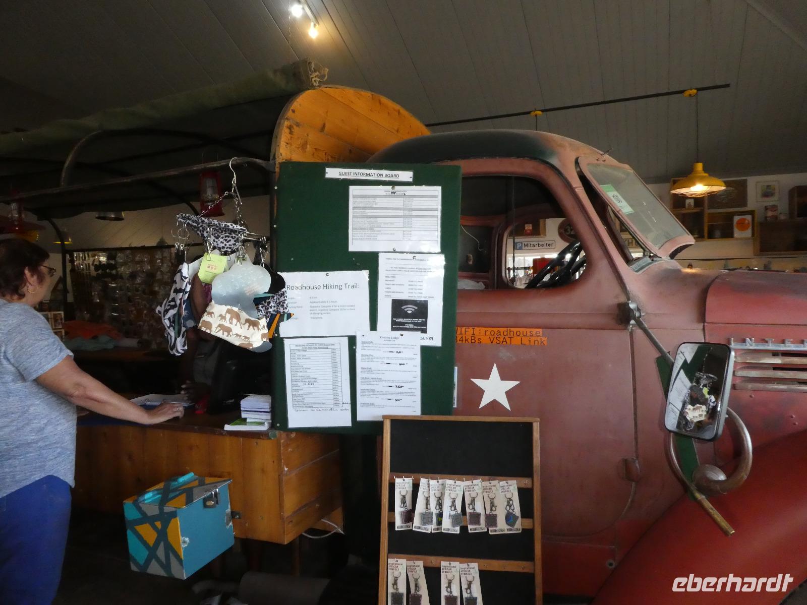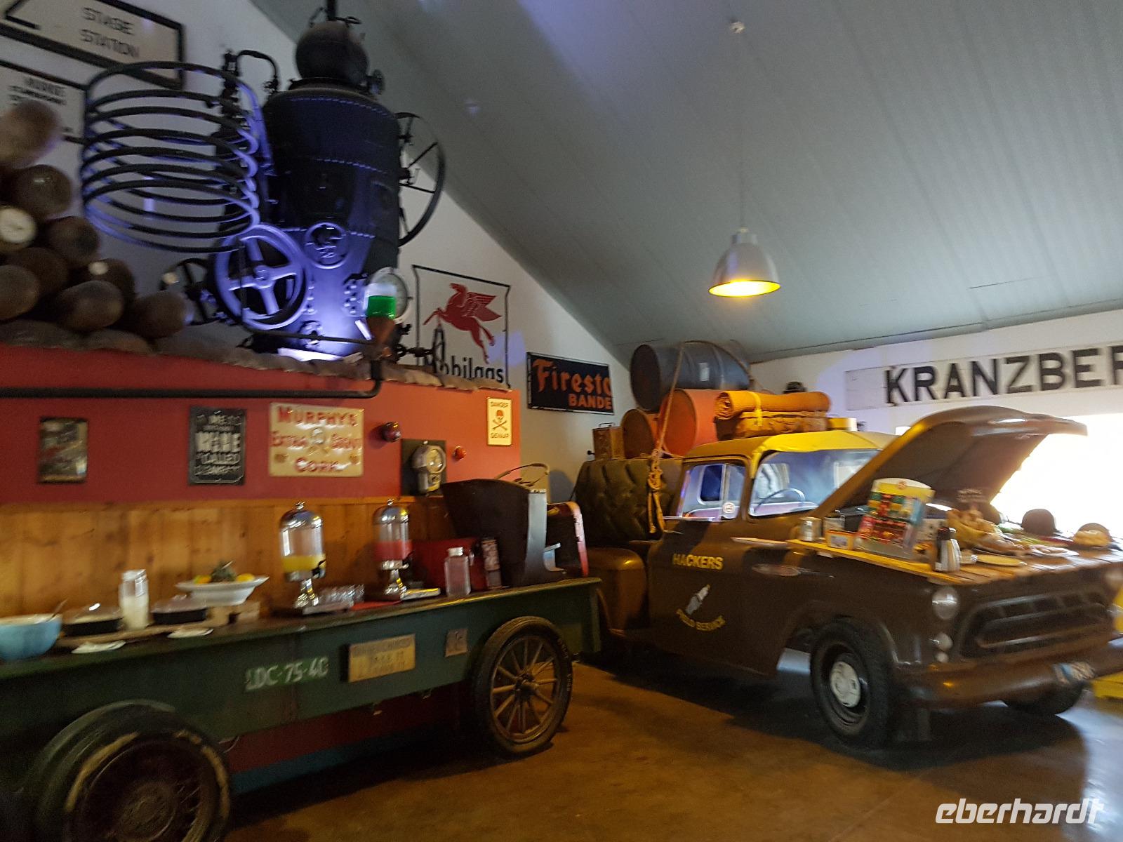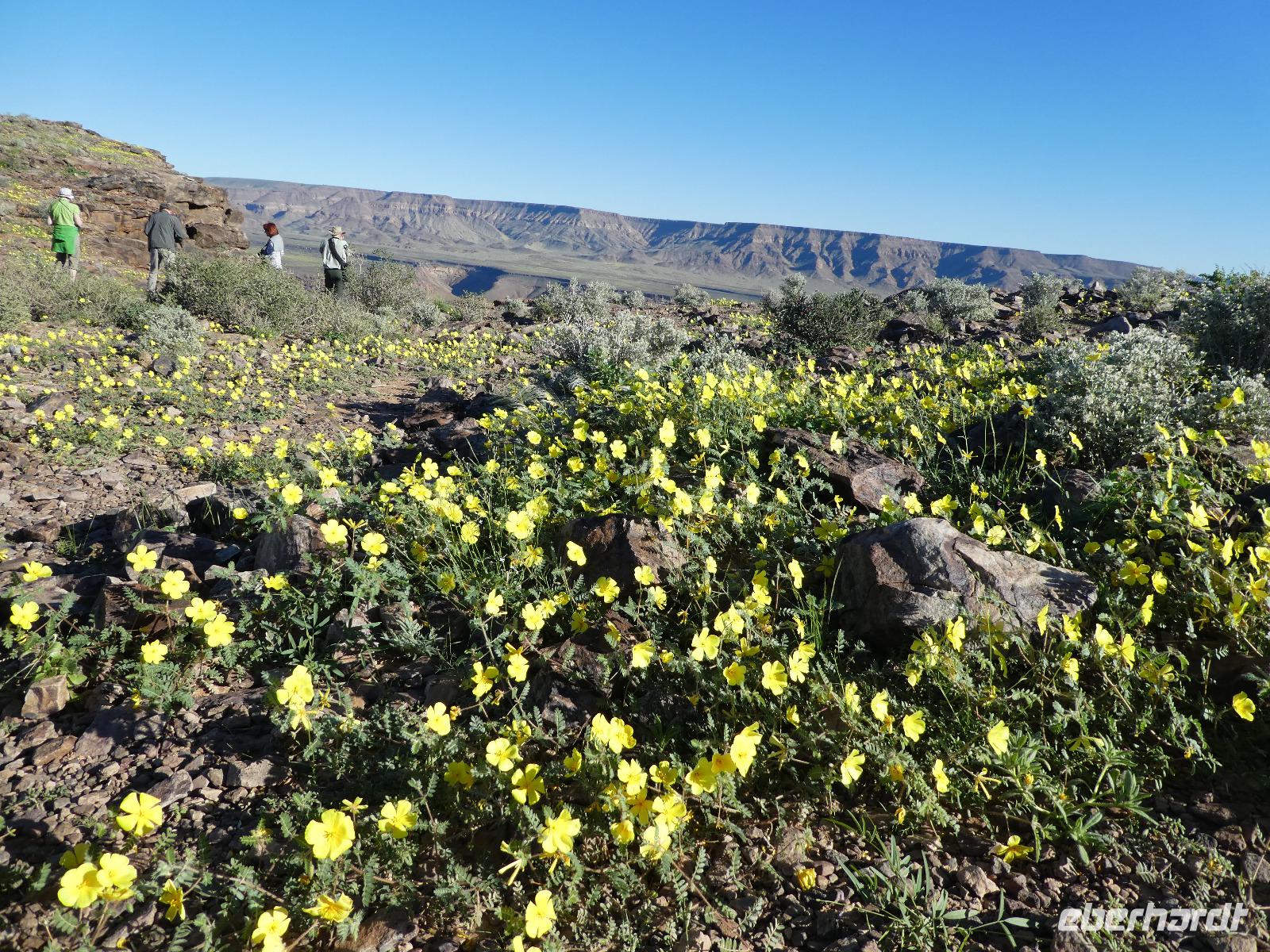 Gut ausgeruht und nach einem fantastischen Frühstück auf der Terrasse starteten wir unsere Tour. Um unsere Koffer brauchten wir uns nie kümmern. Sie wurden vom Truck in unsere Zimmer gebracht und am nächsten Morgen von fleissigen Helfern auch dort wieder abgeholt. Auf unserer langen Fahrt gab uns Barbara viele Informationen zum Land und berichtete immer wieder von ihrem spannendem Leben in Namibia. Sie lebte nun fast 20 Jahre hier und hatte somit viel zu erzählen. Aber auch die Flora Namibia kannte sie und so blieb kein Blümchen unerwähnt. Durch den Regen der vergangenen Wochen war es außergewöhnlich grün und sehr viele Pflanzen erweckten zum Leben. Bei den Köcherbäumen machten wir einen schönen Spaziergang, um die Riesen aus der Nähe zu betrachten. Einige Damen sahen sogar Klippschliefer zwischen den Steinen. Sie haben Ähnlichkeit mit den Murmeltieren, haben aber den gleichen Ursprung wie die Elefanten. Ein Stück weiter, am "Spielplatz" der Riesen machten wir im Schatten unseres Trucks unser erstes Picknick und danach stellte sich jeder kurz vor. Bei 15 Singles behält man zwar nicht gleich alle Namen, aber wir hatten noch 13 Tage Zeit zum Lernen. Plötzlich wurde es grüner. Wir sahen eine Linearoase und kamen am Naute Staudamm vorbei. Am frühen Abend dann erreichten wir unsere Unterkunft im Canyon Roadhouse. Es mutete an wie ein Autofriedhof im Nichts. Aber es war eine grandiose Idee, alte Autos so zu präsentieren. Noch vor Sonnenuntergang bestiegen wir den Hausberg und von oben bot sich ein unvergessliches Bild im Licht der untergehenden Sonne. Das Abendessen nahmen wir draussen ein zwischen Traktoren, Motorrädern und Autos.