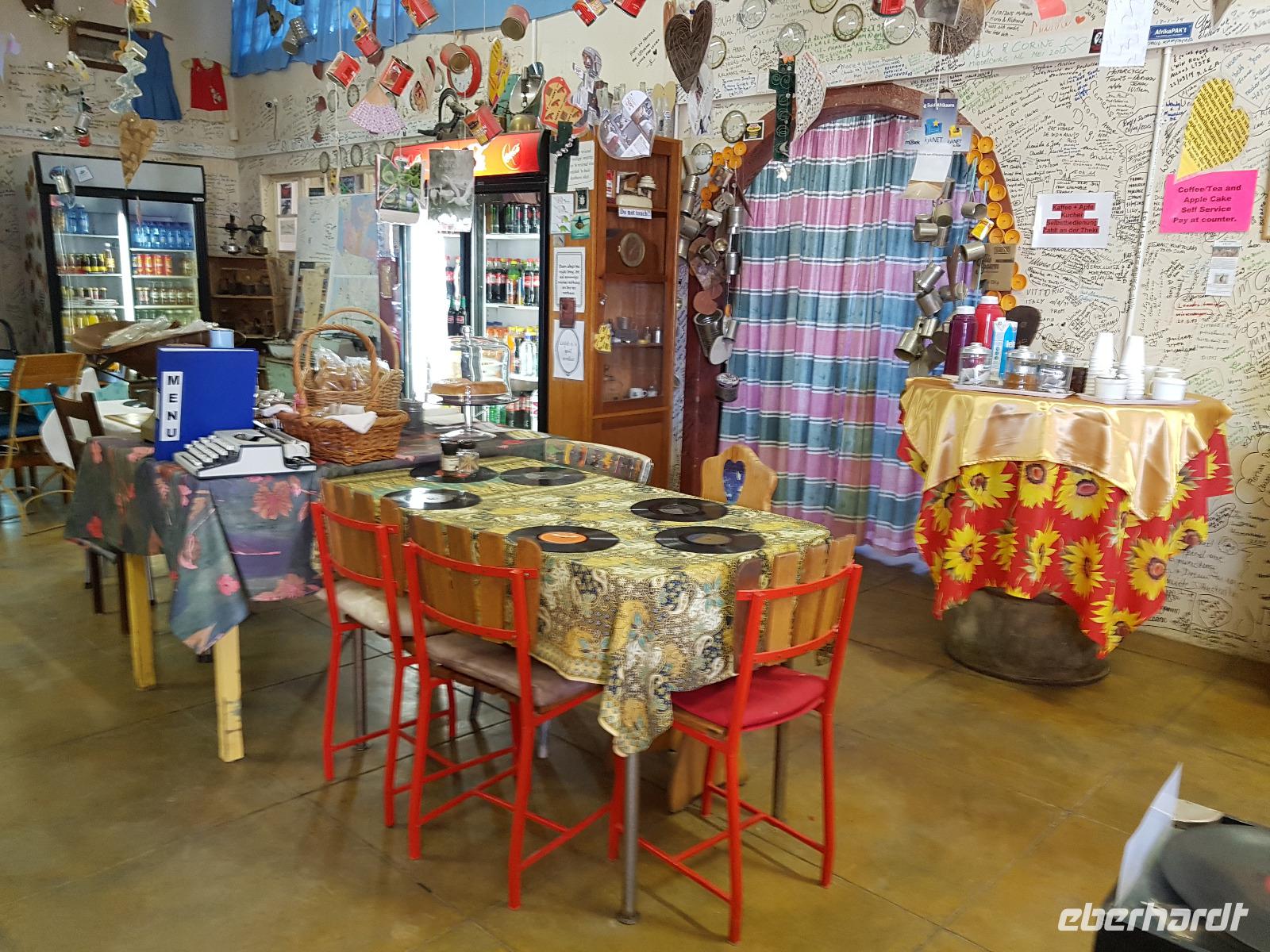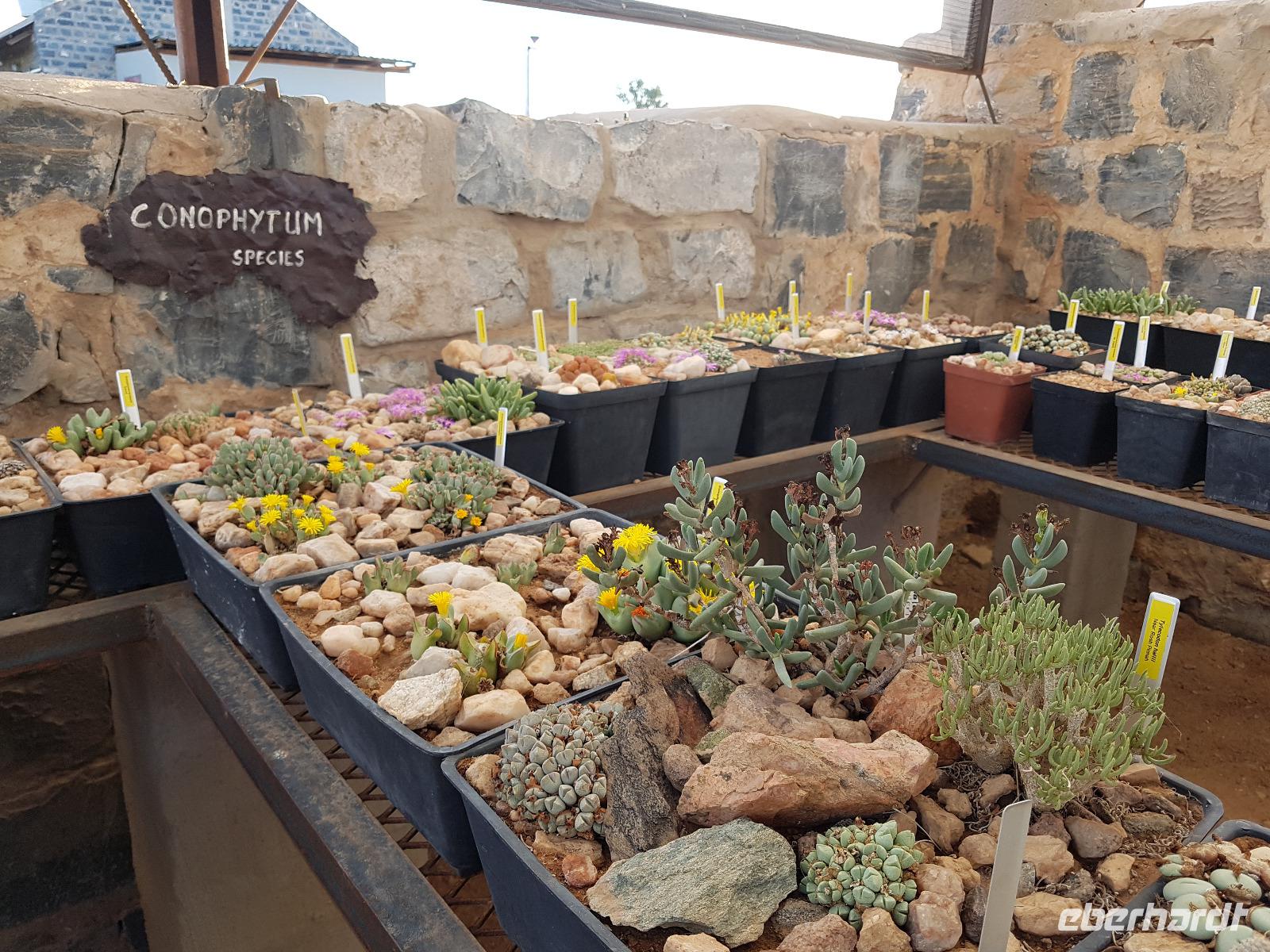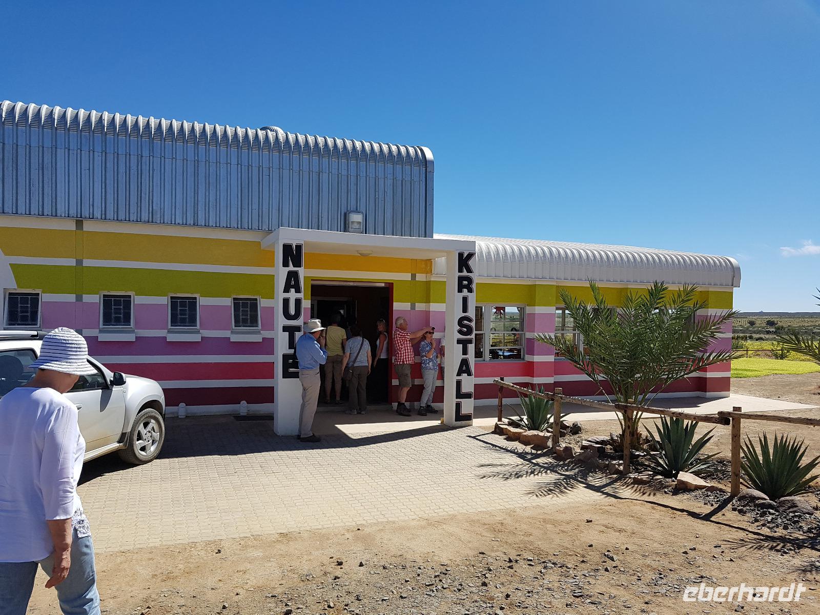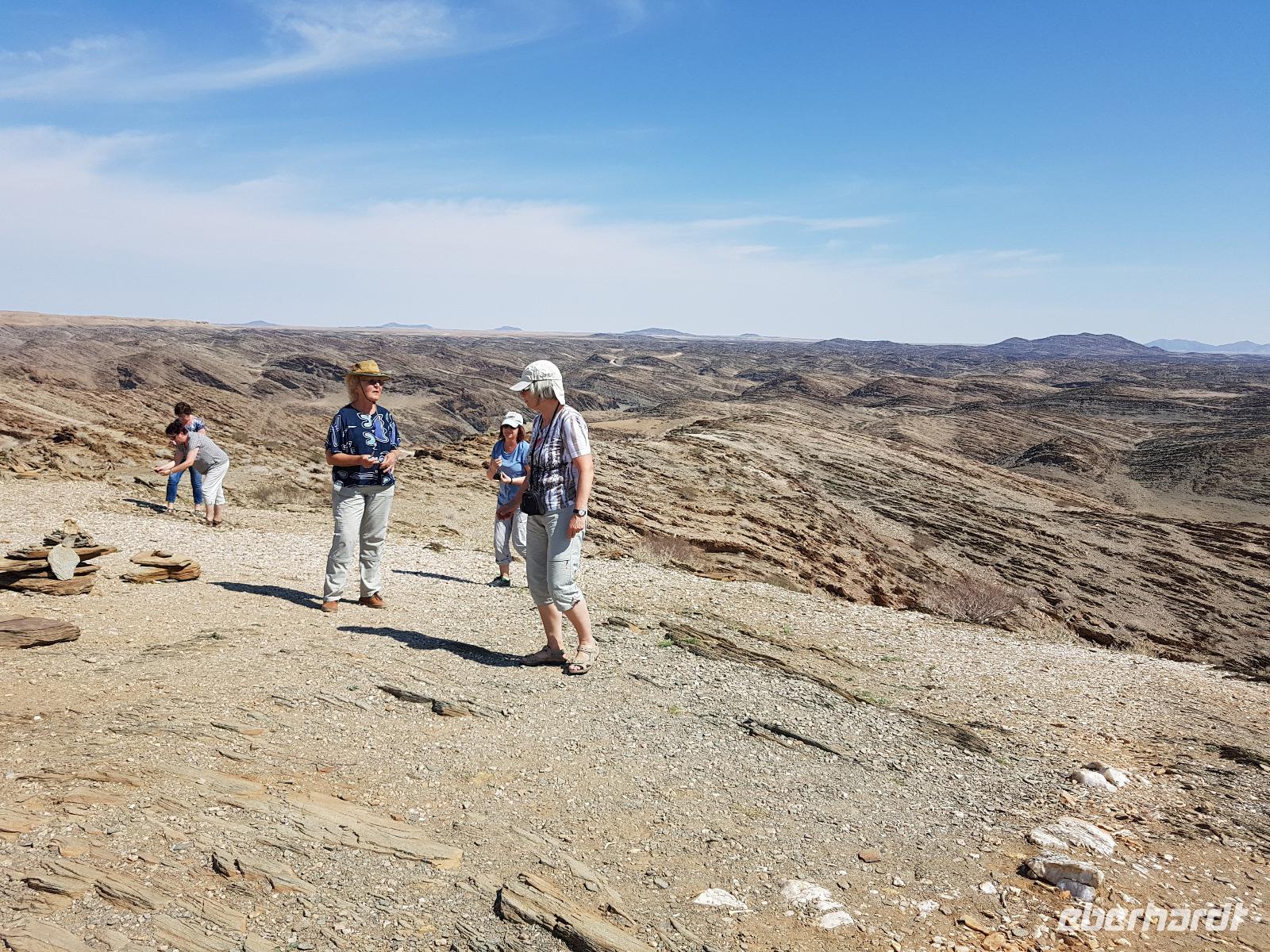 Das Frühstück gab es zeitig und dann brachen wir auf zum Fish River Canyon. Wir waren ganz allein am ersten Aussichtspunkt, machten unser Gruppen Foto und genossen einfach den Ausblick und die Stille. Dann fuhren wir mit dem Bus zum zweiten Aussichtspunkt und wanderten von dort immer an der Abbruchkante entlang zurück. Unterwegs zeigte uns Barbara viele Pflanzen und warnte uns vor den giftigen Euphorbien. Auch ein Camelion durften wir bewundern. Nach diesem tollen Erlebnis fuhren wid noch einmal zurück zum Canyon Roadhouse, tranken etwas und nutzten nochmals die WCs und das WLAN . Am Naute Staudamm war unsere Mittagspause geplant bei Naute Kristall. Zuerst probierten wir die leckeren Schnäpse aus Datteln, Kaktusfeige, Granatapfel und den Gin. Zum Mittagessen bekam jeder einen Teller mit Spezialitäten und dazu einen Kaffee. Die Besitzerin informierte uns über den Anbau von Wein, Dattelpalmen und Granatäpfeln. Das ist wächst dort, weil es genügrend Wasser gibt. Wir überquerten noch einmal den Fischfluss und erreichten dann am Nachmittag die Kalköfen Lodge. Die Einrichtung war wieder ein neues Erlebnis. Im ehemaligen Gelände einer Kalkbrennerei waren die Häuschen errichtet worden und im Inneren mit historischen Gegenständen versehen. Der Besitzer hatte auch eine grosse Sammlung von lebenden Steinen und diese durften wir mit seiner fachkundigen Führung besichtigen. Zum Abendessen wurden wir an einer liebevoll geschmückten Tafel mit einem sehr schmackhaften Essen überrascht.