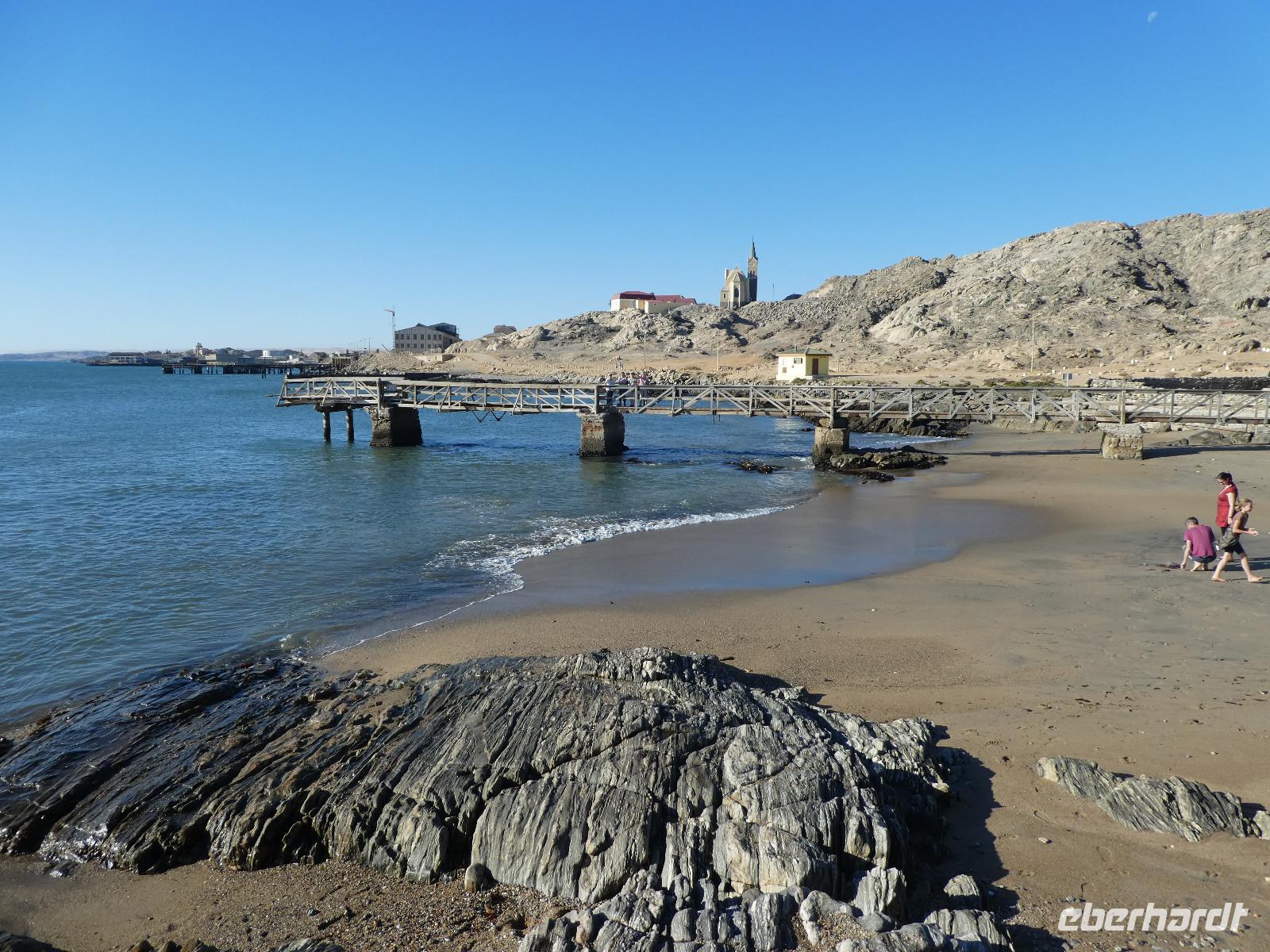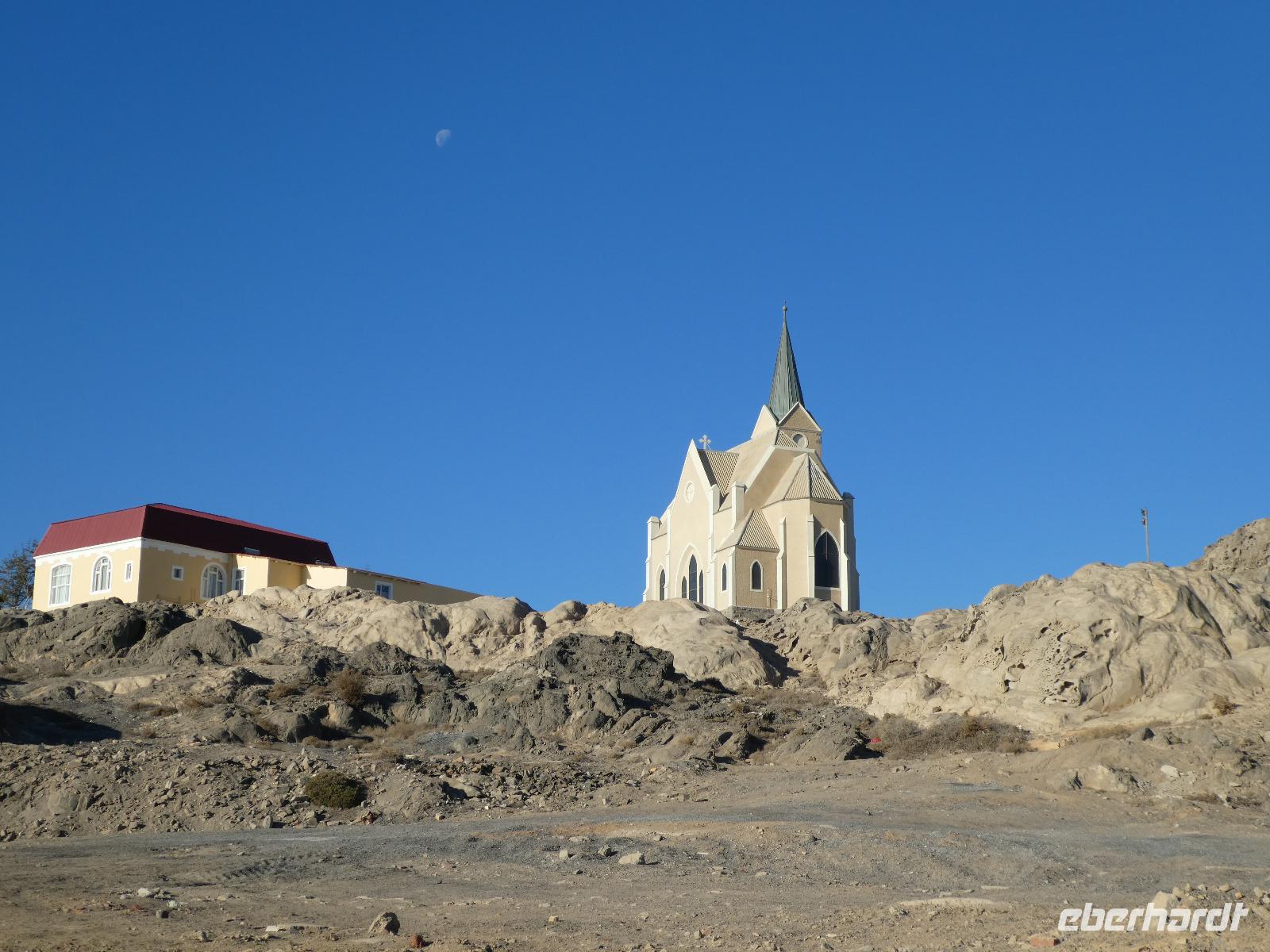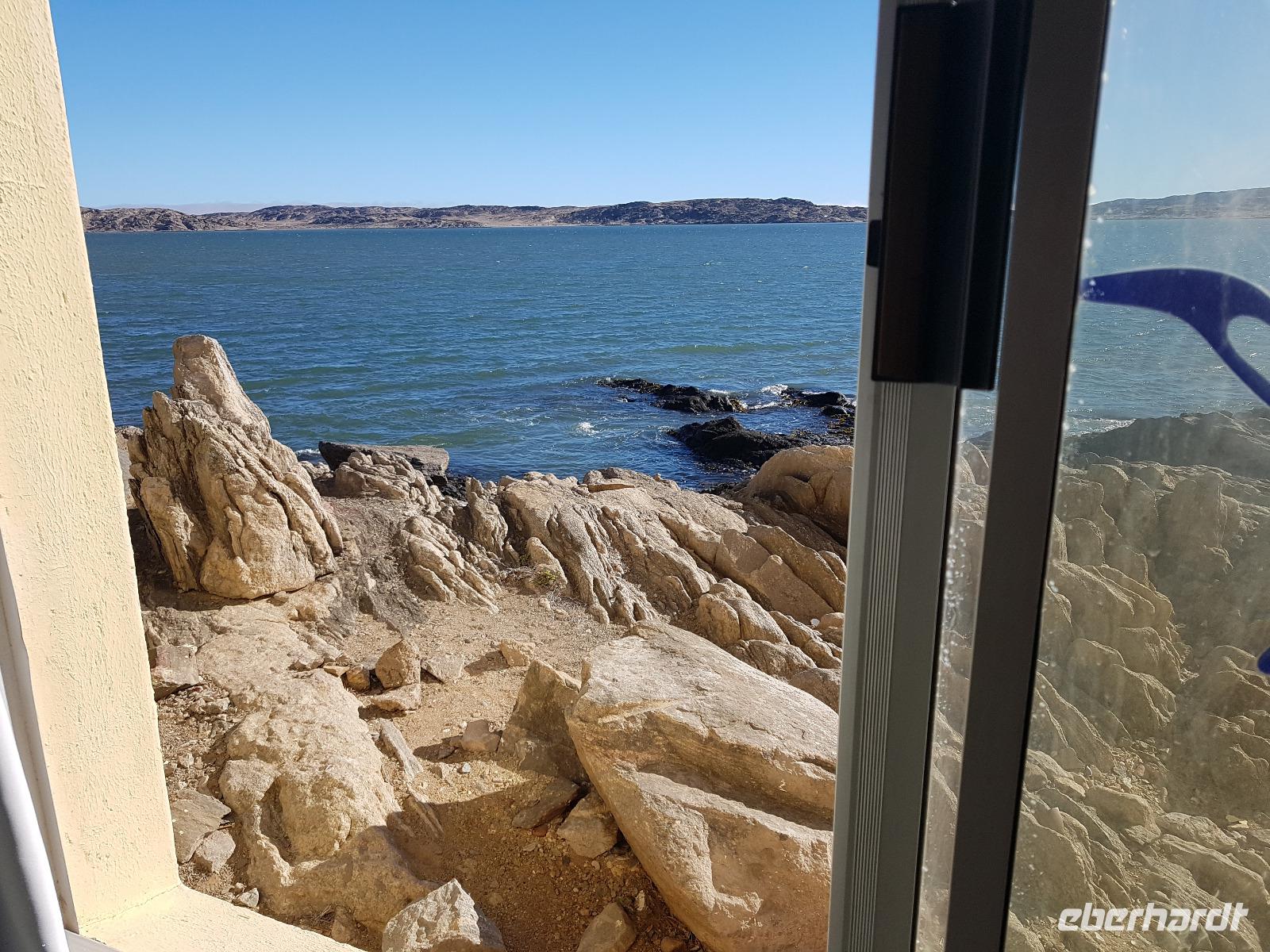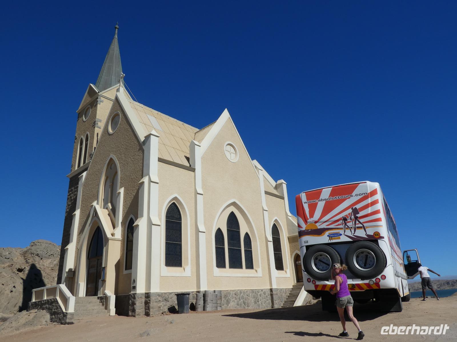 Nach dem Frühstück fuhren wir ein kurzes Stück mit dem Bus bis zu einem alten Kalkofen. Dort erwartete uns der Besitzer und erklärte uns den Kalkofen und die Geschichte des Geländes. Eine lange Fahrt brachte uns danach durch ständig wechselnde Landschaften Landschaften bis zu den Wildpferden. Unterwegs hielten wir an einer Schaffarm um einzukaufen, einen Kaffee zu trinken und die gepflegten Toiletten zu nutzen. Barbara berichtete uns über die Geschehnisse im ersten Weltkrieg, über den Bau der Eisenbahnlinie und verschiedene Schicksale von Deutschen. Auch zu den Diamantenfunden gab es die ersten Informationen. An einem Wasserloch hofften wir Wildpferde zu sehen aber dort waren Oryxe zu bewundern. Sogar eine Toilette ganz sauber war in dieser Wildnis. Weiter fuhren wir vorbei an Aus zu den Lüderitz vorgelagerten Buchten bis zum Dias Kreuz. Wir stiegen aus und genossen die feuchte Luft am Atlantik. Ganz plötzlich kam Nebel auf vom Atlantik und nahm uns die Sicht. Wir fuhren zurück nach Lüderitz Bucht zur Felsenkirche, denn von dort oben sahen wir unser Nesthotel am Meer sehr schön liegen. Wir checkten ein und hatten Zeit zum schwimmen, nochmals in die Stadt spazieren oder einfach nur zu relaxen. Vor dem Abendessen besuchten wir die dann geöffnete Felsenkirche und konnten die von Deutschen gesprendeten bunten Fenster bewundern. Das Abendbrot nahmen wir gemeinsam ein und jeder wählte selbst sein Essen aus der Karte.