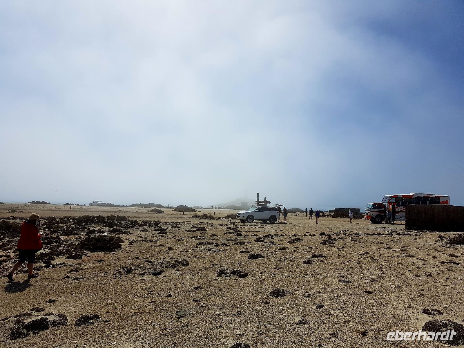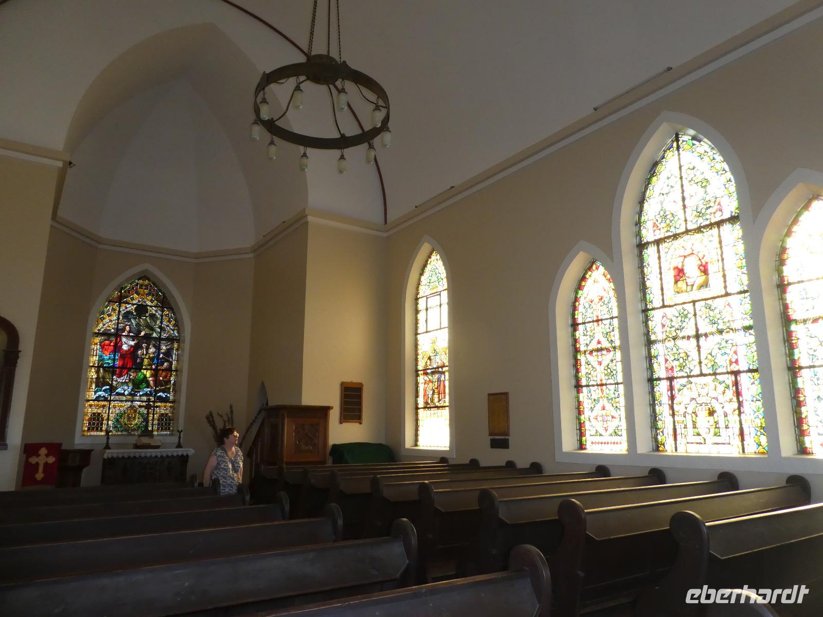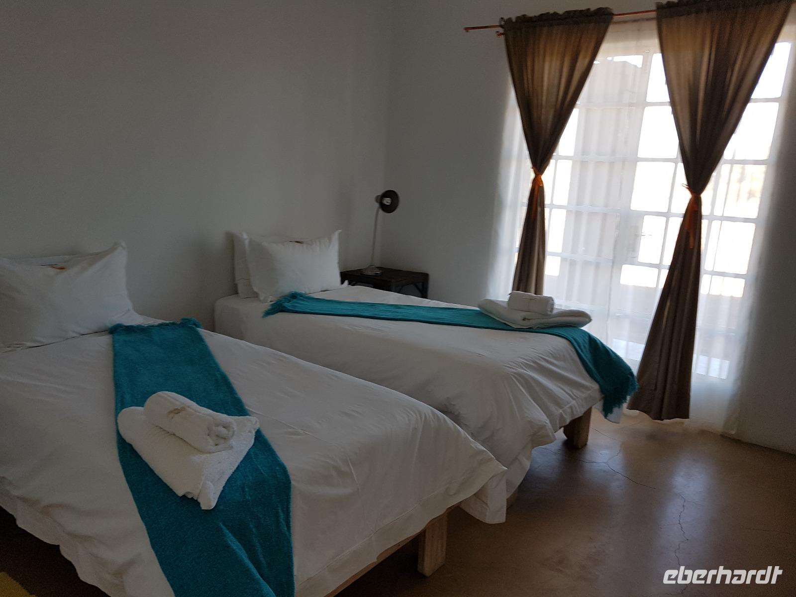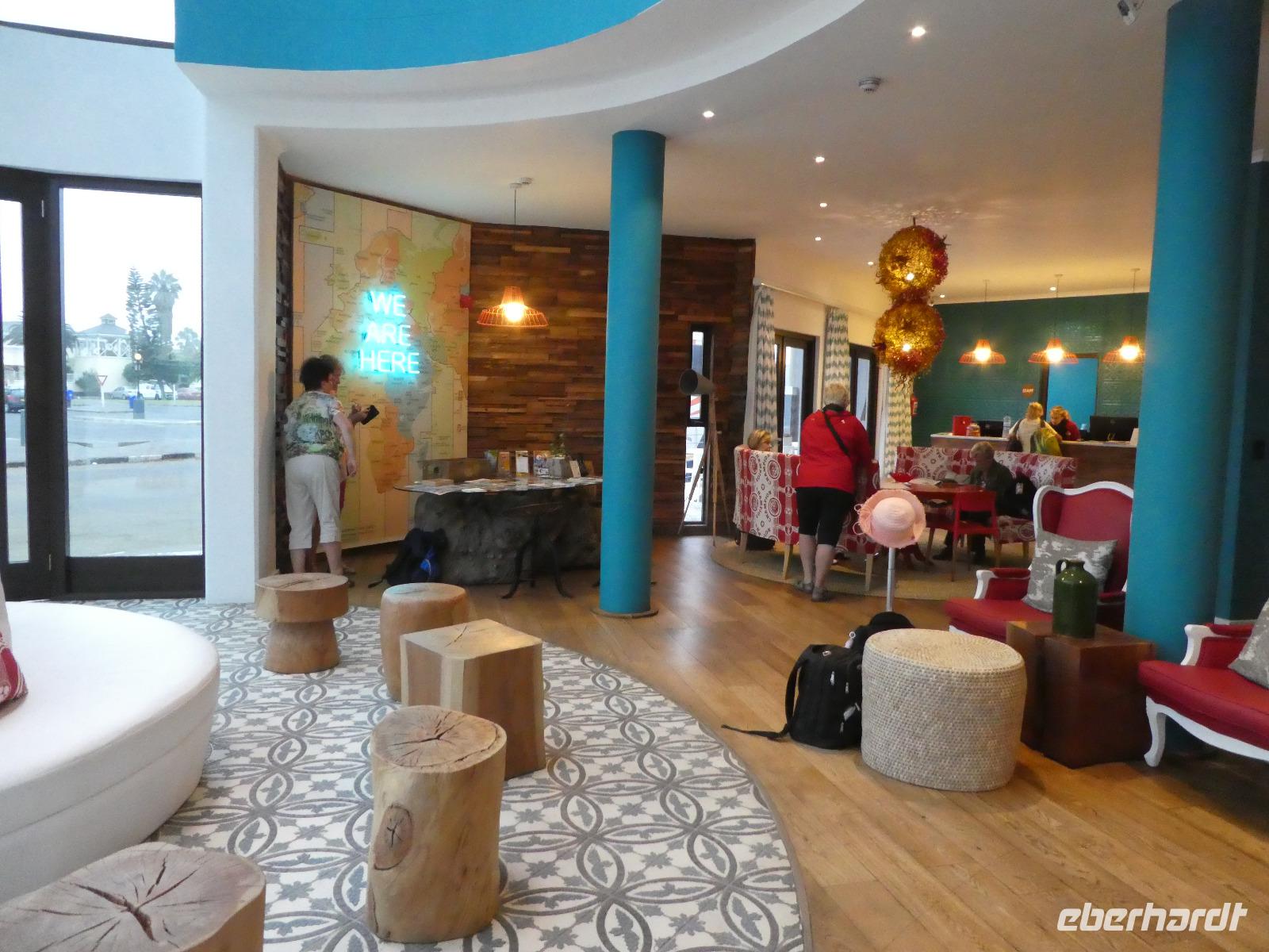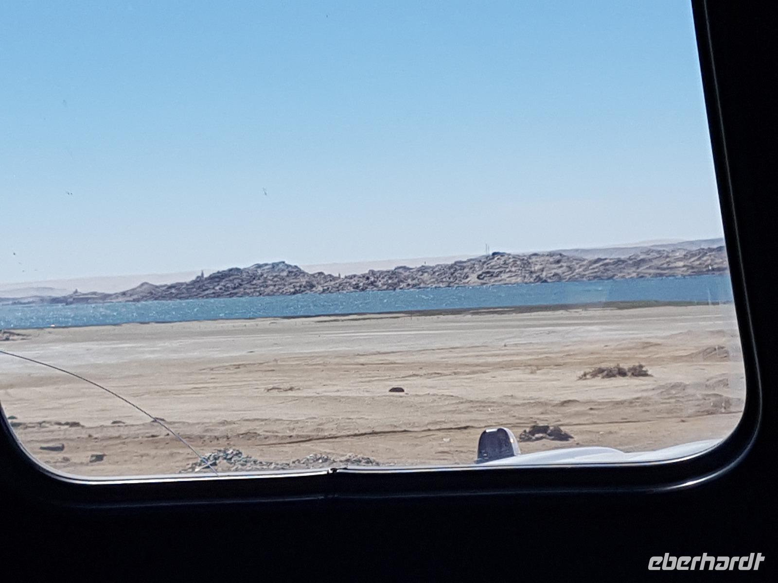 Nach dem Frühstück fuhren wir ein kurzes Stück mit dem Bus bis zu einem alten Kalkofen. Dort erwartete uns der Besitzer und erklärte uns den Kalkofen und die Geschichte des Geländes. Eine lange Fahrt brachte uns danach durch ständig wechselnde Landschaften Landschaften bis zu den Wildpferden. Unterwegs hielten wir an einer Schaffarm um einzukaufen, einen Kaffee zu trinken und die gepflegten Toiletten zu nutzen. Barbara berichtete uns über die Geschehnisse im ersten Weltkrieg, über den Bau der Eisenbahnlinie und verschiedene Schicksale von Deutschen. Auch zu den Diamantenfunden gab es die ersten Informationen. An einem Wasserloch hofften wir Wildpferde zu sehen aber dort waren Oryxe zu bewundern. Sogar eine Toilette ganz sauber war in dieser Wildnis. Weiter fuhren wir vorbei an Aus zu den Lüderitz vorgelagerten Buchten bis zum Dias Kreuz. Wir stiegen aus und genossen die feuchte Luft am Atlantik. Ganz plötzlich kam Nebel auf vom Atlantik und nahm uns die Sicht. Wir fuhren zurück nach Lüderitz Bucht zur Felsenkirche, denn von dort oben sahen wir unser Nesthotel am Meer sehr schön liegen. Wir checkten ein und hatten Zeit zum schwimmen, nochmals in die Stadt spazieren oder einfach nur zu relaxen. Vor dem Abendessen besuchten wir die dann geöffnete Felsenkirche und konnten die von Deutschen gesprendeten bunten Fenster bewundern. Das Abendbrot nahmen wir gemeinsam ein und jeder wählte selbst sein Essen aus der Karte.