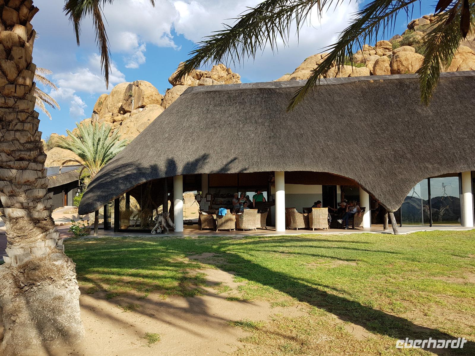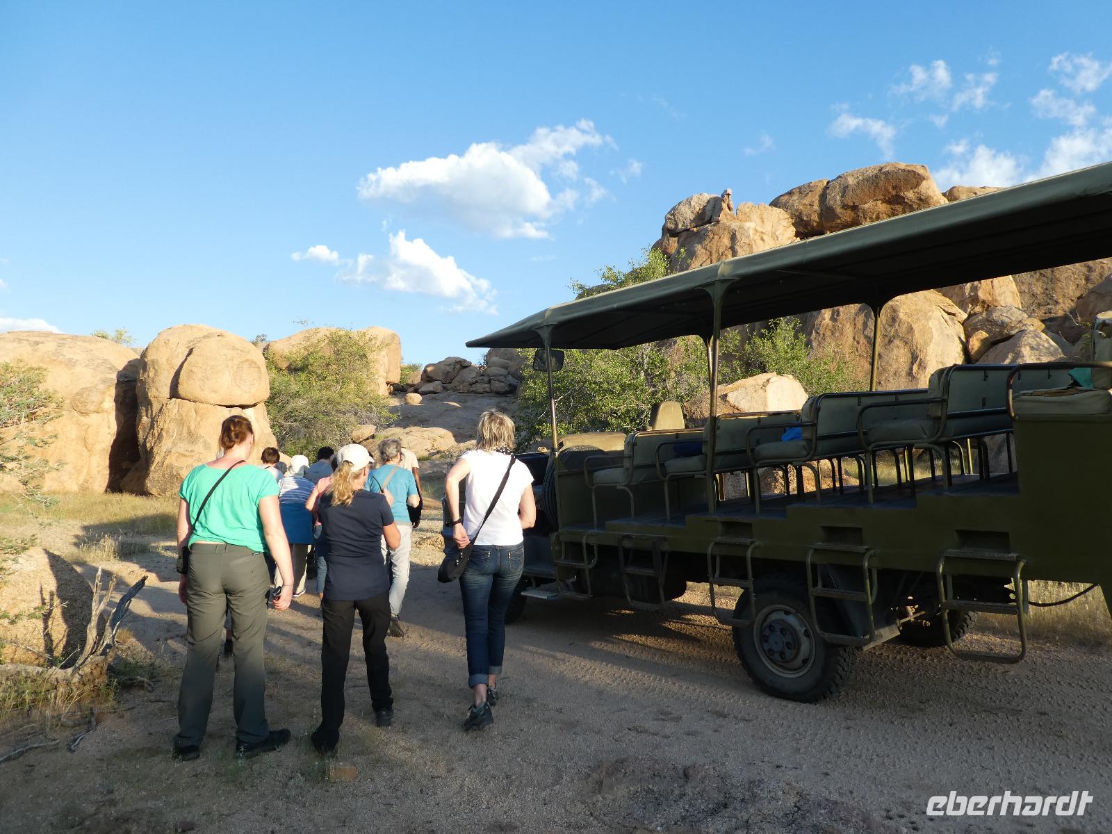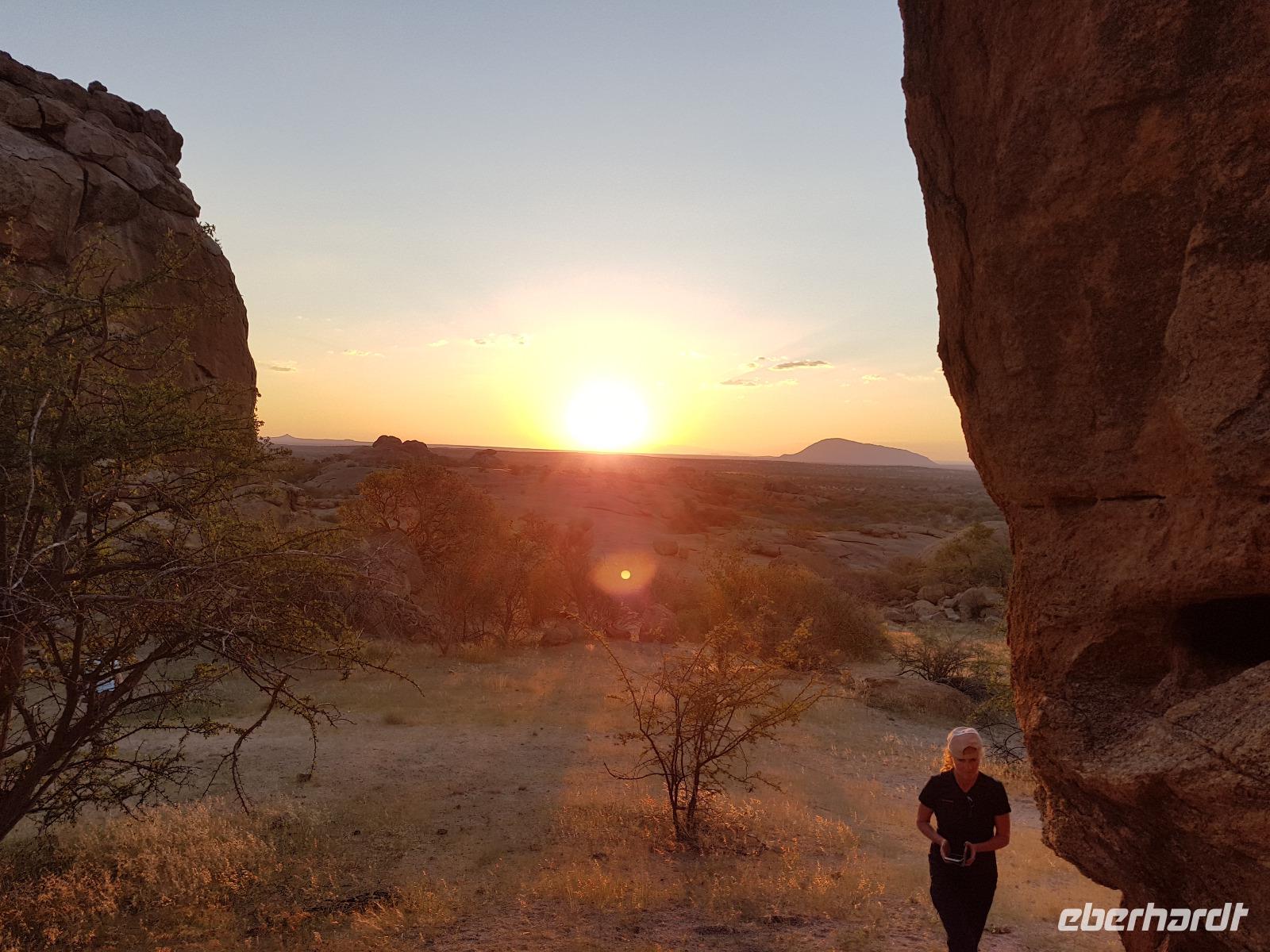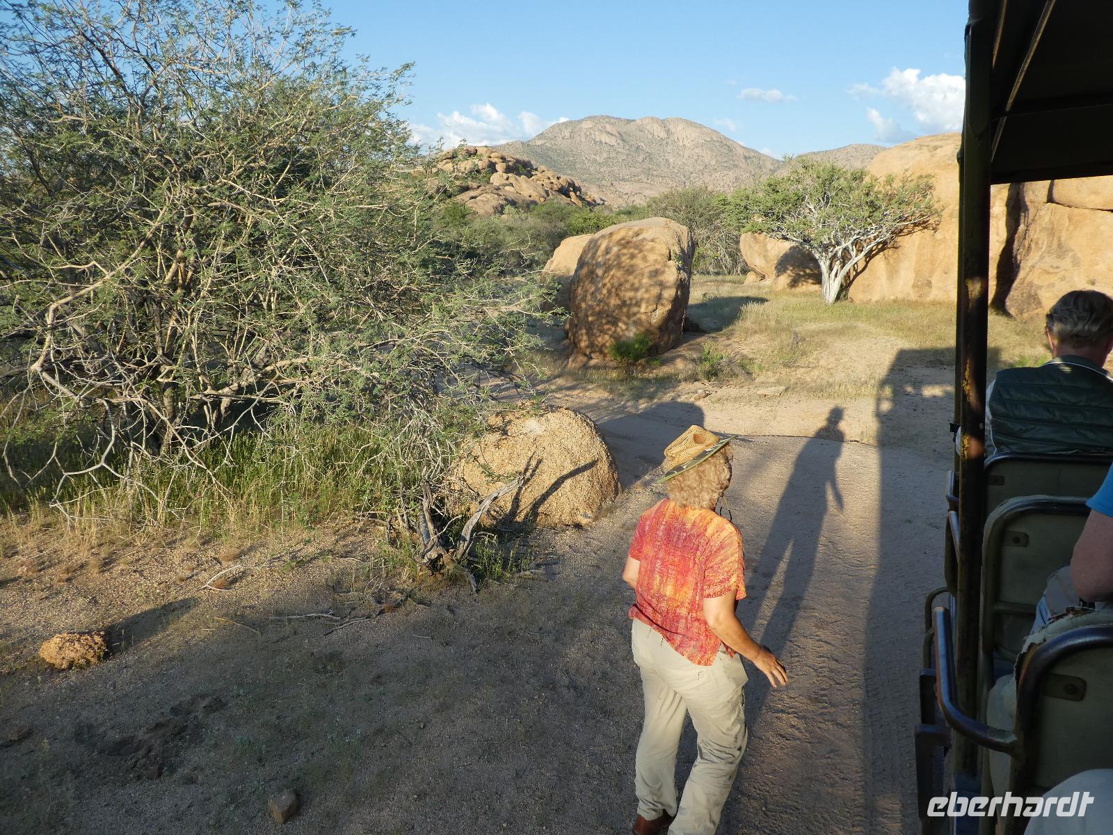Wir genossen noch einmal das fantastische Frühstück und fuhren dann bei leichtem Regen los in Richtung Norden. Unterwegs berichtete Barbara über den Uran- und Kupferabbau. Dann hielten wir bei den Verkaufsständen der Damara und kauften schöne Halbedelsteine ein. Sogar eine Toilette war für die Touristen gebaut worden. Bei einem weiteren Stopp erfuhren wir Interessantes über die Steine am Wegesrand und in der Ferne war schon die Spitzkoppe zu sehen. Dorthin fuhren wir und suchten einen schattigen Platz für das Mittagspicknick gesponsert von Eberhardt. Während die einen schon den griechischen Salat vorbereiteten, machten die Wanderer einen "Ausflug" durch die roten Felsformationen. Ein Felsbogen erinnerte uns an das Prebischtor im Elbsandsteingebirge und war ein sehr beliebtes Fotomotiv. Gemeinsam sassen wir dann auf den Campingstühlen im Schatten eines grossen Baumes und genossen den Salat, Äpfel und Kuchen. Dann fuhren wir weiter ins Erongo Gebirge. Die 60 km lange Bergkette ist der Rand einer ehemaligen Caldera und zeigt uns, welche gewaltigen Verschiebungen hier einst passierten. Unterwegs hielten wir mehrfach an, stiegen aus und Barbara hatte immer etwas interessantes zu zeigen und zu erklären. So zum Beispiel das Bitterkraut oder besondere Steine usw. Inmitten der roten Felsen lag dann unsere Aj-Aiba Lodge. 10 Doppelhäuser mit strohgedeckten Dächern, einer Terrasse mit Blick zum Wasserloch und einer wunderschönen Einrichtung hatten es uns sofort angetan. Einige nutzten den Pool und der grösste Teil der Gruppe hatte sich für eine Fahrt zum Sonnenuntergang angemeldet. Dabei sahen wir Springböcke und Giraffen sowie zahlreiche alte Felszeichnungen. Im Schein der untergehenden Sonne färbten sich die Felsen dunkelrot und Klippschliefer schauten aus den Felsspalten auf uns herab. Mit einem Drink in der Hand genossen wir diesen unvergesslichen Anblick. Im Dunkeln fuhren wir zurück zur Lodge und bekamen ein exklusives Abendessen.