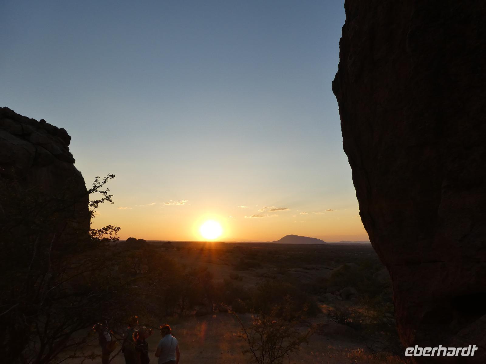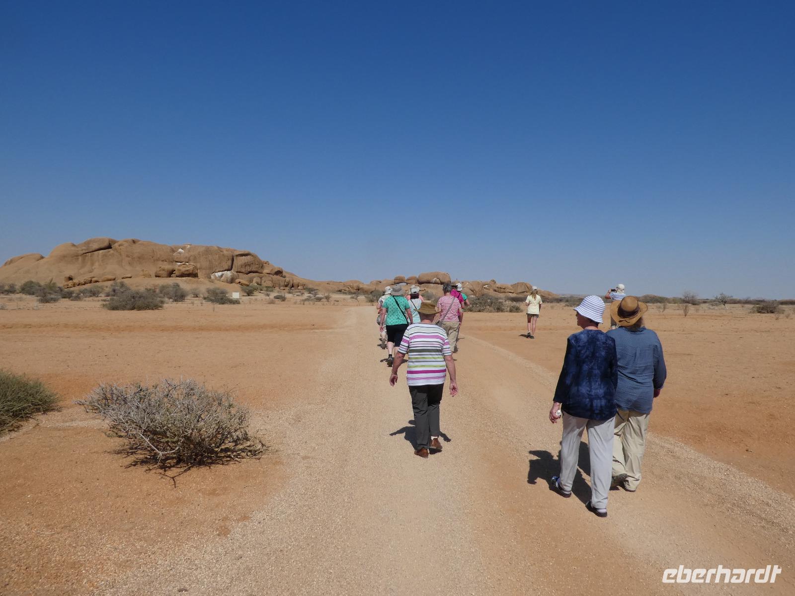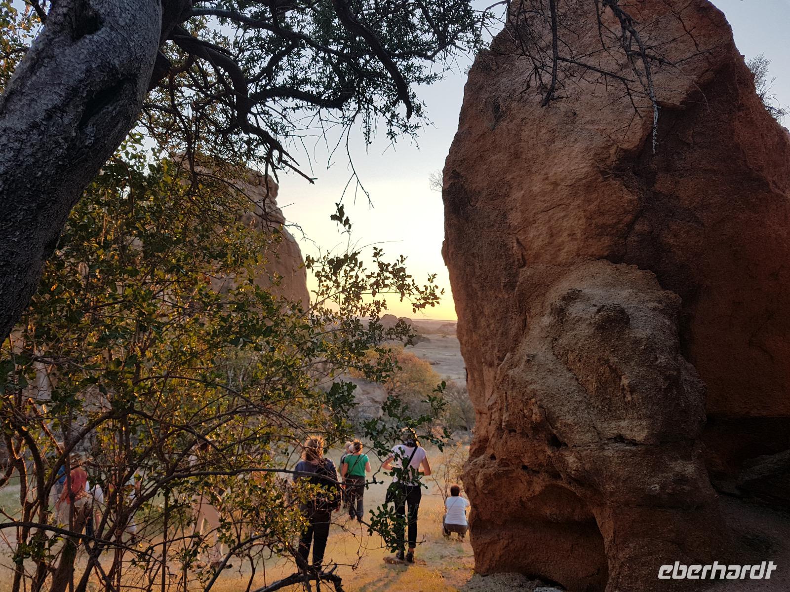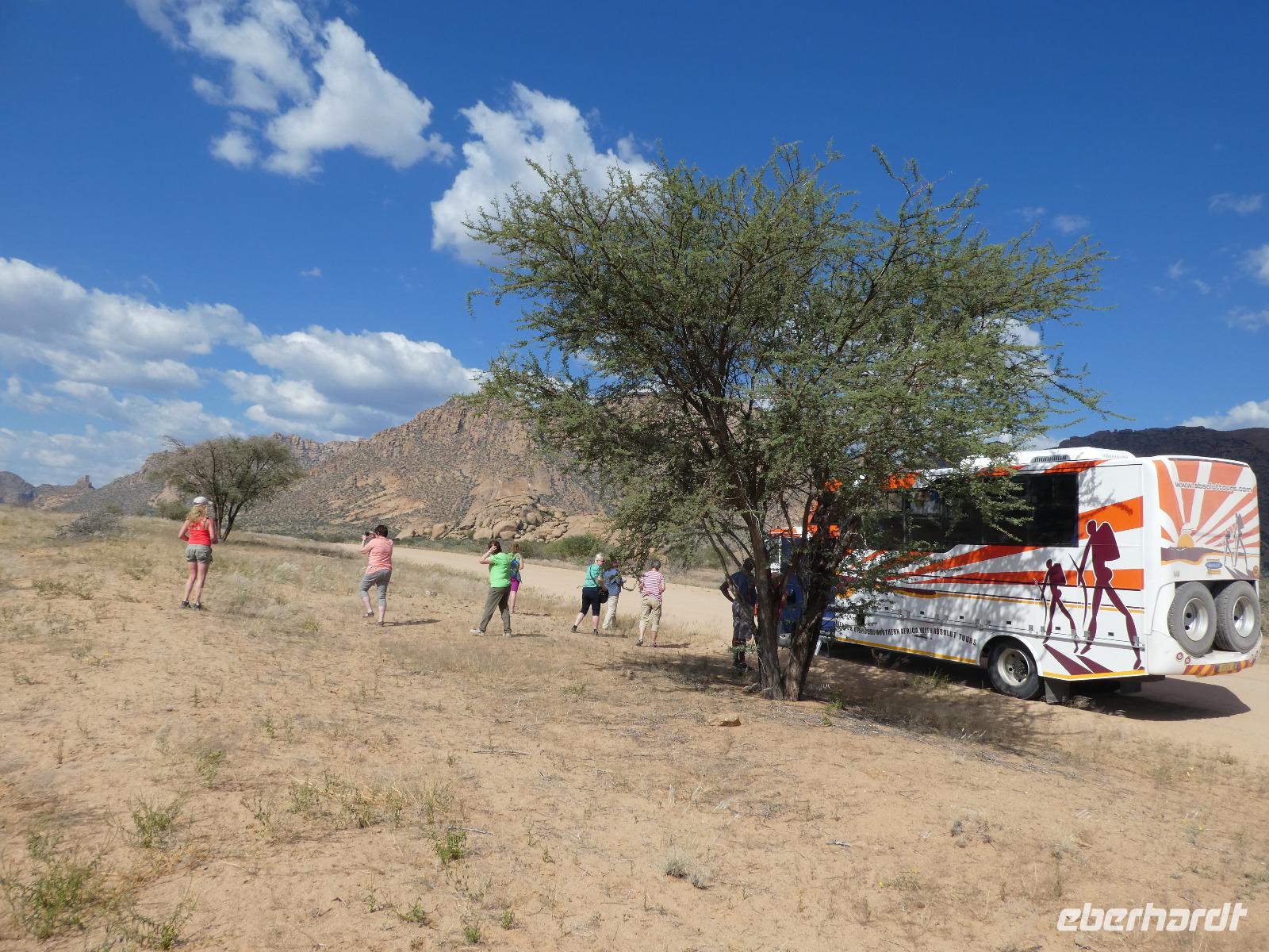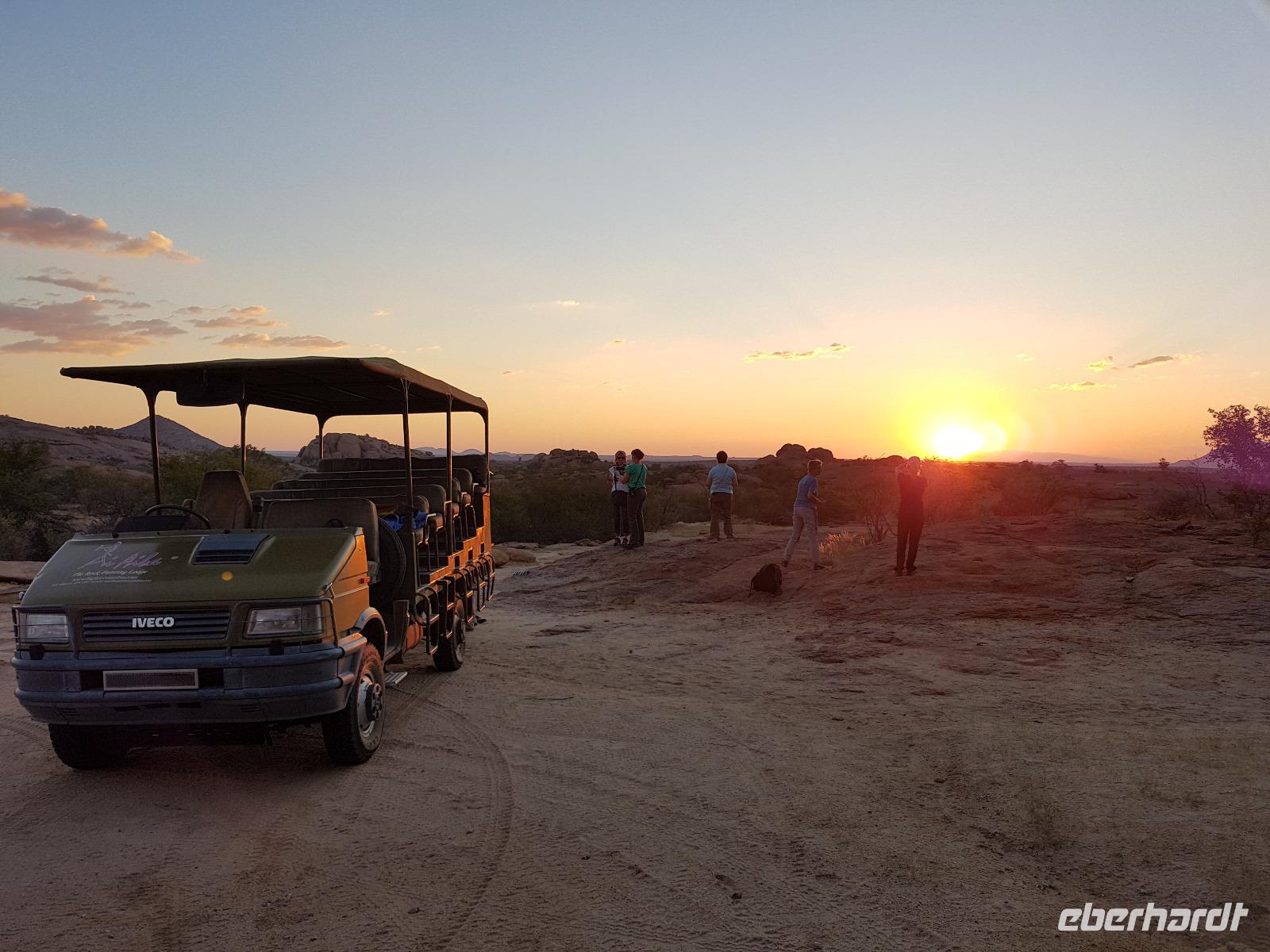 Wir genossen noch einmal das fantastische Frühstück und fuhren dann bei leichtem Regen los in Richtung Norden. Unterwegs berichtete Barbara über den Uran- und Kupferabbau. Dann hielten wir bei den Verkaufsständen der Damara und kauften schöne Halbedelsteine ein. Sogar eine Toilette war für die Touristen gebaut worden. Bei einem weiteren Stopp erfuhren wir Interessantes über die Steine am Wegesrand und in der Ferne war schon die Spitzkoppe zu sehen. Dorthin fuhren wir und suchten einen schattigen Platz für das Mittagspicknick gesponsert von Eberhardt. Während die einen schon den griechischen Salat vorbereiteten, machten die Wanderer einen "Ausflug" durch die roten Felsformationen. Ein Felsbogen erinnerte uns an das Prebischtor im Elbsandsteingebirge und war ein sehr beliebtes Fotomotiv. Gemeinsam sassen wir dann auf den Campingstühlen im Schatten eines grossen Baumes und genossen den Salat, Äpfel und Kuchen. Dann fuhren wir weiter ins Erongo Gebirge. Die 60 km lange Bergkette ist der Rand einer ehemaligen Caldera und zeigt uns, welche gewaltigen Verschiebungen hier einst passierten. Unterwegs hielten wir mehrfach an, stiegen aus und Barbara hatte immer etwas interessantes zu zeigen und zu erklären. So zum Beispiel das Bitterkraut oder besondere Steine usw. Inmitten der roten Felsen lag dann unsere Aj-Aiba Lodge. 10 Doppelhäuser mit strohgedeckten Dächern, einer Terrasse mit Blick zum Wasserloch und einer wunderschönen Einrichtung hatten es uns sofort angetan. Einige nutzten den Pool und der grösste Teil der Gruppe hatte sich für eine Fahrt zum Sonnenuntergang angemeldet. Dabei sahen wir Springböcke und Giraffen sowie zahlreiche alte Felszeichnungen. Im Schein der untergehenden Sonne färbten sich die Felsen dunkelrot und Klippschliefer schauten aus den Felsspalten auf uns herab. Mit einem Drink in der Hand genossen wir diesen unvergesslichen Anblick. Im Dunkeln fuhren wir zurück zur Lodge und bekamen ein exklusives Abendessen.