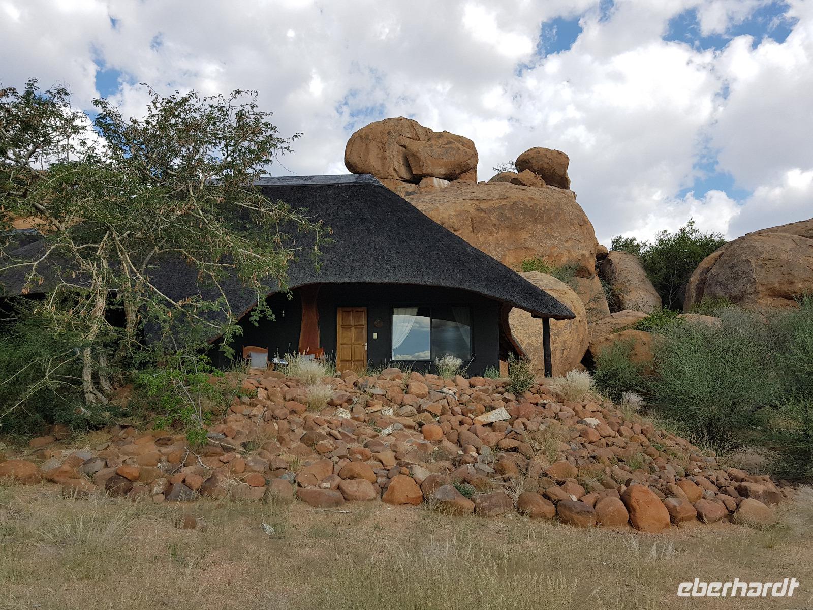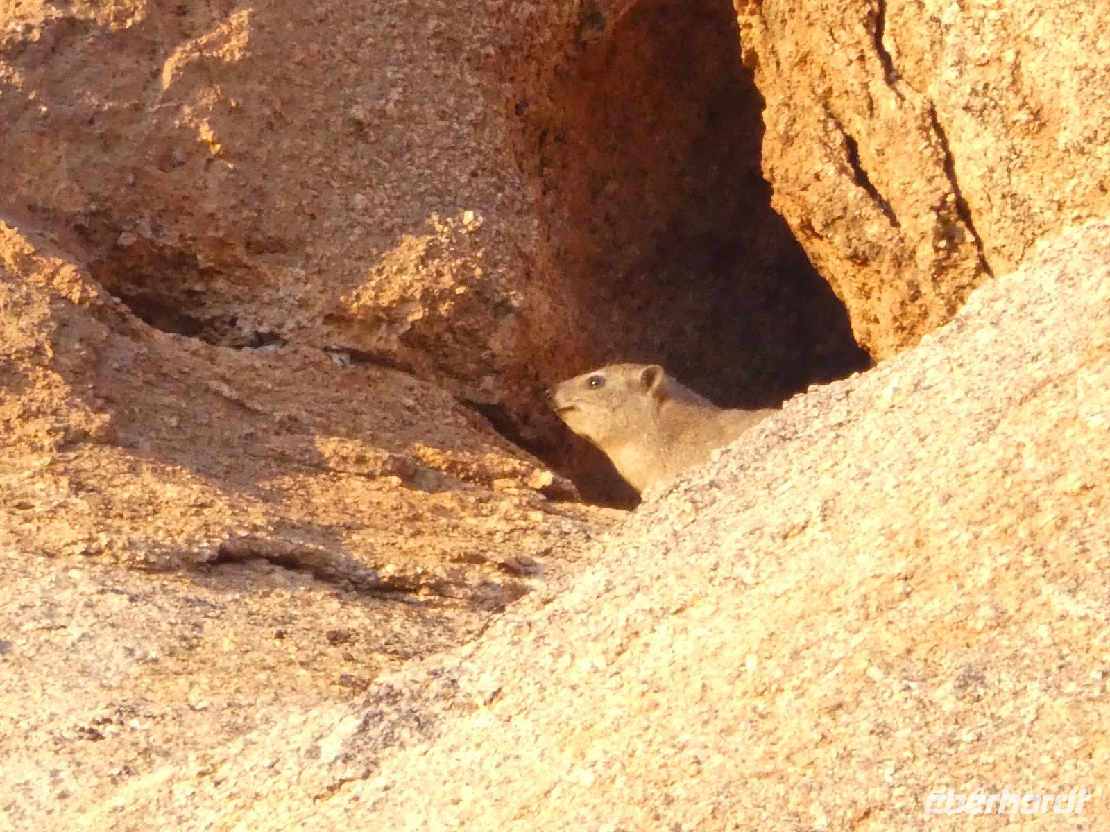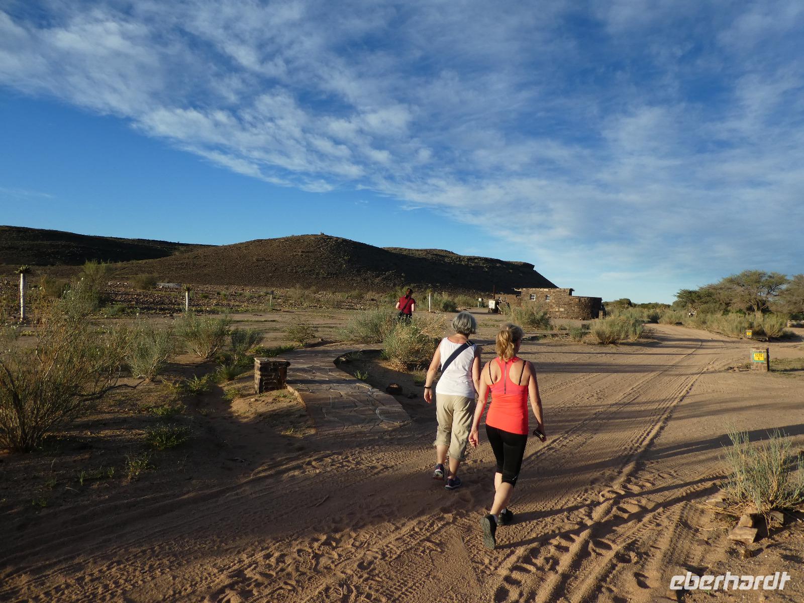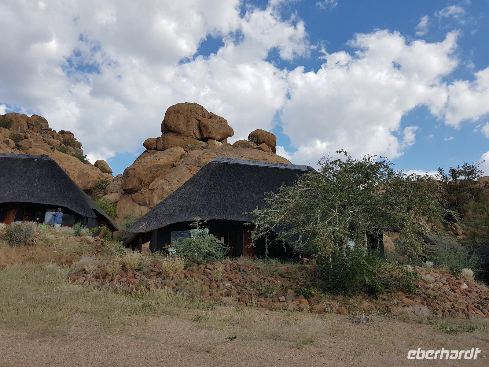Wir genossen noch einmal das fantastische Frühstück und fuhren dann bei leichtem Regen los in Richtung Norden. Unterwegs berichtete Barbara über den Uran- und Kupferabbau. Dann hielten wir bei den Verkaufsständen der Damara und kauften schöne Halbedelsteine ein. Sogar eine Toilette war für die Touristen gebaut worden. Bei einem weiteren Stopp erfuhren wir Interessantes über die Steine am Wegesrand und in der Ferne war schon die Spitzkoppe zu sehen. Dorthin fuhren wir und suchten einen schattigen Platz für das Mittagspicknick gesponsert von Eberhardt. Während die einen schon den griechischen Salat vorbereiteten, machten die Wanderer einen "Ausflug" durch die roten Felsformationen. Ein Felsbogen erinnerte uns an das Prebischtor im Elbsandsteingebirge und war ein sehr beliebtes Fotomotiv. Gemeinsam sassen wir dann auf den Campingstühlen im Schatten eines grossen Baumes und genossen den Salat, Äpfel und Kuchen. Dann fuhren wir weiter ins Erongo Gebirge. Die 60 km lange Bergkette ist der Rand einer ehemaligen Caldera und zeigt uns, welche gewaltigen Verschiebungen hier einst passierten. Unterwegs hielten wir mehrfach an, stiegen aus und Barbara hatte immer etwas interessantes zu zeigen und zu erklären. So zum Beispiel das Bitterkraut oder besondere Steine usw. Inmitten der roten Felsen lag dann unsere Aj-Aiba Lodge. 10 Doppelhäuser mit strohgedeckten Dächern, einer Terrasse mit Blick zum Wasserloch und einer wunderschönen Einrichtung hatten es uns sofort angetan. Einige nutzten den Pool und der grösste Teil der Gruppe hatte sich für eine Fahrt zum Sonnenuntergang angemeldet. Dabei sahen wir Springböcke und Giraffen sowie zahlreiche alte Felszeichnungen. Im Schein der untergehenden Sonne färbten sich die Felsen dunkelrot und Klippschliefer schauten aus den Felsspalten auf uns herab. Mit einem Drink in der Hand genossen wir diesen unvergesslichen Anblick. Im Dunkeln fuhren wir zurück zur Lodge und bekamen ein exklusives Abendessen.