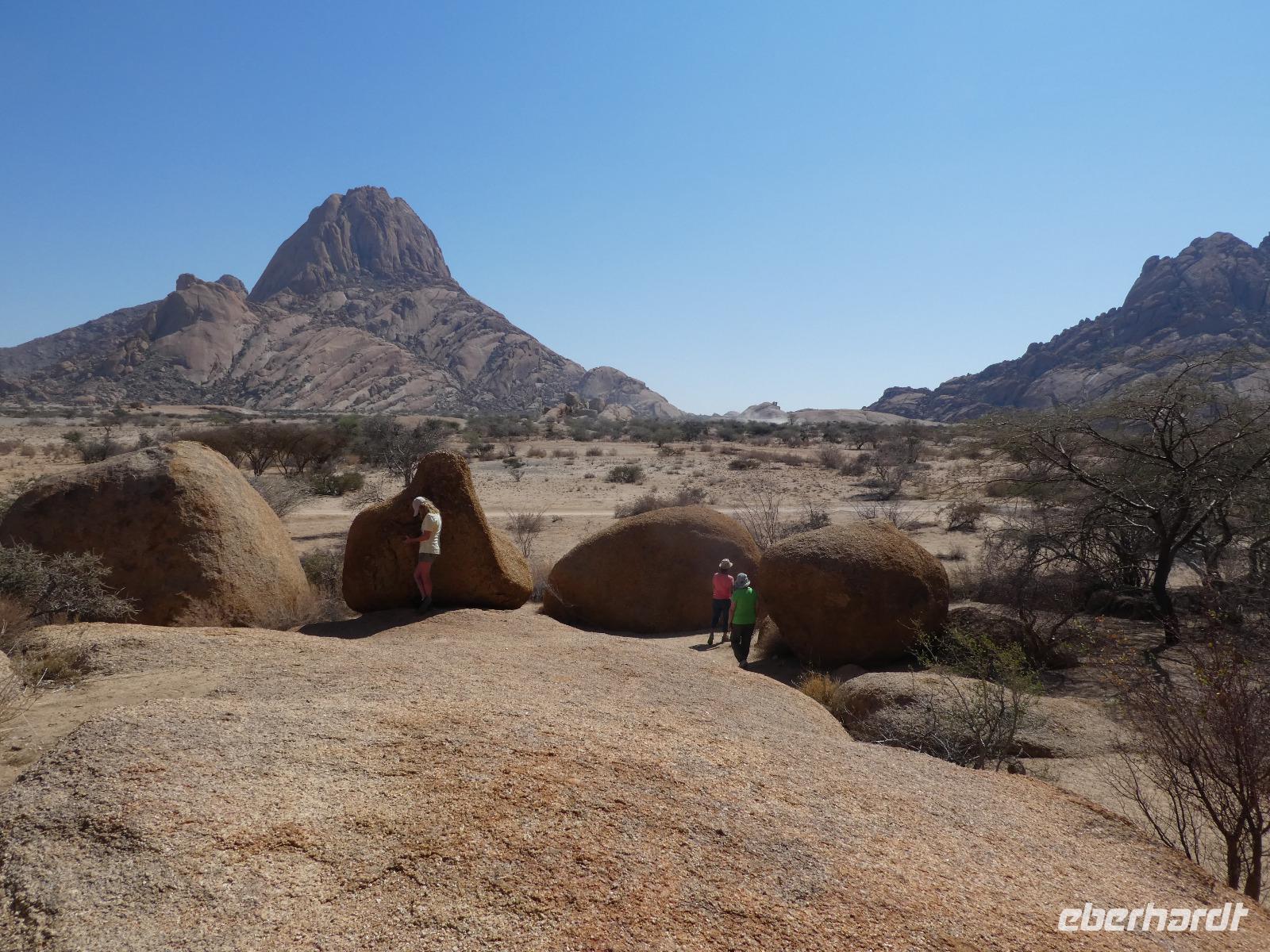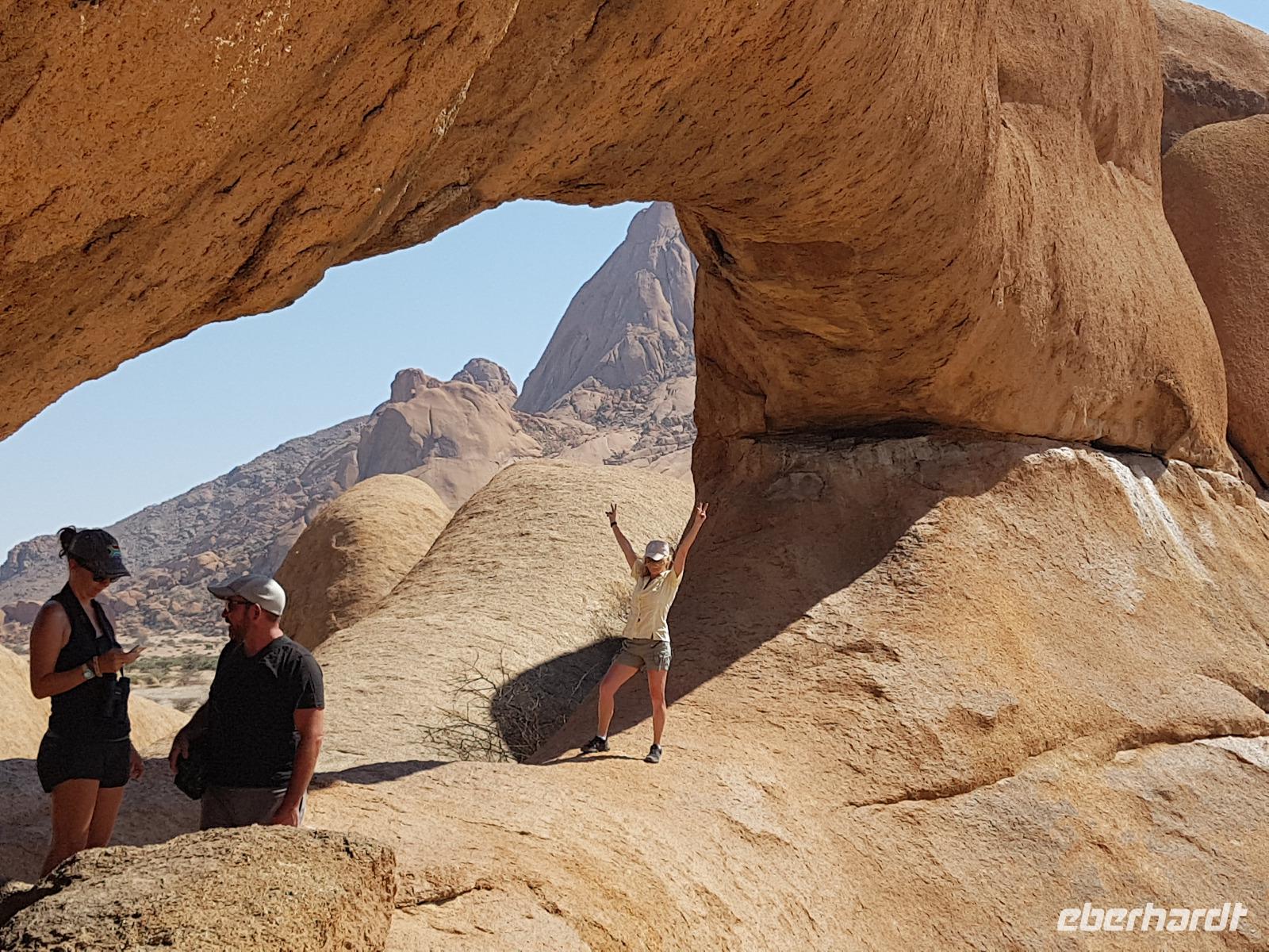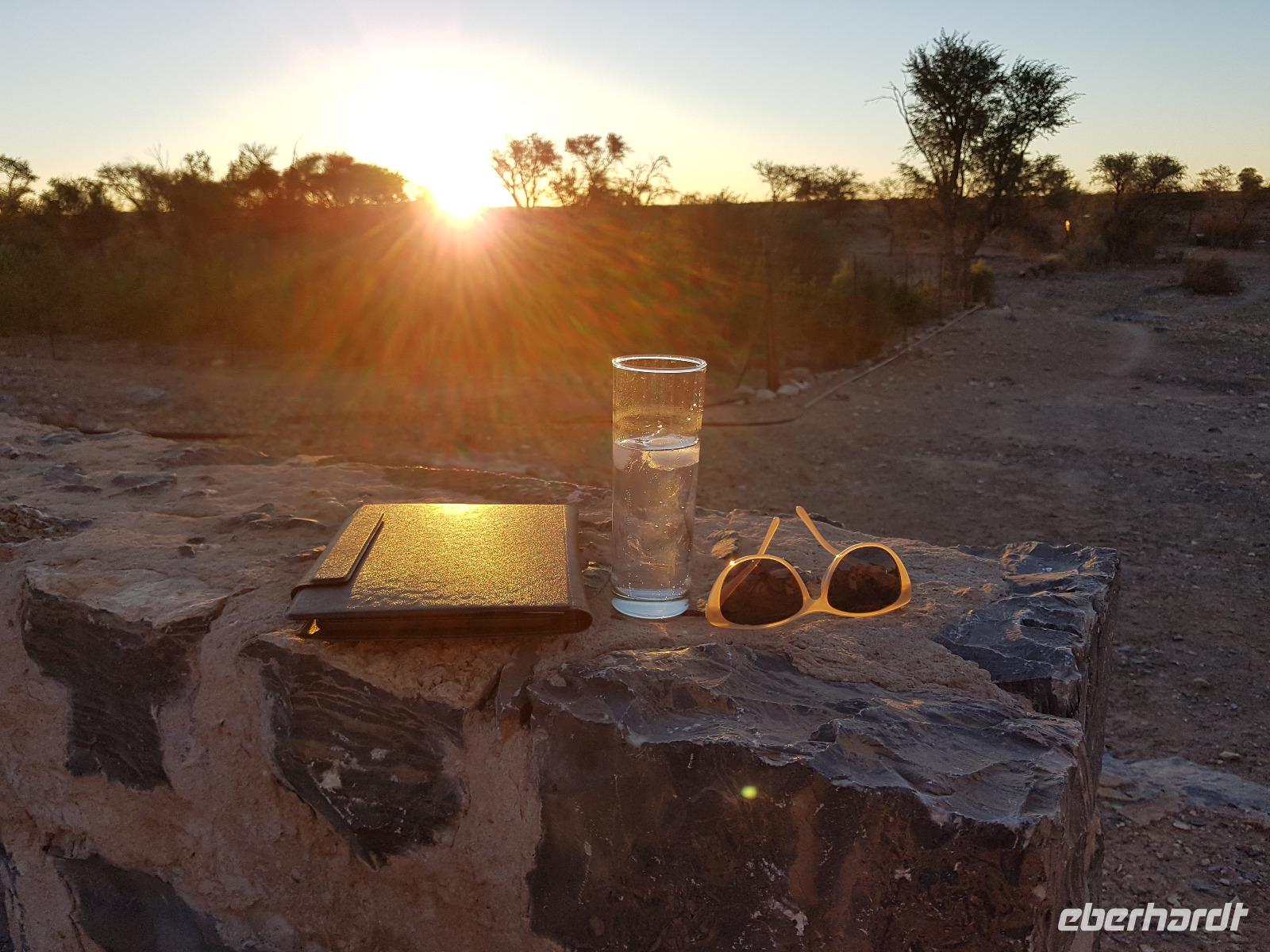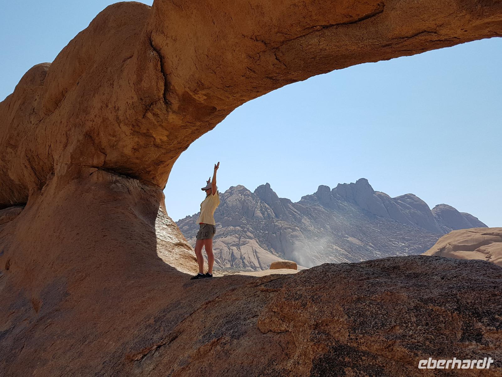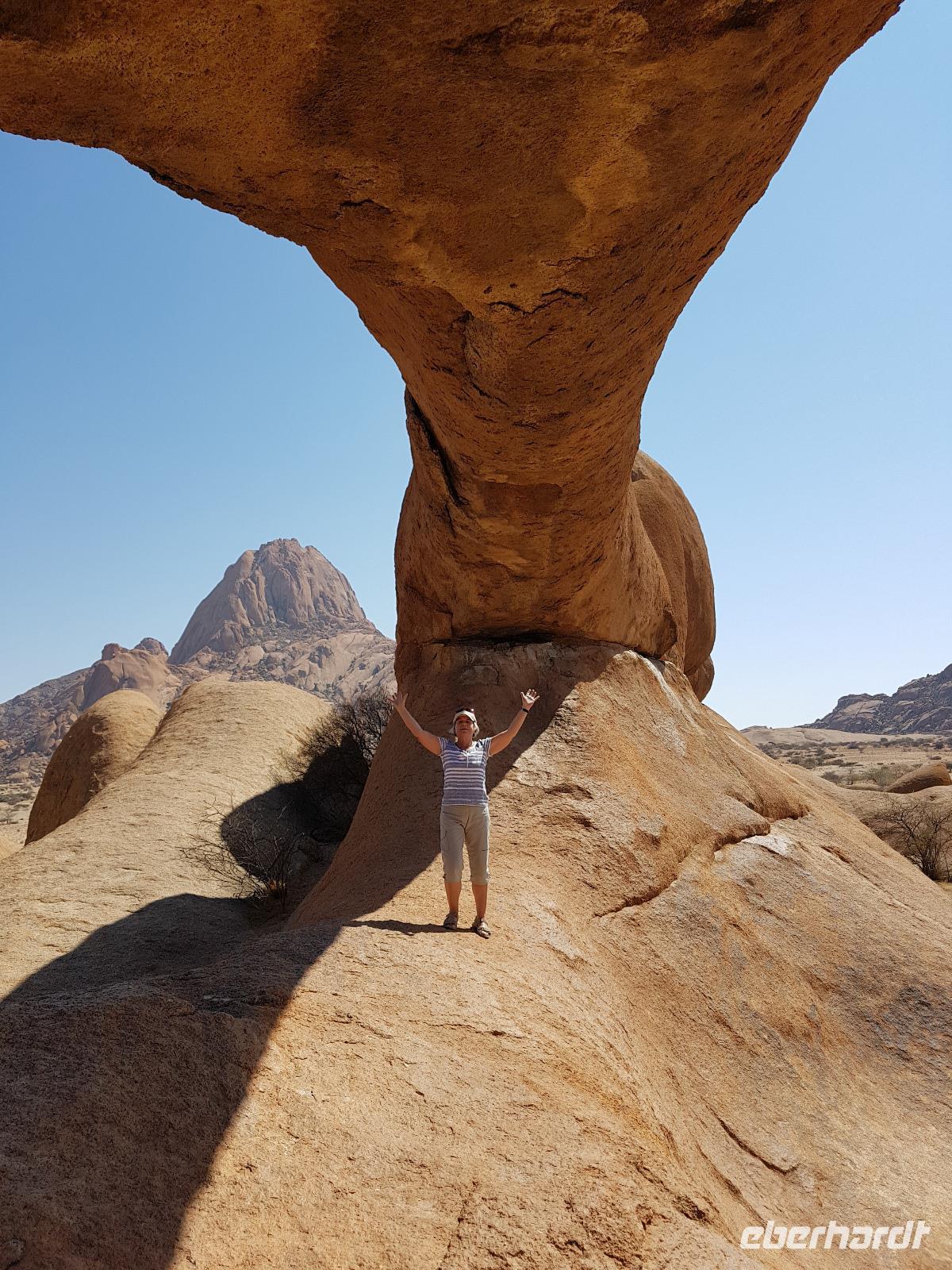 Wir genossen noch einmal das fantastische Frühstück und fuhren dann bei leichtem Regen los in Richtung Norden. Unterwegs berichtete Barbara über den Uran- und Kupferabbau. Dann hielten wir bei den Verkaufsständen der Damara und kauften schöne Halbedelsteine ein. Sogar eine Toilette war für die Touristen gebaut worden. Bei einem weiteren Stopp erfuhren wir Interessantes über die Steine am Wegesrand und in der Ferne war schon die Spitzkoppe zu sehen. Dorthin fuhren wir und suchten einen schattigen Platz für das Mittagspicknick gesponsert von Eberhardt. Während die einen schon den griechischen Salat vorbereiteten, machten die Wanderer einen "Ausflug" durch die roten Felsformationen. Ein Felsbogen erinnerte uns an das Prebischtor im Elbsandsteingebirge und war ein sehr beliebtes Fotomotiv. Gemeinsam sassen wir dann auf den Campingstühlen im Schatten eines grossen Baumes und genossen den Salat, Äpfel und Kuchen. Dann fuhren wir weiter ins Erongo Gebirge. Die 60 km lange Bergkette ist der Rand einer ehemaligen Caldera und zeigt uns, welche gewaltigen Verschiebungen hier einst passierten. Unterwegs hielten wir mehrfach an, stiegen aus und Barbara hatte immer etwas interessantes zu zeigen und zu erklären. So zum Beispiel das Bitterkraut oder besondere Steine usw. Inmitten der roten Felsen lag dann unsere Aj-Aiba Lodge. 10 Doppelhäuser mit strohgedeckten Dächern, einer Terrasse mit Blick zum Wasserloch und einer wunderschönen Einrichtung hatten es uns sofort angetan. Einige nutzten den Pool und der grösste Teil der Gruppe hatte sich für eine Fahrt zum Sonnenuntergang angemeldet. Dabei sahen wir Springböcke und Giraffen sowie zahlreiche alte Felszeichnungen. Im Schein der untergehenden Sonne färbten sich die Felsen dunkelrot und Klippschliefer schauten aus den Felsspalten auf uns herab. Mit einem Drink in der Hand genossen wir diesen unvergesslichen Anblick. Im Dunkeln fuhren wir zurück zur Lodge und bekamen ein exklusives Abendessen.