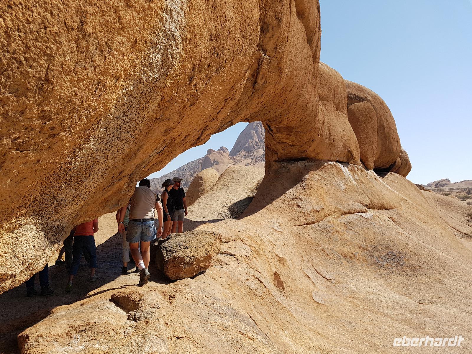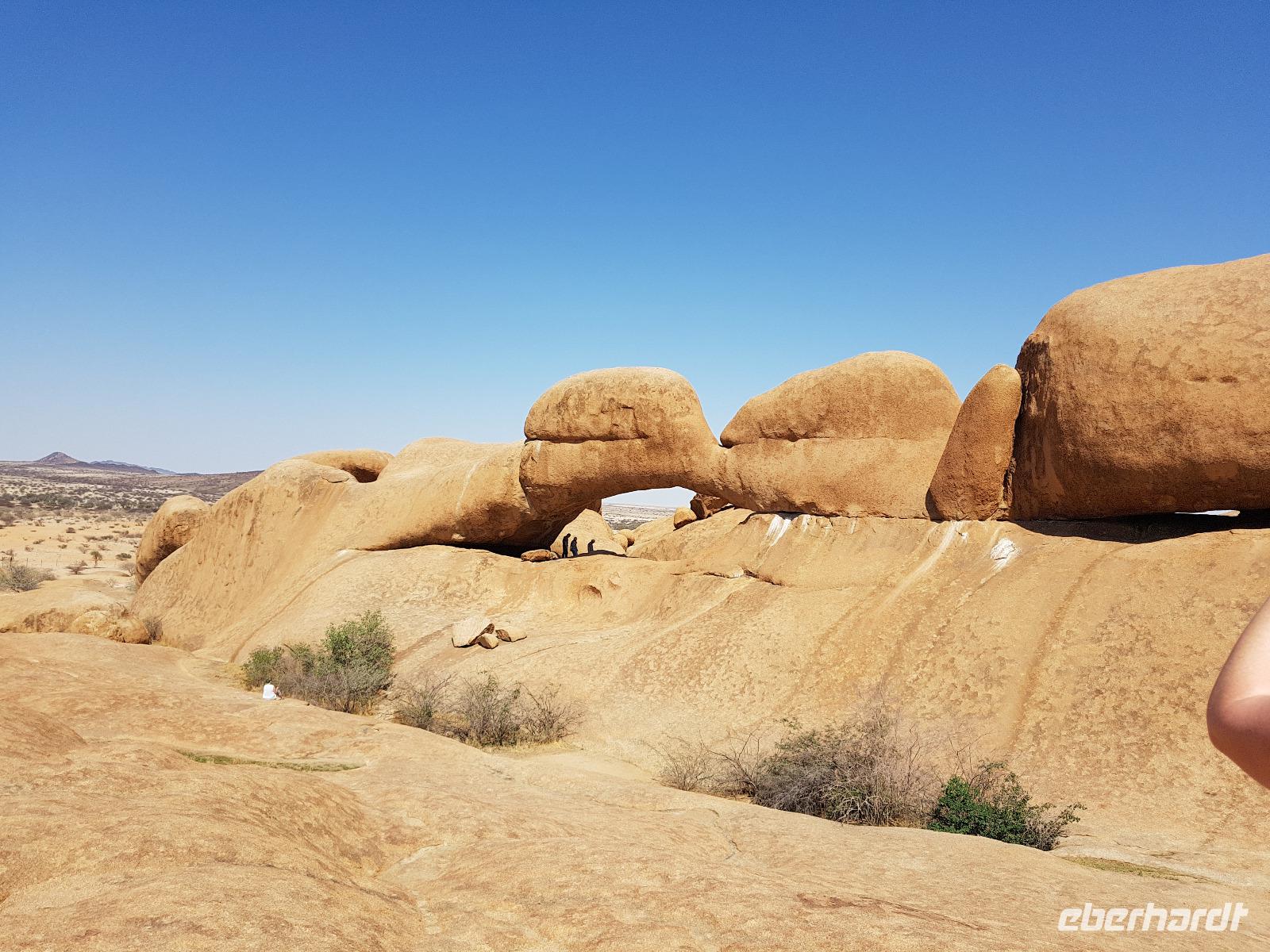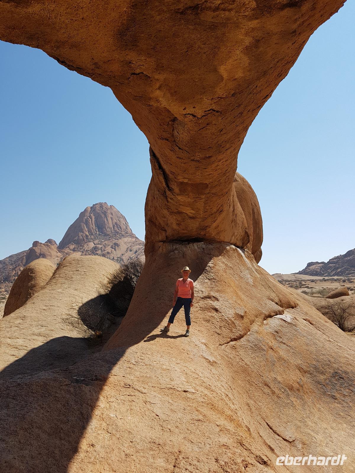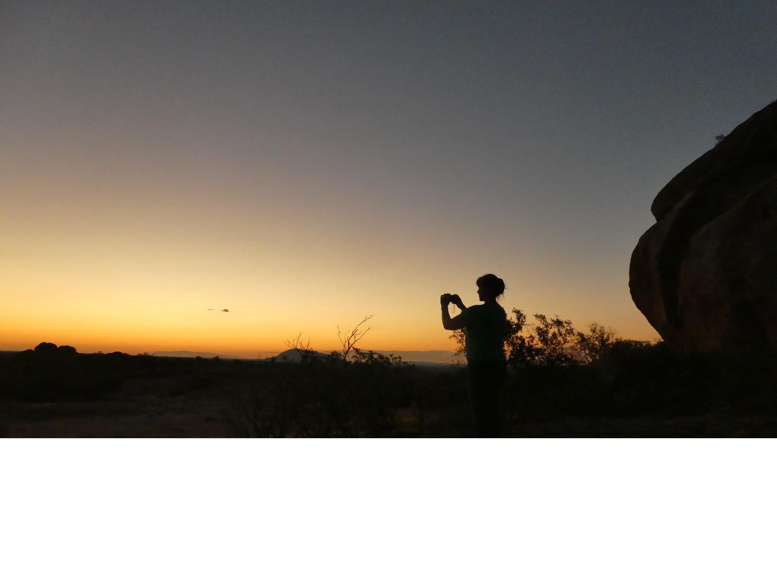 Wir genossen noch einmal das fantastische Frühstück und fuhren dann bei leichtem Regen los in Richtung Norden. Unterwegs berichtete Barbara über den Uran- und Kupferabbau. Dann hielten wir bei den Verkaufsständen der Damara und kauften schöne Halbedelsteine ein. Sogar eine Toilette war für die Touristen gebaut worden. Bei einem weiteren Stopp erfuhren wir Interessantes über die Steine am Wegesrand und in der Ferne war schon die Spitzkoppe zu sehen. Dorthin fuhren wir und suchten einen schattigen Platz für das Mittagspicknick gesponsert von Eberhardt. Während die einen schon den griechischen Salat vorbereiteten, machten die Wanderer einen "Ausflug" durch die roten Felsformationen. Ein Felsbogen erinnerte uns an das Prebischtor im Elbsandsteingebirge und war ein sehr beliebtes Fotomotiv. Gemeinsam sassen wir dann auf den Campingstühlen im Schatten eines grossen Baumes und genossen den Salat, Äpfel und Kuchen. Dann fuhren wir weiter ins Erongo Gebirge. Die 60 km lange Bergkette ist der Rand einer ehemaligen Caldera und zeigt uns, welche gewaltigen Verschiebungen hier einst passierten. Unterwegs hielten wir mehrfach an, stiegen aus und Barbara hatte immer etwas interessantes zu zeigen und zu erklären. So zum Beispiel das Bitterkraut oder besondere Steine usw. Inmitten der roten Felsen lag dann unsere Aj-Aiba Lodge. 10 Doppelhäuser mit strohgedeckten Dächern, einer Terrasse mit Blick zum Wasserloch und einer wunderschönen Einrichtung hatten es uns sofort angetan. Einige nutzten den Pool und der grösste Teil der Gruppe hatte sich für eine Fahrt zum Sonnenuntergang angemeldet. Dabei sahen wir Springböcke und Giraffen sowie zahlreiche alte Felszeichnungen. Im Schein der untergehenden Sonne färbten sich die Felsen dunkelrot und Klippschliefer schauten aus den Felsspalten auf uns herab. Mit einem Drink in der Hand genossen wir diesen unvergesslichen Anblick. Im Dunkeln fuhren wir zurück zur Lodge und bekamen ein exklusives Abendessen.