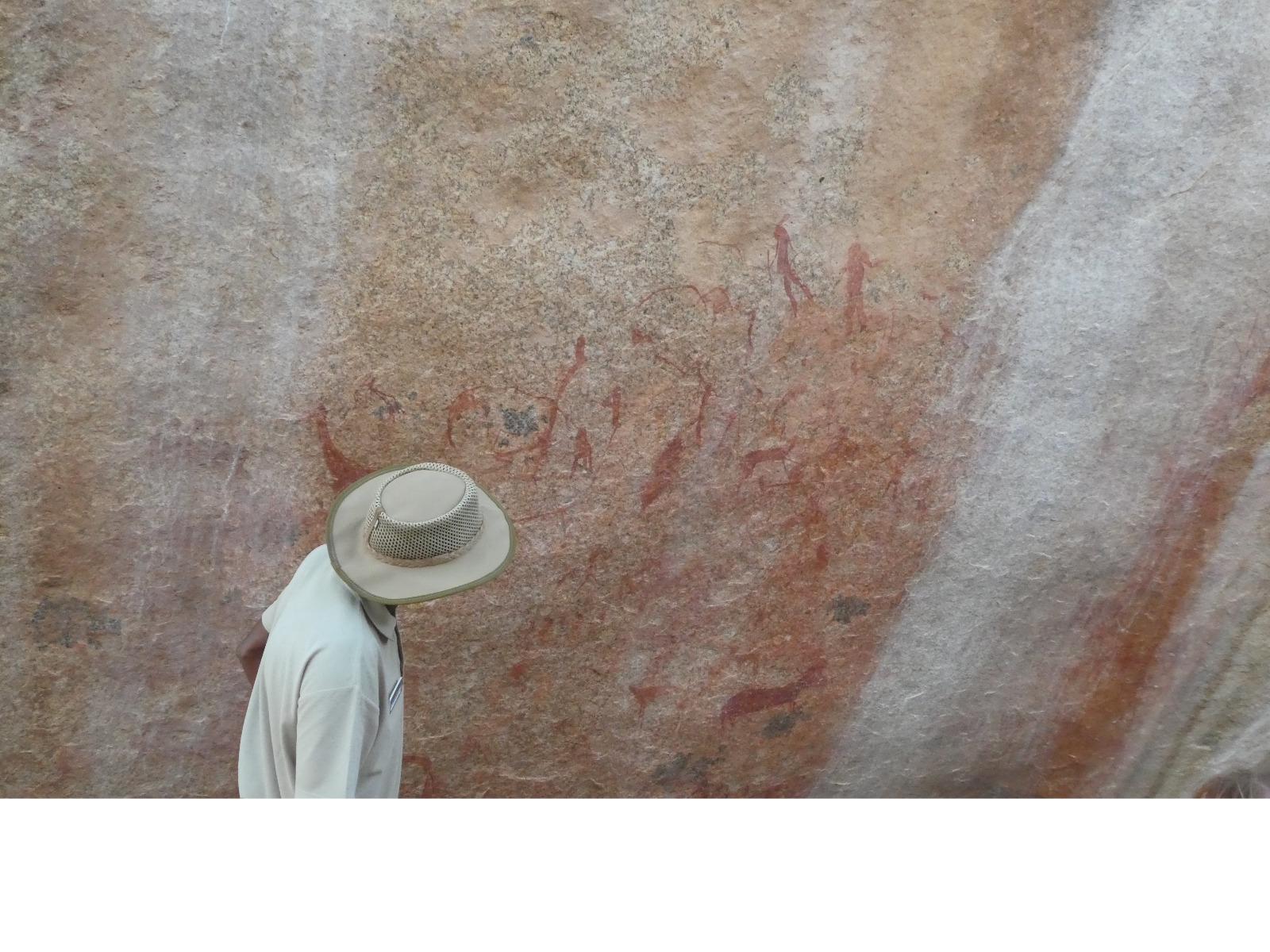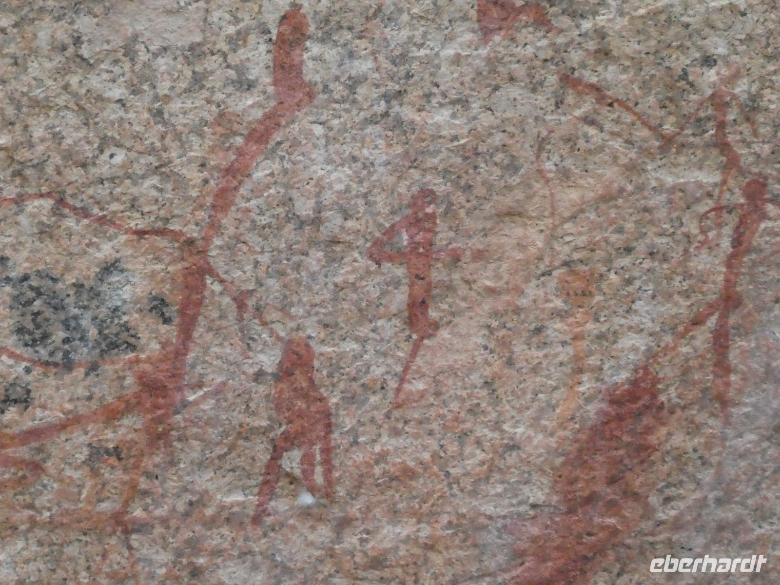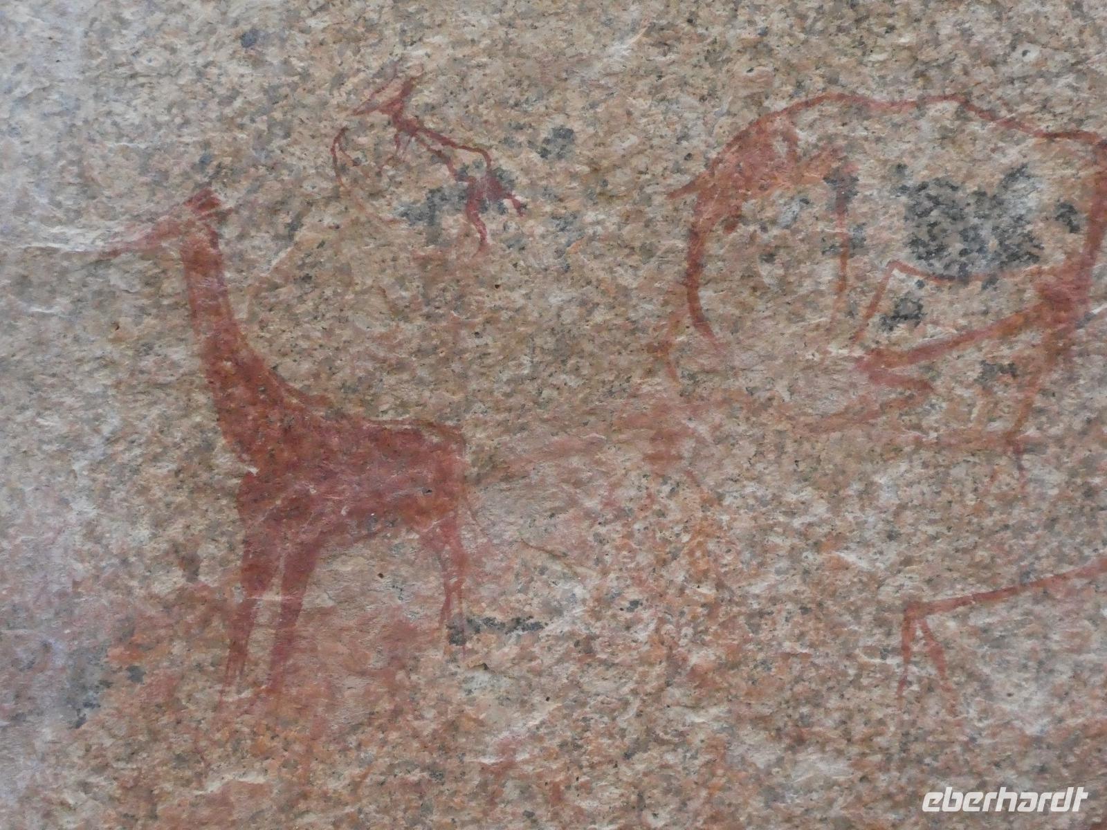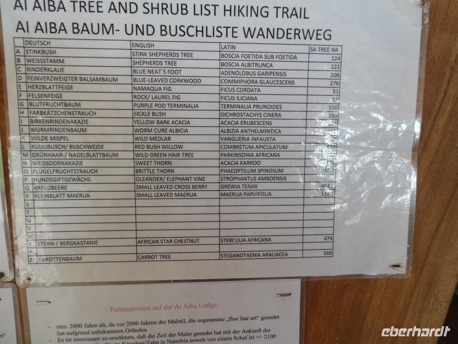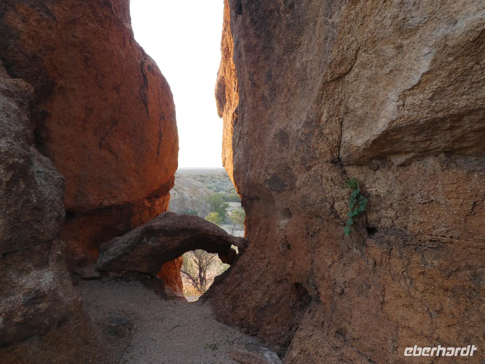 Wir genossen noch einmal das fantastische Frühstück und fuhren dann bei leichtem Regen los in Richtung Norden. Unterwegs berichtete Barbara über den Uran- und Kupferabbau. Dann hielten wir bei den Verkaufsständen der Damara und kauften schöne Halbedelsteine ein. Sogar eine Toilette war für die Touristen gebaut worden. Bei einem weiteren Stopp erfuhren wir Interessantes über die Steine am Wegesrand und in der Ferne war schon die Spitzkoppe zu sehen. Dorthin fuhren wir und suchten einen schattigen Platz für das Mittagspicknick gesponsert von Eberhardt. Während die einen schon den griechischen Salat vorbereiteten, machten die Wanderer einen "Ausflug" durch die roten Felsformationen. Ein Felsbogen erinnerte uns an das Prebischtor im Elbsandsteingebirge und war ein sehr beliebtes Fotomotiv. Gemeinsam sassen wir dann auf den Campingstühlen im Schatten eines grossen Baumes und genossen den Salat, Äpfel und Kuchen. Dann fuhren wir weiter ins Erongo Gebirge. Die 60 km lange Bergkette ist der Rand einer ehemaligen Caldera und zeigt uns, welche gewaltigen Verschiebungen hier einst passierten. Unterwegs hielten wir mehrfach an, stiegen aus und Barbara hatte immer etwas interessantes zu zeigen und zu erklären. So zum Beispiel das Bitterkraut oder besondere Steine usw. Inmitten der roten Felsen lag dann unsere Aj-Aiba Lodge. 10 Doppelhäuser mit strohgedeckten Dächern, einer Terrasse mit Blick zum Wasserloch und einer wunderschönen Einrichtung hatten es uns sofort angetan. Einige nutzten den Pool und der grösste Teil der Gruppe hatte sich für eine Fahrt zum Sonnenuntergang angemeldet. Dabei sahen wir Springböcke und Giraffen sowie zahlreiche alte Felszeichnungen. Im Schein der untergehenden Sonne färbten sich die Felsen dunkelrot und Klippschliefer schauten aus den Felsspalten auf uns herab. Mit einem Drink in der Hand genossen wir diesen unvergesslichen Anblick. Im Dunkeln fuhren wir zurück zur Lodge und bekamen ein exklusives Abendessen.
