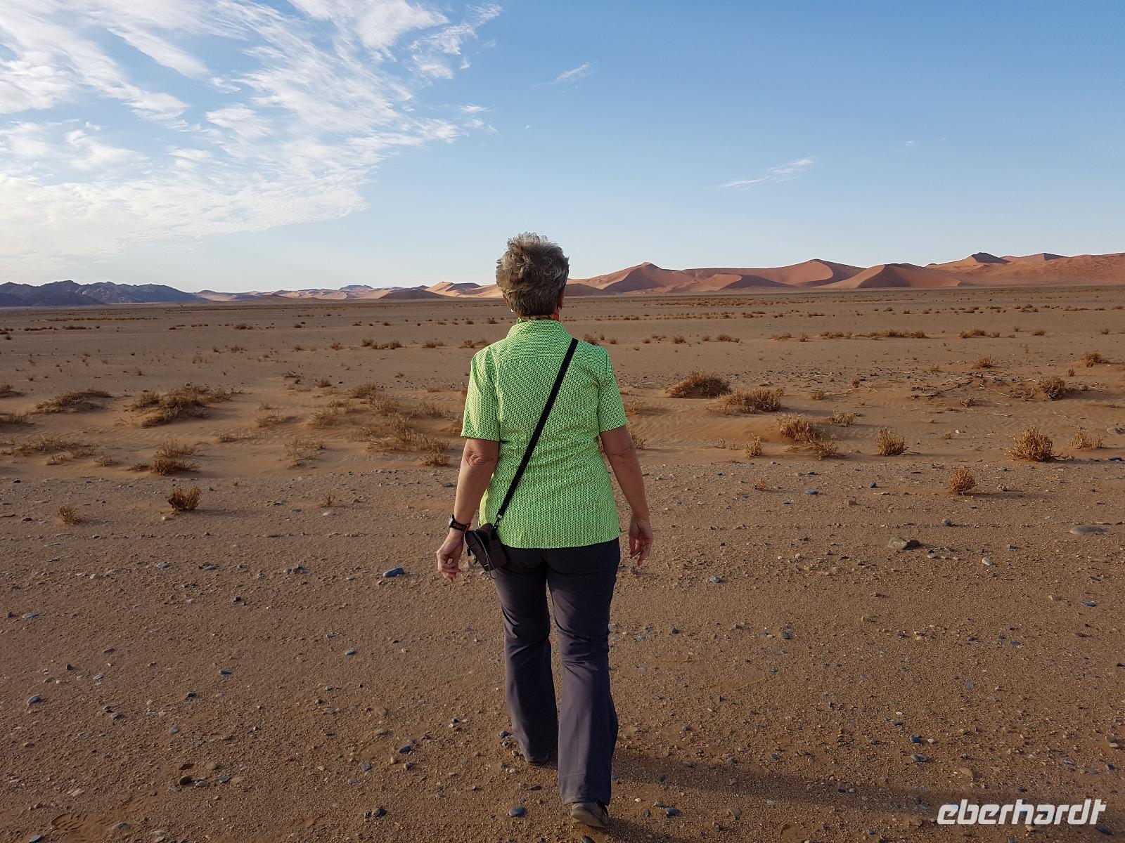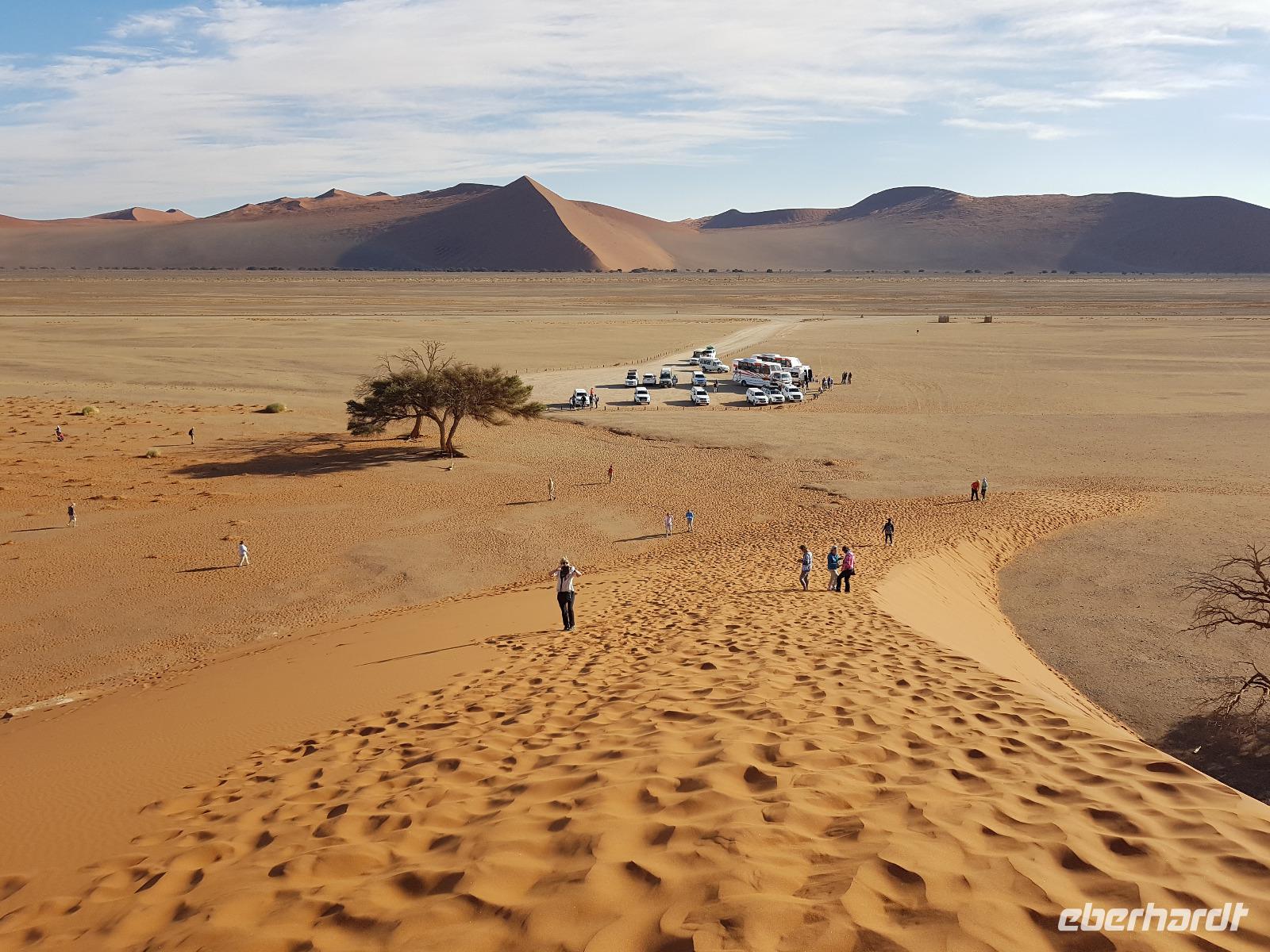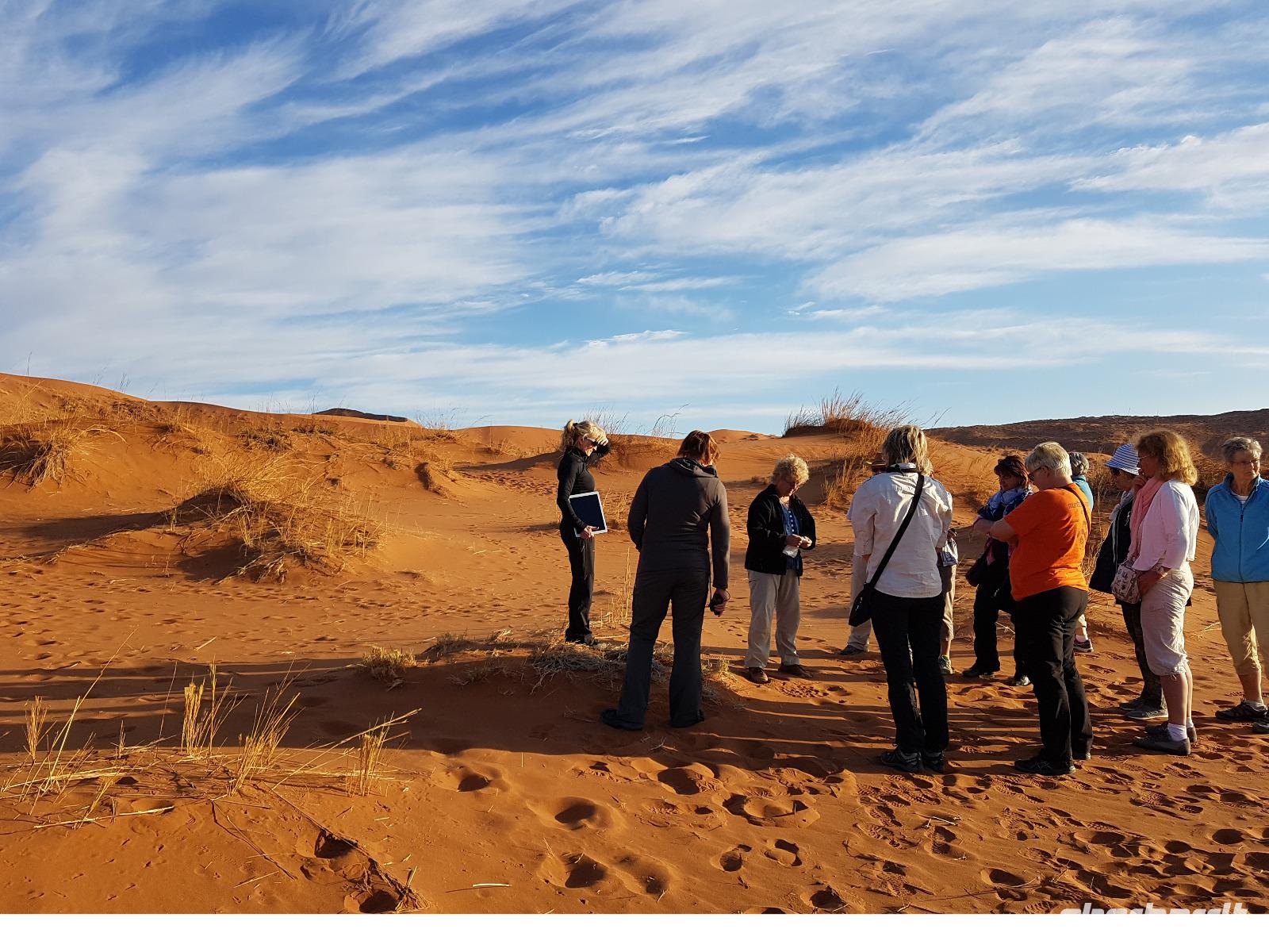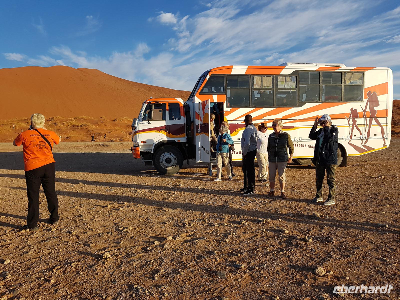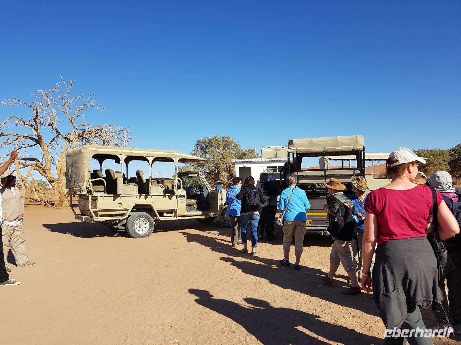 Heute stand ein ganz besonderes Erlebnis auf dem Programm und da mussten wir sehr früh starten. Wir tranken nur einen Kaffee und nahmen unsere Frühstückspakete mit. Noch vor Sonnenaufgang erreichten wir das Tor zum Sossusviel Nationalpark. Eine lange Schlange von Fahrzeugen wartete. Aber das Tor öffnete erst bei Sonnenaufgang. Deshalb machten wir noch eine Pause und Barbara bestellte für den Nachmittag Sandwiches. Wir fuhren hinein und machten viele Fotostopp an den Dünen. Barbara zeigte uns verschiedene Spuren im Sand und berichtete über die Tiere. Noch ein Gruppen Foto im roten Sand und dann hielten wir an der berühmten Düne 45. Wir stiegen ein Stück hinauf und machten wieder viele Fotos. Dann ging's mit unserem Truck zum 4x4 Parkplatz und weiter in offenen Jeeps ins Sossusvlie zur Mamadüne. Wir hatten genügend Zeit, um ganz hinauf zu gehen. Es war schweisstreibend - 2 Schritte vor und einer zurück tief im Sand. Die Mühe hatte sich aber gelohnt und wir hatten traumhafte Ausblicke in alle Richtungen. Wieder unten war die Gruppe vereint und zurück fuhren wir wieder erst mit den Jeeps und weiter mit unserem Truck bis zum Eingang in den Sesriemcanyon. Wir stiegen hinab in den Canyon und liefen unten durch die Felsen - ein unvergessliches Bild. Wieder oben gab es Wein und Datteln, denn heute war unser Bergfest und leider die Hälfte der Reise vorbei. Noch einmal übernachteten wir in der Hammerstein Lodge.